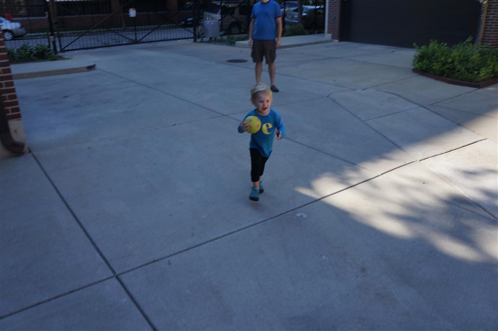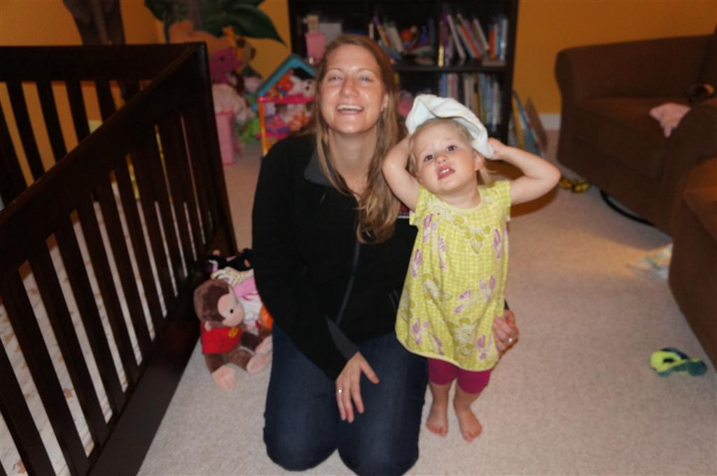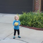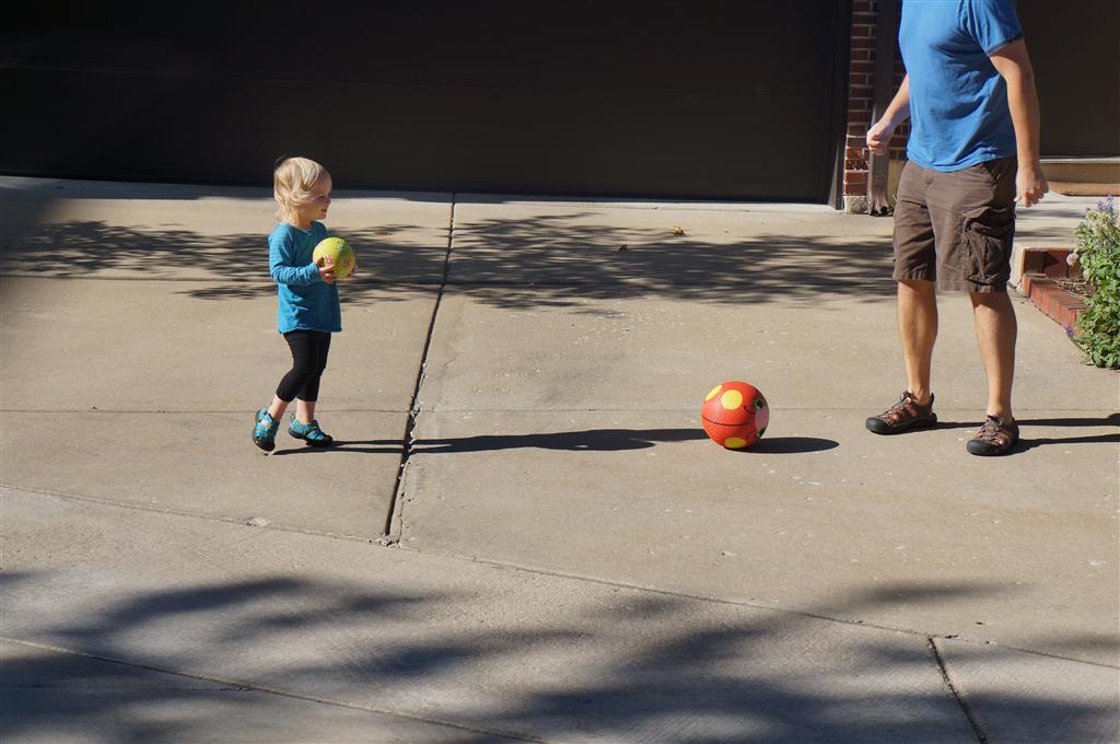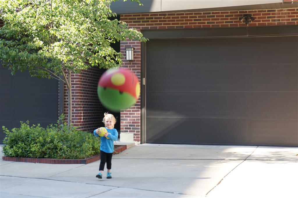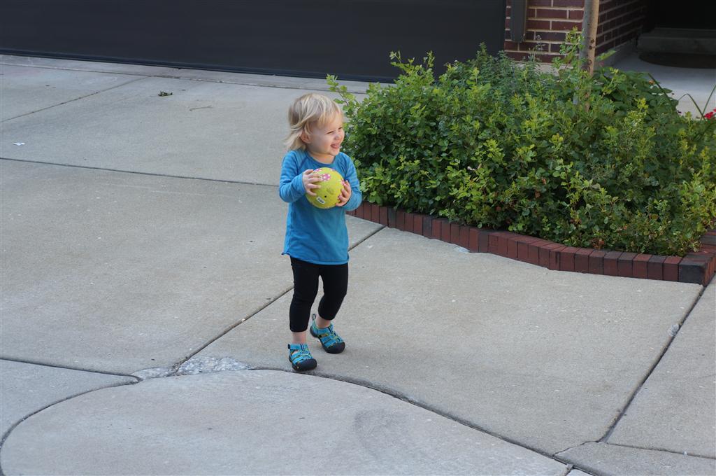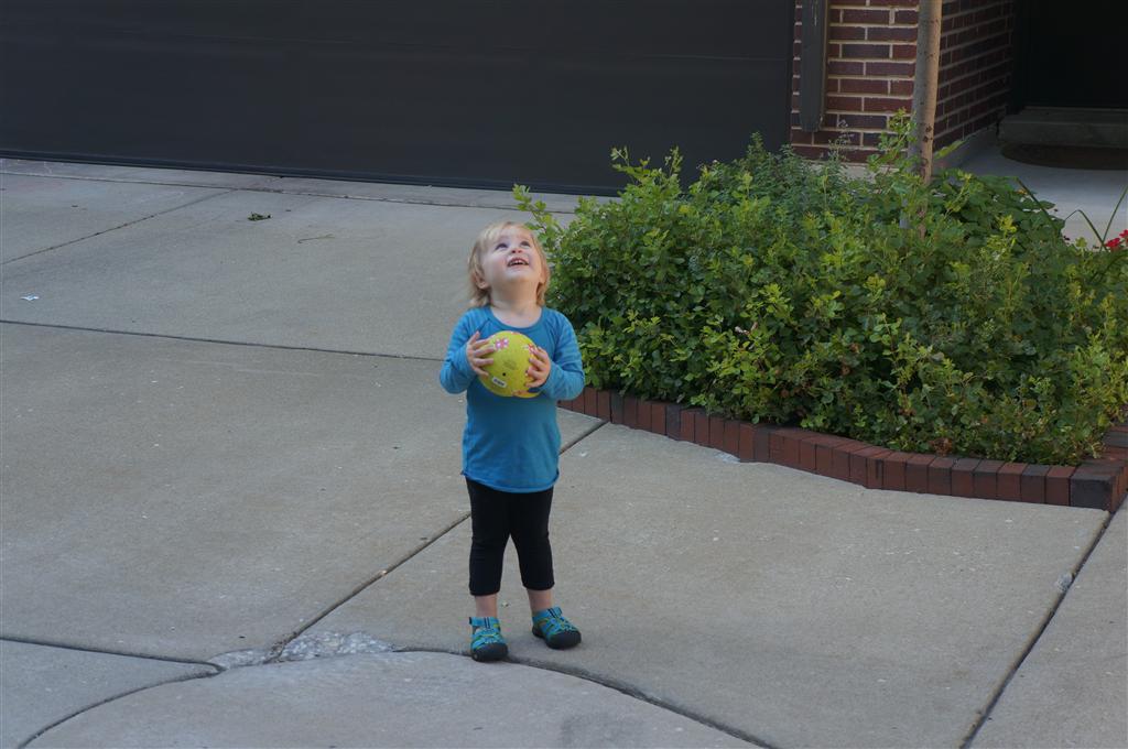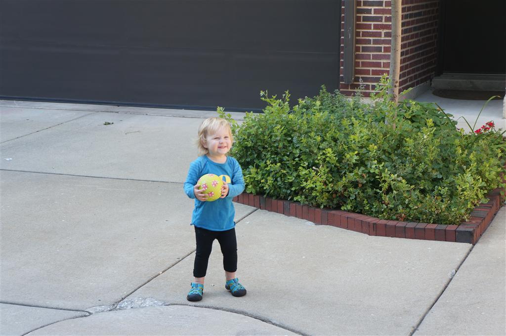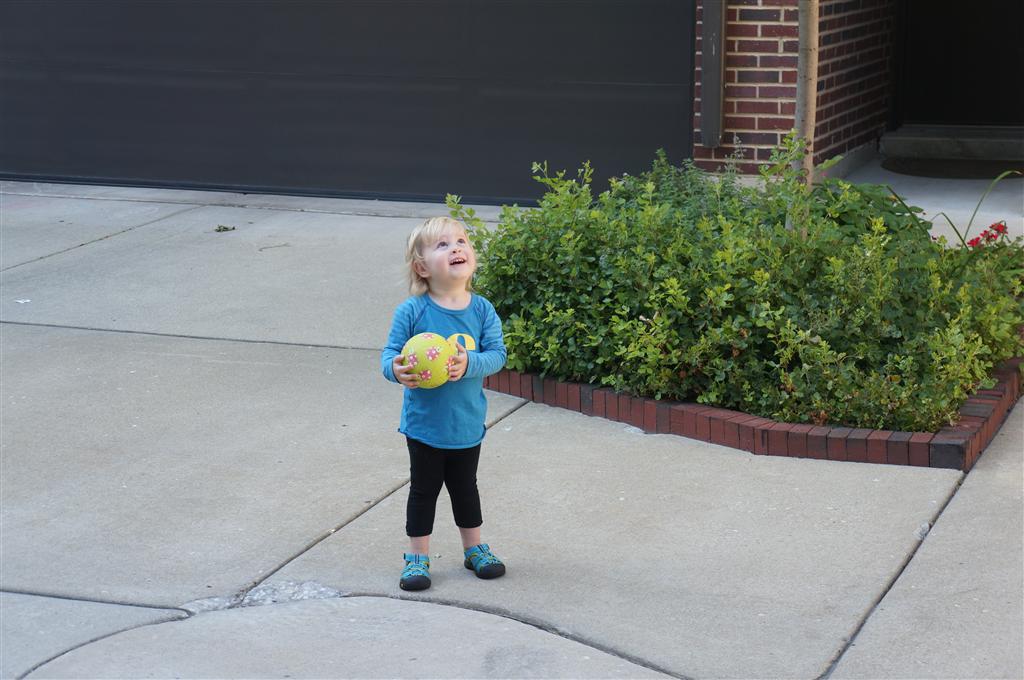 Eleanor had her doctor checkup this week, and everything went well, although she didn’t appreciate the flu shot. We had heard rumors that they would ask us if Eleanor can jump yet (which she can’t) but it didn’t come up. Eleanor had lots of fun this week outside, she rode on her new tricycle for the first time, although because she has to wear her bike helmet while on it, she currently prefers to push it rather than ride on it. Hopefully that will change soon. She also discovered a new game where Dad throws the ball high in the air, and Eleanor giggles while it bounces and then chases it down for a repeat. On a funny side note, Mom found Eleanor in her crib one afternoon after her nap completely naked from the waist down – she had for some reason taken off her pants and diaper (also not pictured :) ).