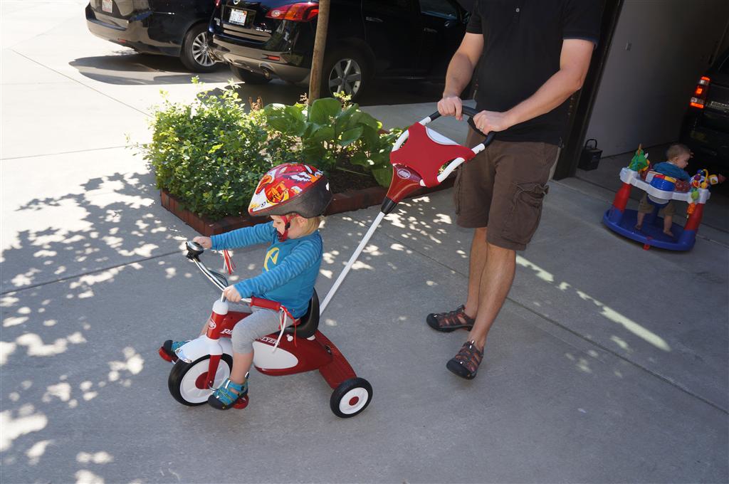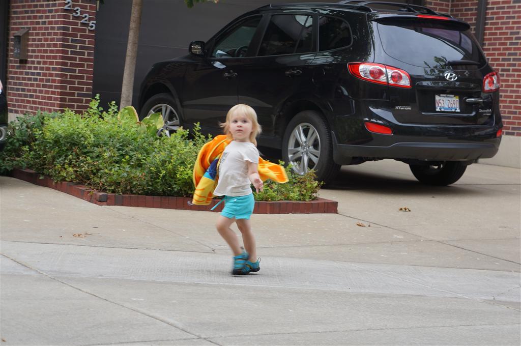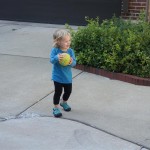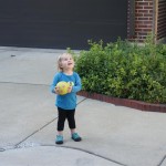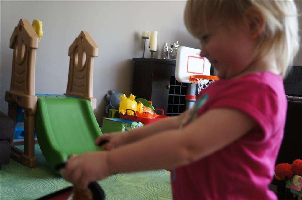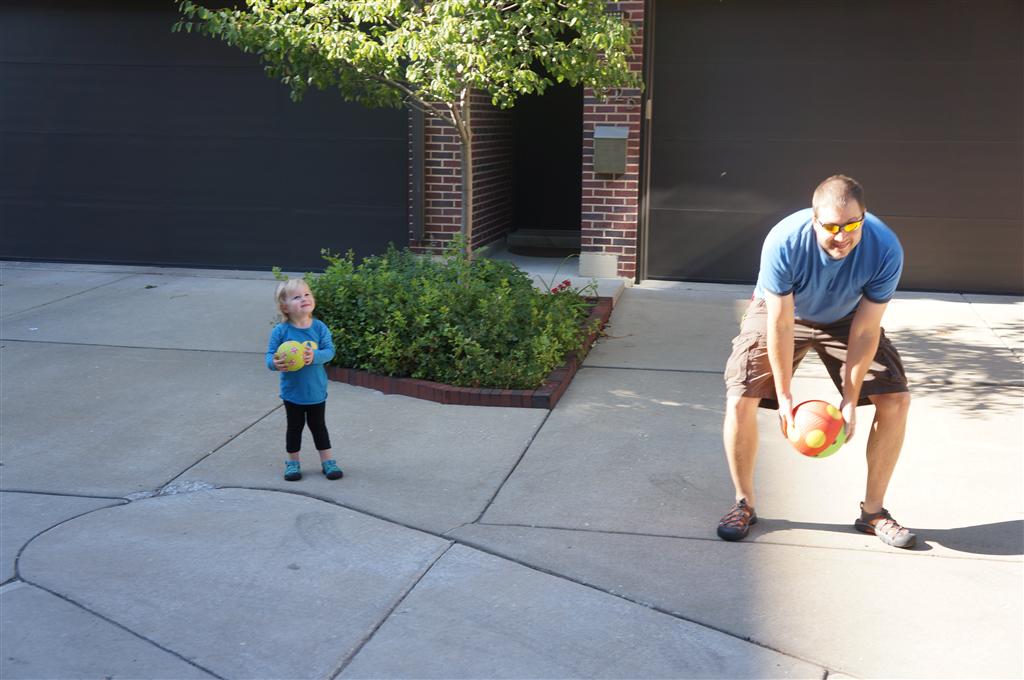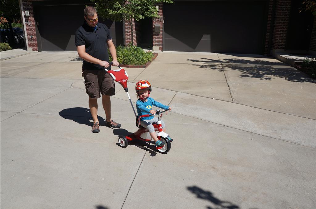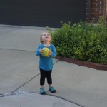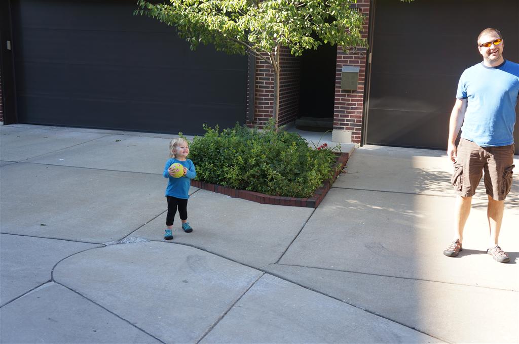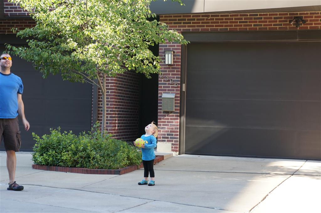 Eleanor had her doctor checkup this week, and everything went well, although she didn’t appreciate the flu shot. We had heard rumors that they would ask us if Eleanor can jump yet (which she can’t) but it didn’t come up. Eleanor had lots of fun this week outside, she rode on her new tricycle for the first time, although because she has to wear her bike helmet while on it, she currently prefers to push it rather than ride on it. Hopefully that will change soon. She also discovered a new game where Dad throws the ball high in the air, and Eleanor giggles while it bounces and then chases it down for a repeat. On a funny side note, Mom found Eleanor in her crib one afternoon after her nap completely naked from the waist down – she had for some reason taken off her pants and diaper (also not pictured :) ).