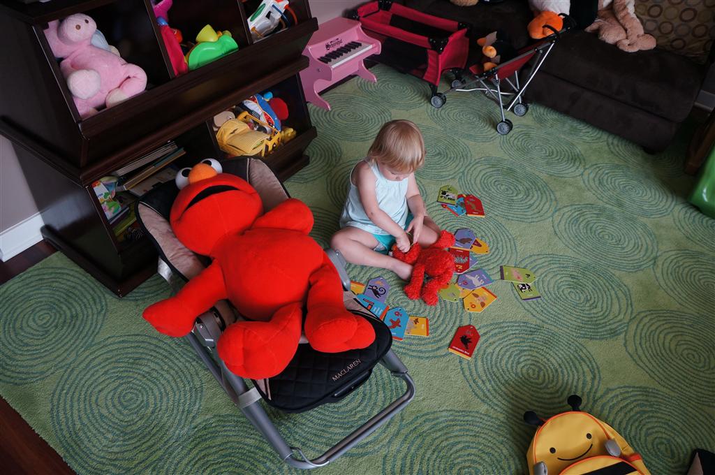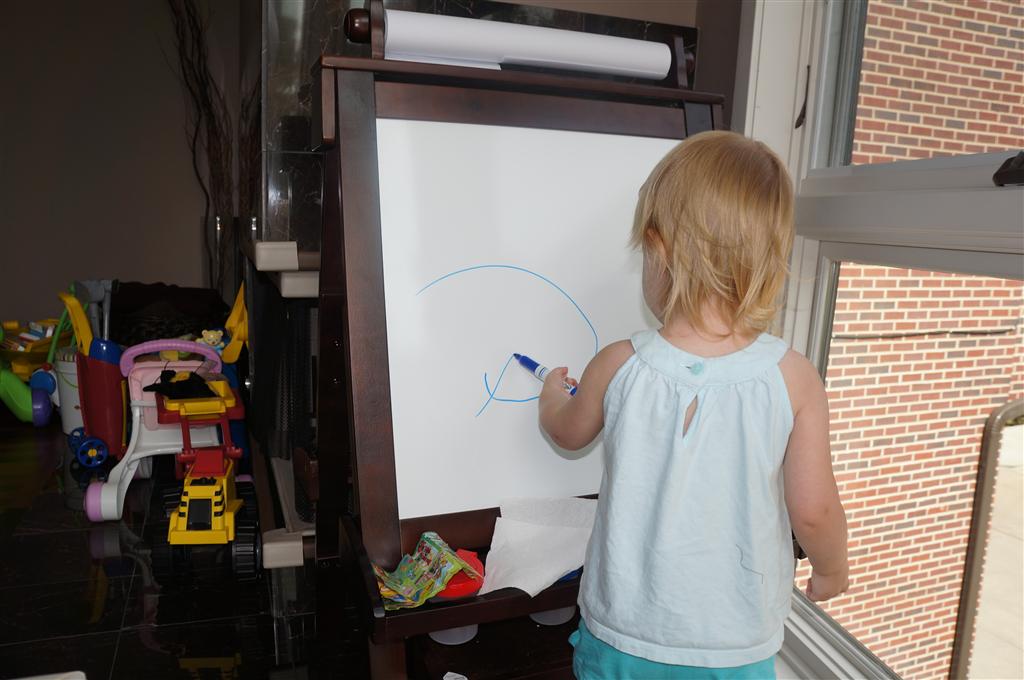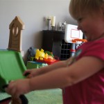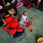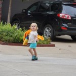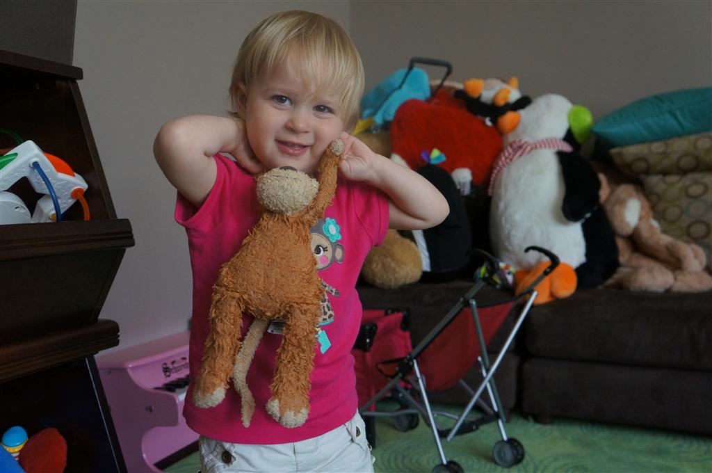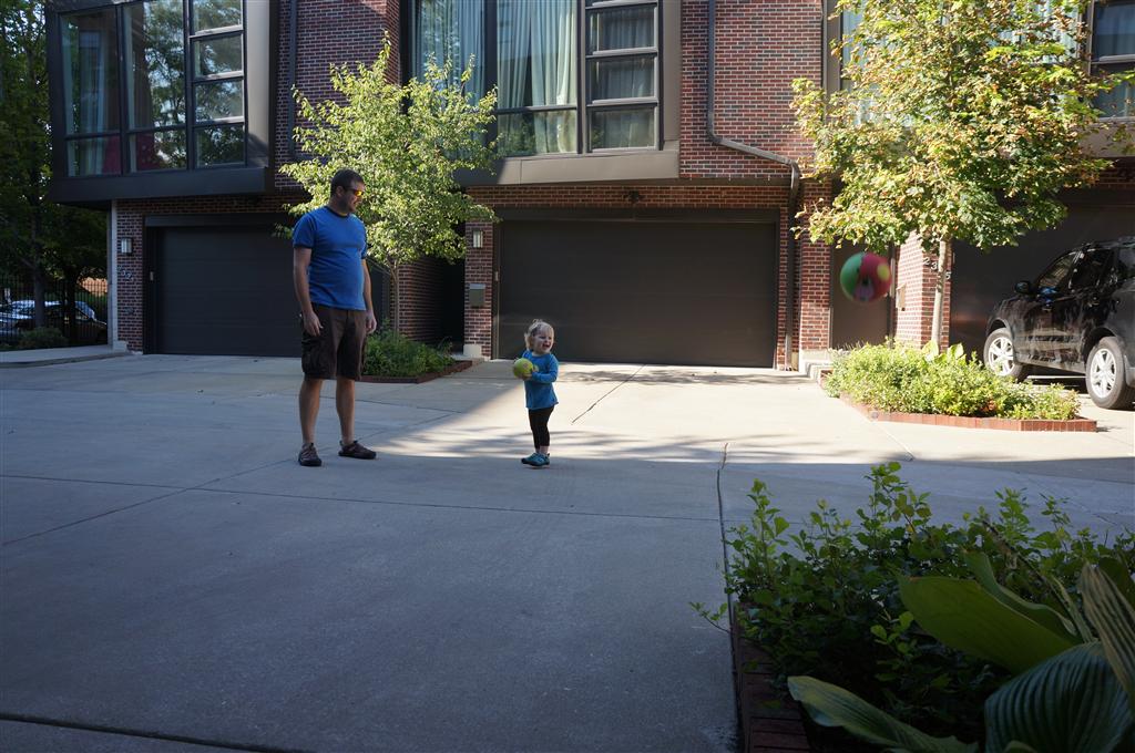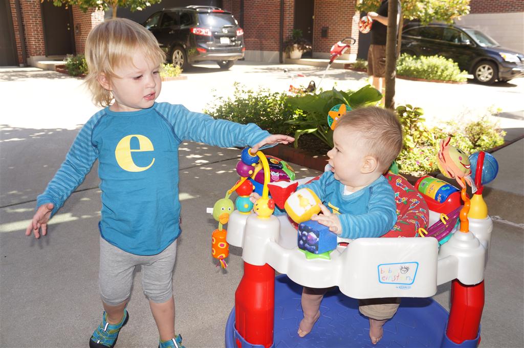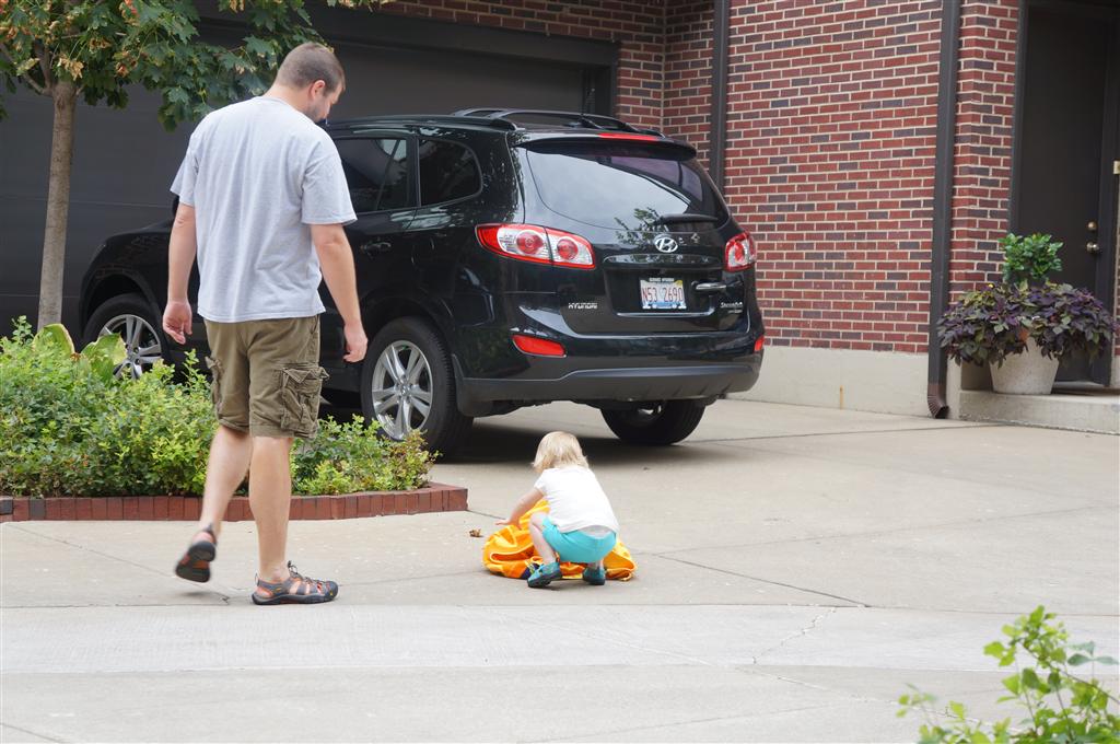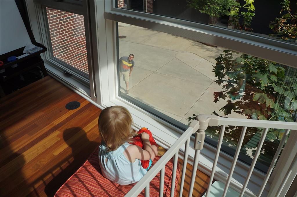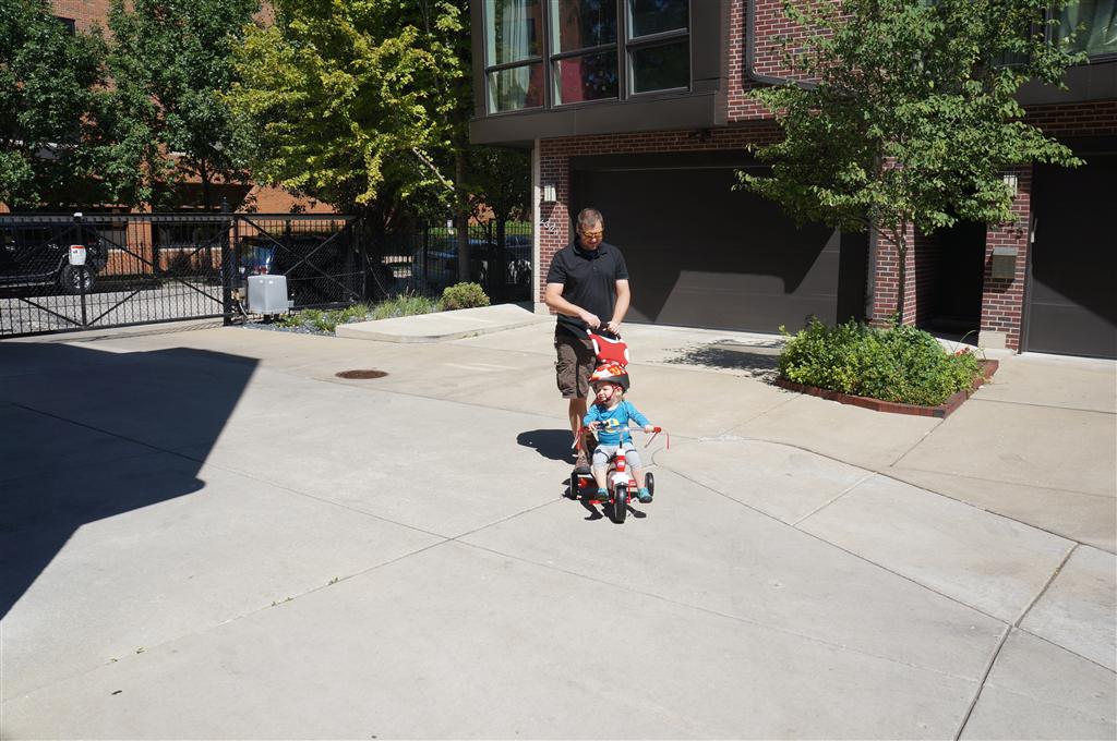 Eleanor had her doctor checkup this week, and everything went well, although she didn’t appreciate the flu shot. We had heard rumors that they would ask us if Eleanor can jump yet (which she can’t) but it didn’t come up. Eleanor had lots of fun this week outside, she rode on her new tricycle for the first time, although because she has to wear her bike helmet while on it, she currently prefers to push it rather than ride on it. Hopefully that will change soon. She also discovered a new game where Dad throws the ball high in the air, and Eleanor giggles while it bounces and then chases it down for a repeat. On a funny side note, Mom found Eleanor in her crib one afternoon after her nap completely naked from the waist down – she had for some reason taken off her pants and diaper (also not pictured :) ).