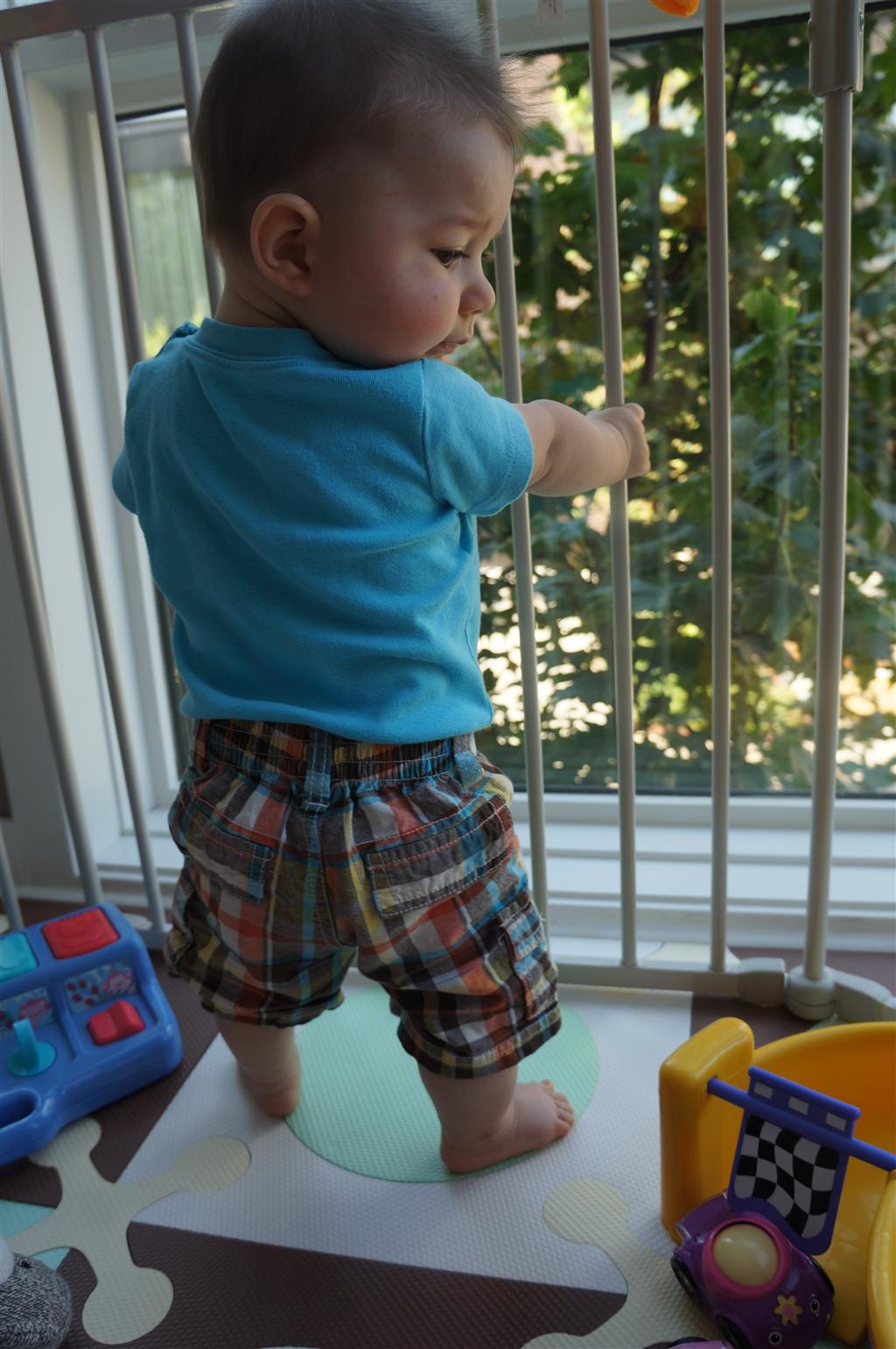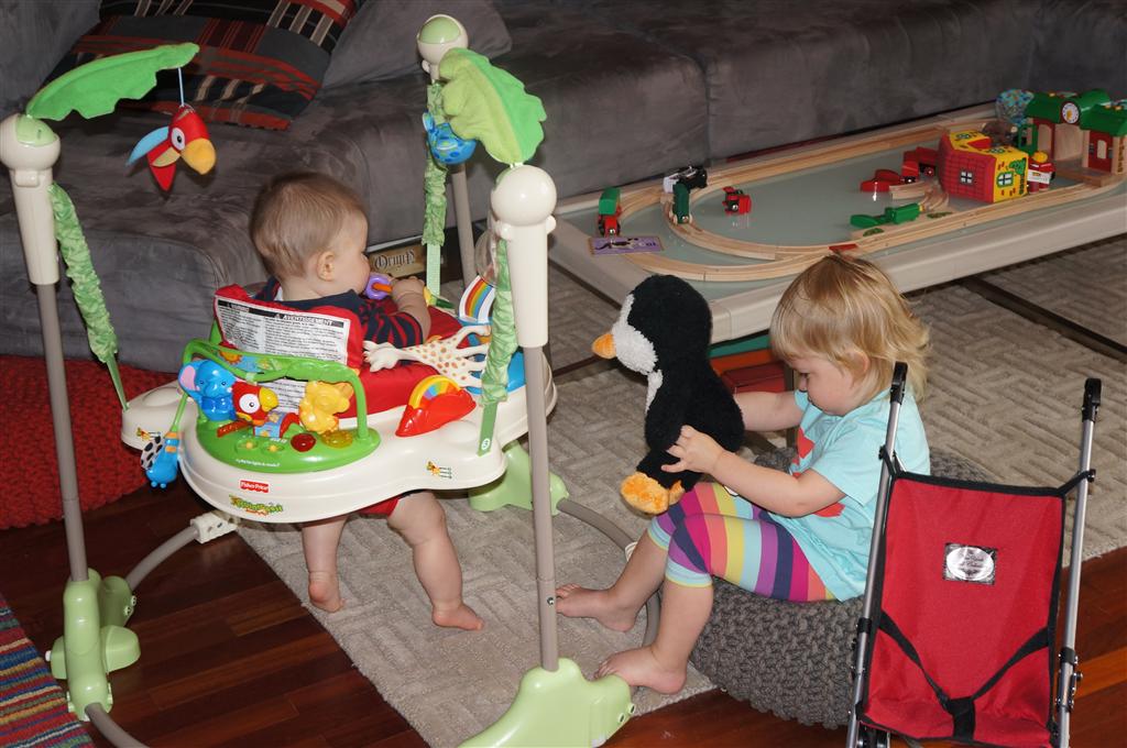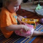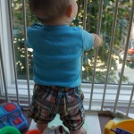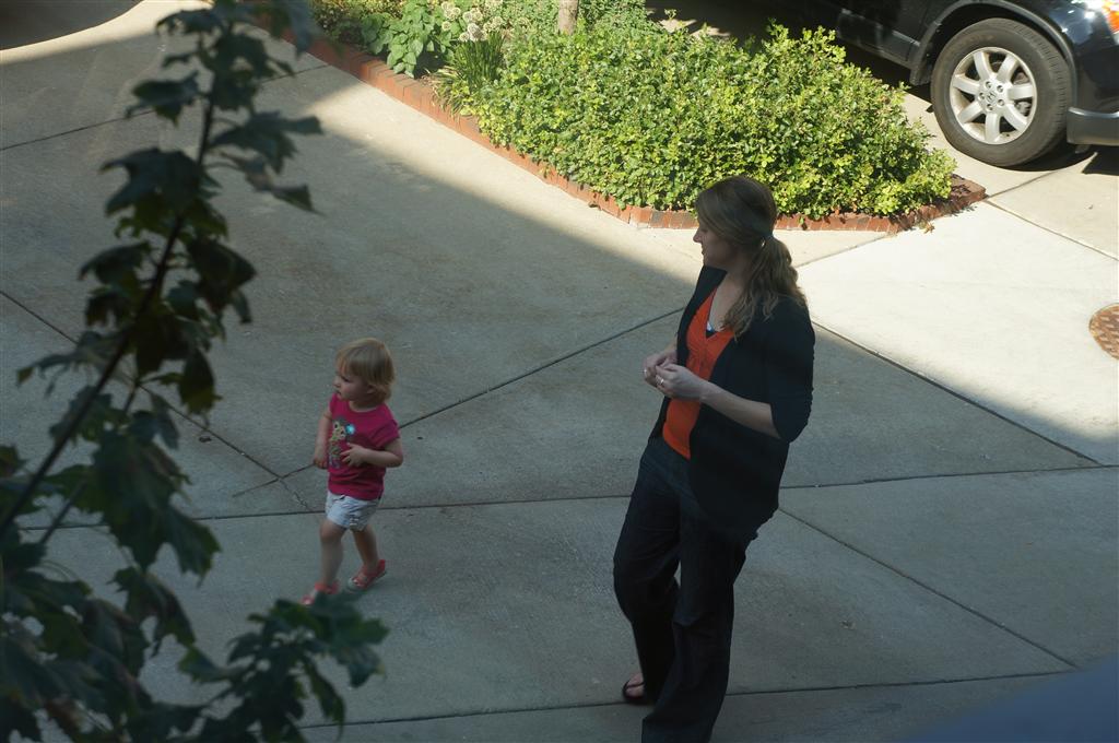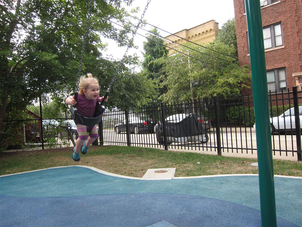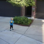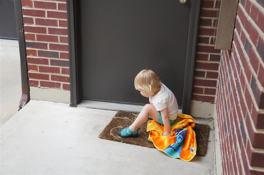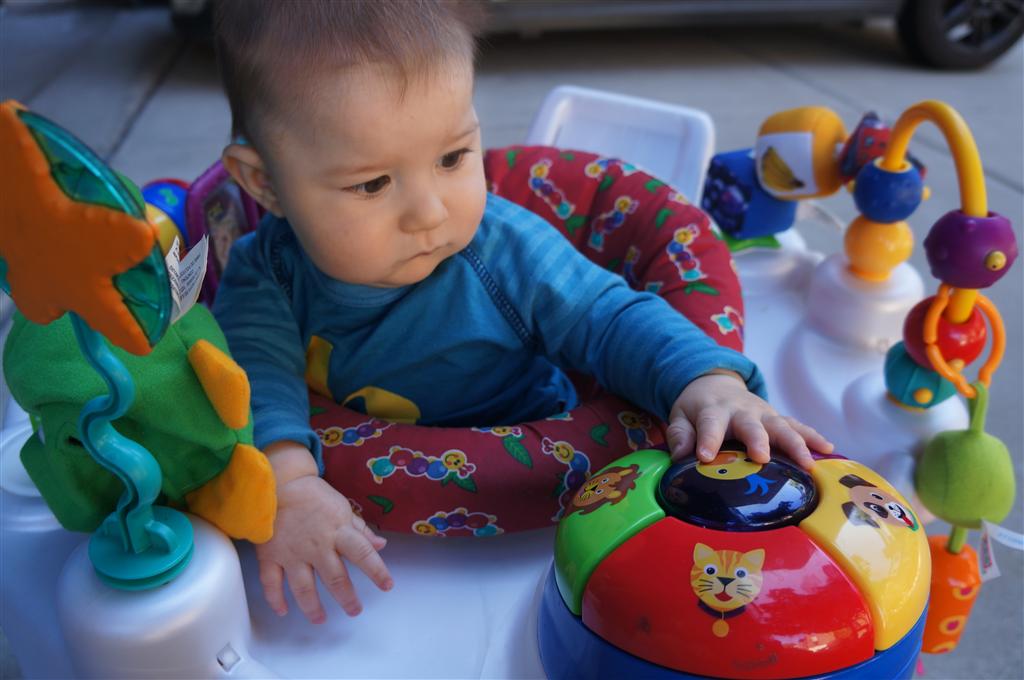 Eleanor had her doctor checkup this week, and everything went well, although she didn’t appreciate the flu shot. We had heard rumors that they would ask us if Eleanor can jump yet (which she can’t) but it didn’t come up. Eleanor had lots of fun this week outside, she rode on her new tricycle for the first time, although because she has to wear her bike helmet while on it, she currently prefers to push it rather than ride on it. Hopefully that will change soon. She also discovered a new game where Dad throws the ball high in the air, and Eleanor giggles while it bounces and then chases it down for a repeat. On a funny side note, Mom found Eleanor in her crib one afternoon after her nap completely naked from the waist down – she had for some reason taken off her pants and diaper (also not pictured :) ).