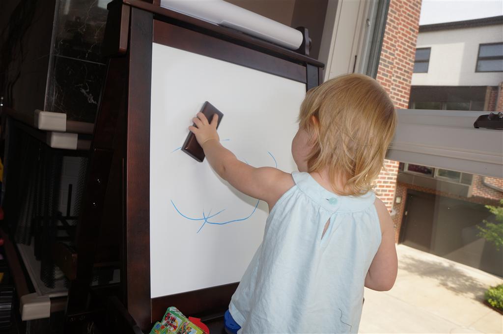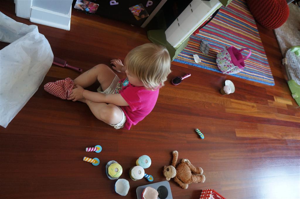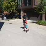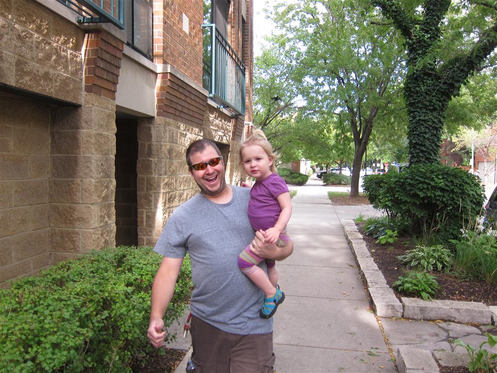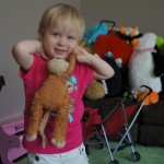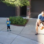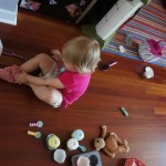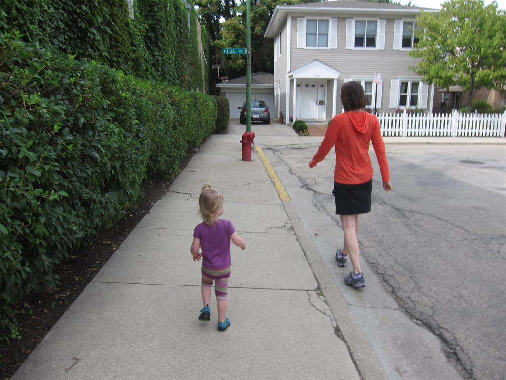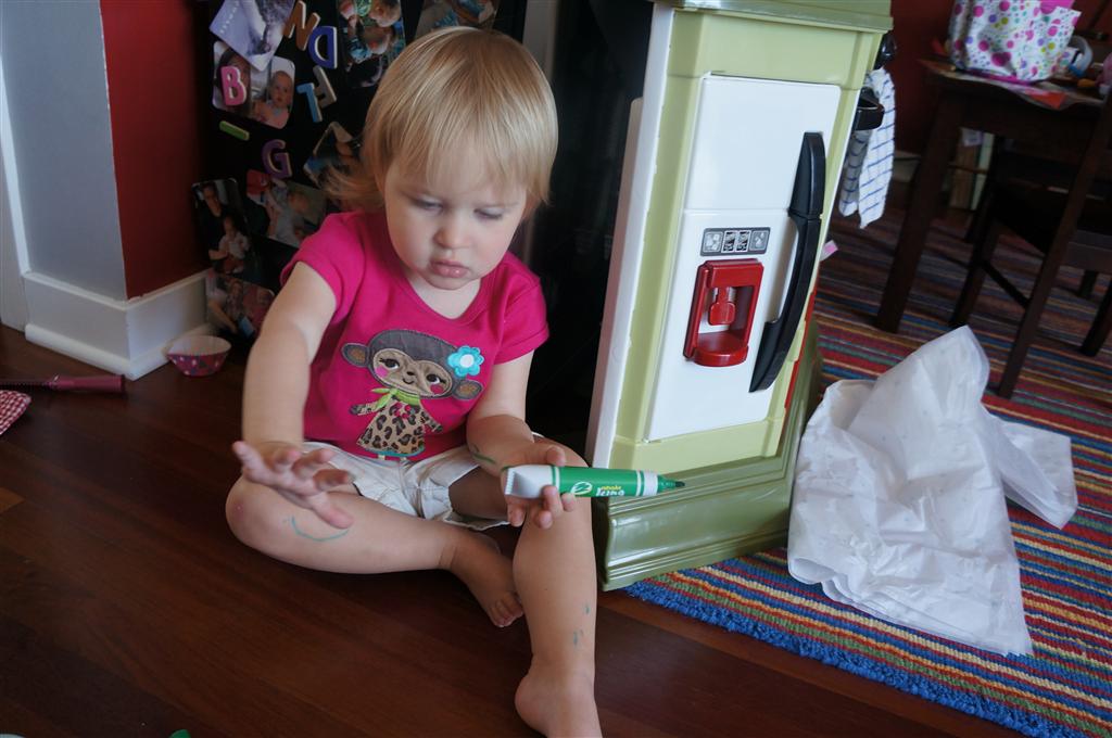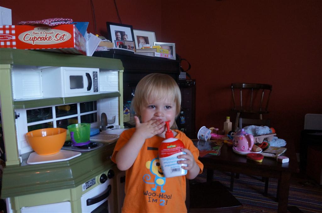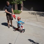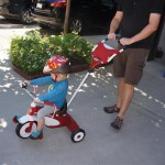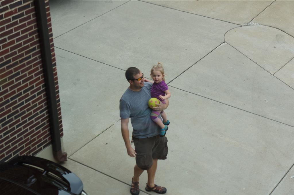 Eleanor had her doctor checkup this week, and everything went well, although she didn’t appreciate the flu shot. We had heard rumors that they would ask us if Eleanor can jump yet (which she can’t) but it didn’t come up. Eleanor had lots of fun this week outside, she rode on her new tricycle for the first time, although because she has to wear her bike helmet while on it, she currently prefers to push it rather than ride on it. Hopefully that will change soon. She also discovered a new game where Dad throws the ball high in the air, and Eleanor giggles while it bounces and then chases it down for a repeat. On a funny side note, Mom found Eleanor in her crib one afternoon after her nap completely naked from the waist down – she had for some reason taken off her pants and diaper (also not pictured :) ).