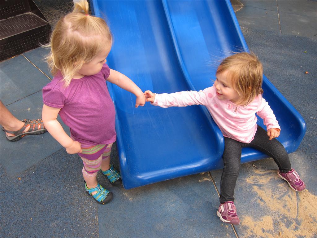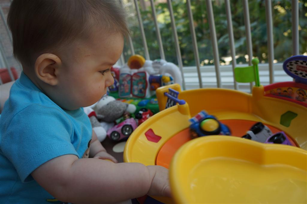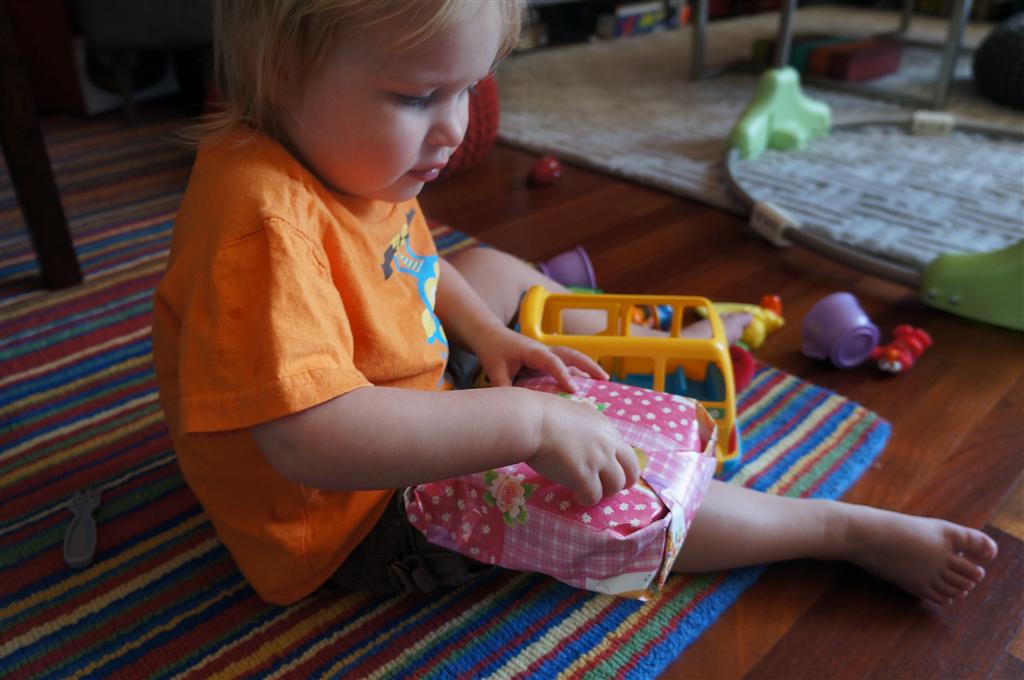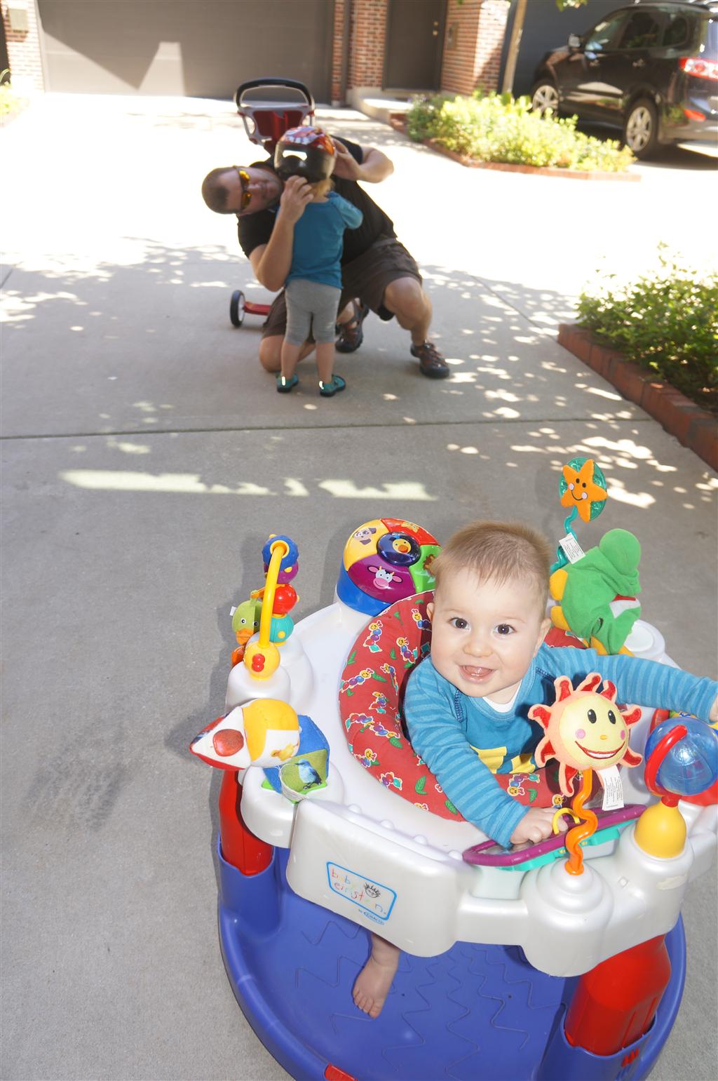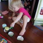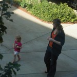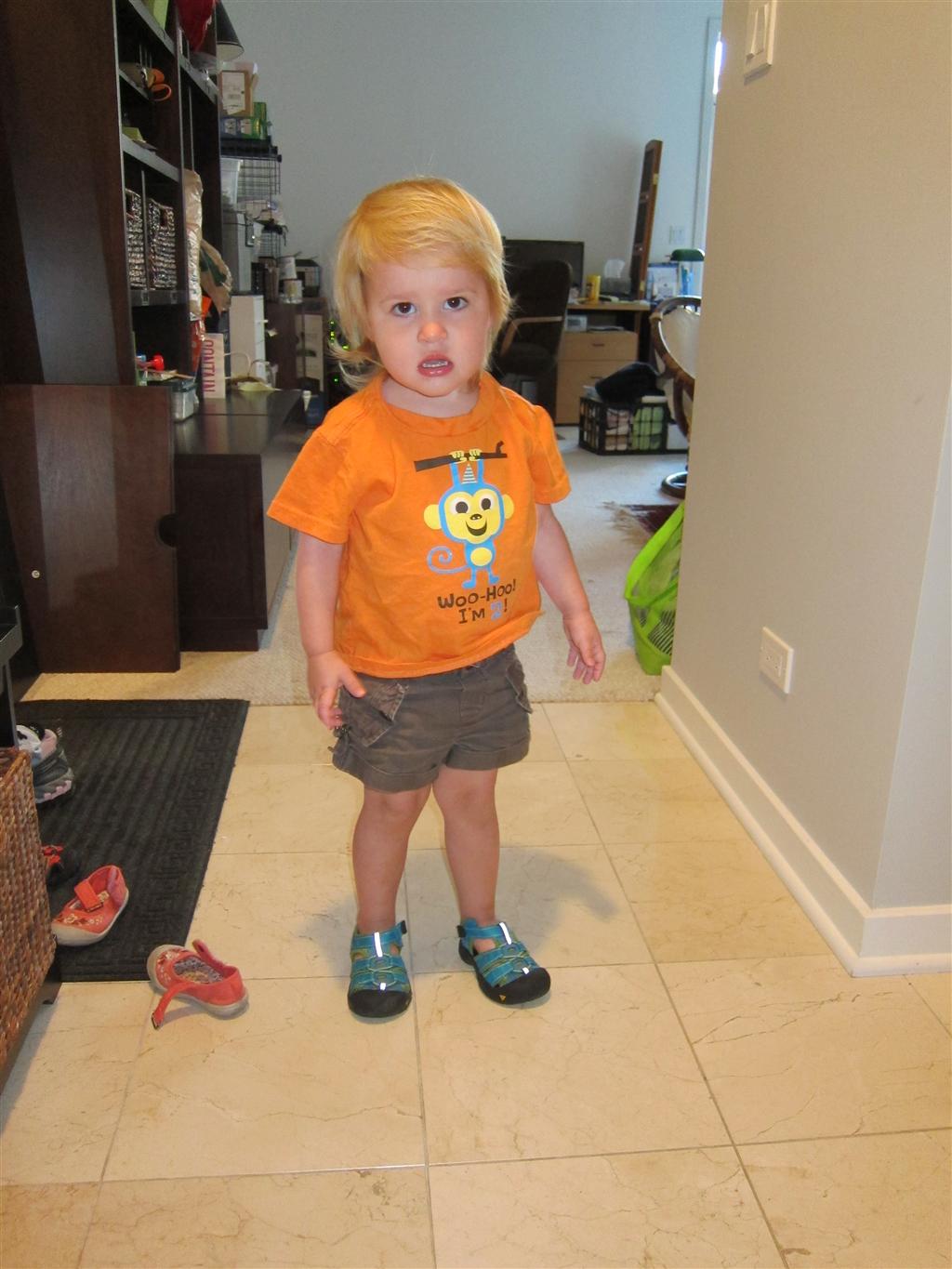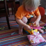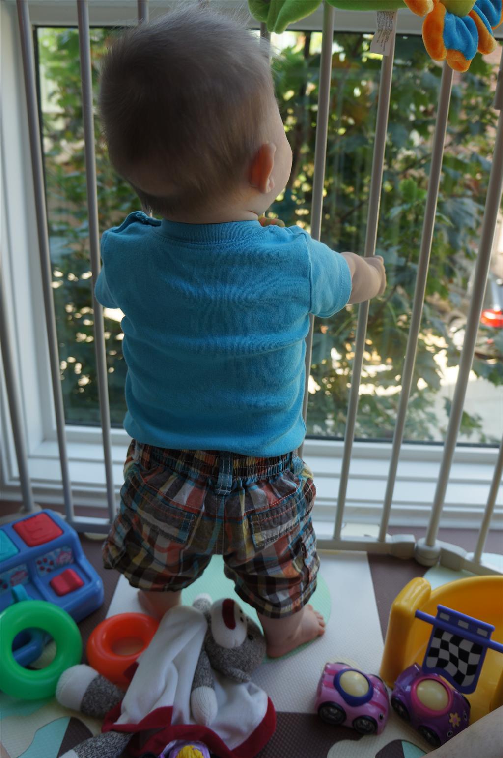Eleanor had her doctor checkup this week, and everything went well, although she didn’t appreciate the flu shot. We had heard rumors that they would ask us if Eleanor can jump yet (which she can’t) but it didn’t come up. Eleanor had lots of fun this week outside, she rode on her new tricycle for the first time, although because she has to wear her bike helmet while on it, she currently prefers to push it rather than ride on it. Hopefully that will change soon. She also discovered a new game where Dad throws the ball high in the air, and Eleanor giggles while it bounces and then chases it down for a repeat. On a funny side note, Mom found Eleanor in her crib one afternoon after her nap completely naked from the waist down – she had for some reason taken off her pants and diaper (also not pictured :) ).
