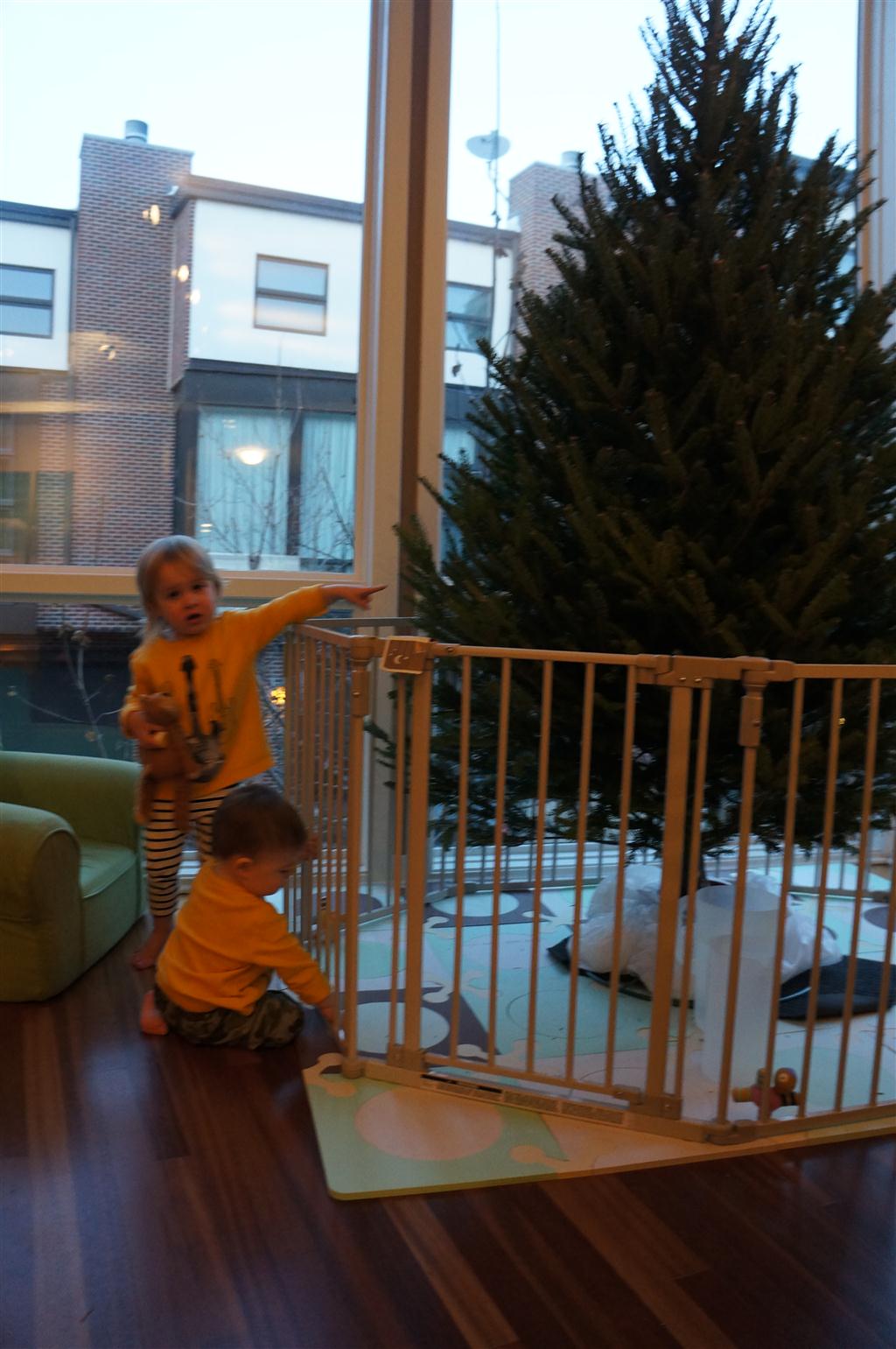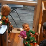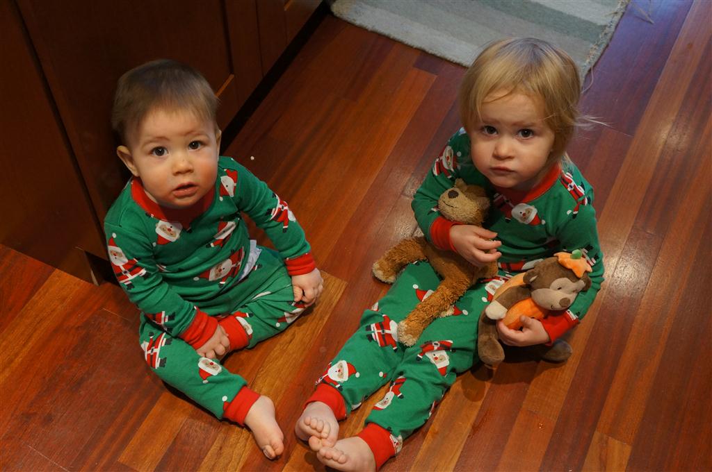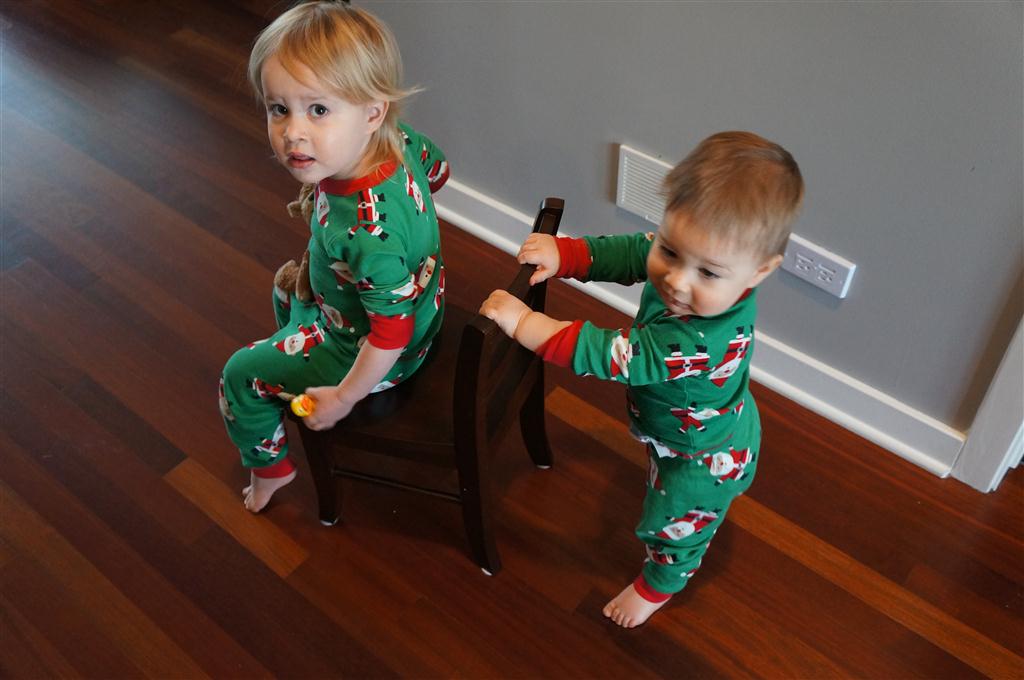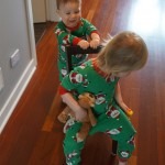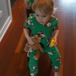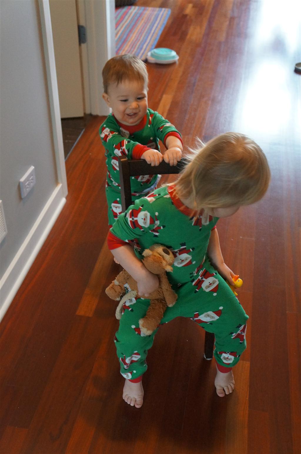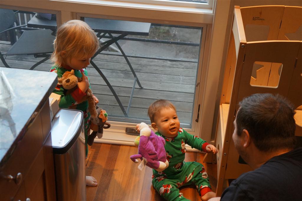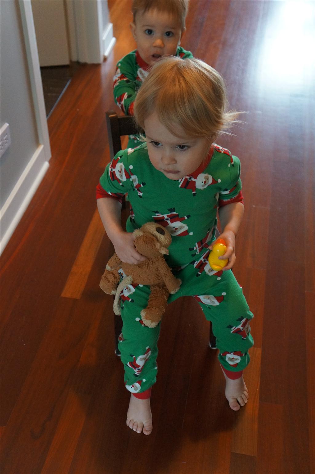 Happy December! It was a busy week for Eleanor and Henry – they started out with Eleanor’s first soccer practice – aptly named “Little Kickers”. I asked Eleanor how it went, and she told me that she sat on a ball. Hopefully they progress to kicking the ball at some point :) On Thursday night Eleanor and Henry got dressed up in their Santa pajamas in preparation for a visit on Friday. Despite lots of discussions about sitting on Santa’s lap for a photo, and how much fun it would be, Eleanor burst into tears as we put her on Santa’s lap. I’m pretty sure Grandma has almost the exact same picture featuring Santa and Auntie Susan. Uncle B and Breanne came over for a visit on Saturday while Mom was out – giving Dad some much needed help. Eleanor had so much fun playing with them outside that they each got a goodbye fist bump AND a goodbye hug. On Sunday, we put up the Christmas tree. Eleanor and Henry were only mildly impressed, but as usual Zapa was very excited.