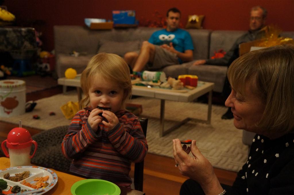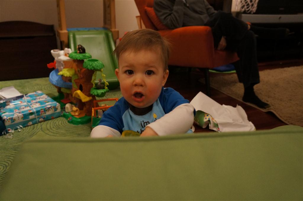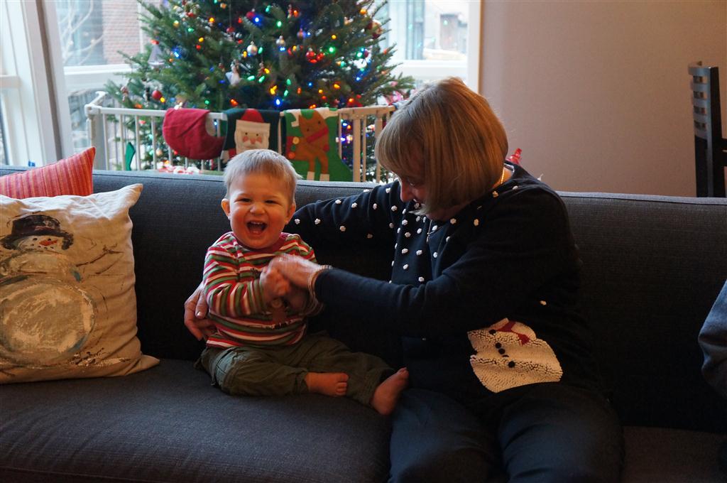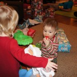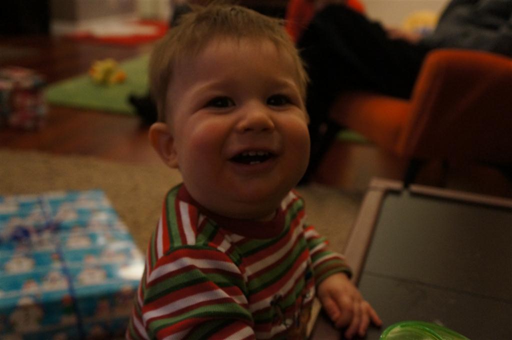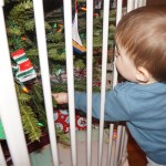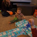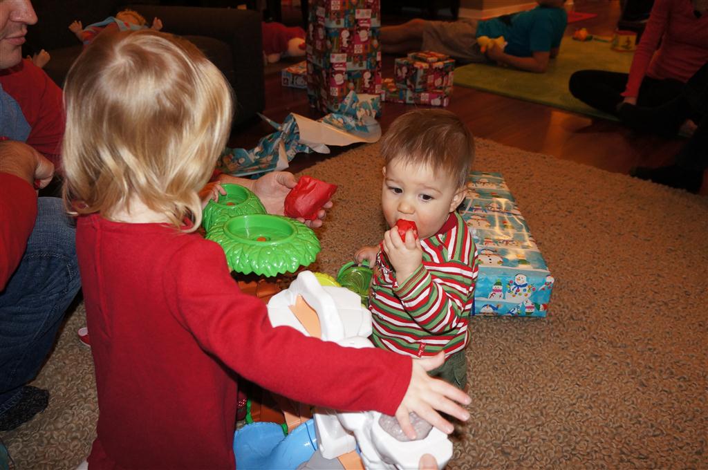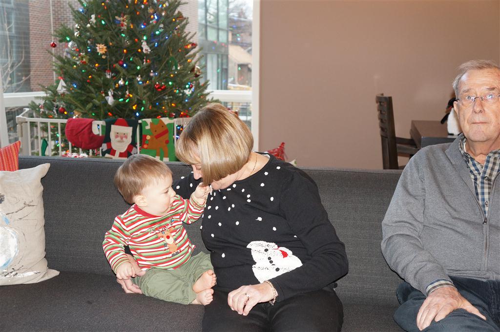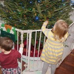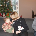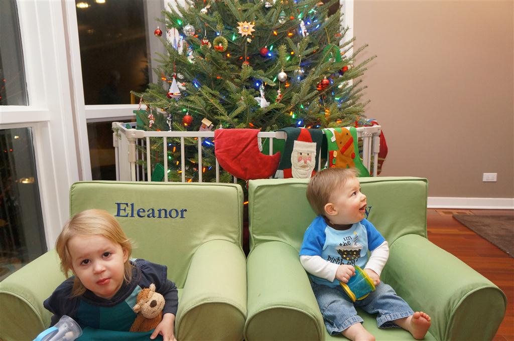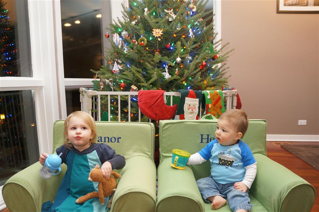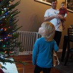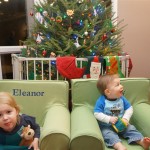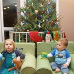 Eleanor and Henry celebrated and early Christmas with Grandma and Grandpa this week. We also put up our Christmas tree, and Eleanor put a few ornaments on the tree herself. She was very excited about the whole process, and reminds us each morning to turn on the lights on the tree. We figured we would outsmart Henry and leave the play yard gate up around the tree, but he could reach the tree right through it and had some fun taking the lights back off the tree. We also celebrated an early birthday for Henry while Grandma and Grandpa were in town. Henry was interested in the icing from his cupcake for a bit, but wasn’t interested in the actual cake. Eleanor was very interested in eating her cupcake and sharing an Oreo with Grandma :)