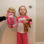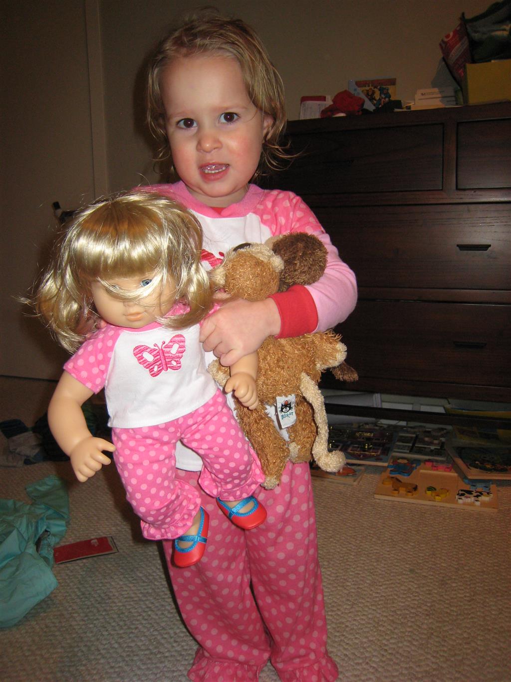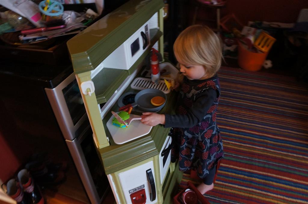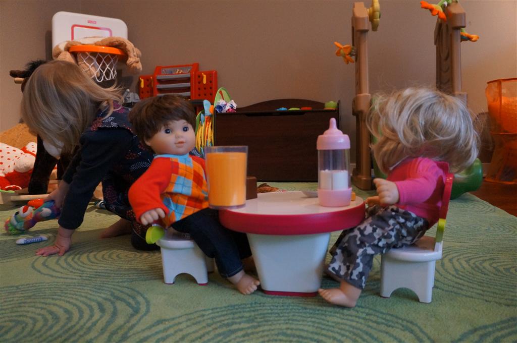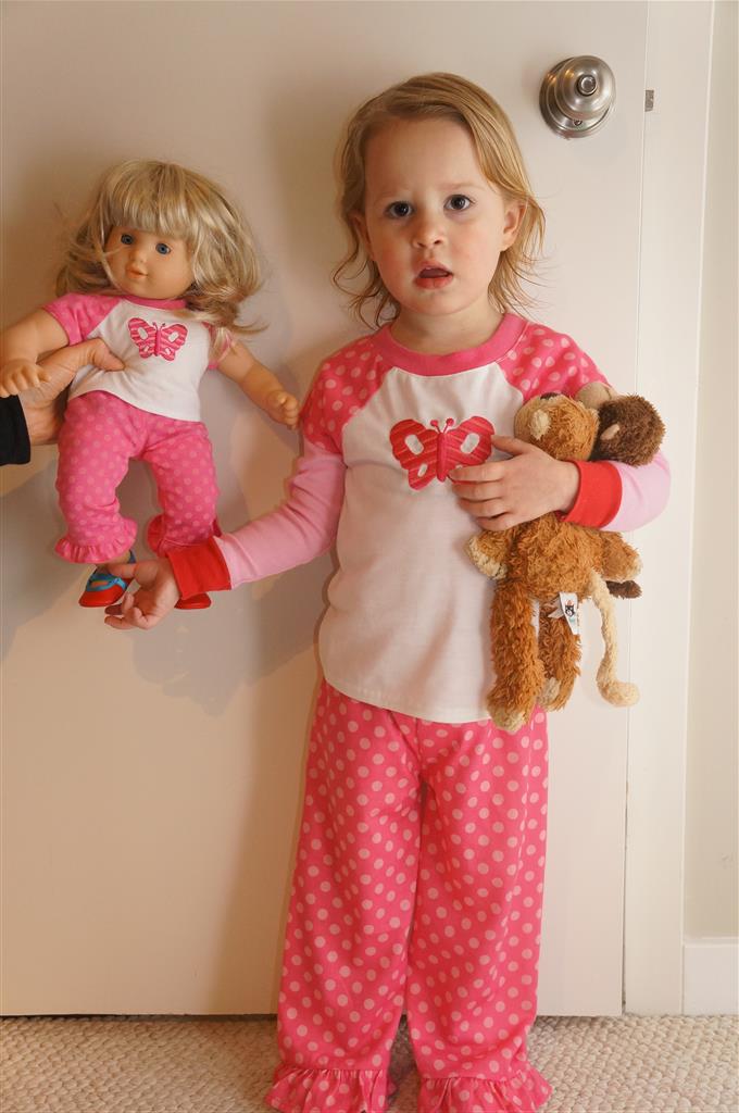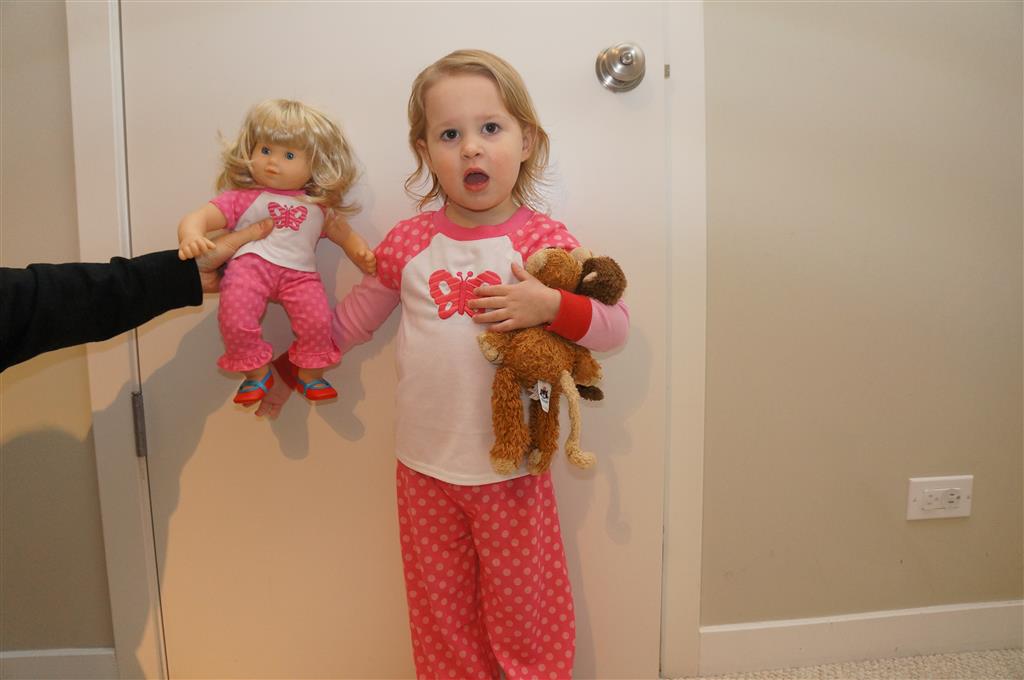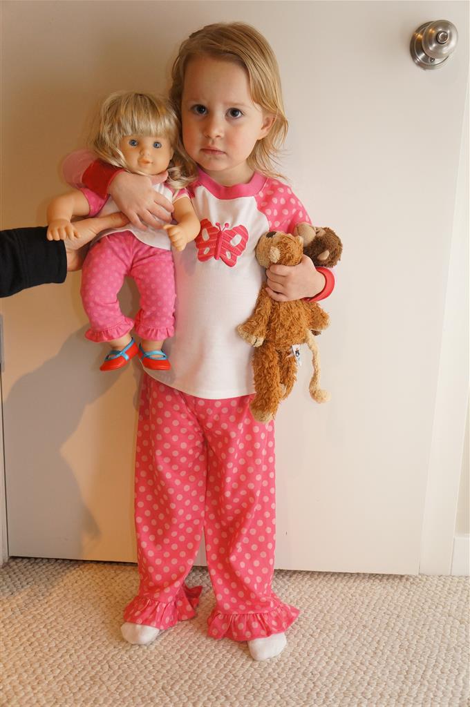 Eleanor really got into her Bitty Baby twins (Gray and Hobbes) on Sunday, and made them a full lunch. It was quite a sight to see her frying up a pancake at her kitchen, holding a spatula in one hand, and in the other hand holding Monkey’s hand and a spatula for Monkey. Hobbes didn’t get to sit at the table much though, as Monkey got the seat opposite Gray. Eleanor was very excited for her and Gray to wear their matching pajamas for the first time Sunday night. She even put up with Dad taking lots of pictures. Matching pajamas has been a popular thing with Eleanor lately, several times this week picking out pajamas that matched Henry’s. Saturday night Henry went to bed before Eleanor came upstairs, so she asked me what pajamas Henry was wearing so that she could put on ones that matched. Earlier in the week, Mom was telling Eleanor that they were going to soccer class the next day, and Eleanor replied “I will be a little bit not listening, and then I will run away and go play on the blue things, and then I will dilly-dally” :) So much for mental preparation…