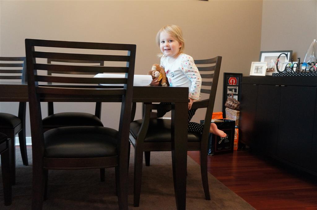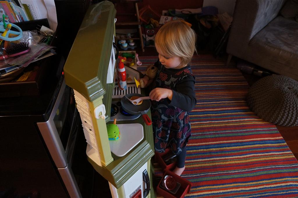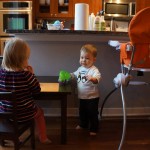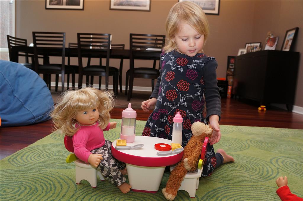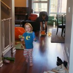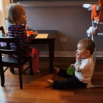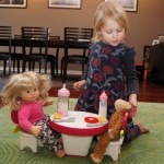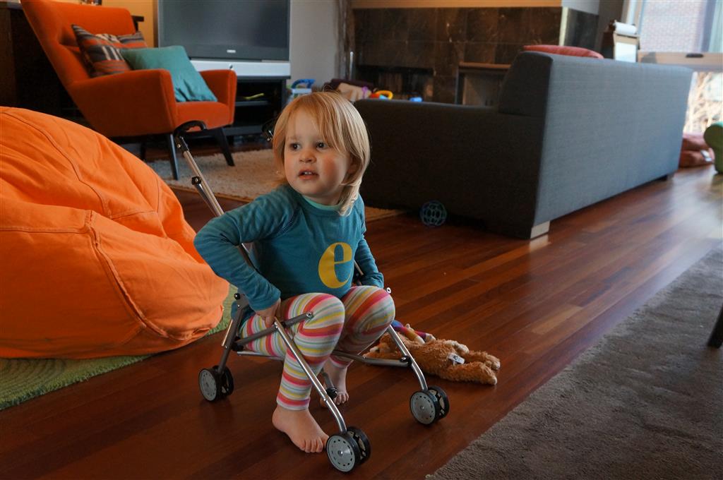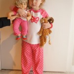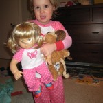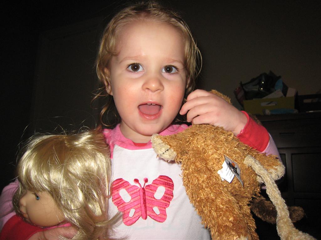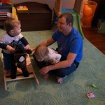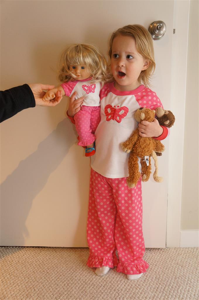Eleanor really got into her Bitty Baby twins (Gray and Hobbes) on Sunday, and made them a full lunch. It was quite a sight to see her frying up a pancake at her kitchen, holding a spatula in one hand, and in the other hand holding Monkey’s hand and a spatula for Monkey. Hobbes didn’t get to sit at the table much though, as Monkey got the seat opposite Gray. Eleanor was very excited for her and Gray to wear their matching pajamas for the first time Sunday night. She even put up with Dad taking lots of pictures. Matching pajamas has been a popular thing with Eleanor lately, several times this week picking out pajamas that matched Henry’s. Saturday night Henry went to bed before Eleanor came upstairs, so she asked me what pajamas Henry was wearing so that she could put on ones that matched. Earlier in the week, Mom was telling Eleanor that they were going to soccer class the next day, and Eleanor replied “I will be a little bit not listening, and then I will run away and go play on the blue things, and then I will dilly-dally” :) So much for mental preparation…