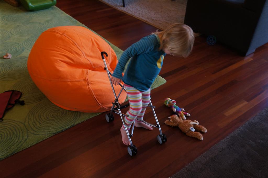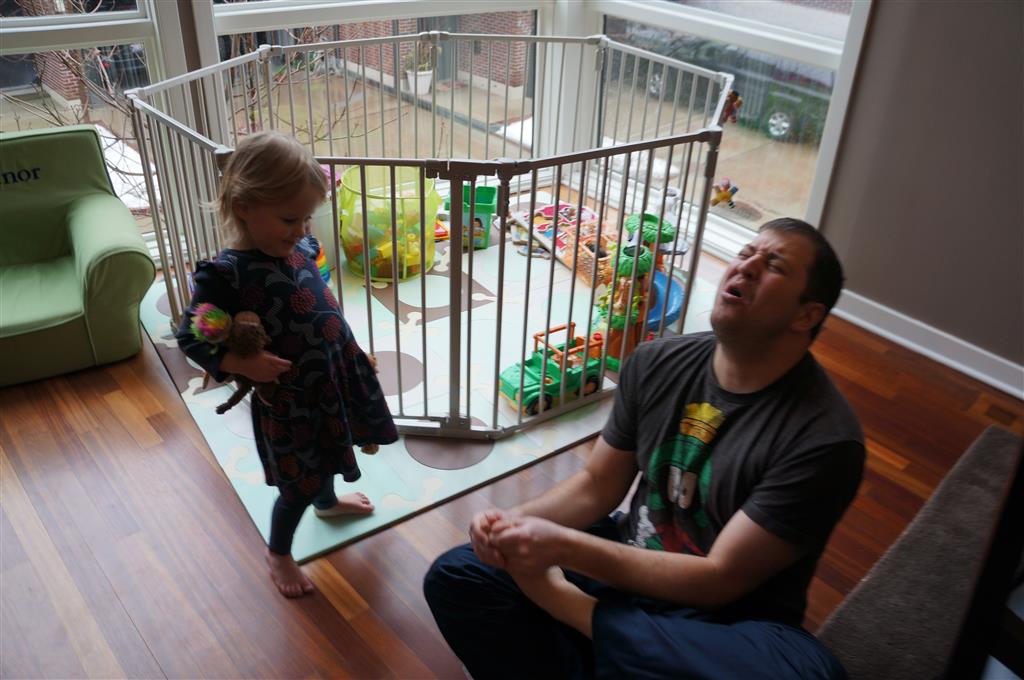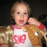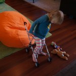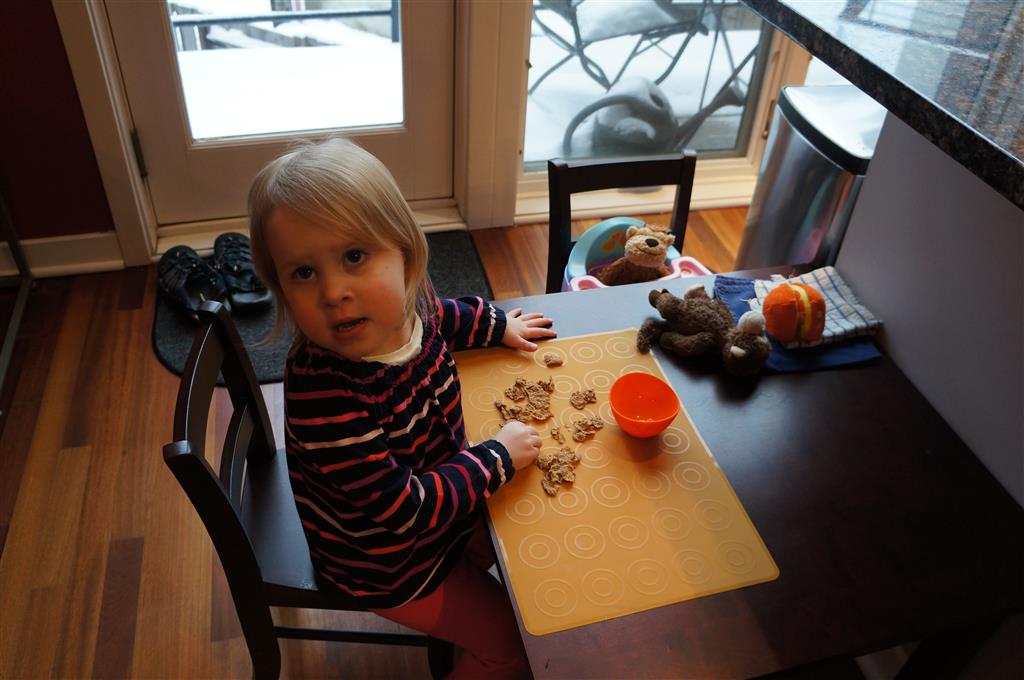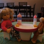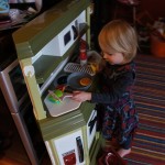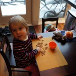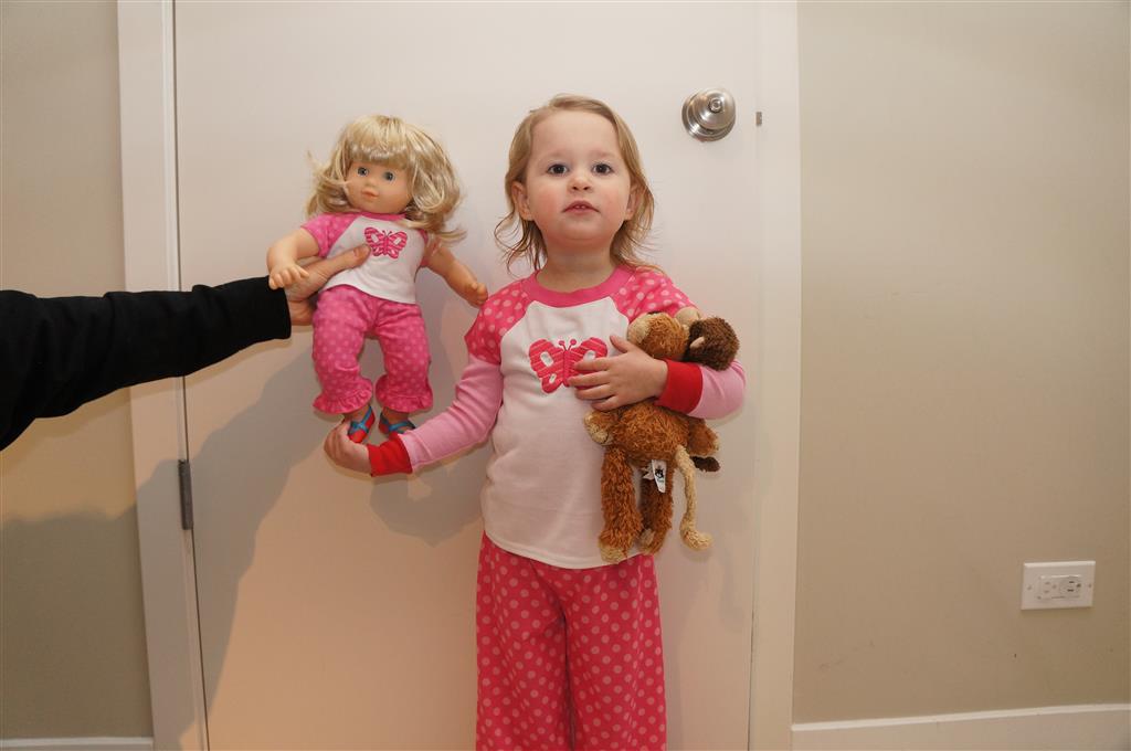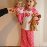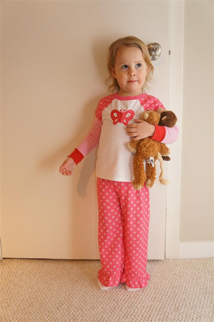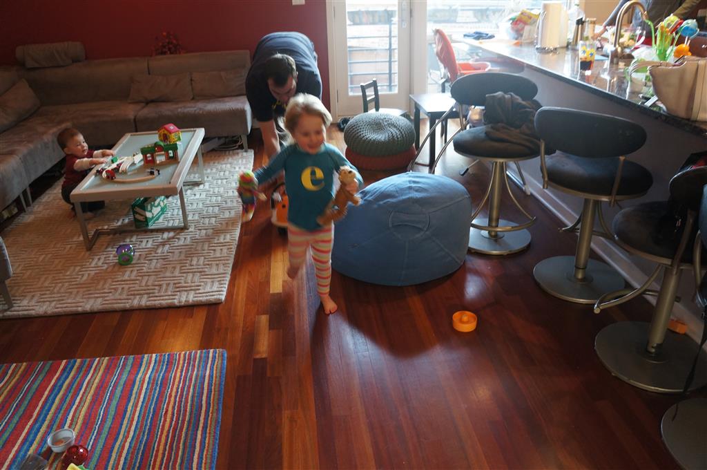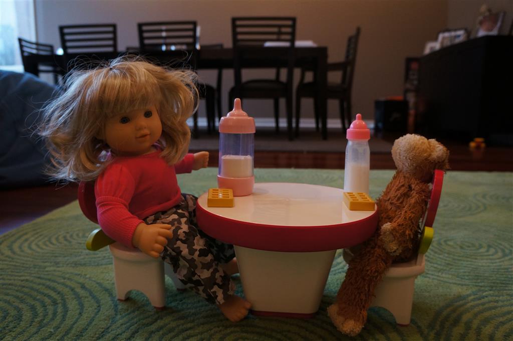 Eleanor really got into her Bitty Baby twins (Gray and Hobbes) on Sunday, and made them a full lunch. It was quite a sight to see her frying up a pancake at her kitchen, holding a spatula in one hand, and in the other hand holding Monkey’s hand and a spatula for Monkey. Hobbes didn’t get to sit at the table much though, as Monkey got the seat opposite Gray. Eleanor was very excited for her and Gray to wear their matching pajamas for the first time Sunday night. She even put up with Dad taking lots of pictures. Matching pajamas has been a popular thing with Eleanor lately, several times this week picking out pajamas that matched Henry’s. Saturday night Henry went to bed before Eleanor came upstairs, so she asked me what pajamas Henry was wearing so that she could put on ones that matched. Earlier in the week, Mom was telling Eleanor that they were going to soccer class the next day, and Eleanor replied “I will be a little bit not listening, and then I will run away and go play on the blue things, and then I will dilly-dally” :) So much for mental preparation…