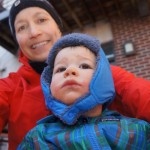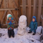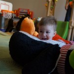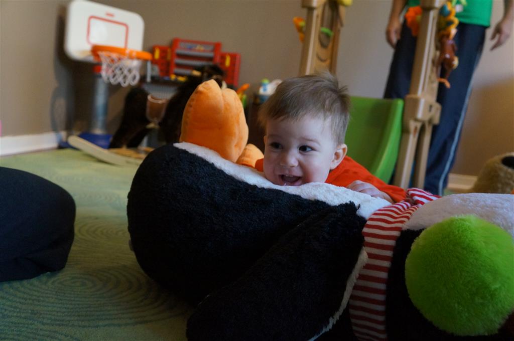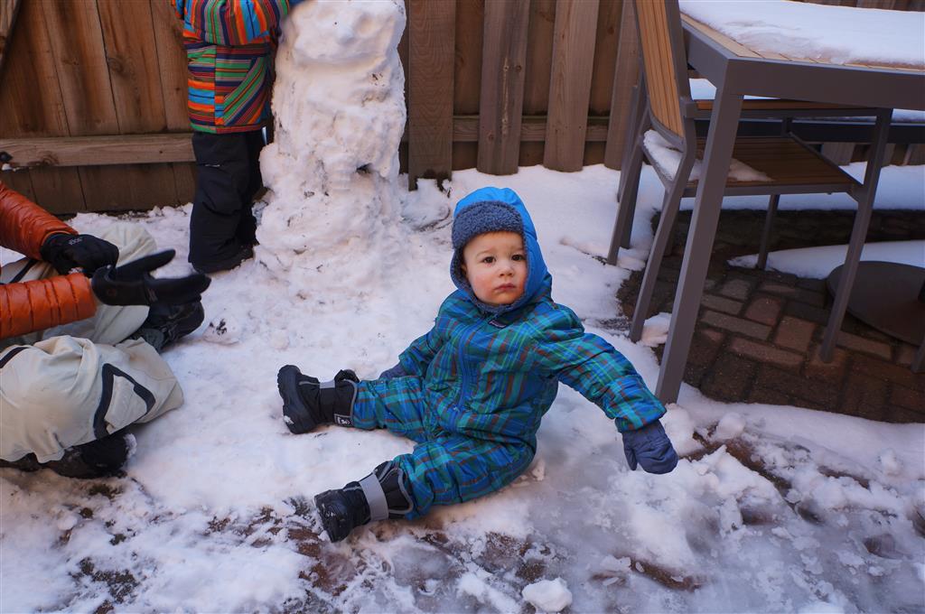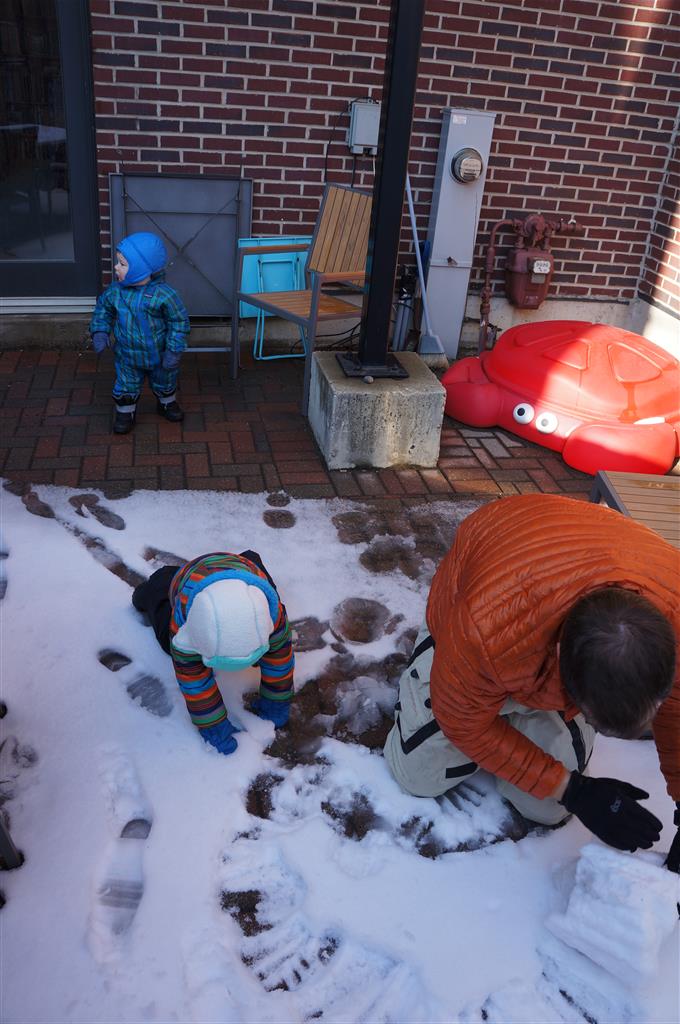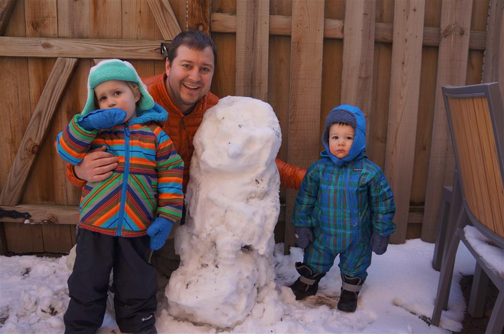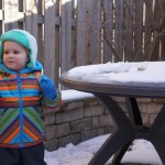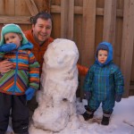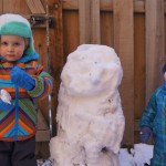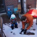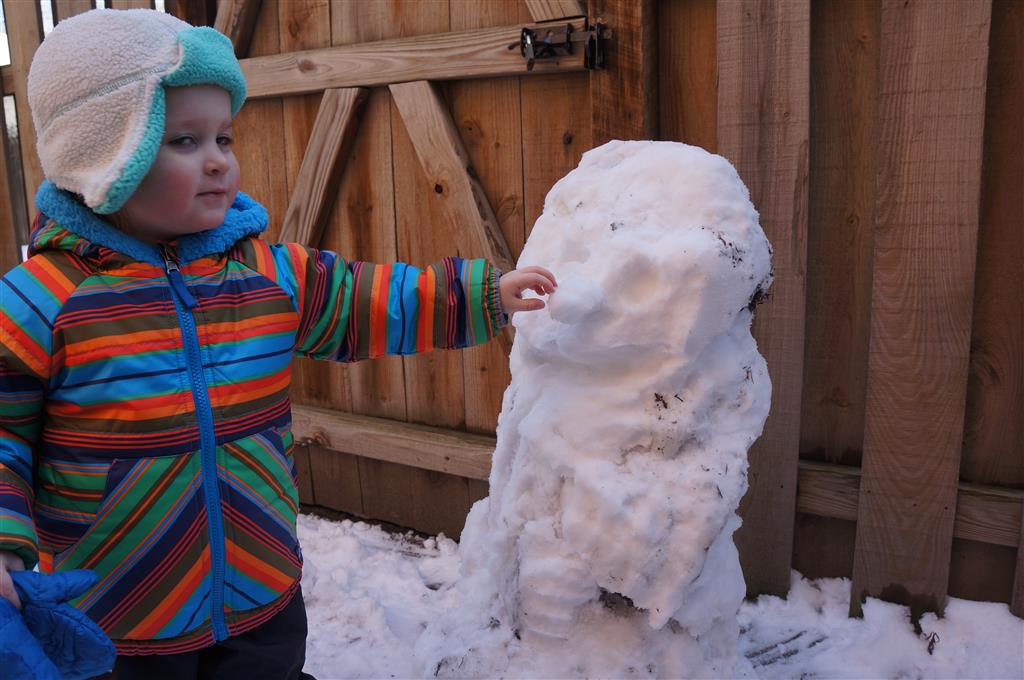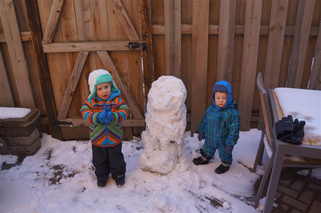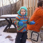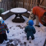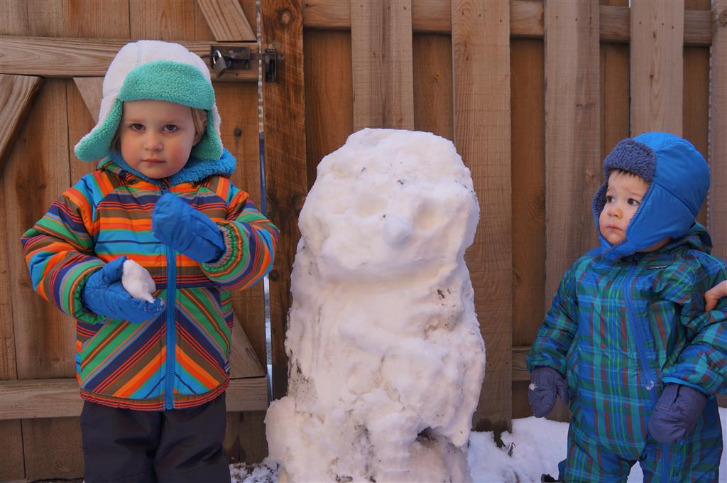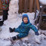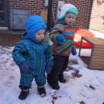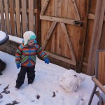 We went to a birthday party for Eleanor’s twin friends at “Pump It Up”, a bouncy castle playland, and Eleanor loved it. She especially liked the big slides, and later told me that she wanted to go there again. Henry didn’t like it as much, but did enjoy the cupcake at the end. On Sunday we all went into the back yard and built a snowman. Henry was not very impressed, partly because he had trouble maneuvering in his snowsuit, but Eleanor was very entertained. She helped by bringing over snow, and giggled when she touched its nose. Uncle B capped off the weekend with a surprise visit, which Eleanor declared her favorite part of the day (even beating out the snowman!).