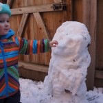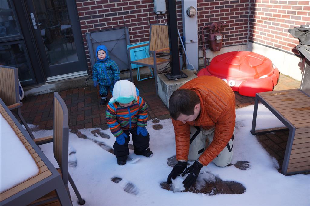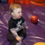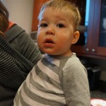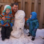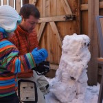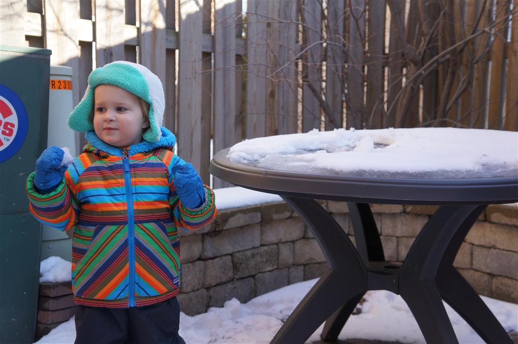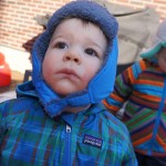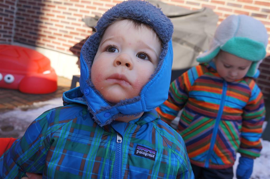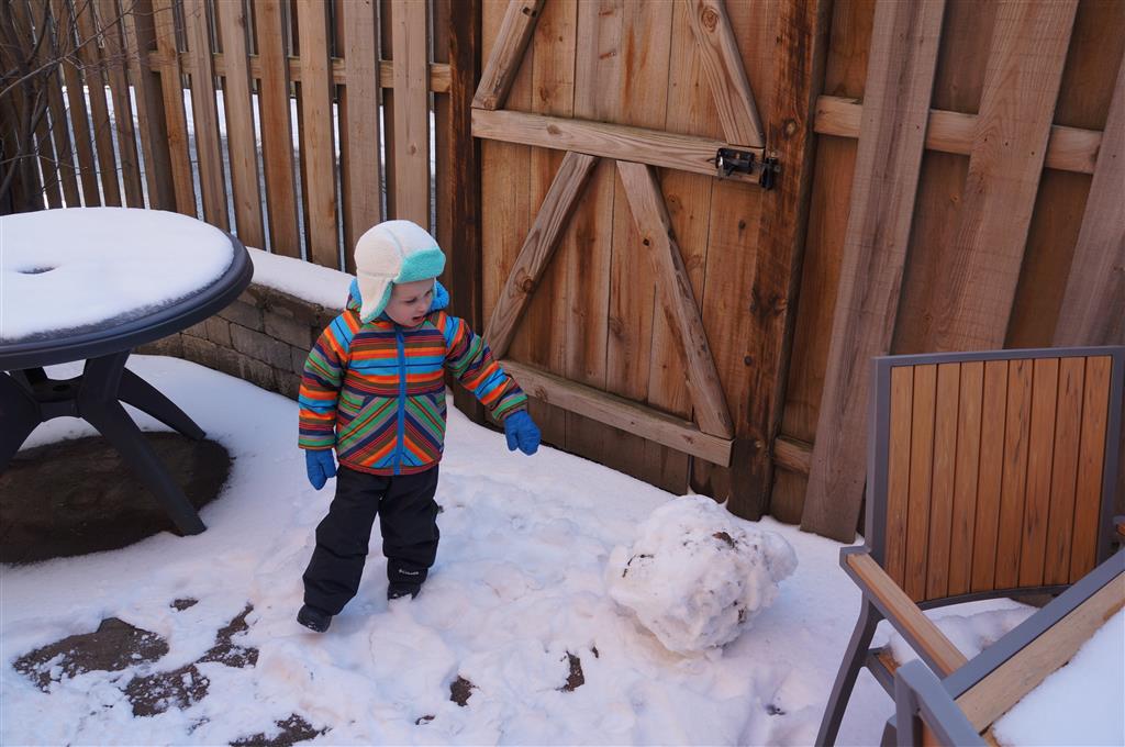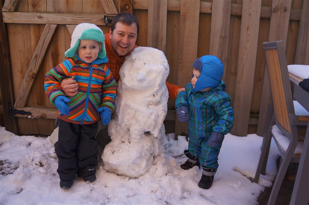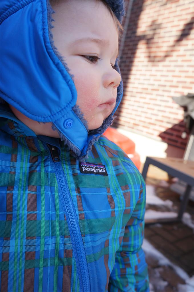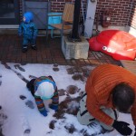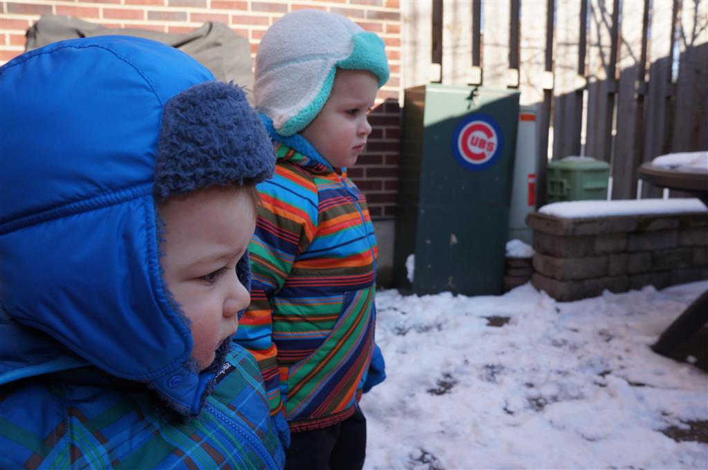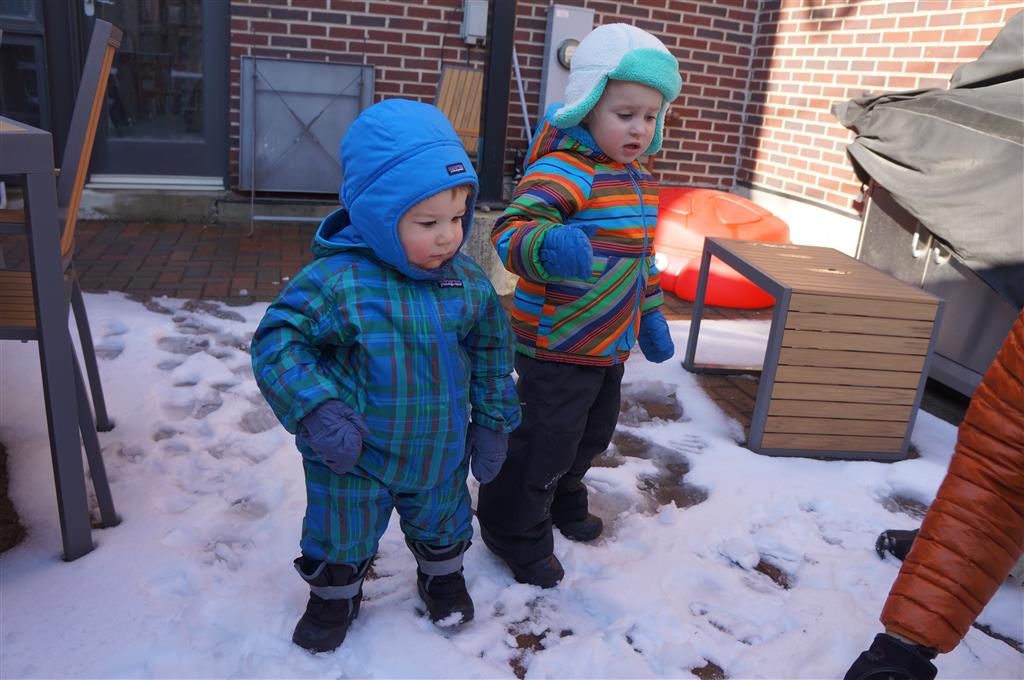 We went to a birthday party for Eleanor’s twin friends at “Pump It Up”, a bouncy castle playland, and Eleanor loved it. She especially liked the big slides, and later told me that she wanted to go there again. Henry didn’t like it as much, but did enjoy the cupcake at the end. On Sunday we all went into the back yard and built a snowman. Henry was not very impressed, partly because he had trouble maneuvering in his snowsuit, but Eleanor was very entertained. She helped by bringing over snow, and giggled when she touched its nose. Uncle B capped off the weekend with a surprise visit, which Eleanor declared her favorite part of the day (even beating out the snowman!).