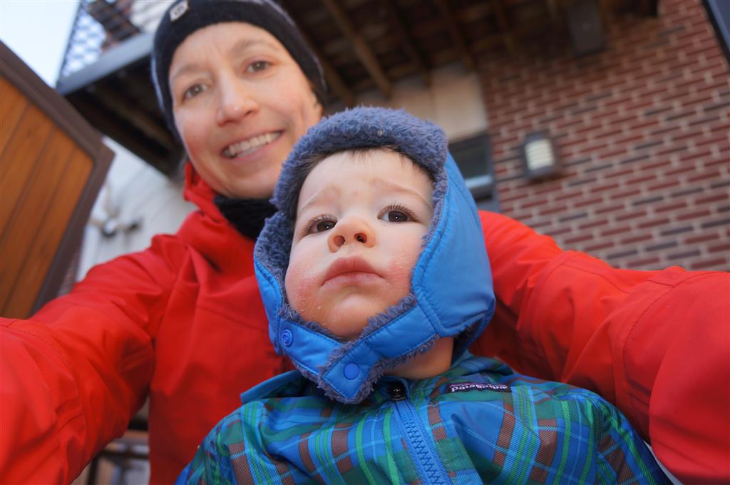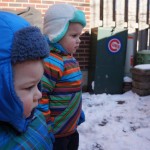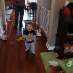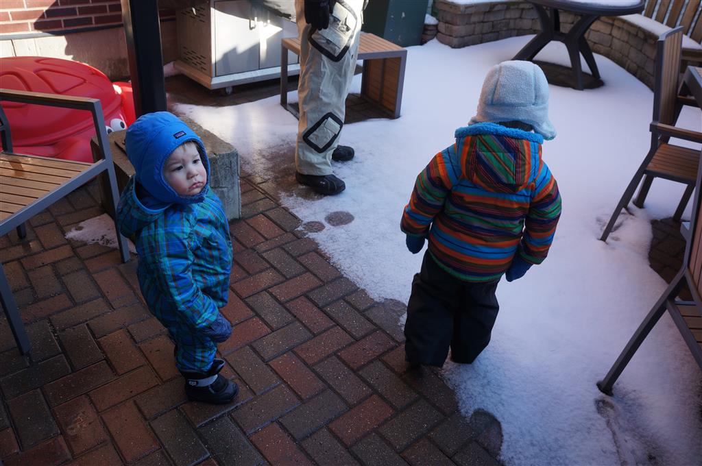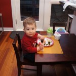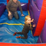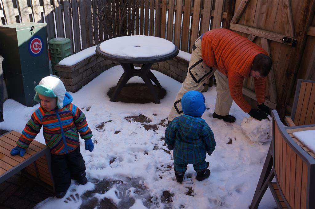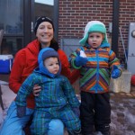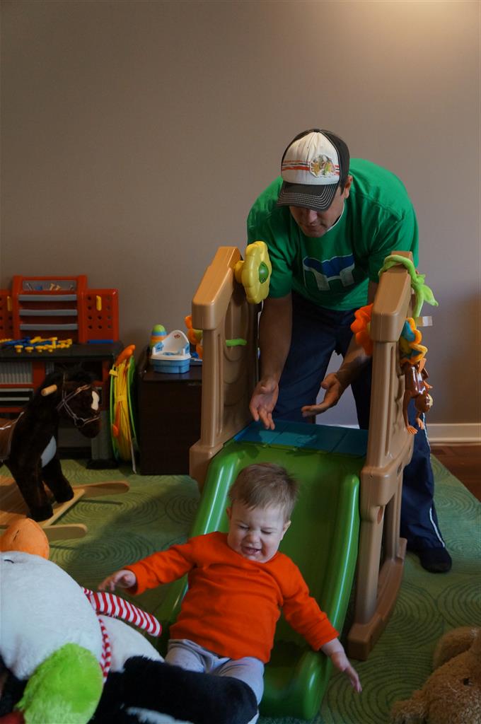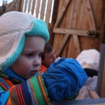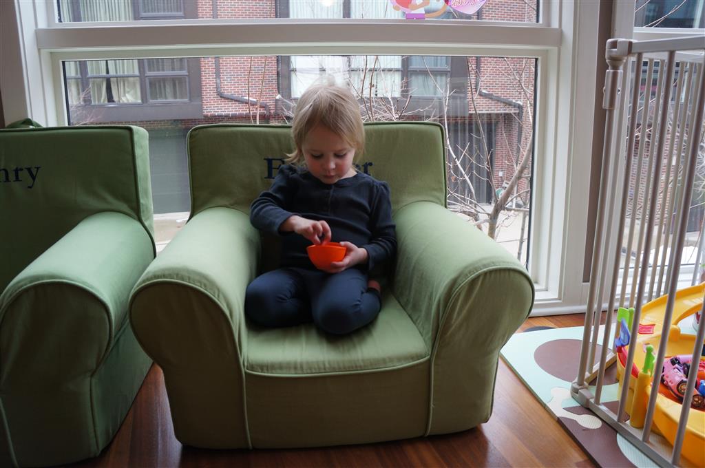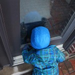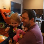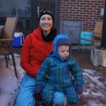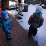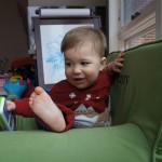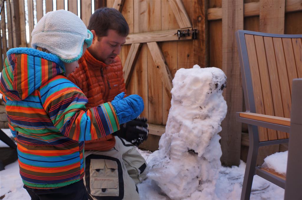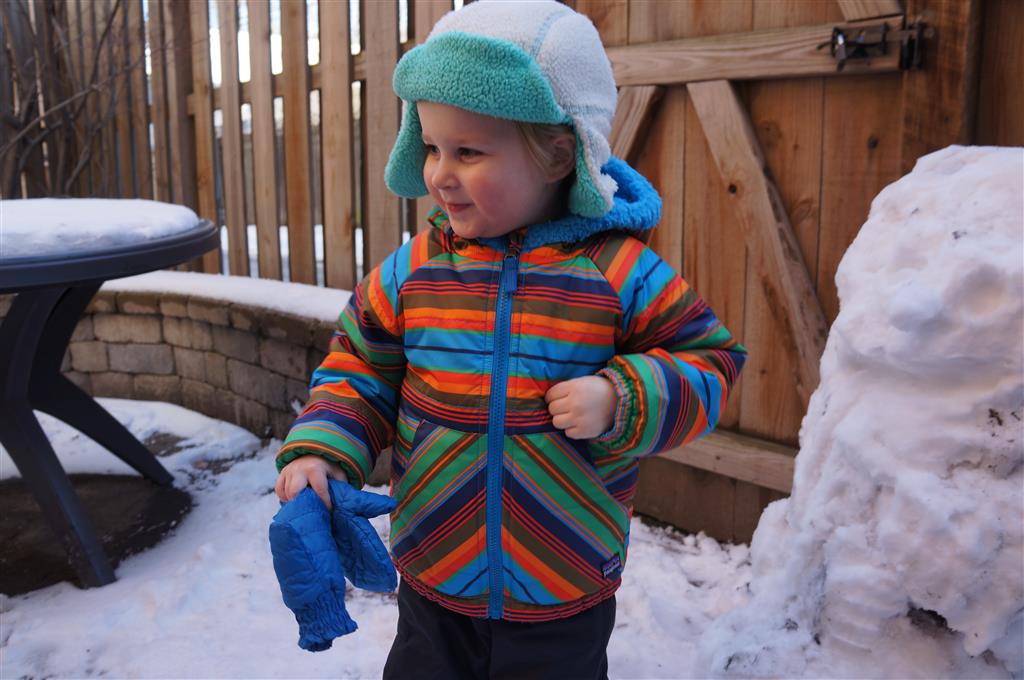 We went to a birthday party for Eleanor’s twin friends at “Pump It Up”, a bouncy castle playland, and Eleanor loved it. She especially liked the big slides, and later told me that she wanted to go there again. Henry didn’t like it as much, but did enjoy the cupcake at the end. On Sunday we all went into the back yard and built a snowman. Henry was not very impressed, partly because he had trouble maneuvering in his snowsuit, but Eleanor was very entertained. She helped by bringing over snow, and giggled when she touched its nose. Uncle B capped off the weekend with a surprise visit, which Eleanor declared her favorite part of the day (even beating out the snowman!).