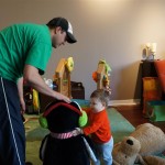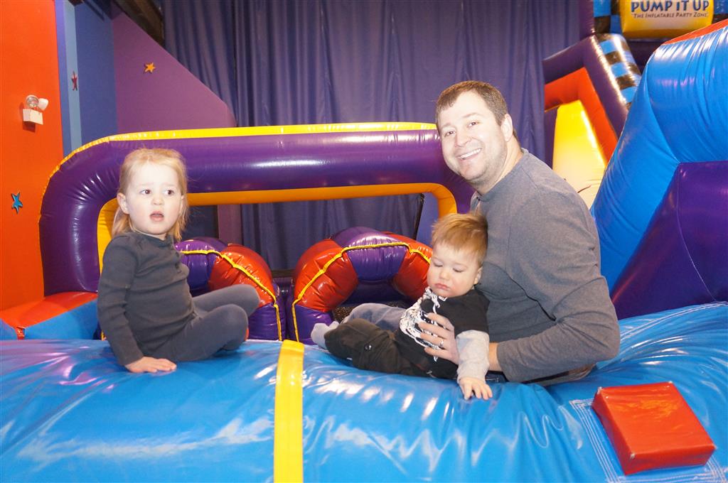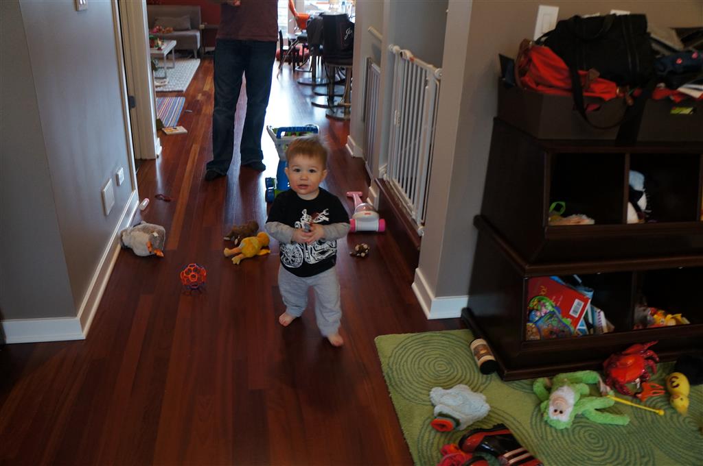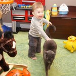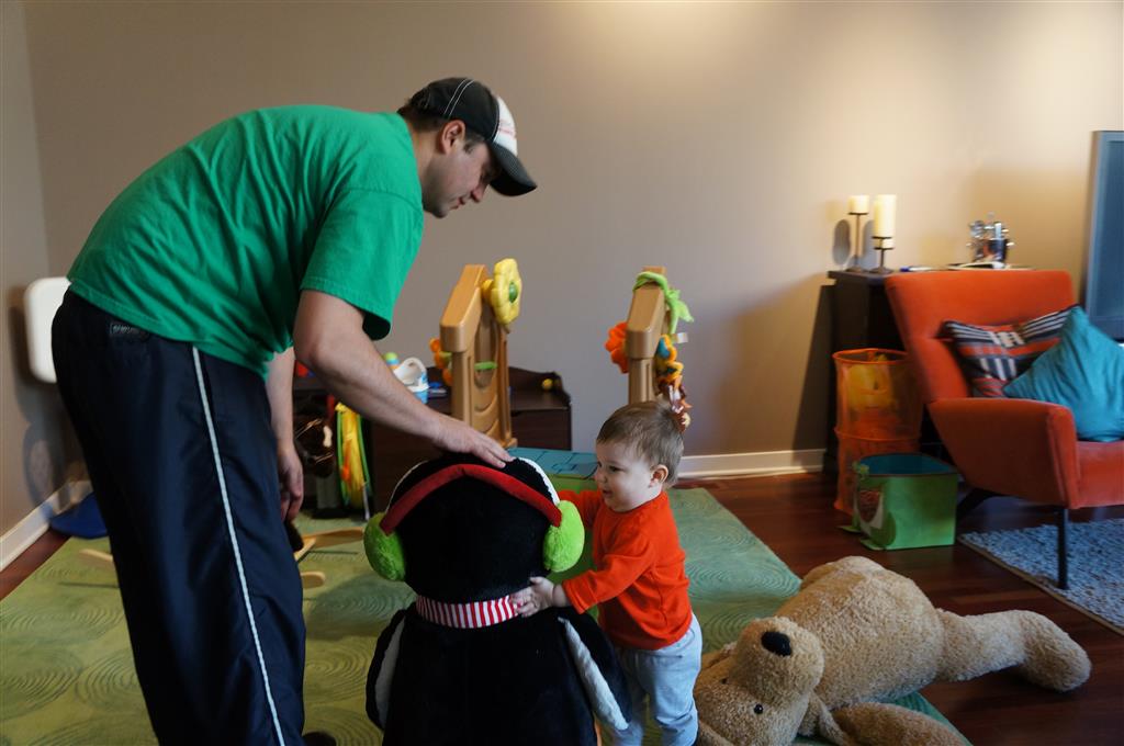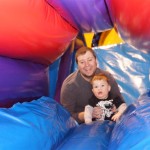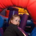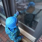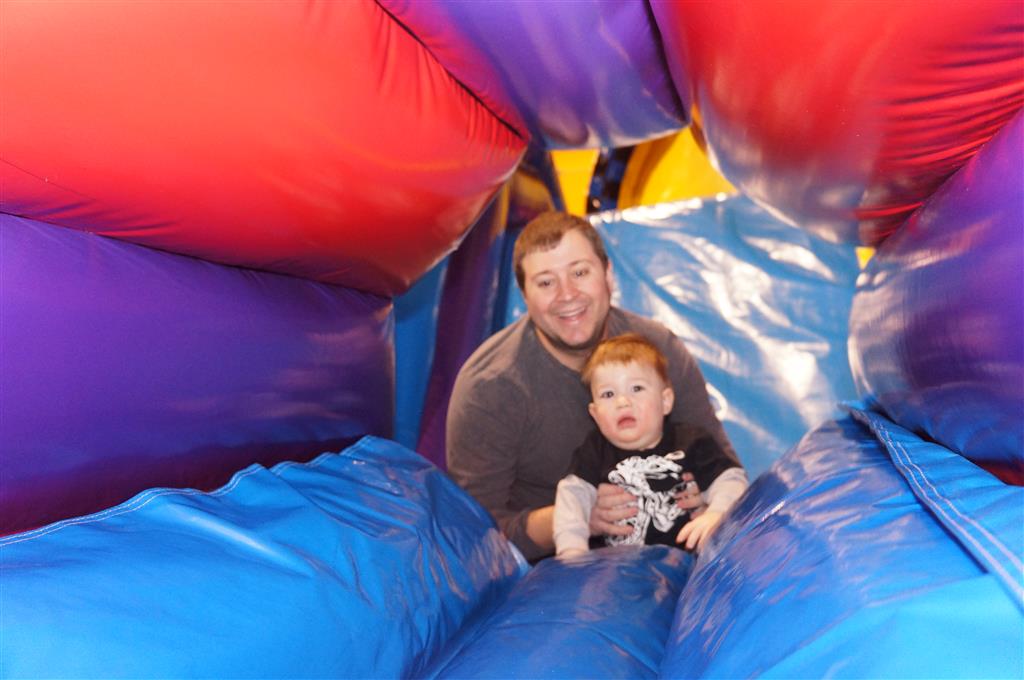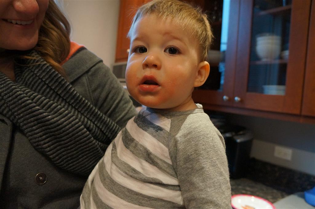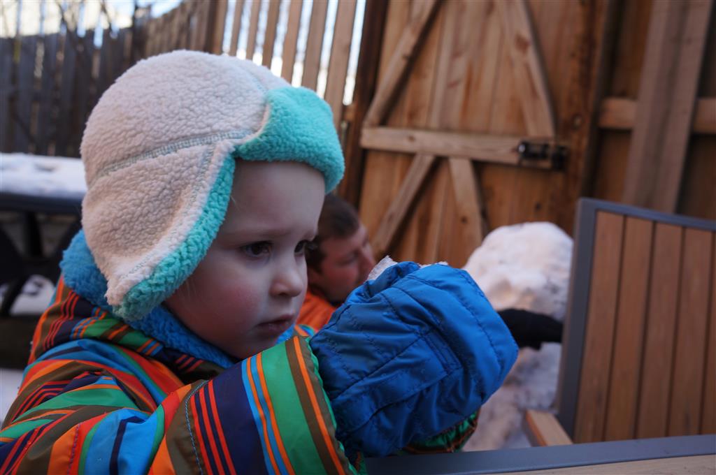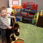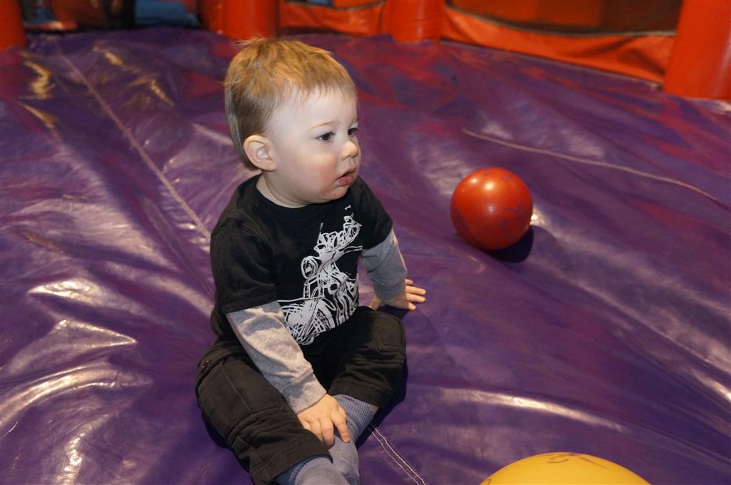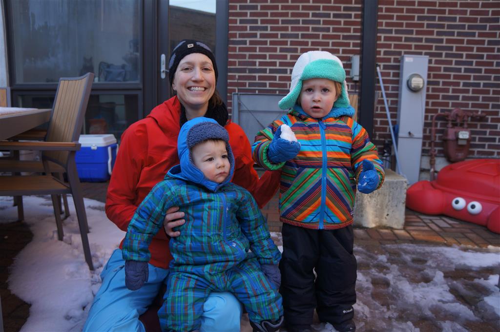 We went to a birthday party for Eleanor’s twin friends at “Pump It Up”, a bouncy castle playland, and Eleanor loved it. She especially liked the big slides, and later told me that she wanted to go there again. Henry didn’t like it as much, but did enjoy the cupcake at the end. On Sunday we all went into the back yard and built a snowman. Henry was not very impressed, partly because he had trouble maneuvering in his snowsuit, but Eleanor was very entertained. She helped by bringing over snow, and giggled when she touched its nose. Uncle B capped off the weekend with a surprise visit, which Eleanor declared her favorite part of the day (even beating out the snowman!).