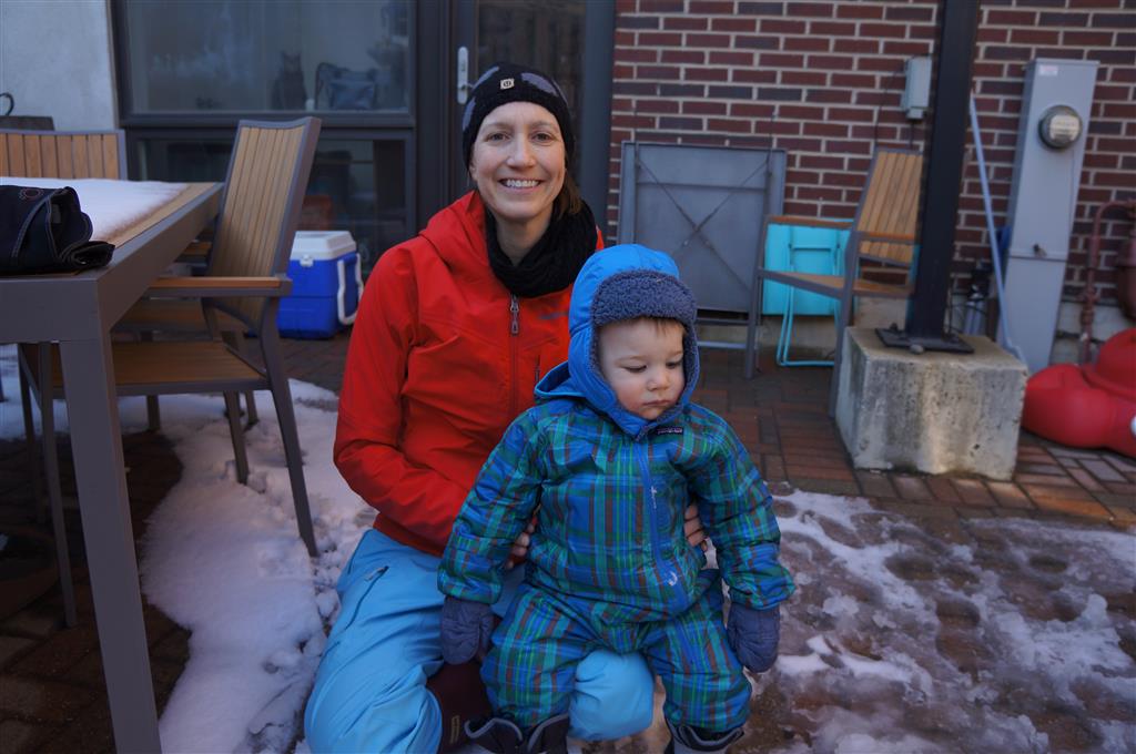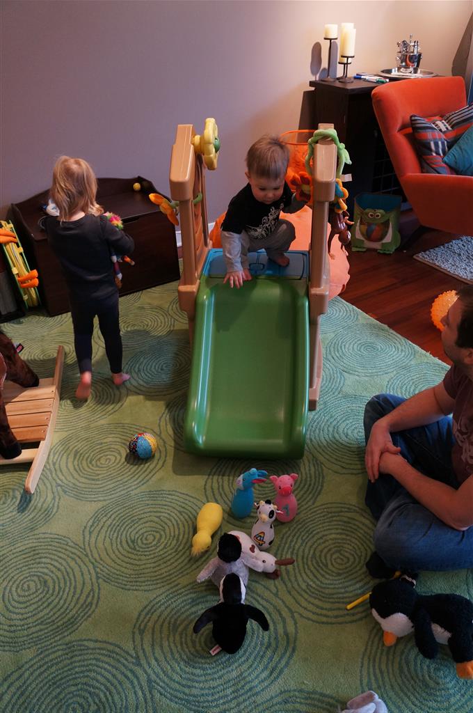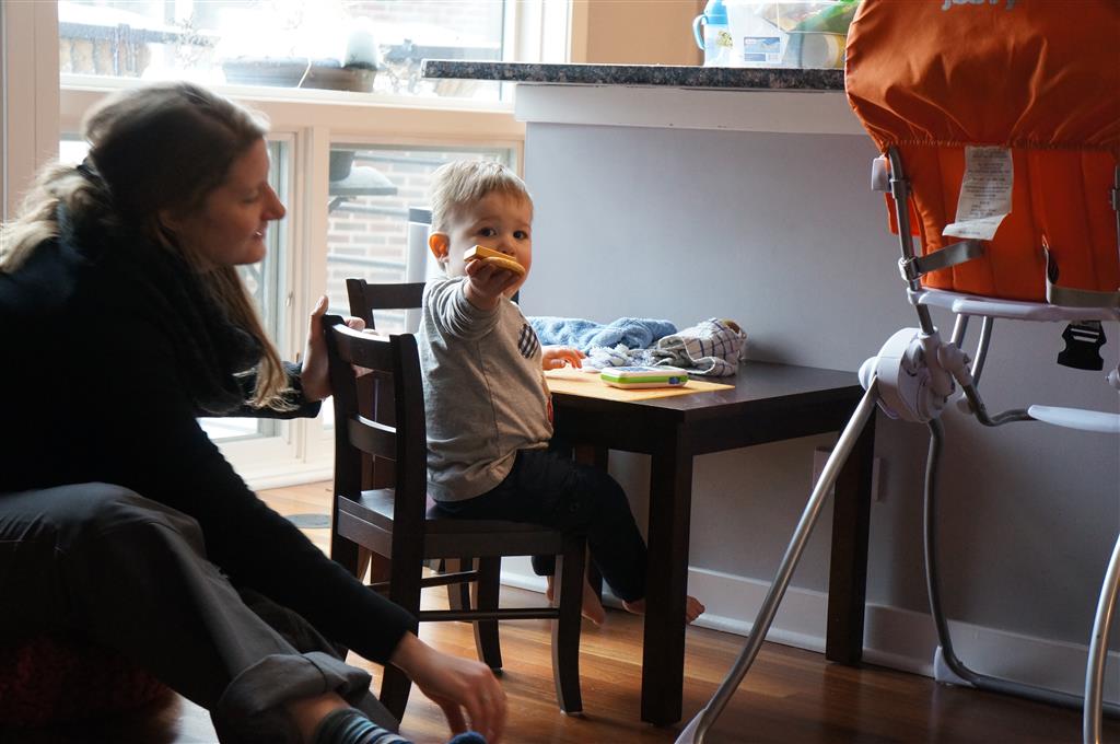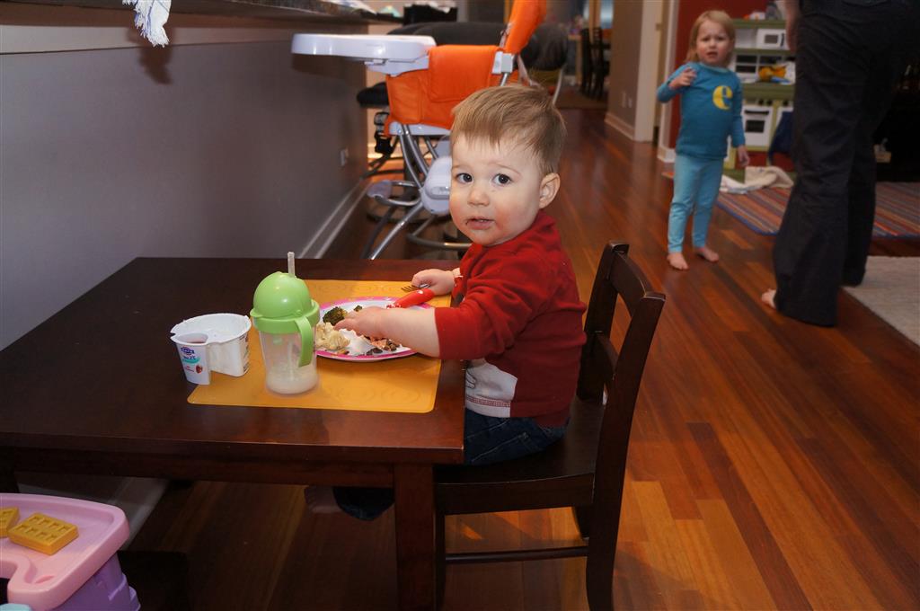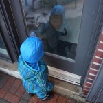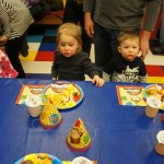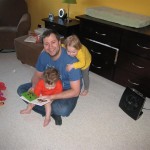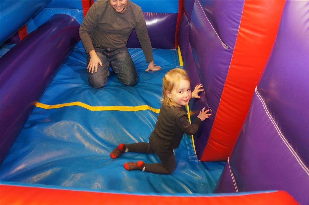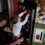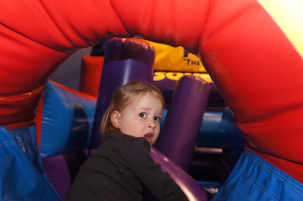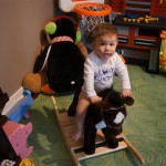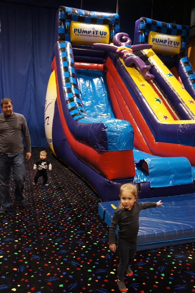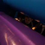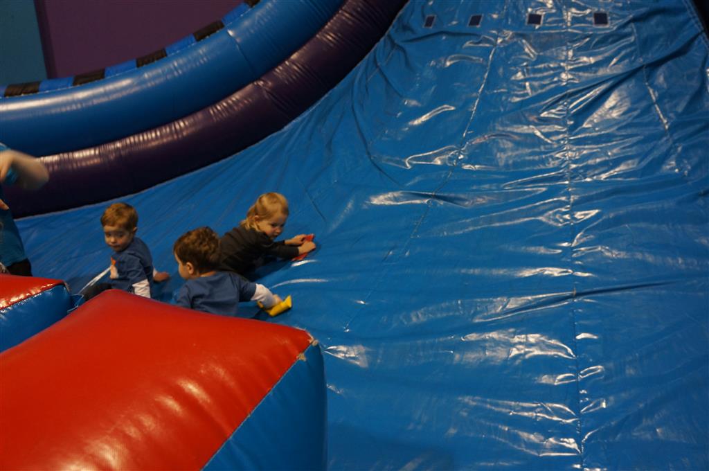 We went to a birthday party for Eleanor’s twin friends at “Pump It Up”, a bouncy castle playland, and Eleanor loved it. She especially liked the big slides, and later told me that she wanted to go there again. Henry didn’t like it as much, but did enjoy the cupcake at the end. On Sunday we all went into the back yard and built a snowman. Henry was not very impressed, partly because he had trouble maneuvering in his snowsuit, but Eleanor was very entertained. She helped by bringing over snow, and giggled when she touched its nose. Uncle B capped off the weekend with a surprise visit, which Eleanor declared her favorite part of the day (even beating out the snowman!).