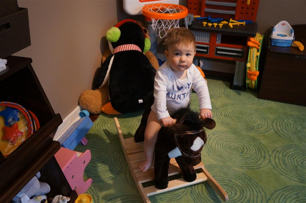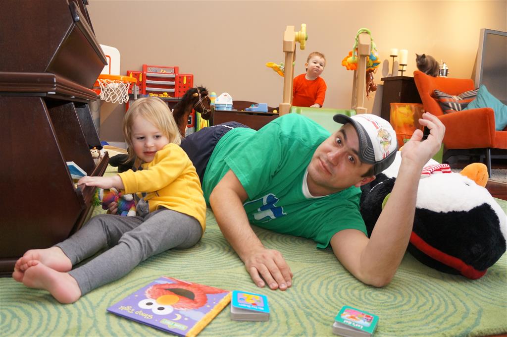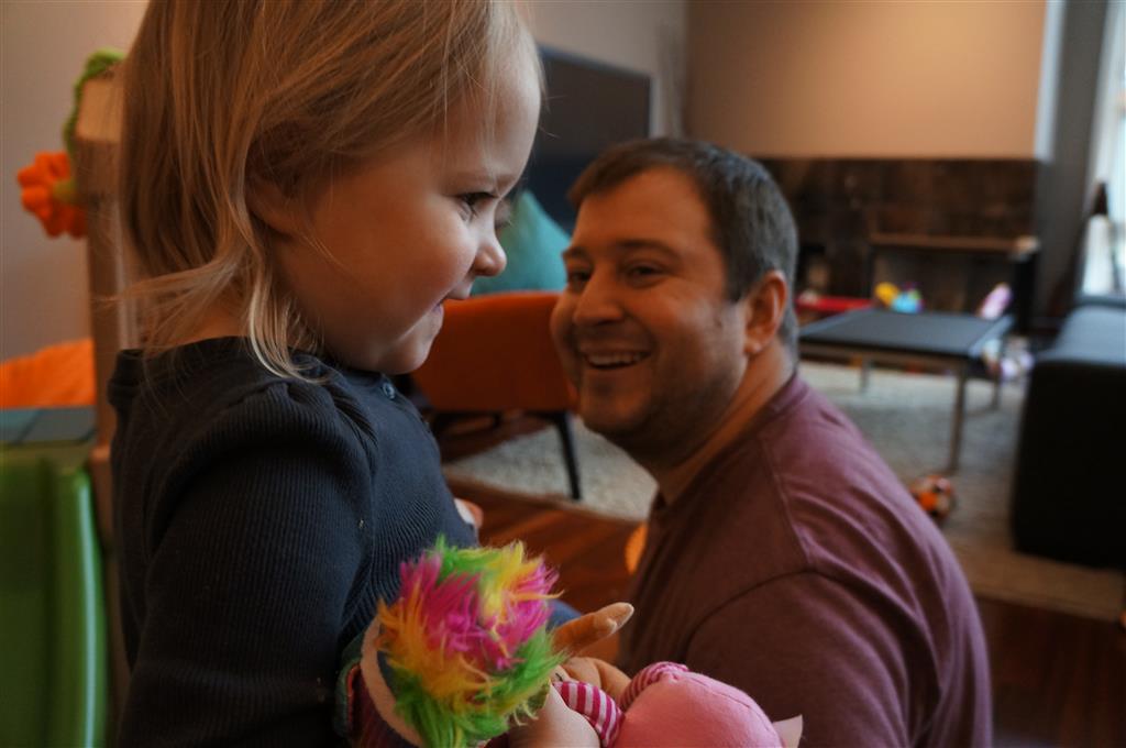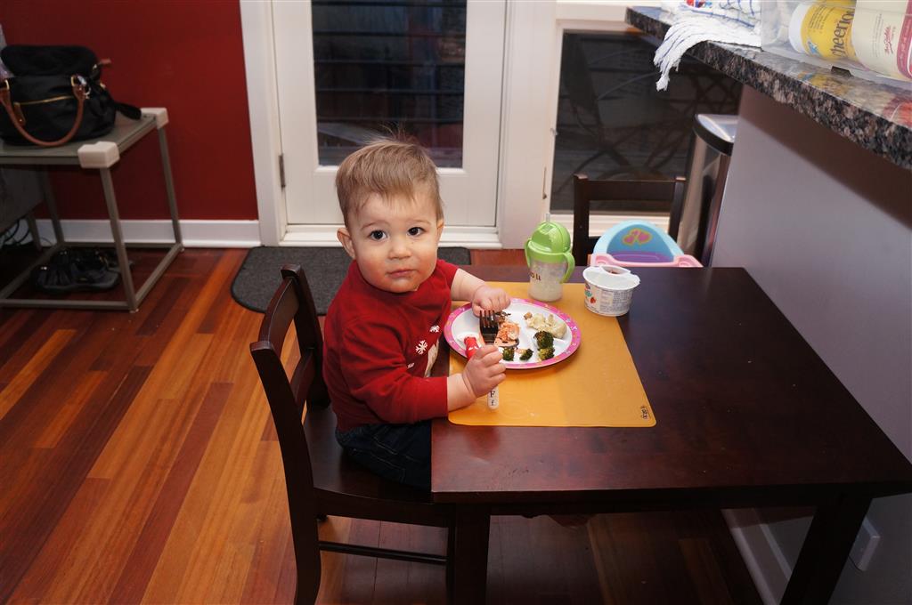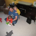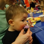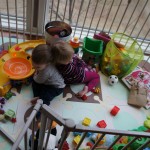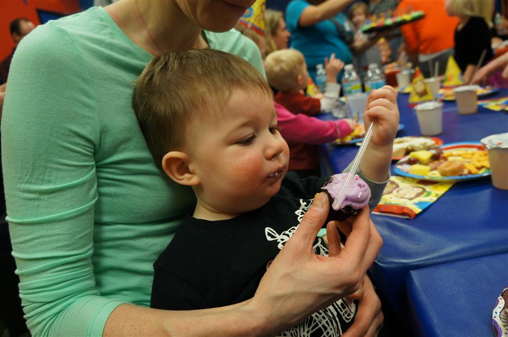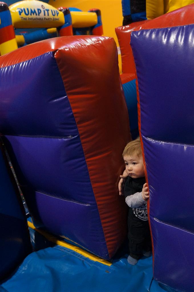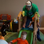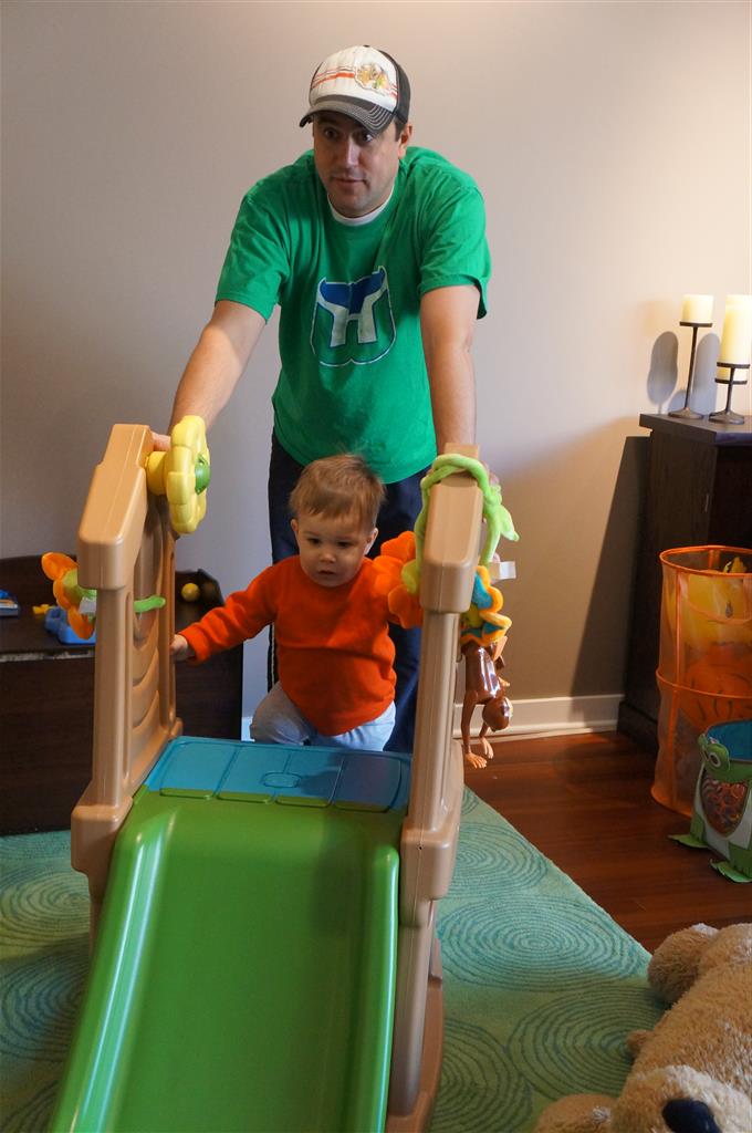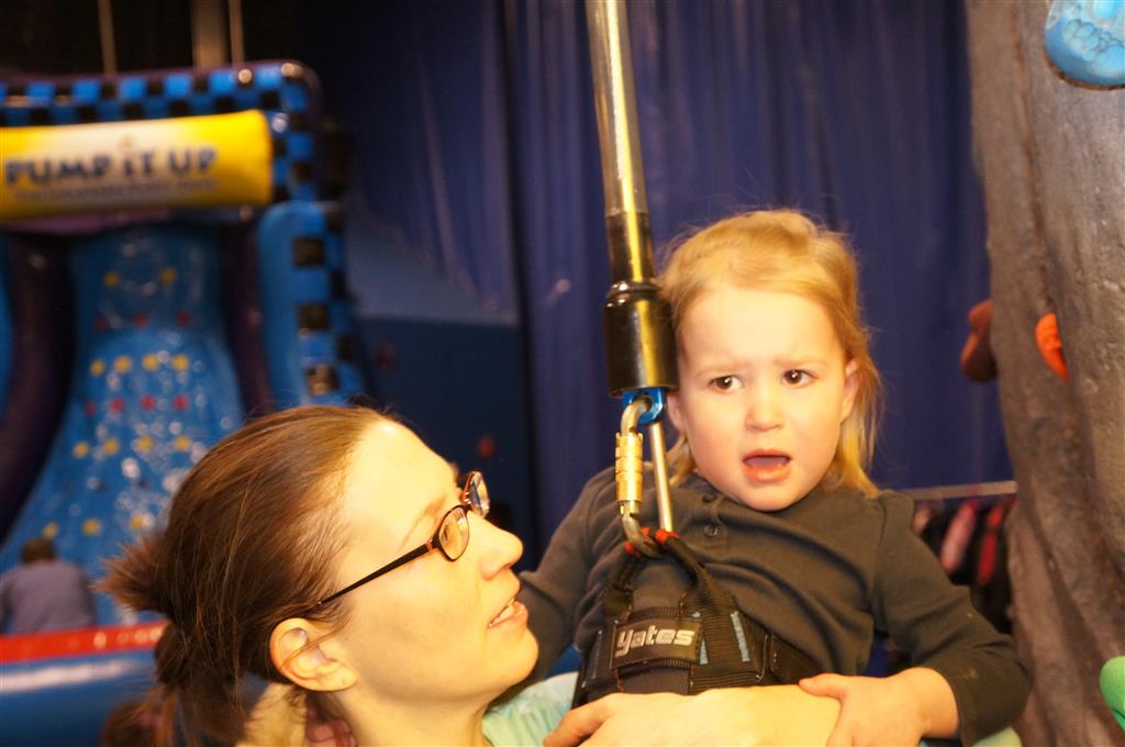 We went to a birthday party for Eleanor’s twin friends at “Pump It Up”, a bouncy castle playland, and Eleanor loved it. She especially liked the big slides, and later told me that she wanted to go there again. Henry didn’t like it as much, but did enjoy the cupcake at the end. On Sunday we all went into the back yard and built a snowman. Henry was not very impressed, partly because he had trouble maneuvering in his snowsuit, but Eleanor was very entertained. She helped by bringing over snow, and giggled when she touched its nose. Uncle B capped off the weekend with a surprise visit, which Eleanor declared her favorite part of the day (even beating out the snowman!).