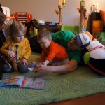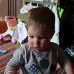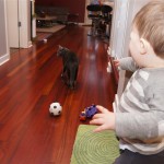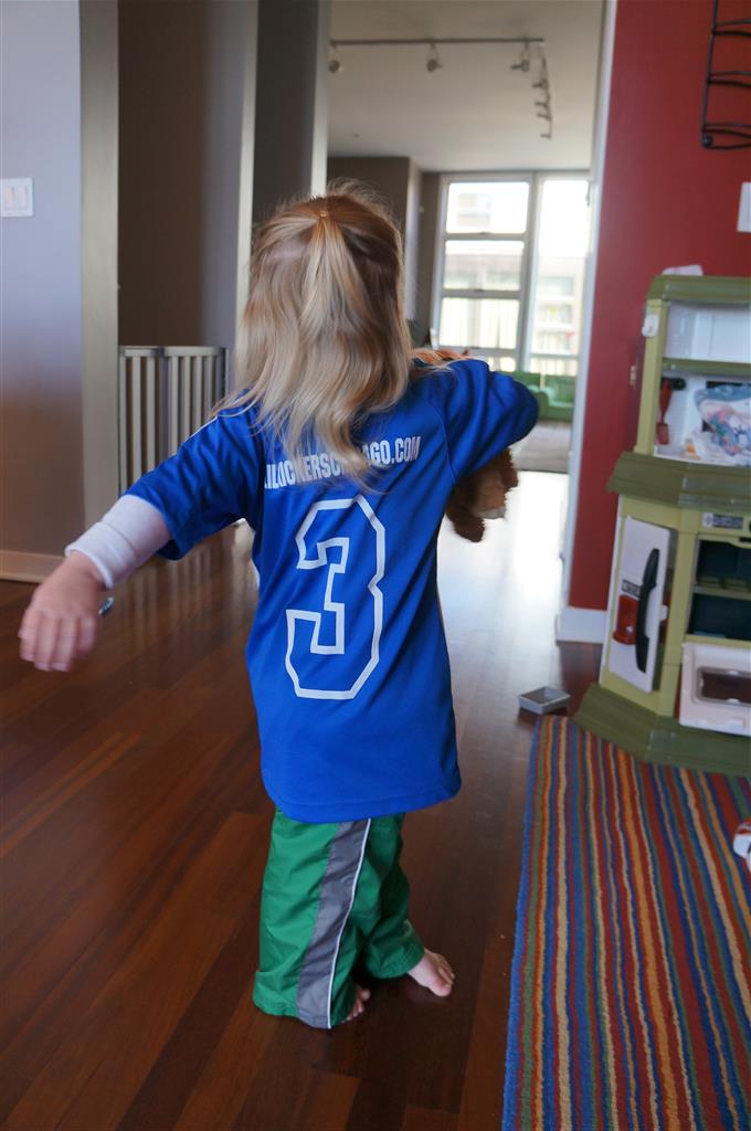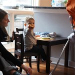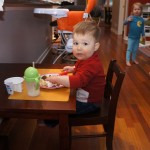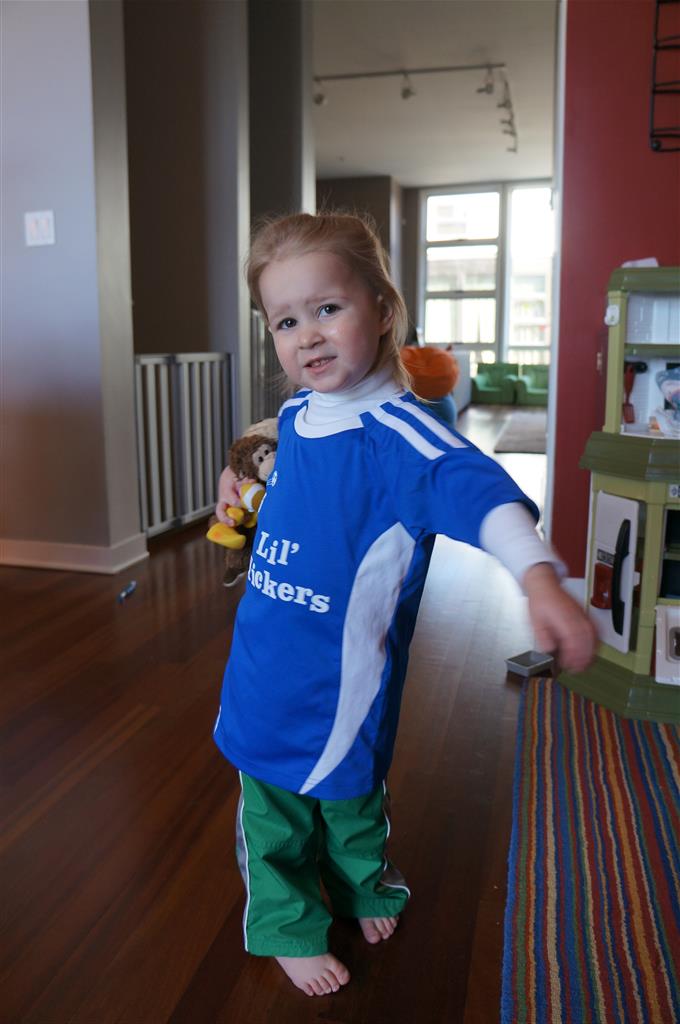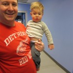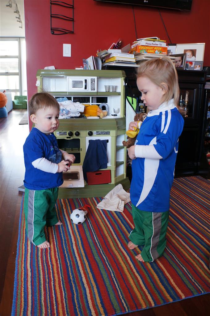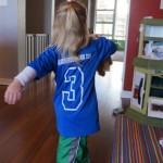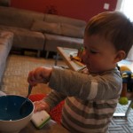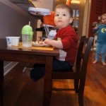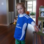During soccer class, mama looked the other way for all of three seconds and Henry had disappeared. She was fully panicked and was starting to run through the other soccer fields looking for him when she saw a tiny little person crouched in a perfect soccer stance on the field of the three- and four-year-olds. Henry had somehow walked/crawled over/around a large two-foot high barrier to the other soccer field and joined the older kids team. He was kneeling down just like them with them and joined them in their mid-scrimmage huddle. I’m sure everyone was looking around wondering where this miniature soccer player came from (he was dressed in his track pants and blue shirt that matches all the other kids uniforms, which is why mama couldn’t find him for a few minutes since he was camoflauged in with everyone else). It would have been a great picture op except mama had to get him off the field quickly as he was holding up the soccer scrimmage.