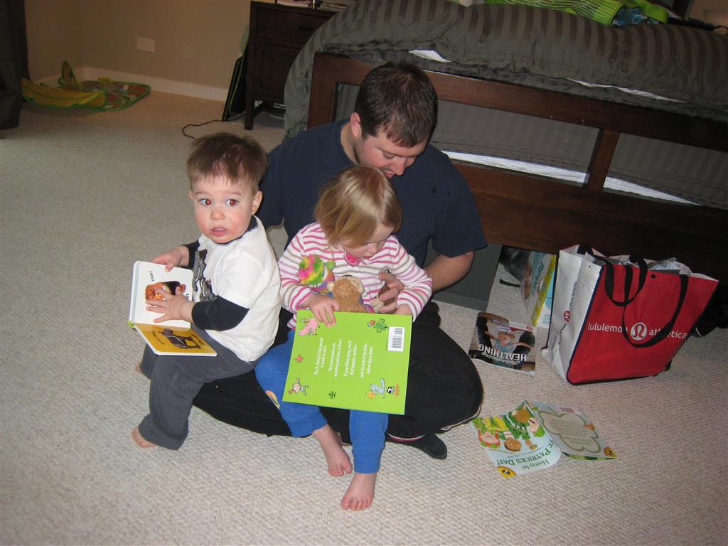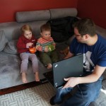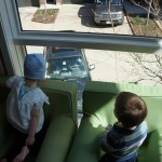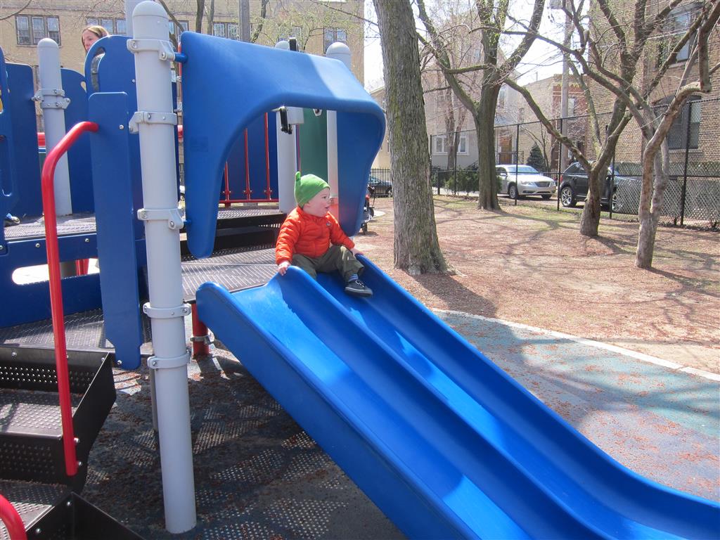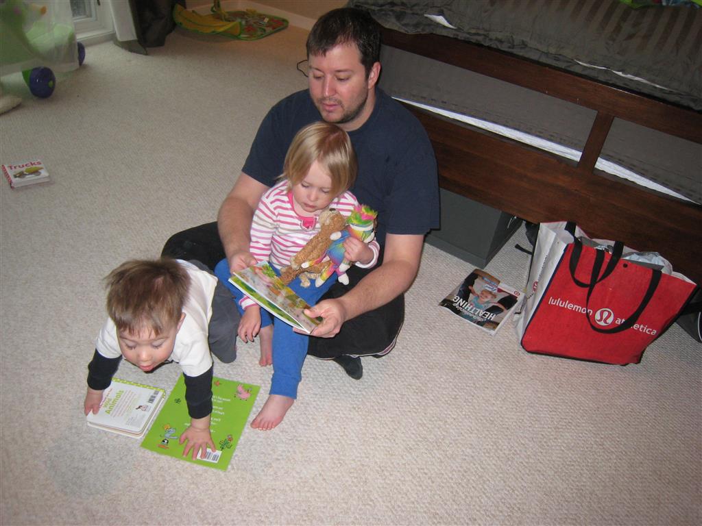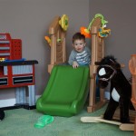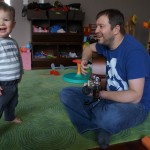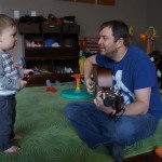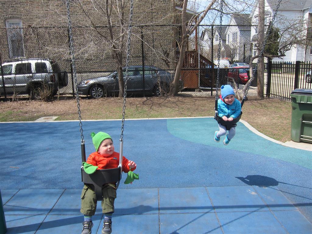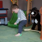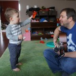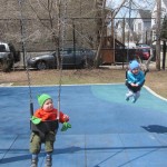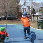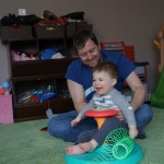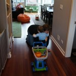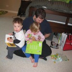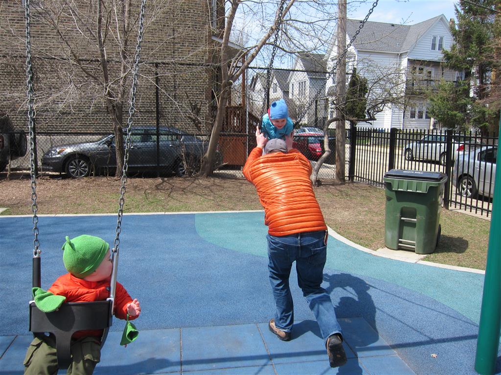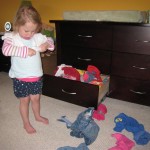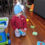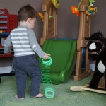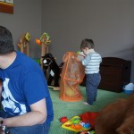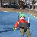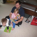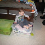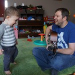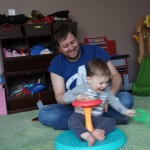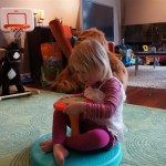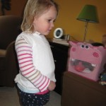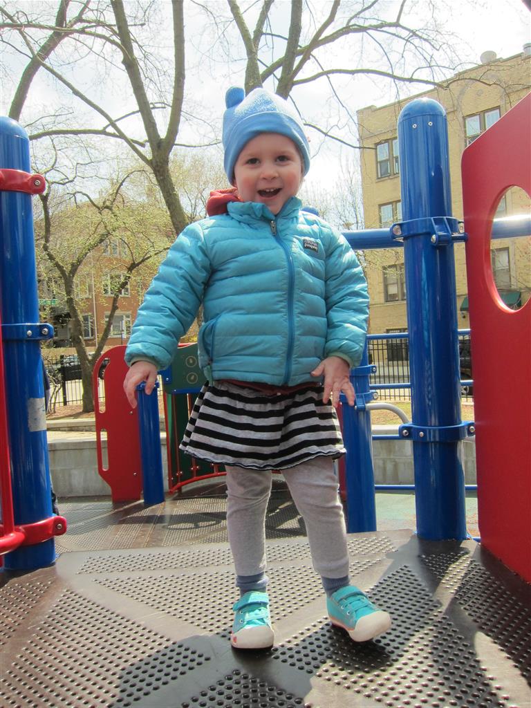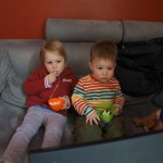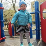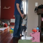 Eleanor and Henry didn’t get outside too much this week – suffering from a slow to arrive spring here. Eleanor is itching to break out her spring clothes, and this week has been putting on short sleeve shirts as often as she can. Currently, her record is 9 – meaning that she had 9 shirts on all at once. Even Monkey can’t beat that with doll clothes. Amazingly, she does it all by herself, with no help from Mom or Dad. She has also been fond of her warm hat, which makes for some funny pictures. Both kids have rediscovered the sit-n-spin, Eleanor now likes to stand on it and spin around while saying “Look at Me!”, and Henry sits and giggles while Mom or Dad spin him around. In a sure sign that Eleanor is picking up phrases from preschool, yesterday she told me to come sit next to her on the green playrug, because it would be warmer for my bottom. Ha! Eleanor is working on spelling her name – she will get it right about half of the time – the other half she misses the A but gets the rest of the letters right.