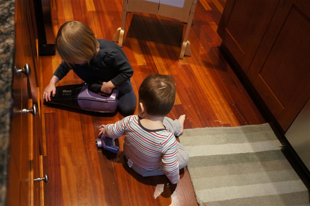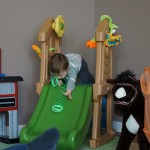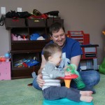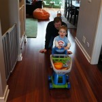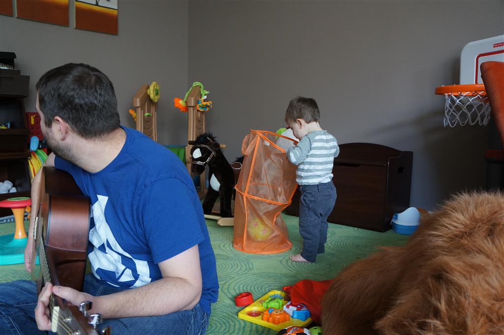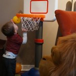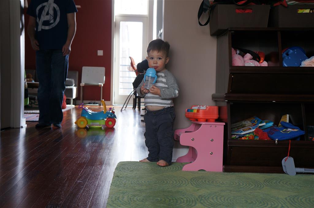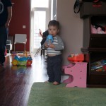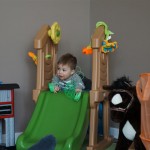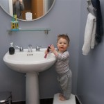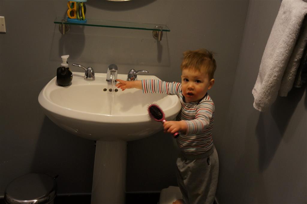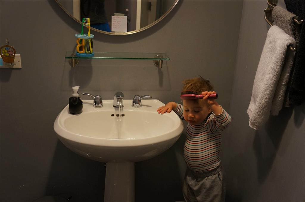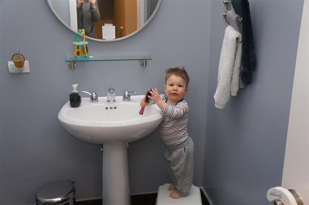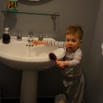 Henry is starting to make progress with his sounds – he has added a number of “first syllables” that have meaning, like “Dou” for Down and “Cu” for Cut (meaning he wants his food cut into smaller pieces). He also got out a “Puh” when pointing at a picture of Papa. He has also become obsessed with the bathroom sink – whenever we tell Eleanor to wash her hands, Henry tries to beat her into the bathroom so that he can turn on the sink and play with the water. He also likes to brush his teeth and comb his hair.