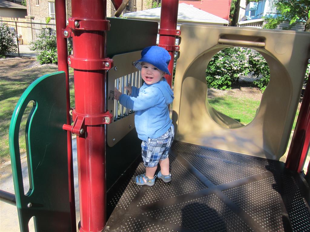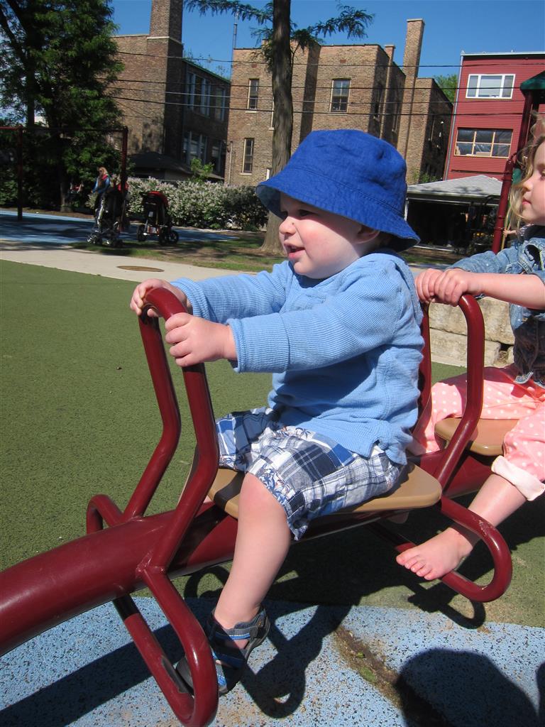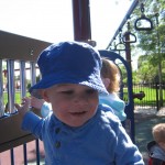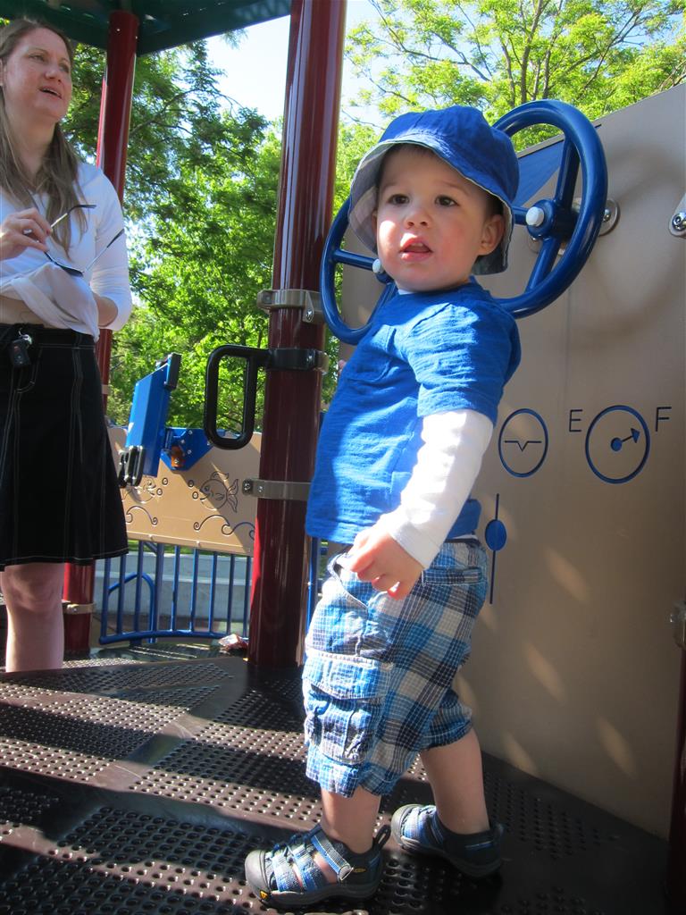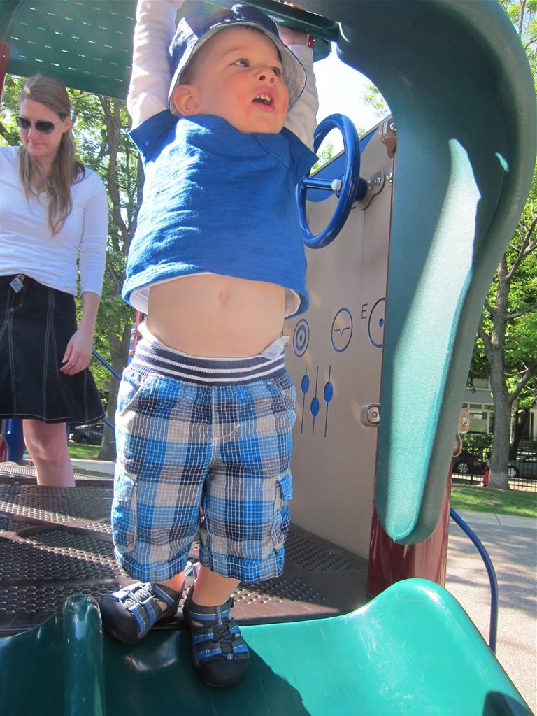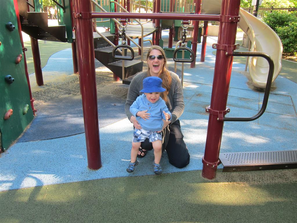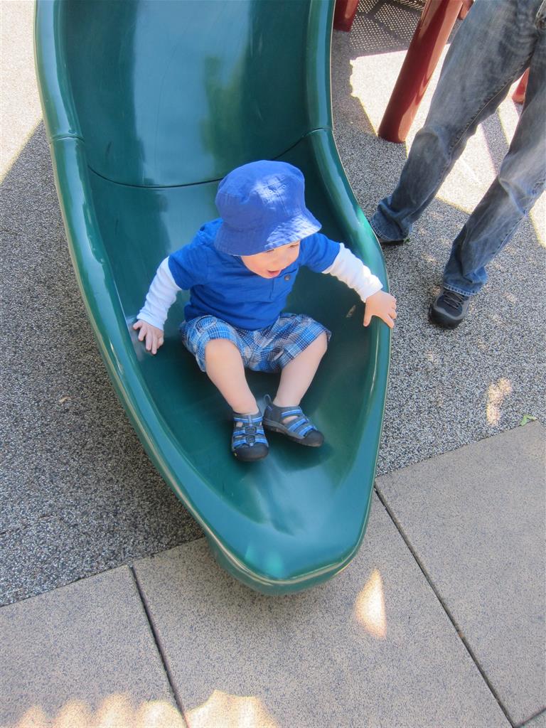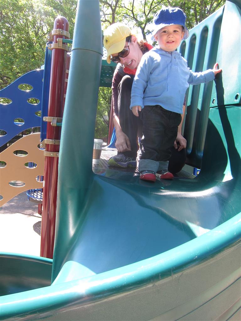Henry keeps adding words to his repertoire, he has added “diaper”, “pancake” and “waffle”, and has a definite “H” sound for himself and an “E” sound for Eleanor. The swing is still his favorite activity at the park, but the slide is gaining popularity. He likes to put his feet down while on the slide – on Sunday he was headed down a spiral slide, everything looking good, and then when he came around the second bend, he was head first! I think he learned that from our slide at home, where he likes to put his feet down and then dives off the end headfirst into my lap. Hopefully he doesn’t attempt that when there is no one there to catch him.