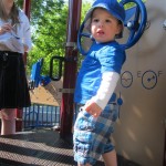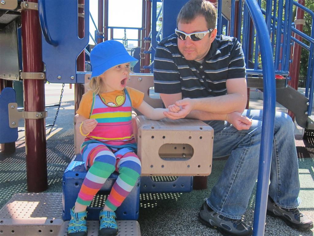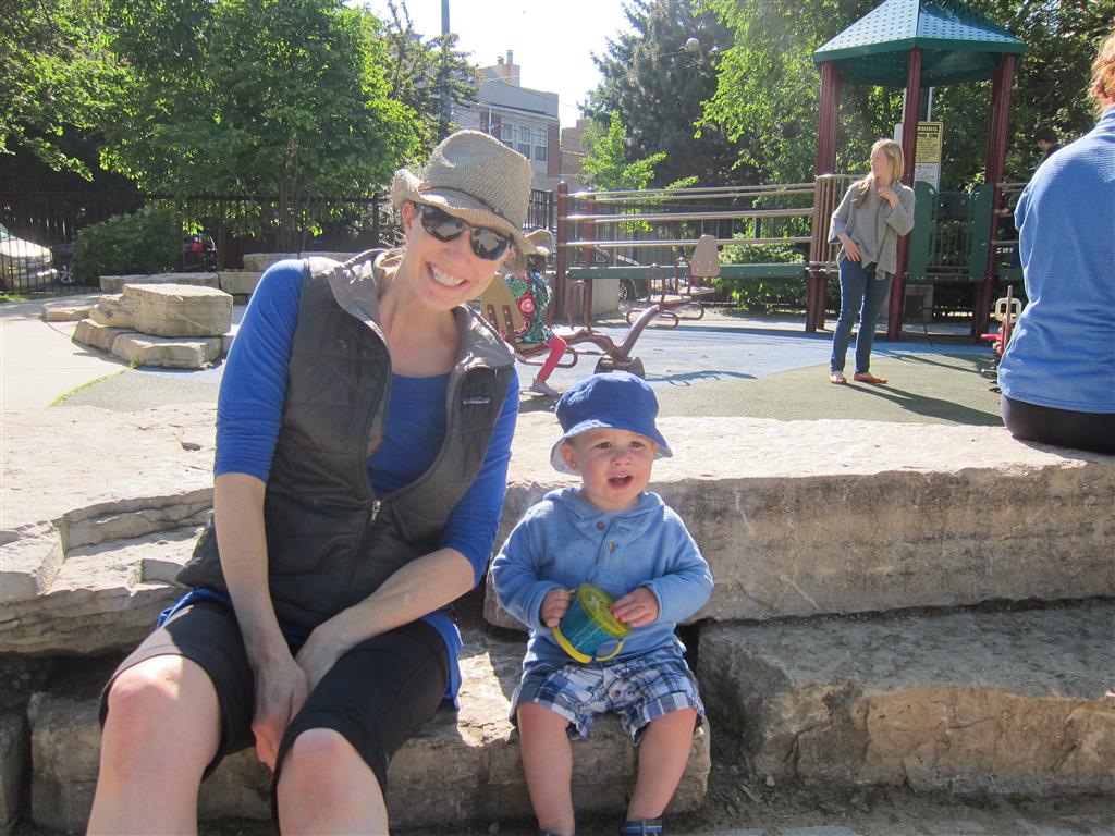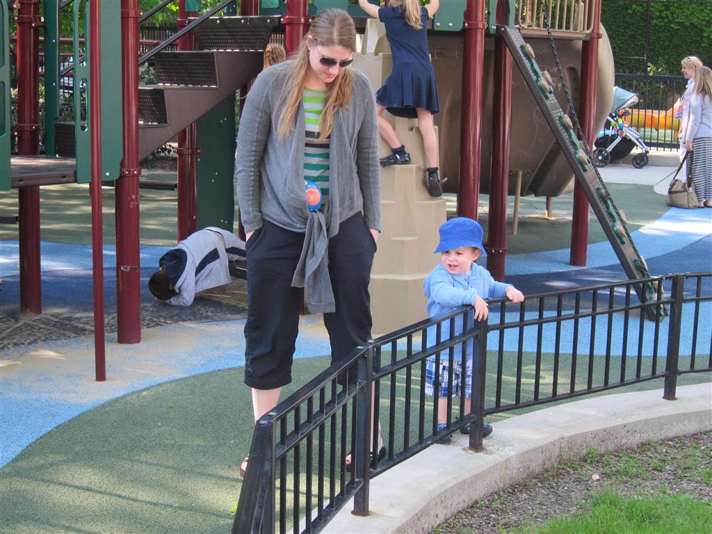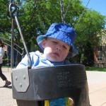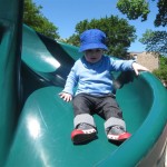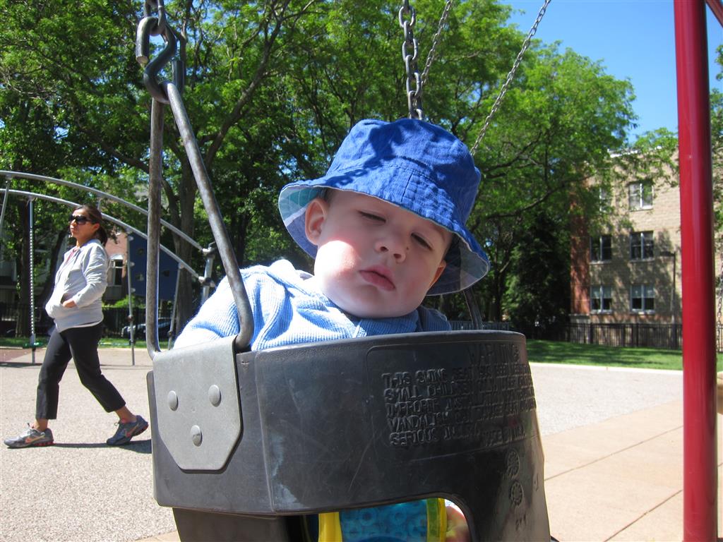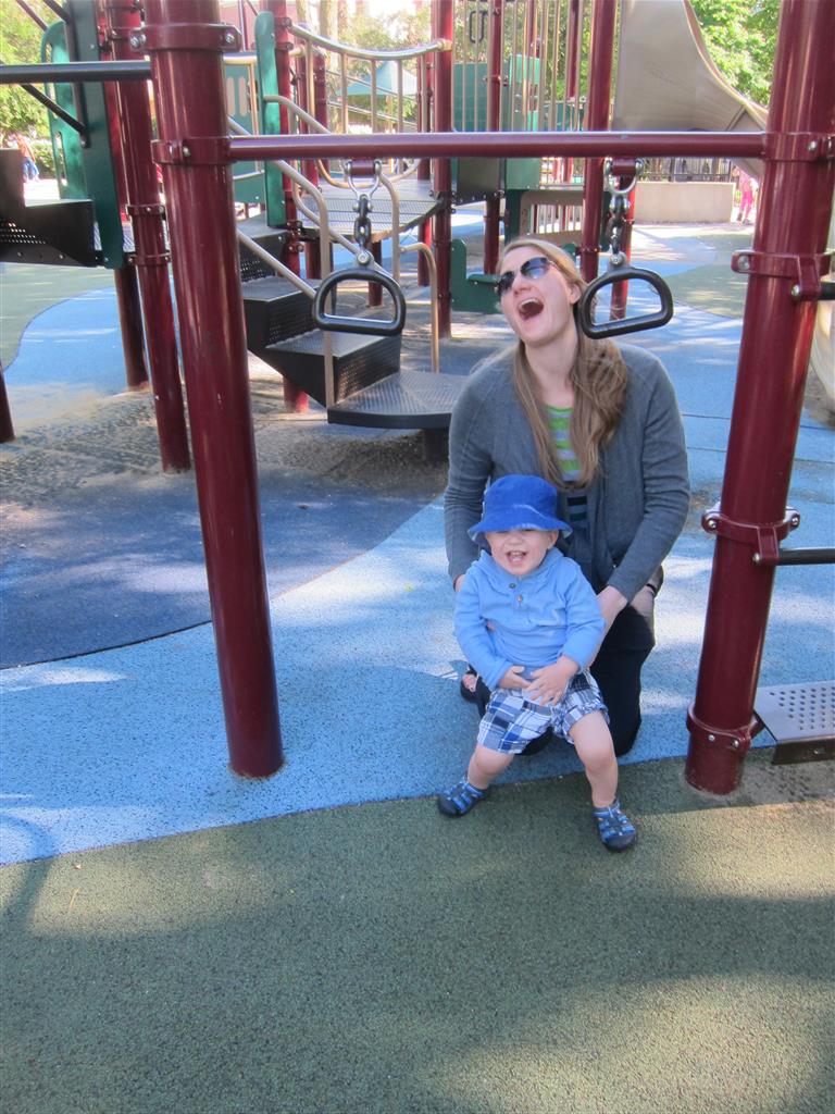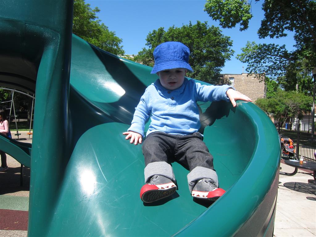 Henry keeps adding words to his repertoire, he has added “diaper”, “pancake” and “waffle”, and has a definite “H” sound for himself and an “E” sound for Eleanor. The swing is still his favorite activity at the park, but the slide is gaining popularity. He likes to put his feet down while on the slide – on Sunday he was headed down a spiral slide, everything looking good, and then when he came around the second bend, he was head first! I think he learned that from our slide at home, where he likes to put his feet down and then dives off the end headfirst into my lap. Hopefully he doesn’t attempt that when there is no one there to catch him.