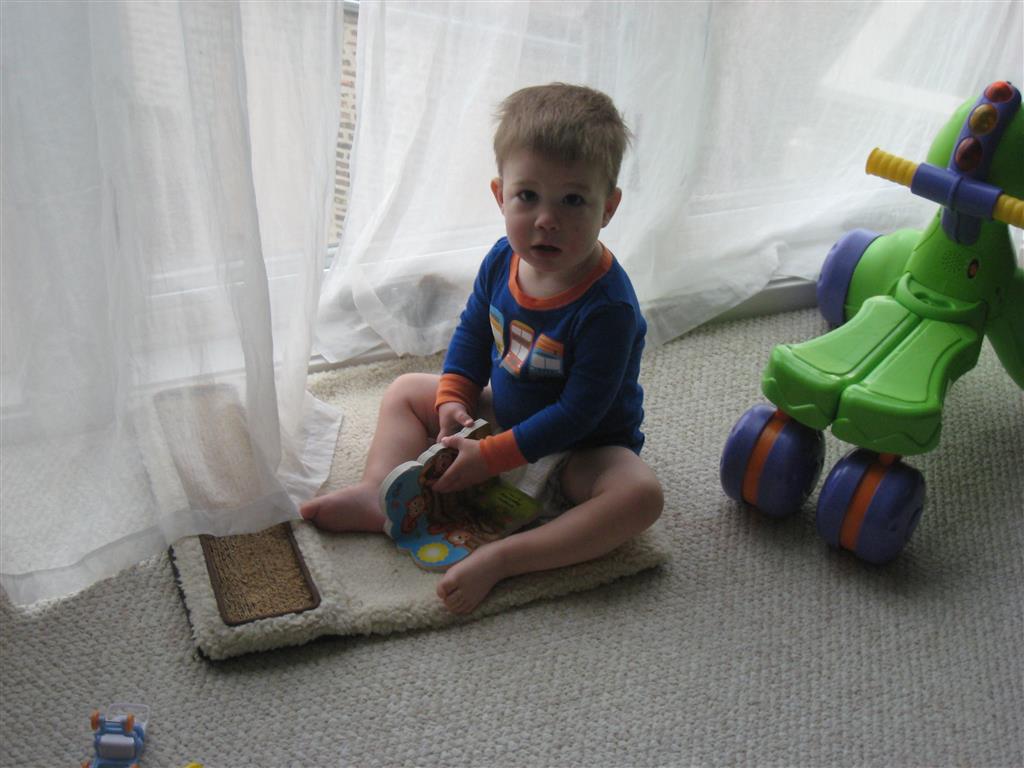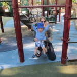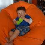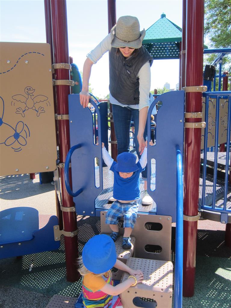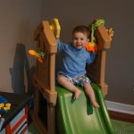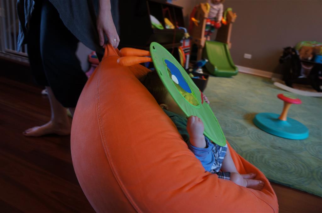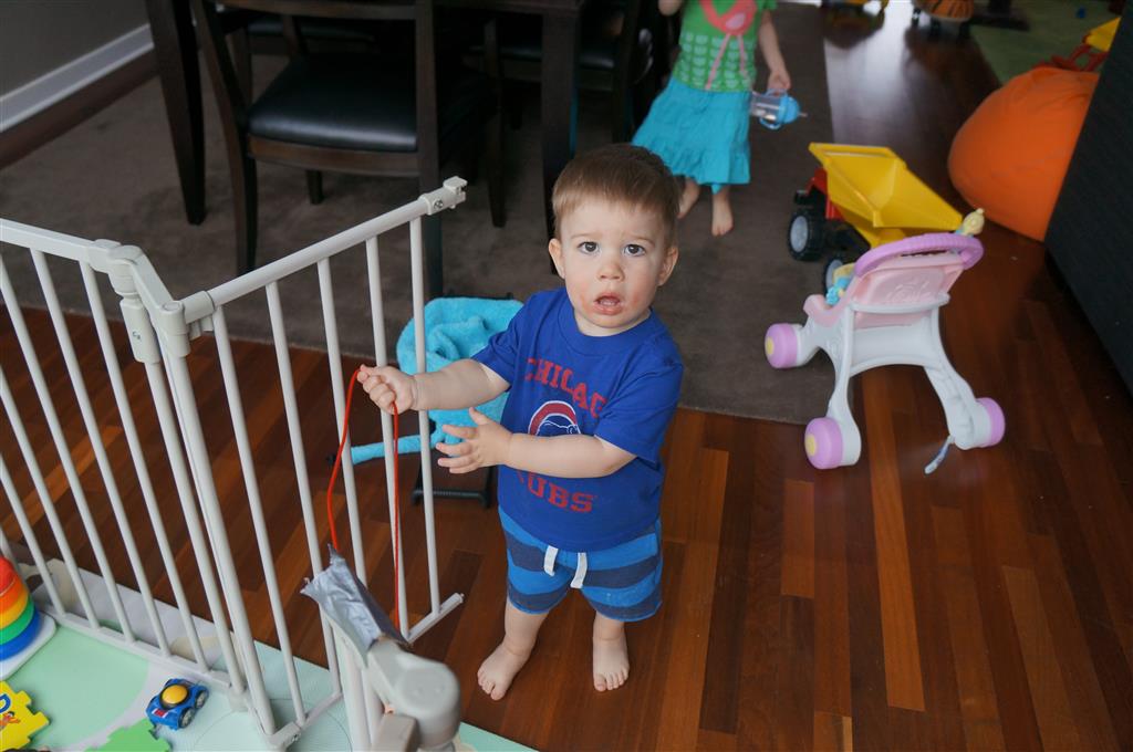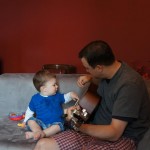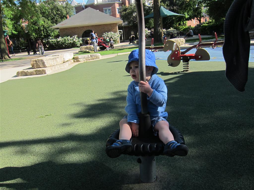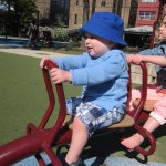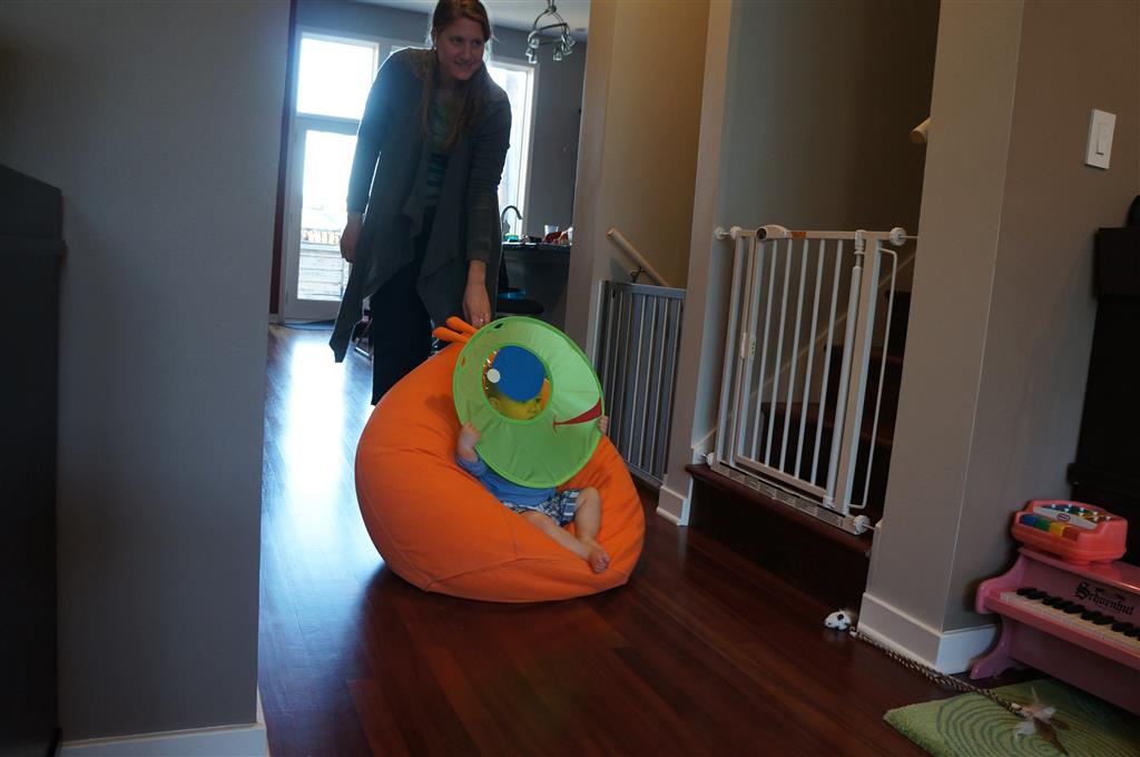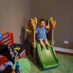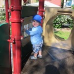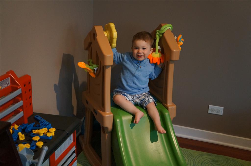 Henry keeps adding words to his repertoire, he has added “diaper”, “pancake” and “waffle”, and has a definite “H” sound for himself and an “E” sound for Eleanor. The swing is still his favorite activity at the park, but the slide is gaining popularity. He likes to put his feet down while on the slide – on Sunday he was headed down a spiral slide, everything looking good, and then when he came around the second bend, he was head first! I think he learned that from our slide at home, where he likes to put his feet down and then dives off the end headfirst into my lap. Hopefully he doesn’t attempt that when there is no one there to catch him.