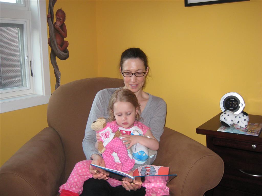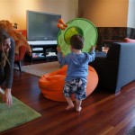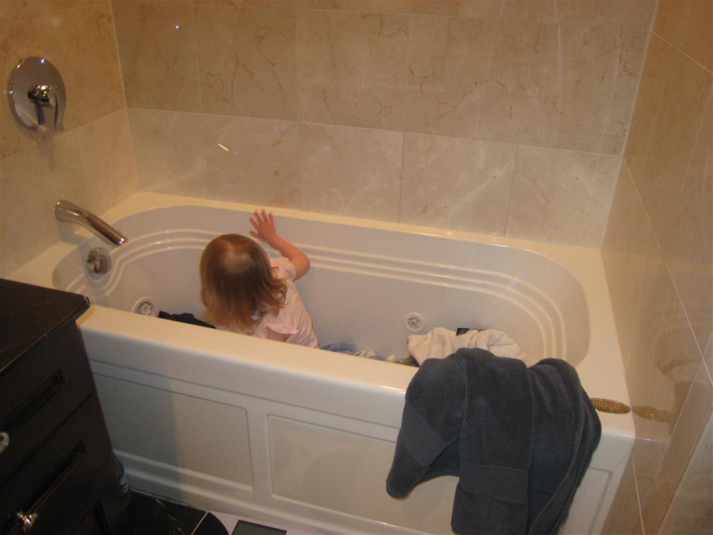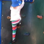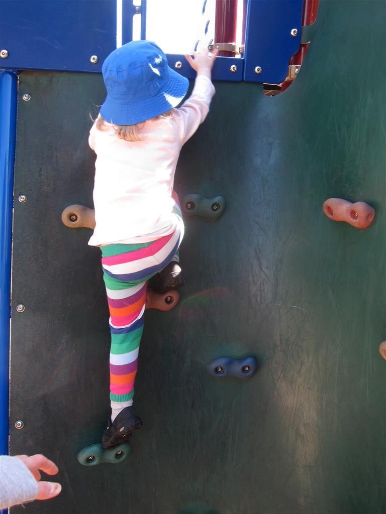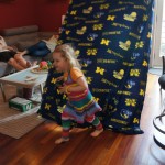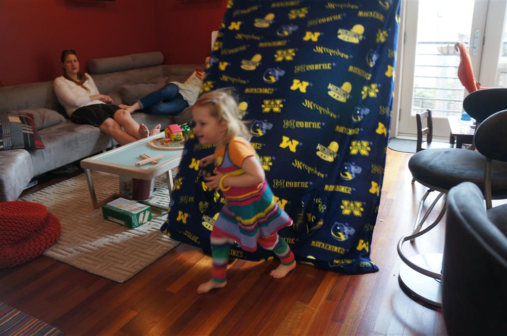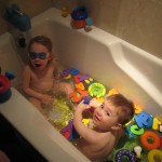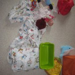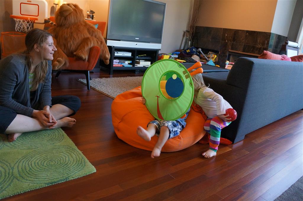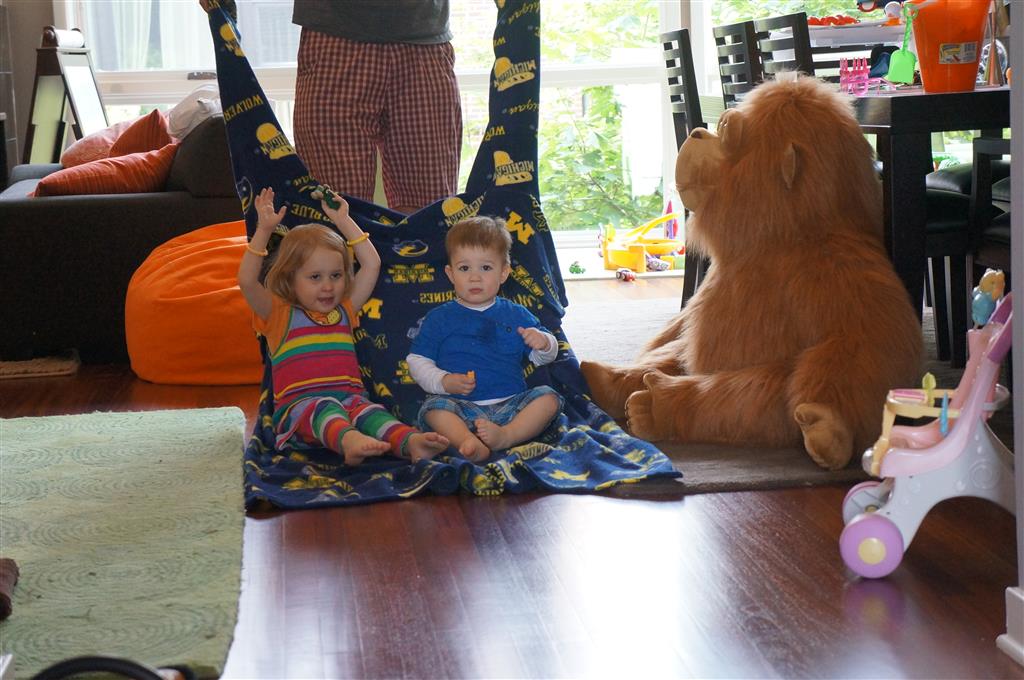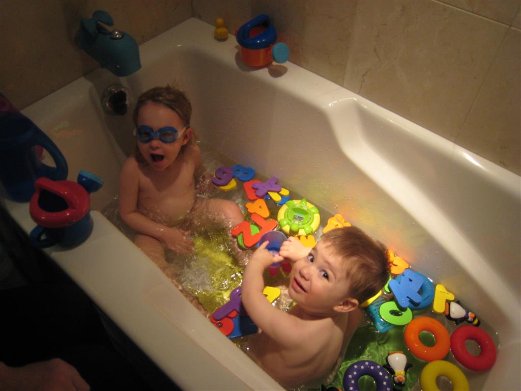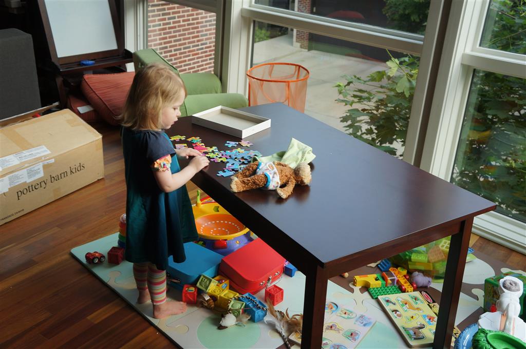 This week Eleanor mastered a rock wall climb at the “ring toss” park (she makes up crazy names for all the parks we go to), and tried out some goggles in the bathtub. We were planning on taking the goggles with us to swim class to encourage some underwater time, but so far they have only made it to the bath. She was very creative with her play during quite time this week – once getting into the linen drawer and setting up “beds” for her friends in three different locations in her room.