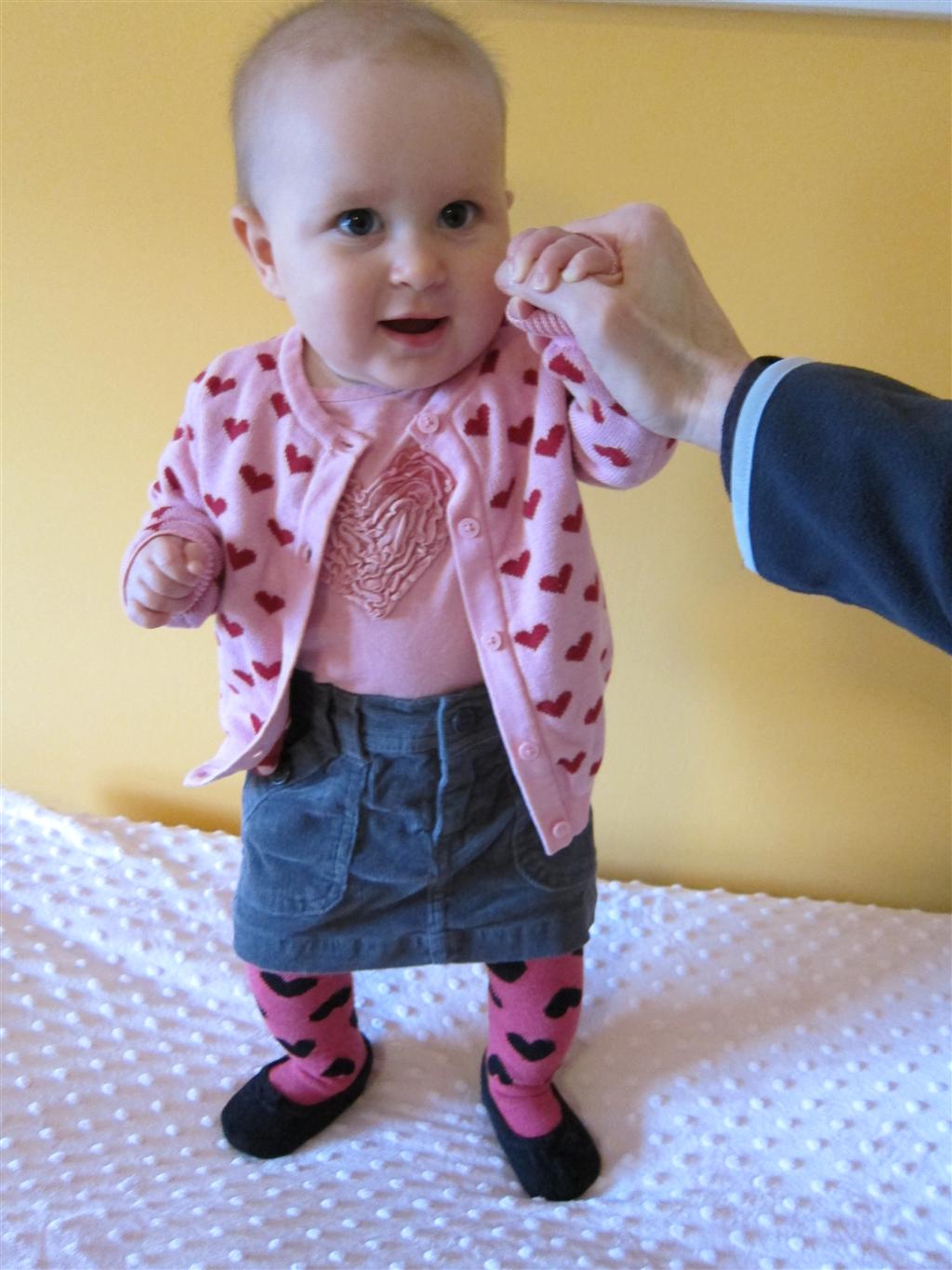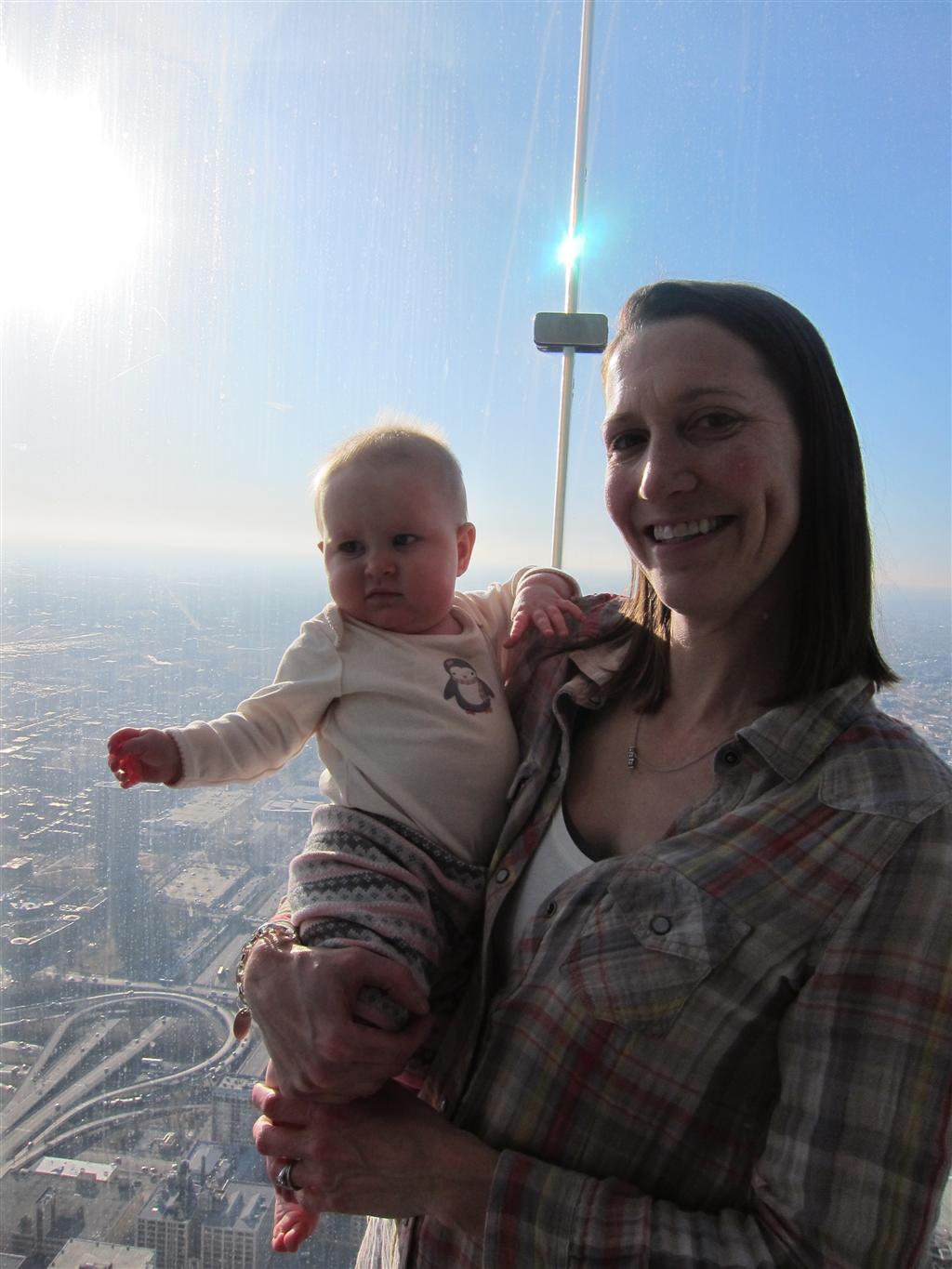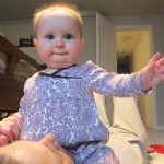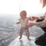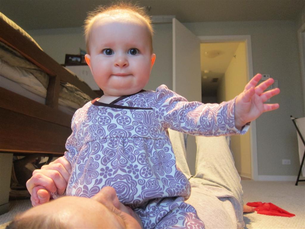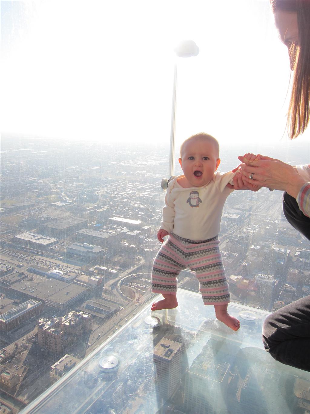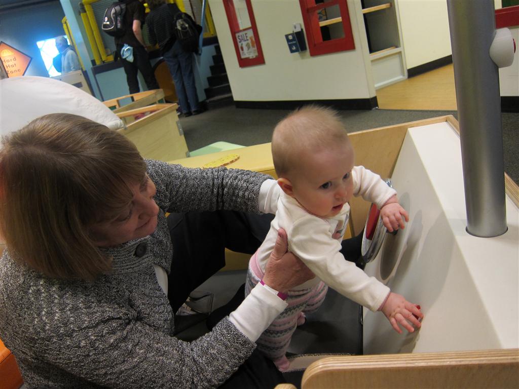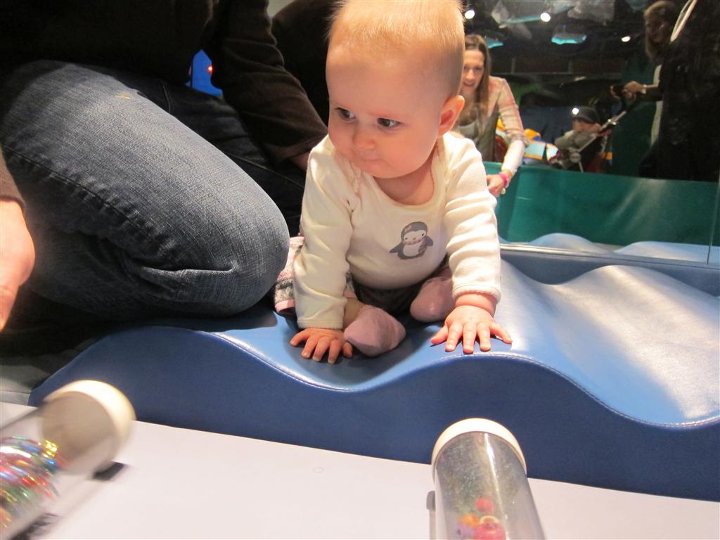 Eleanor had a very busy week this week – especially the end of the week. We started the week celebrating Valentine’s day in a fun outfit, and eating blueberries for the first time (messy!). On Thursday we discovered the much delayed top tooth finally coming through. On Friday, Dad played hookie and went along to baby and me class with Ellie and Mom. And on Friday afternoon, Grandma, Grandpa, Auntie Susan, and cousins Mackenzie, Jack and Ben came for a visit. What fun! On Saturday we went with the whole crew to Navy Pier to visit the hands on museum. Most of the activities were targeting a bit older age – but there were a few “Non Walkers Only” areas that Ellie got to play in. After that, we went to the Sears (does anyone use the new name, Willis?) Tower for some great views of the city. Mackenzie even convinced Uncle B to come out into the Plexiglas box. On Sunday we played at home with the cousins until they had to hit the road for home.