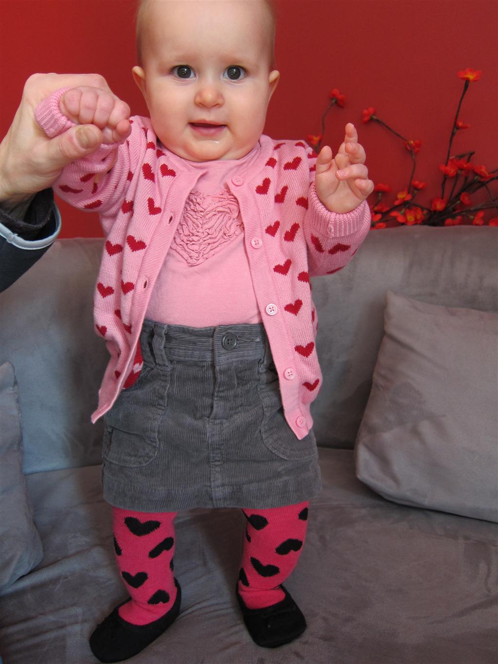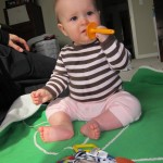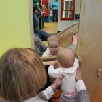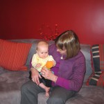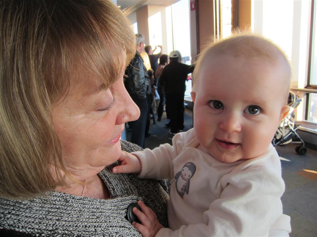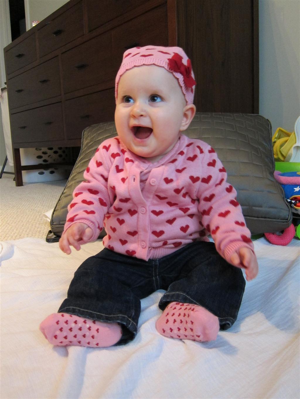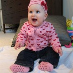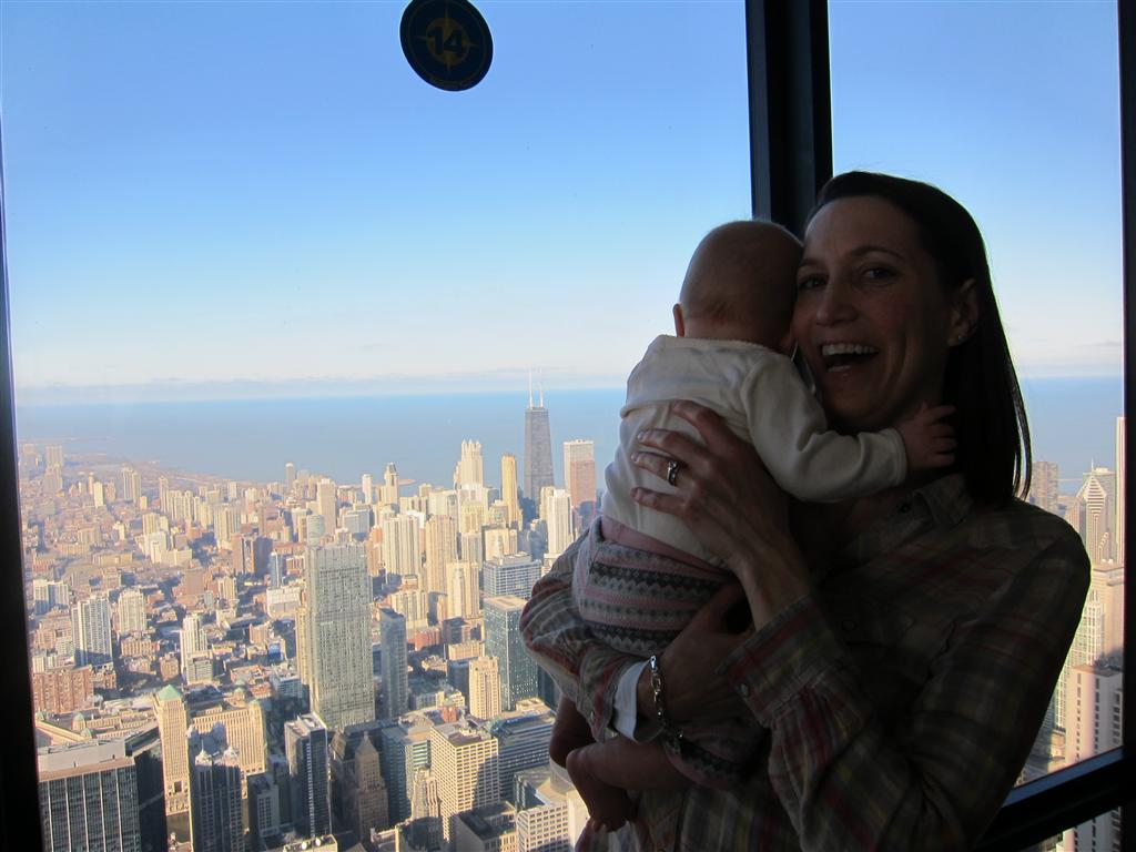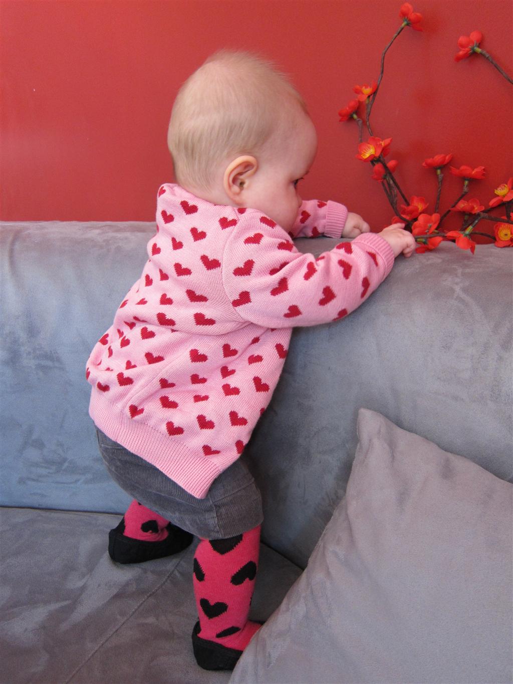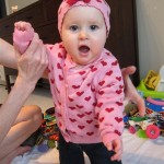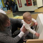 Eleanor had a very busy week this week – especially the end of the week. We started the week celebrating Valentine’s day in a fun outfit, and eating blueberries for the first time (messy!). On Thursday we discovered the much delayed top tooth finally coming through. On Friday, Dad played hookie and went along to baby and me class with Ellie and Mom. And on Friday afternoon, Grandma, Grandpa, Auntie Susan, and cousins Mackenzie, Jack and Ben came for a visit. What fun! On Saturday we went with the whole crew to Navy Pier to visit the hands on museum. Most of the activities were targeting a bit older age – but there were a few “Non Walkers Only” areas that Ellie got to play in. After that, we went to the Sears (does anyone use the new name, Willis?) Tower for some great views of the city. Mackenzie even convinced Uncle B to come out into the Plexiglas box. On Sunday we played at home with the cousins until they had to hit the road for home.