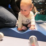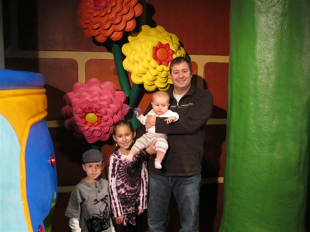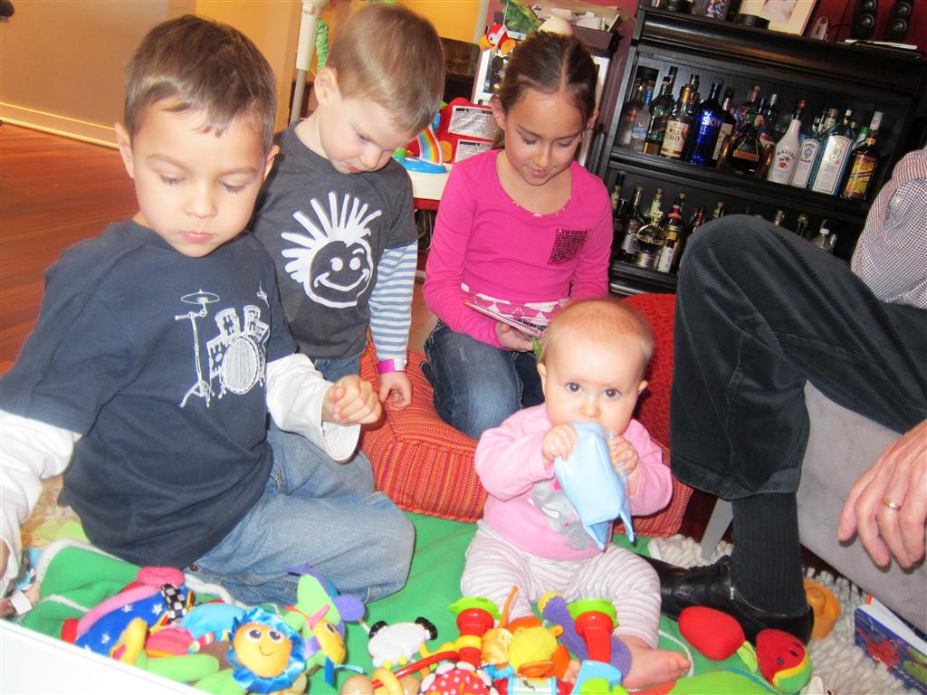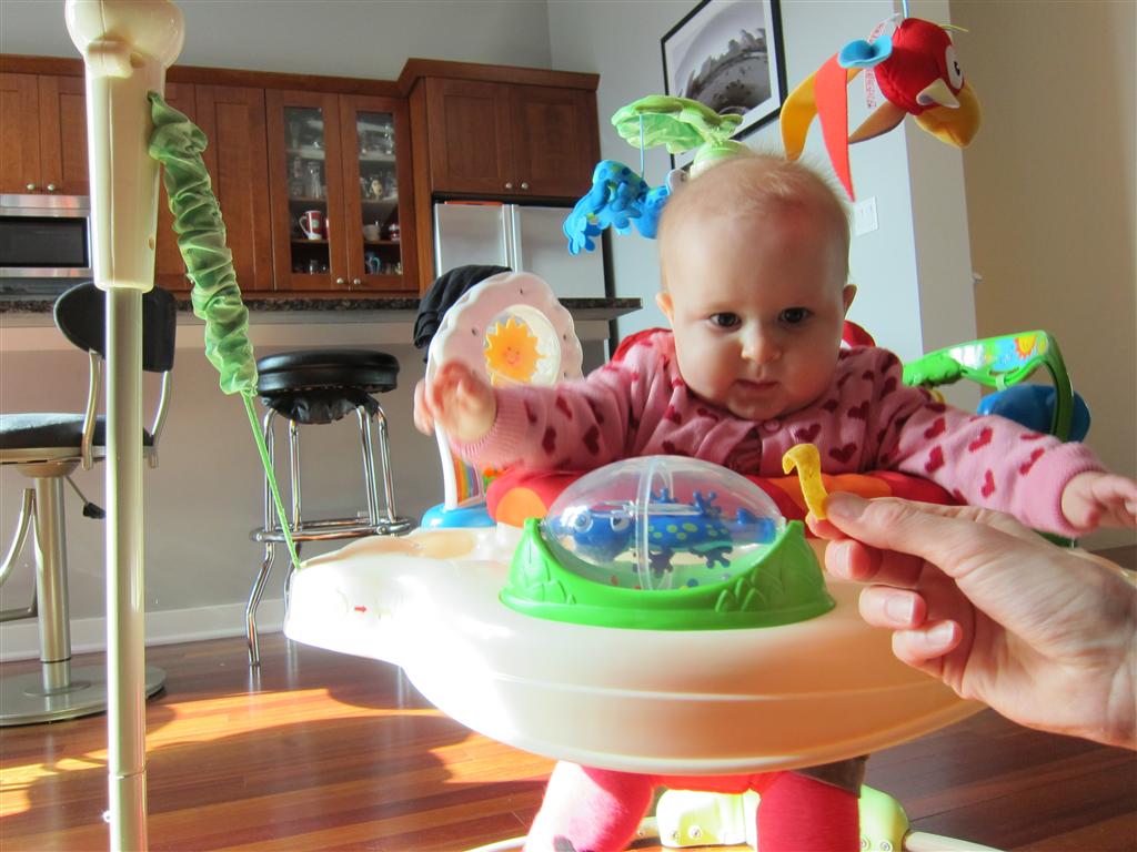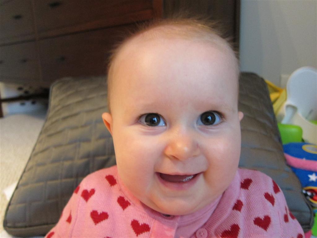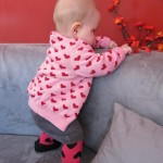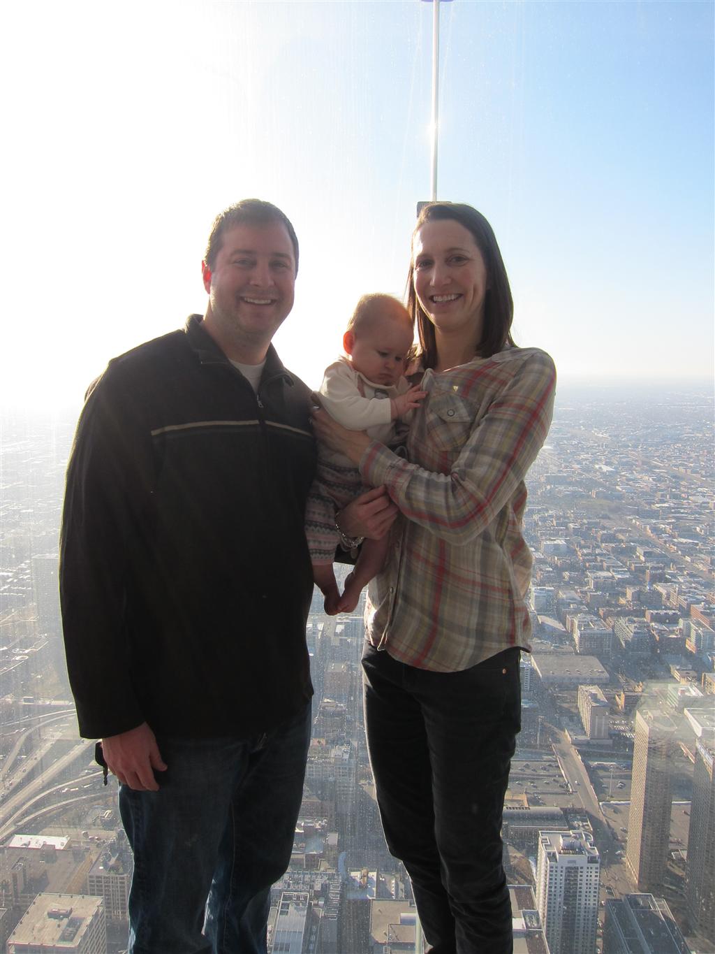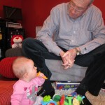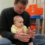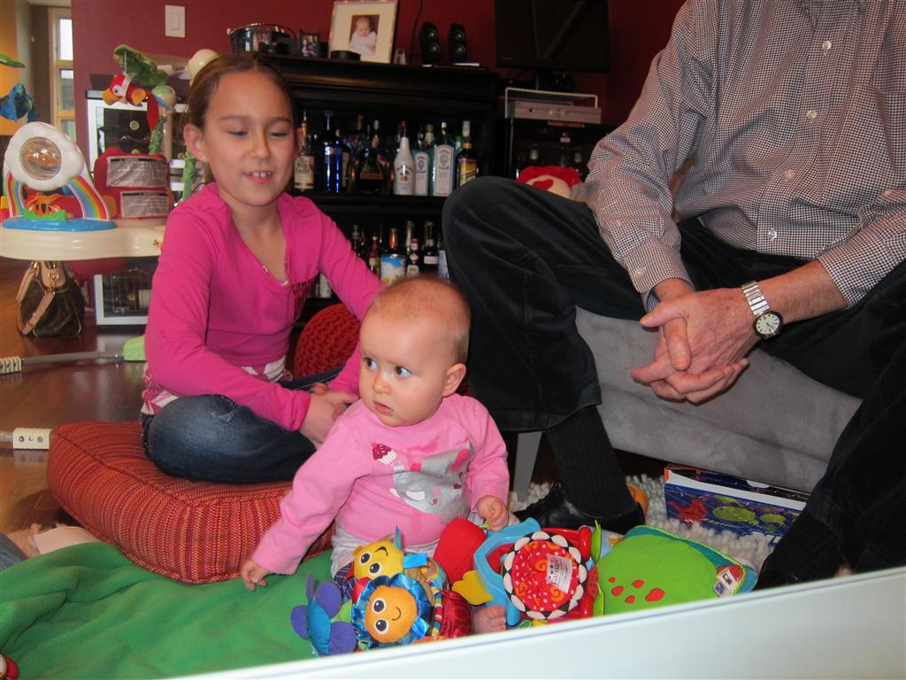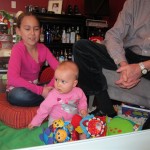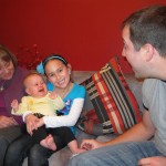 Eleanor had a very busy week this week – especially the end of the week. We started the week celebrating Valentine’s day in a fun outfit, and eating blueberries for the first time (messy!). On Thursday we discovered the much delayed top tooth finally coming through. On Friday, Dad played hookie and went along to baby and me class with Ellie and Mom. And on Friday afternoon, Grandma, Grandpa, Auntie Susan, and cousins Mackenzie, Jack and Ben came for a visit. What fun! On Saturday we went with the whole crew to Navy Pier to visit the hands on museum. Most of the activities were targeting a bit older age – but there were a few “Non Walkers Only” areas that Ellie got to play in. After that, we went to the Sears (does anyone use the new name, Willis?) Tower for some great views of the city. Mackenzie even convinced Uncle B to come out into the Plexiglas box. On Sunday we played at home with the cousins until they had to hit the road for home.