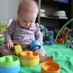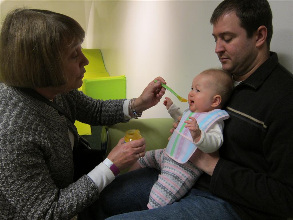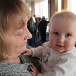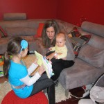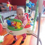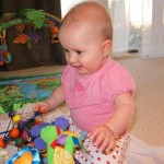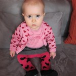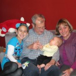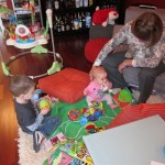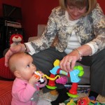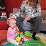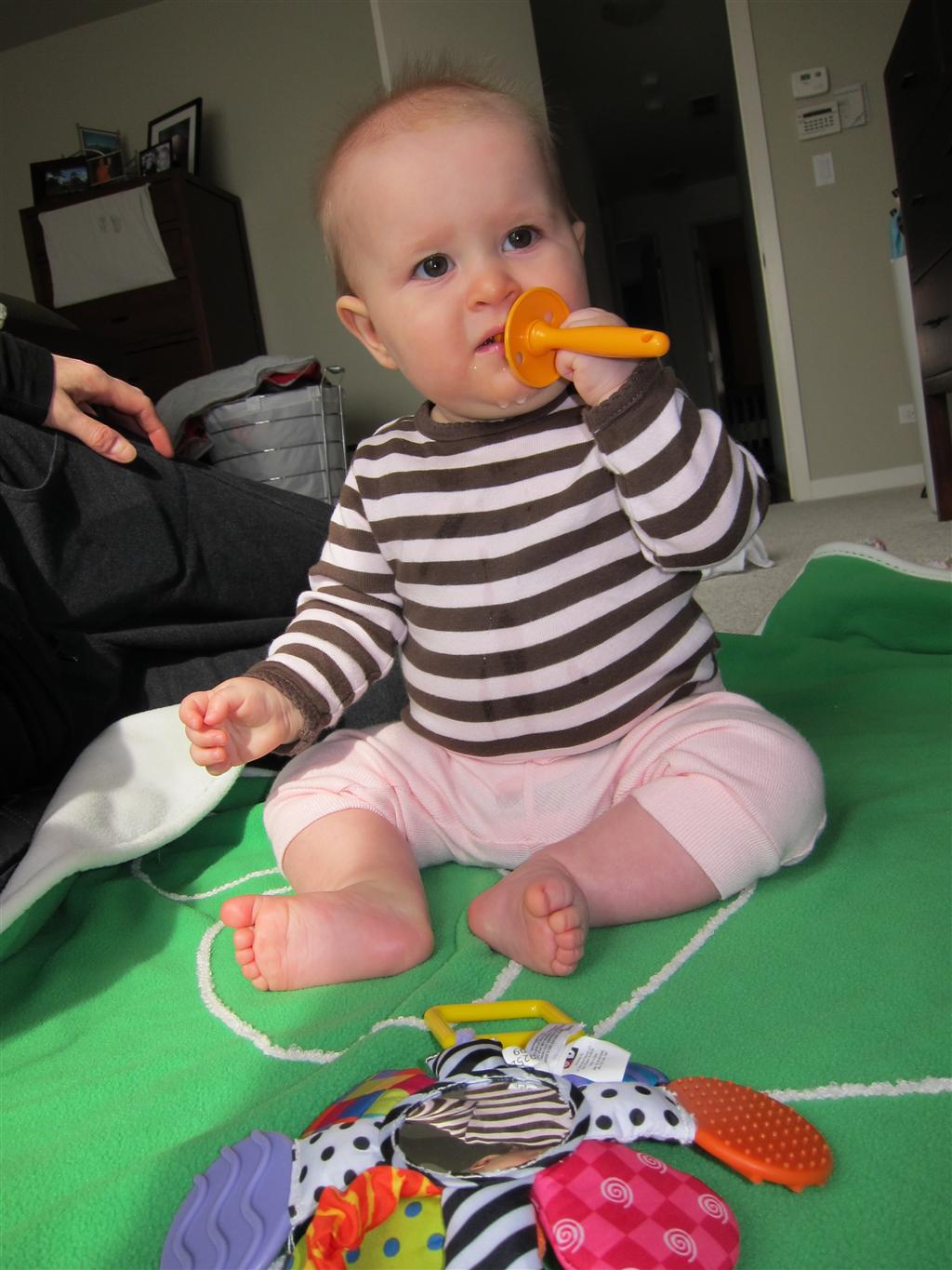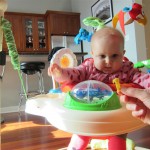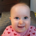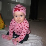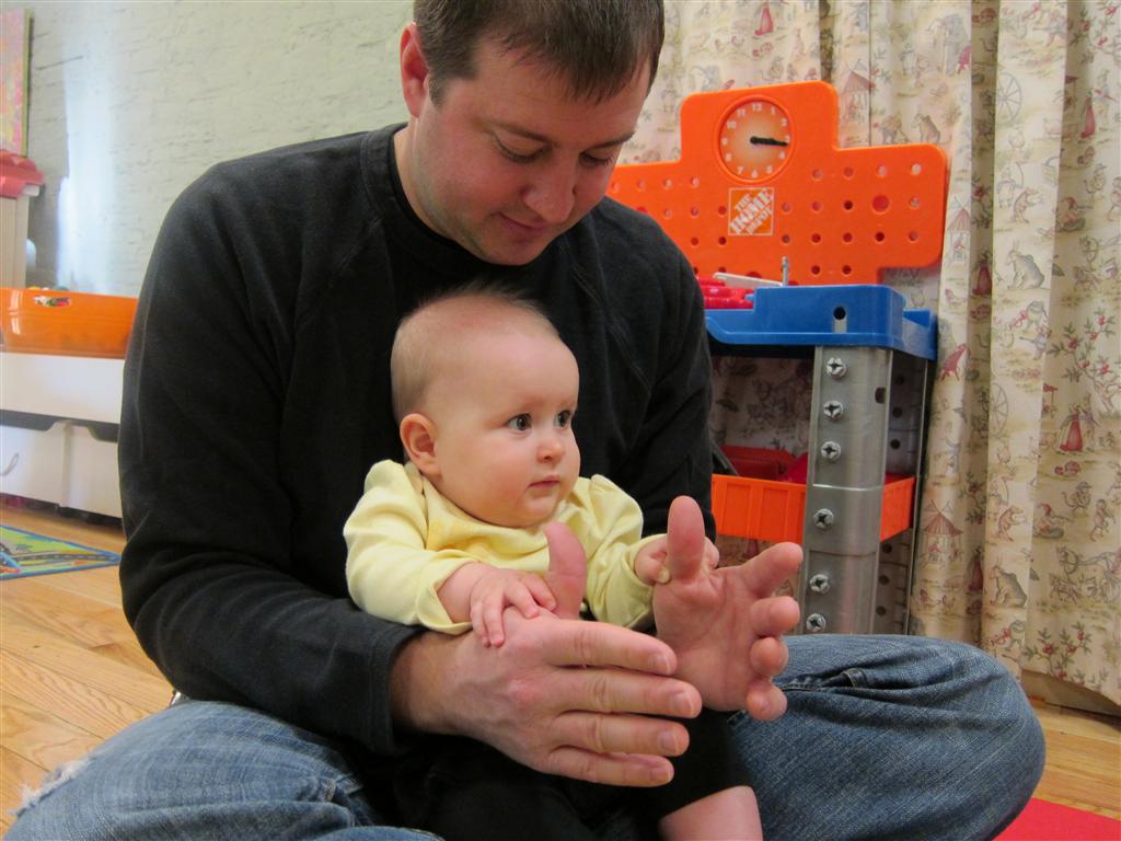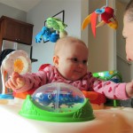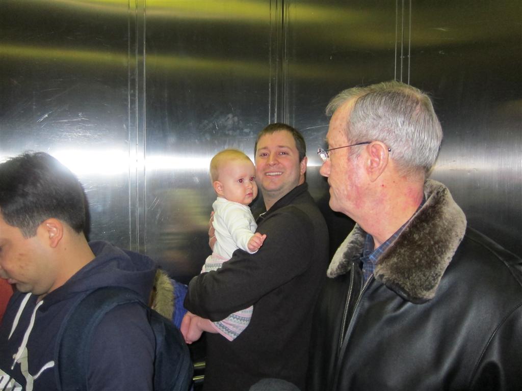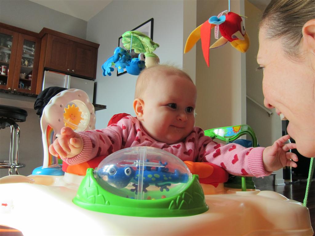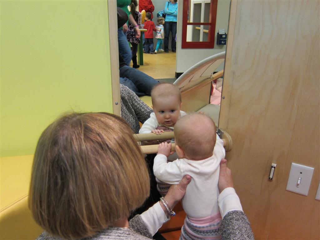Eleanor had a very busy week this week – especially the end of the week. We started the week celebrating Valentine’s day in a fun outfit, and eating blueberries for the first time (messy!). On Thursday we discovered the much delayed top tooth finally coming through. On Friday, Dad played hookie and went along to baby and me class with Ellie and Mom. And on Friday afternoon, Grandma, Grandpa, Auntie Susan, and cousins Mackenzie, Jack and Ben came for a visit. What fun! On Saturday we went with the whole crew to Navy Pier to visit the hands on museum. Most of the activities were targeting a bit older age – but there were a few “Non Walkers Only” areas that Ellie got to play in. After that, we went to the Sears (does anyone use the new name, Willis?) Tower for some great views of the city. Mackenzie even convinced Uncle B to come out into the Plexiglas box. On Sunday we played at home with the cousins until they had to hit the road for home.