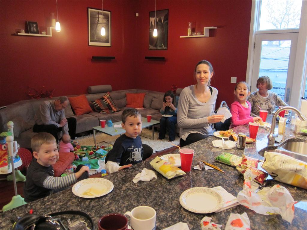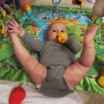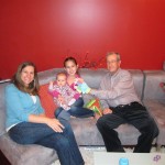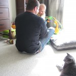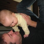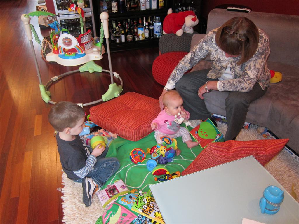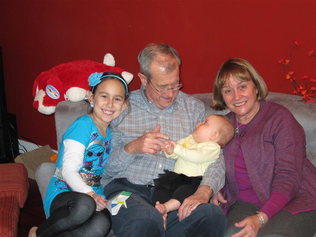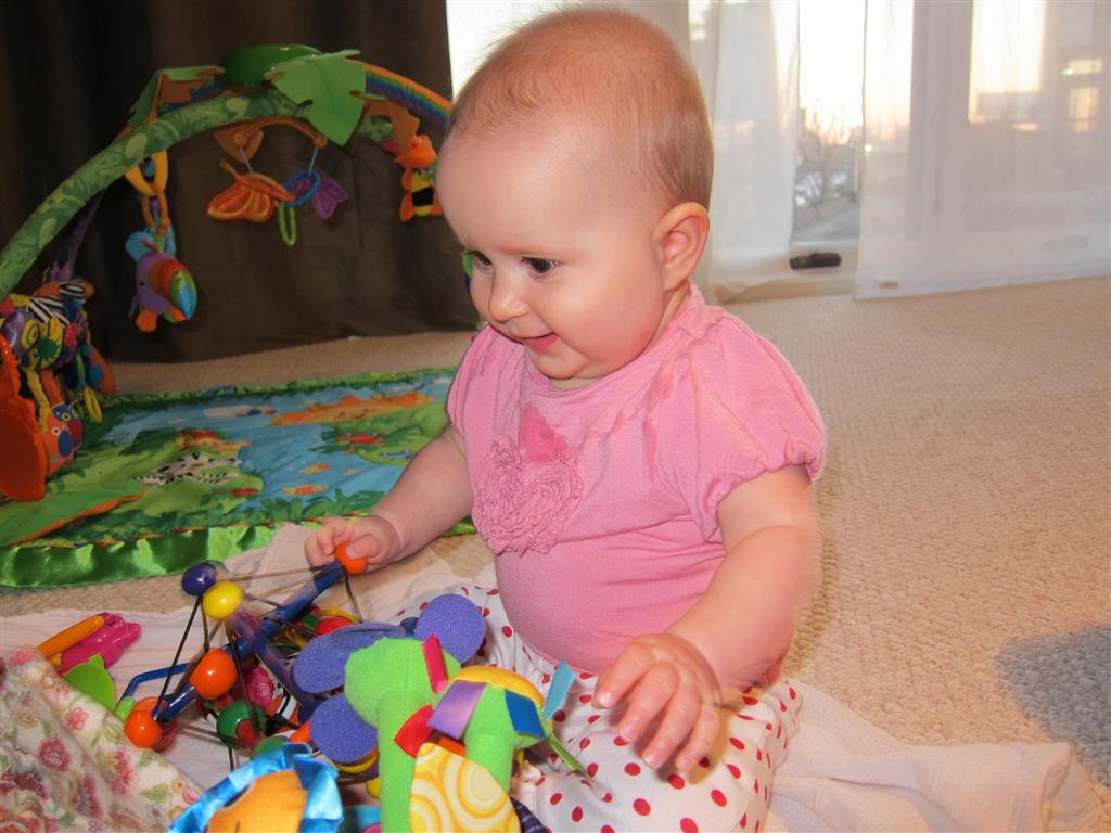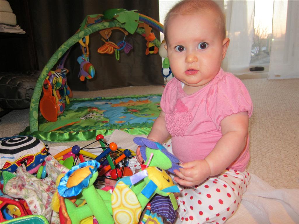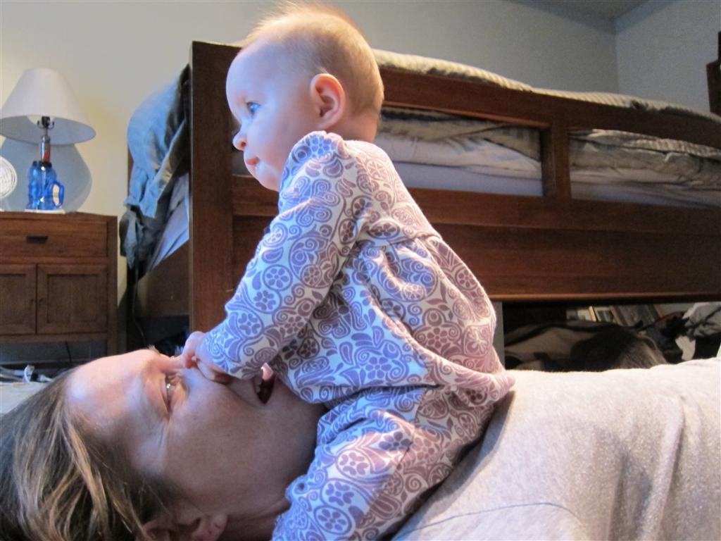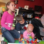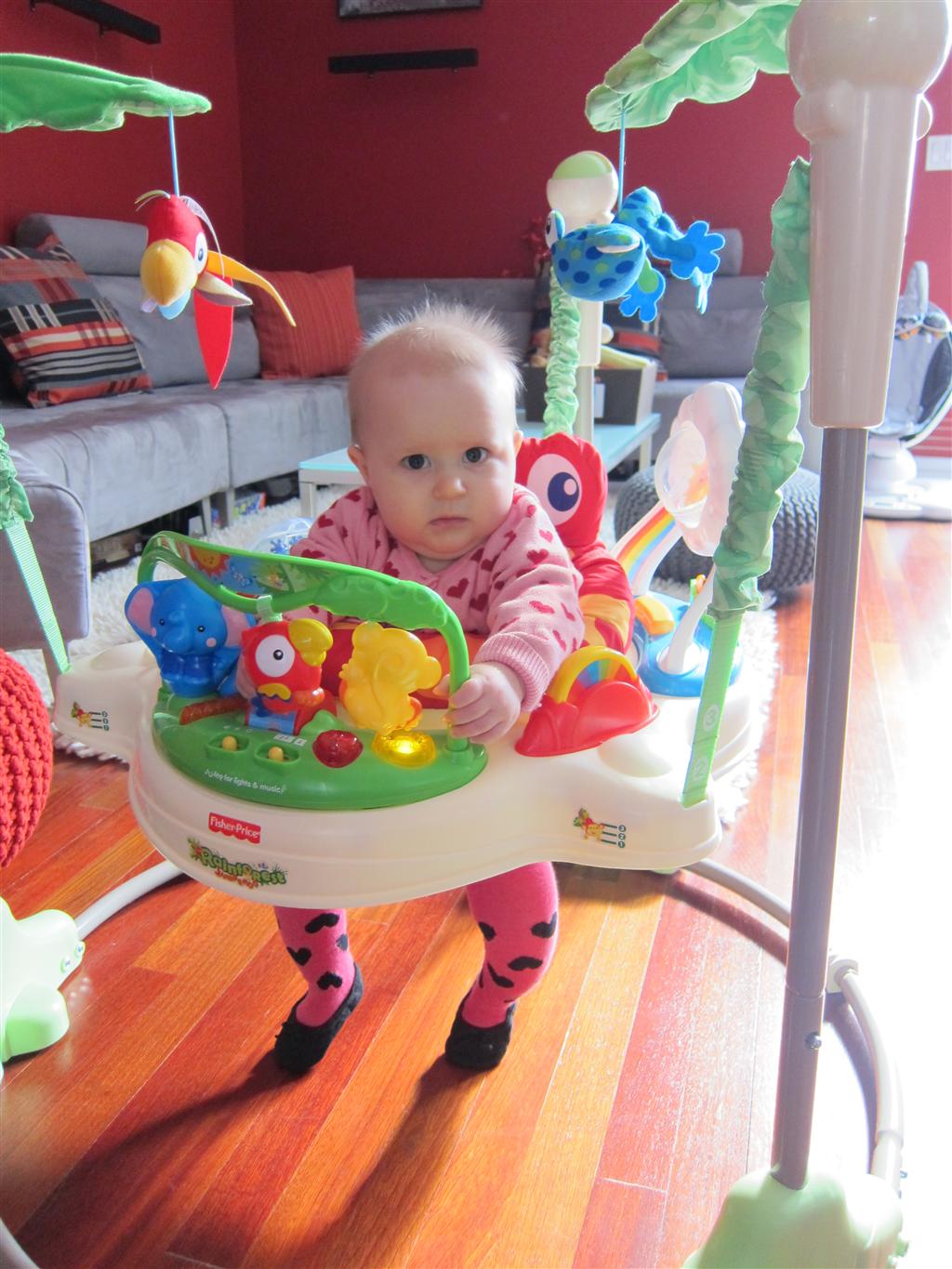 Eleanor had a very busy week this week – especially the end of the week. We started the week celebrating Valentine’s day in a fun outfit, and eating blueberries for the first time (messy!). On Thursday we discovered the much delayed top tooth finally coming through. On Friday, Dad played hookie and went along to baby and me class with Ellie and Mom. And on Friday afternoon, Grandma, Grandpa, Auntie Susan, and cousins Mackenzie, Jack and Ben came for a visit. What fun! On Saturday we went with the whole crew to Navy Pier to visit the hands on museum. Most of the activities were targeting a bit older age – but there were a few “Non Walkers Only” areas that Ellie got to play in. After that, we went to the Sears (does anyone use the new name, Willis?) Tower for some great views of the city. Mackenzie even convinced Uncle B to come out into the Plexiglas box. On Sunday we played at home with the cousins until they had to hit the road for home.