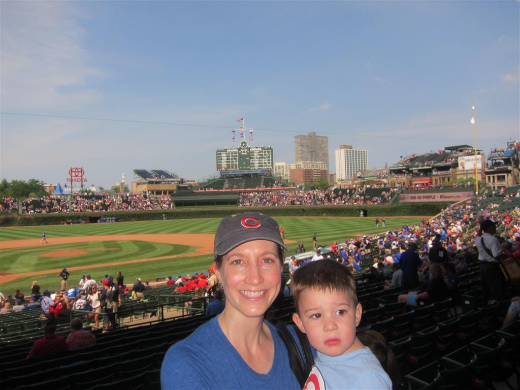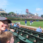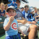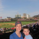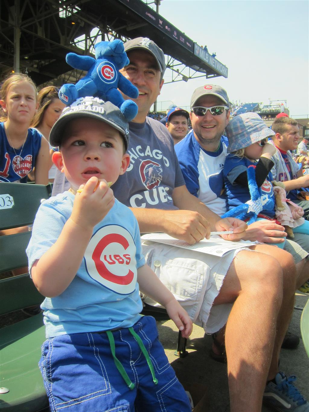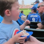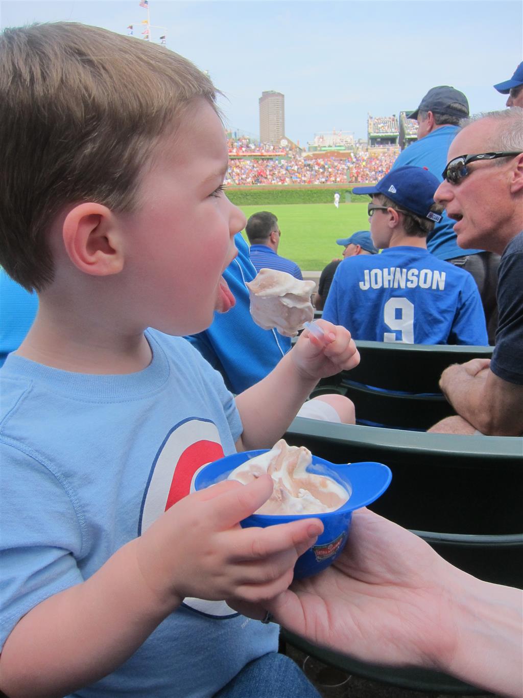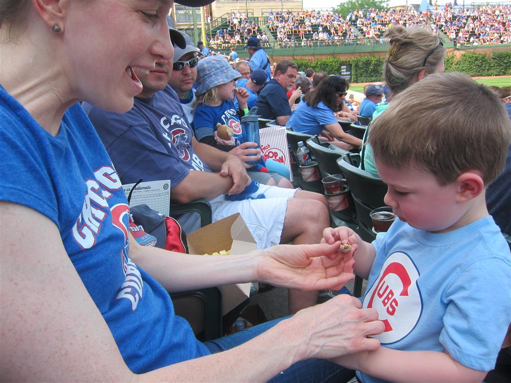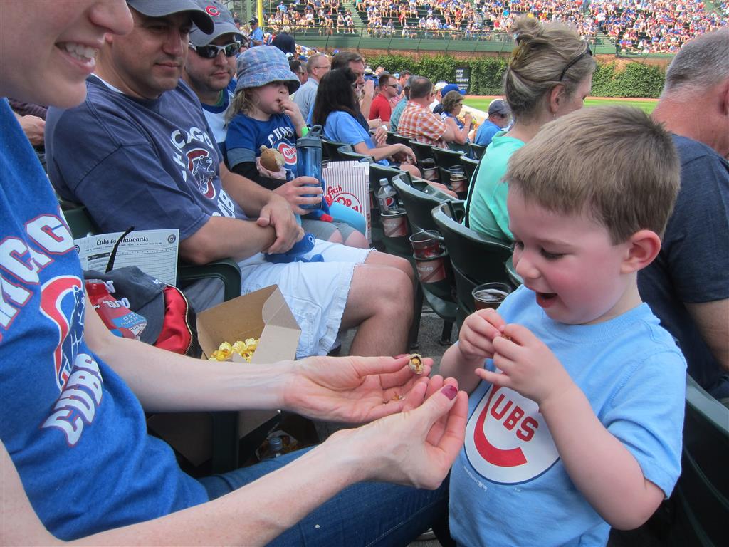 On Friday Eleanor and Henry went to their first Cubs game. Not surprisingly, the food was the biggest hit, with Eleanor hitting the popcorn and pretzels hard, and Henry taking down popcorn, pretzels and ice cream, and even cracking and eating shelled peanuts! He loved that he could just drop the shells onto the floor! He also tried Uncle B’s lemon chill, but he didn’t love that one. Alas, no malt cups – I’m not sure I ever made it through a game as a kid without at least sharing a malt cup….