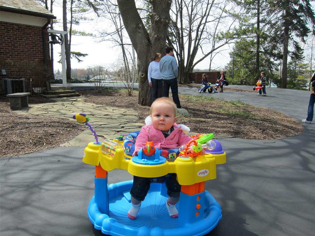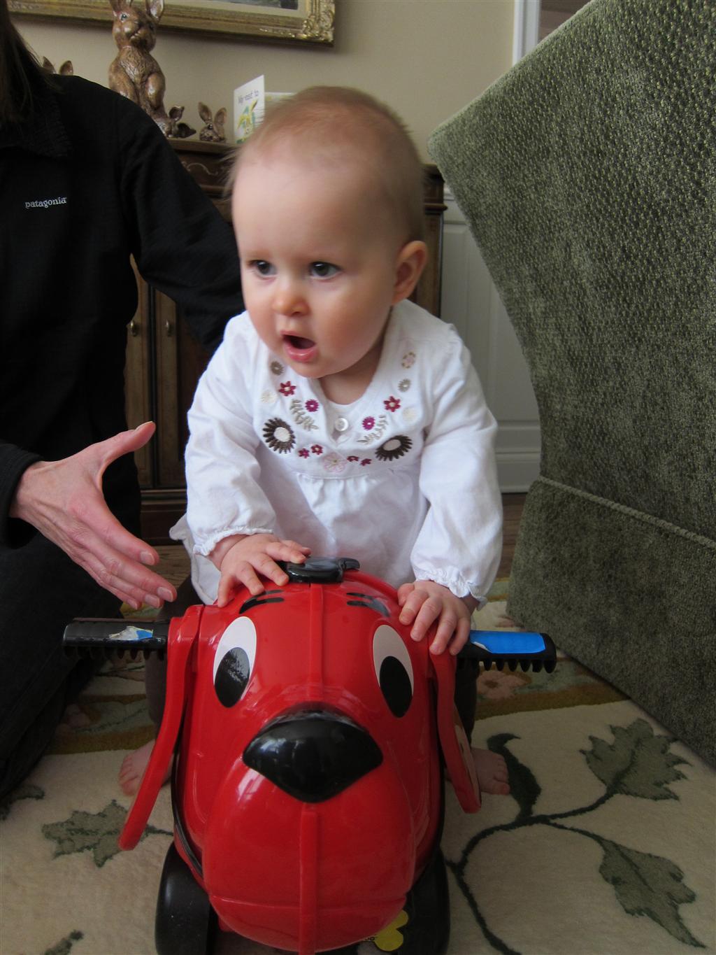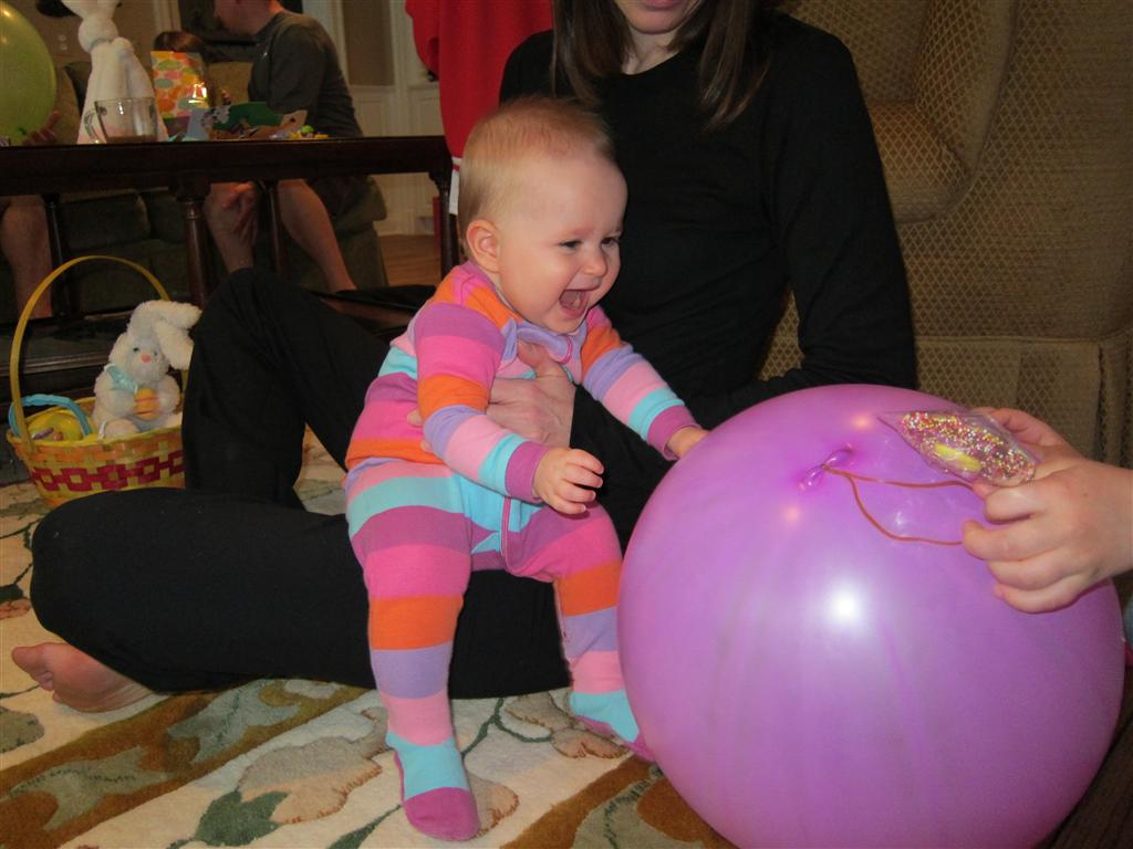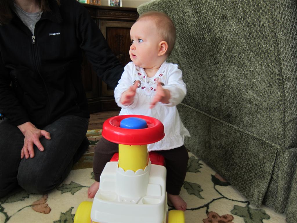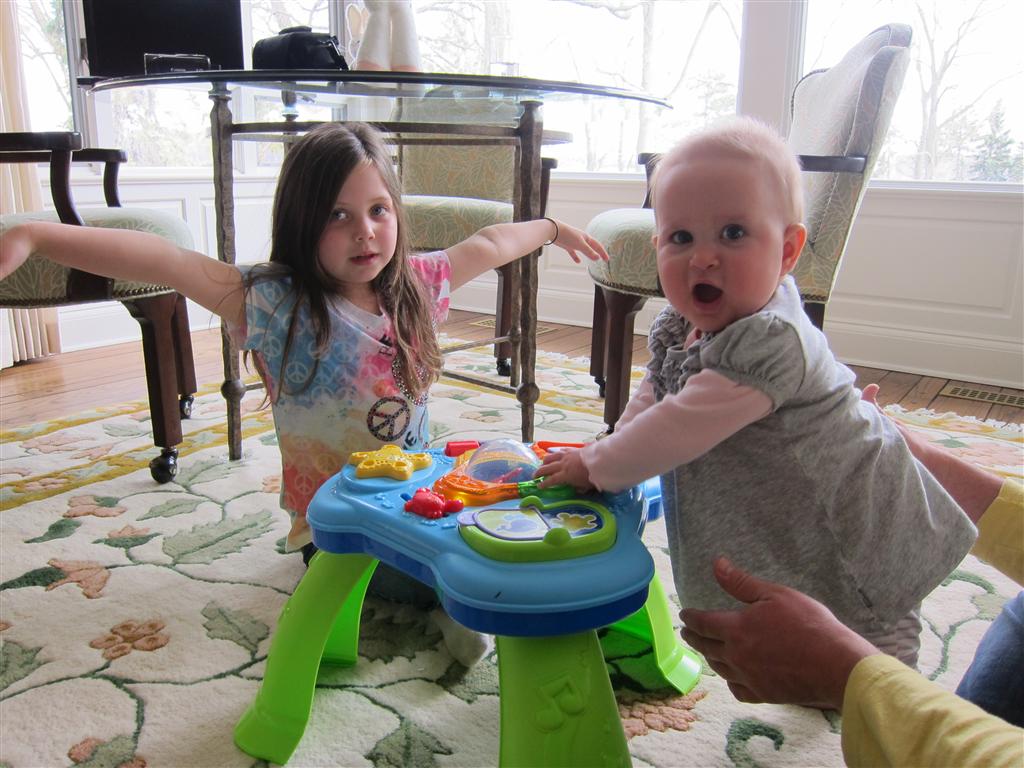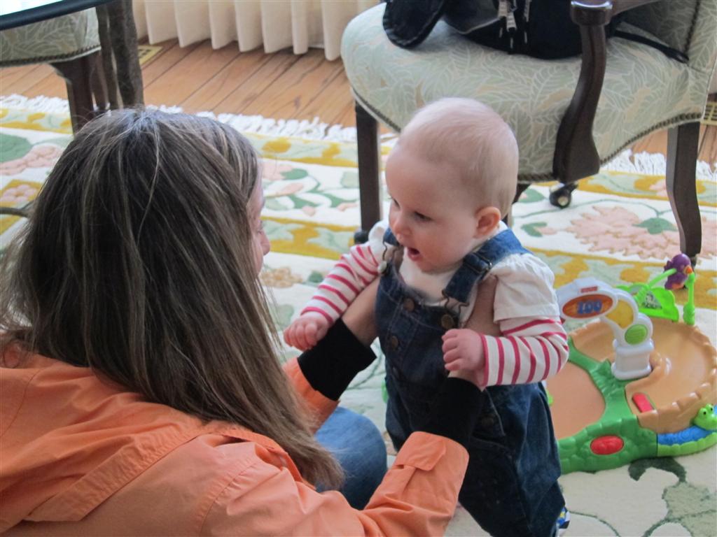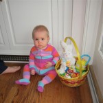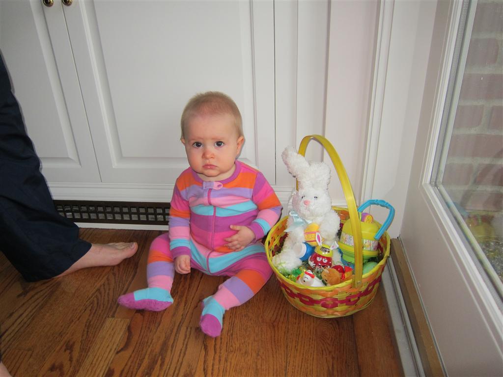 Eleanor spent her first Easter at Grandma and Grandpa’s house – and what a full house it was! Mackenzie, Jack, Ben, Mahlia and Brooke were all there too! She was super excited to meet Mahlia and Brooke for the first time – and Aunt Kristen and Uncle Michael too! Grandma and Grandpa had a standing table that was the perfect height for Eleanor – and she got lots of practice standing and even trying to pull herself up from sitting. She also got to try a ride-on toy for the first time, with mixed results. We need to work on the balance a bit more :) Eleanor did well with her first picture with the Easter Bunny – no crying but also no smiles. She also adjusted well to being one of six kids in the house – quite a change (and quite a lot more head rubbing) from the only child quiet of home. Oh yeah, and on Monday night Eleanor sat up all by herself in her crib! Time to lower the mattress again :)