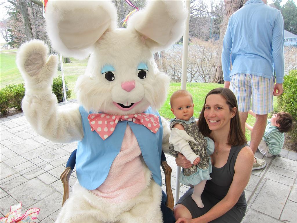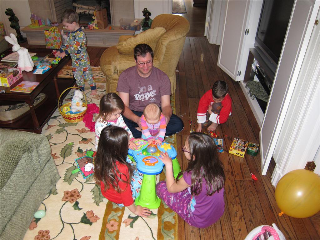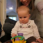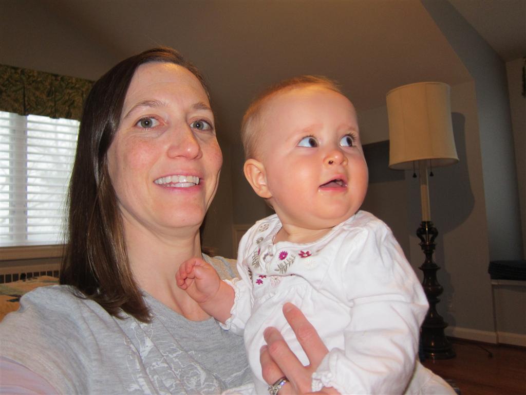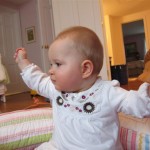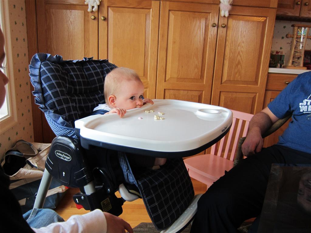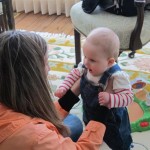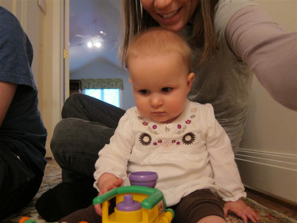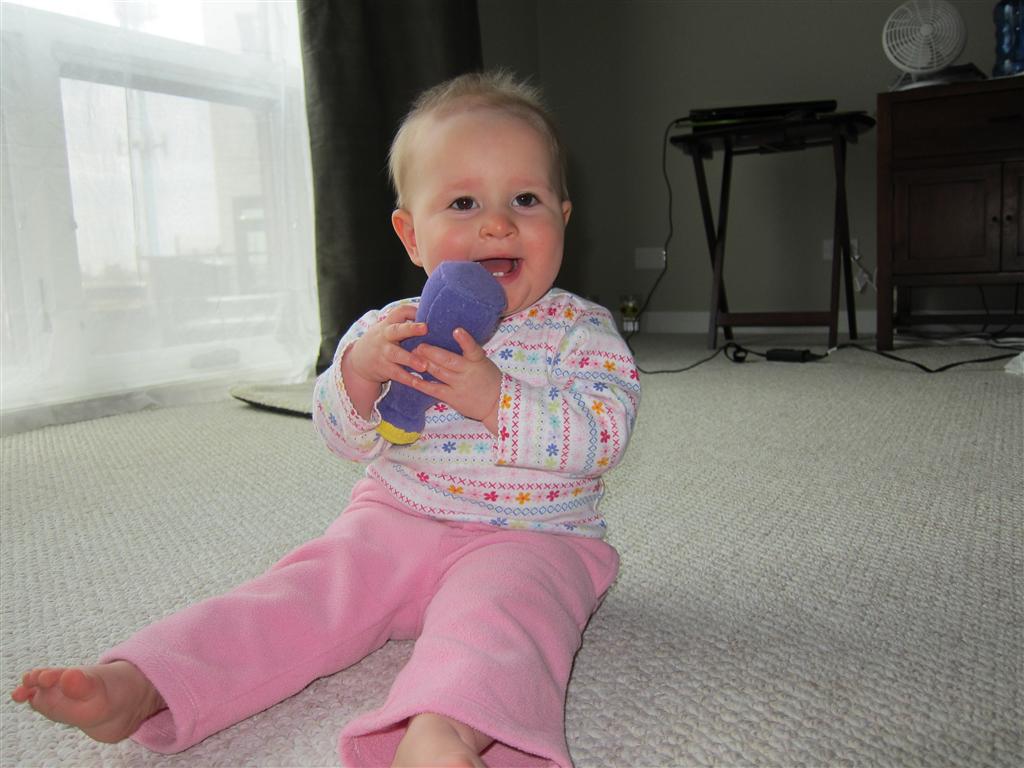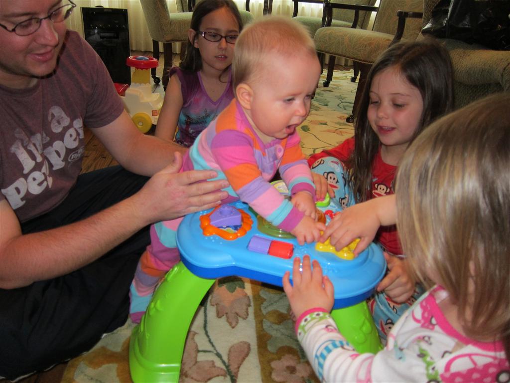 Eleanor spent her first Easter at Grandma and Grandpa’s house – and what a full house it was! Mackenzie, Jack, Ben, Mahlia and Brooke were all there too! She was super excited to meet Mahlia and Brooke for the first time – and Aunt Kristen and Uncle Michael too! Grandma and Grandpa had a standing table that was the perfect height for Eleanor – and she got lots of practice standing and even trying to pull herself up from sitting. She also got to try a ride-on toy for the first time, with mixed results. We need to work on the balance a bit more :) Eleanor did well with her first picture with the Easter Bunny – no crying but also no smiles. She also adjusted well to being one of six kids in the house – quite a change (and quite a lot more head rubbing) from the only child quiet of home. Oh yeah, and on Monday night Eleanor sat up all by herself in her crib! Time to lower the mattress again :)