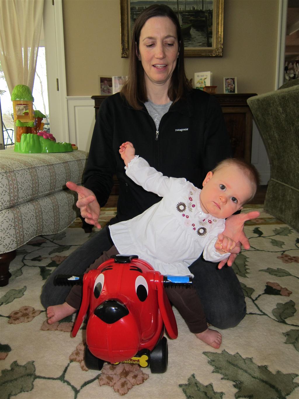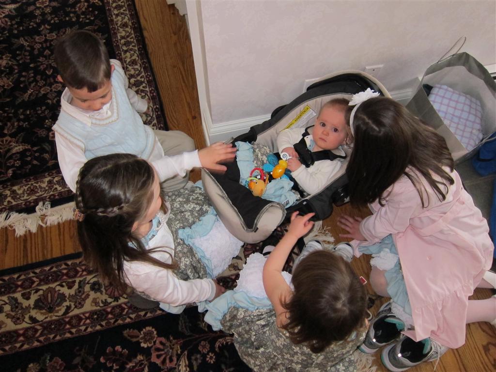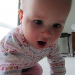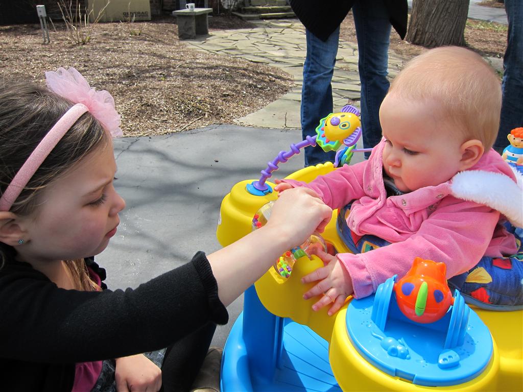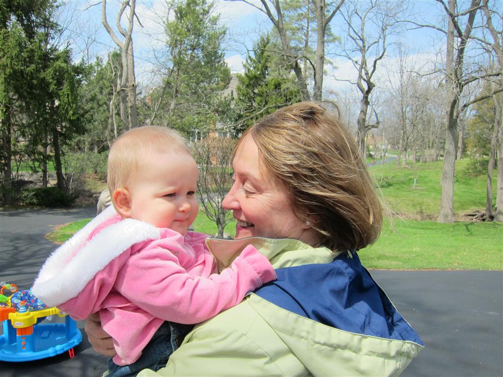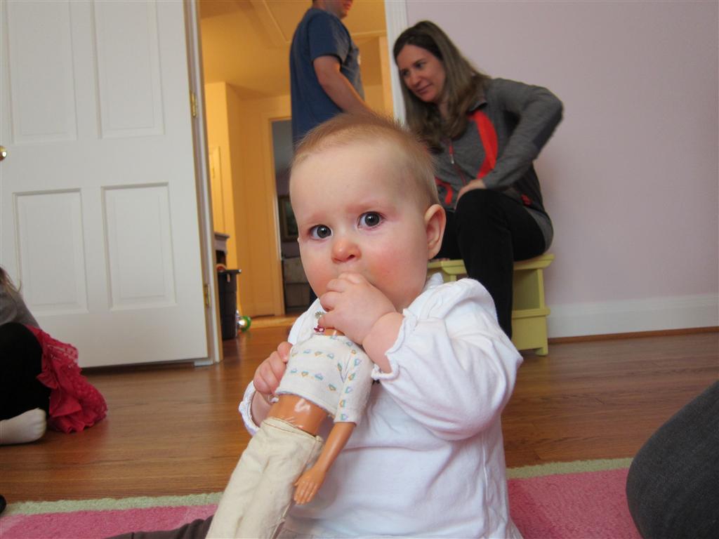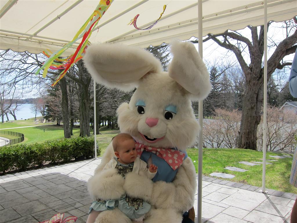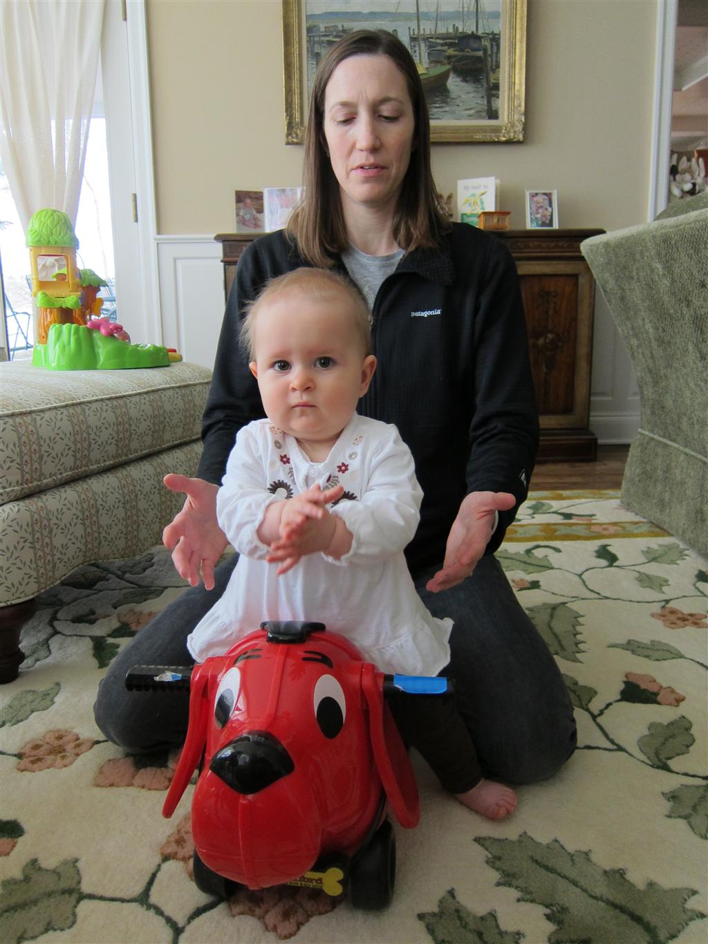 Eleanor spent her first Easter at Grandma and Grandpa’s house – and what a full house it was! Mackenzie, Jack, Ben, Mahlia and Brooke were all there too! She was super excited to meet Mahlia and Brooke for the first time – and Aunt Kristen and Uncle Michael too! Grandma and Grandpa had a standing table that was the perfect height for Eleanor – and she got lots of practice standing and even trying to pull herself up from sitting. She also got to try a ride-on toy for the first time, with mixed results. We need to work on the balance a bit more :) Eleanor did well with her first picture with the Easter Bunny – no crying but also no smiles. She also adjusted well to being one of six kids in the house – quite a change (and quite a lot more head rubbing) from the only child quiet of home. Oh yeah, and on Monday night Eleanor sat up all by herself in her crib! Time to lower the mattress again :)