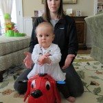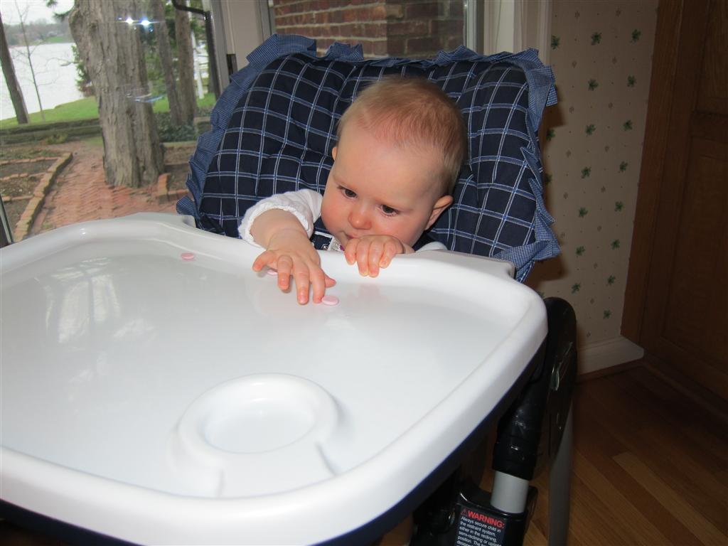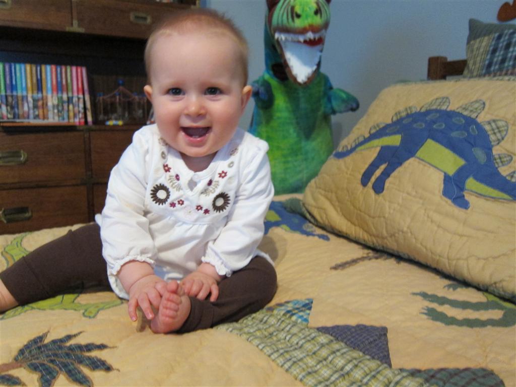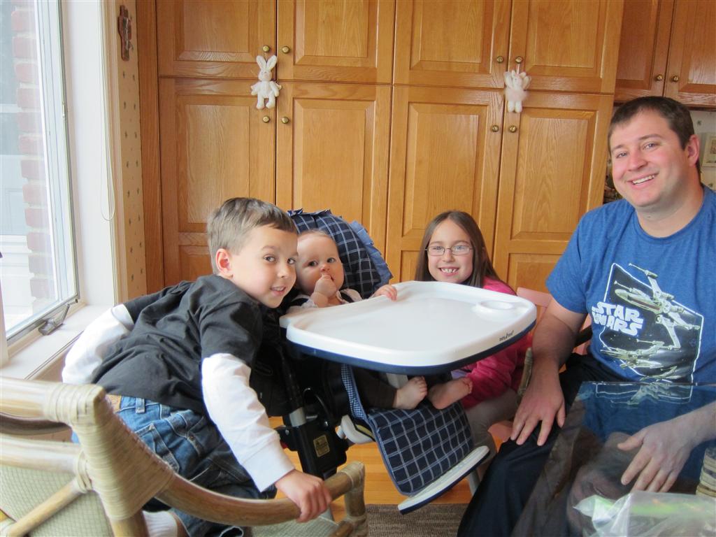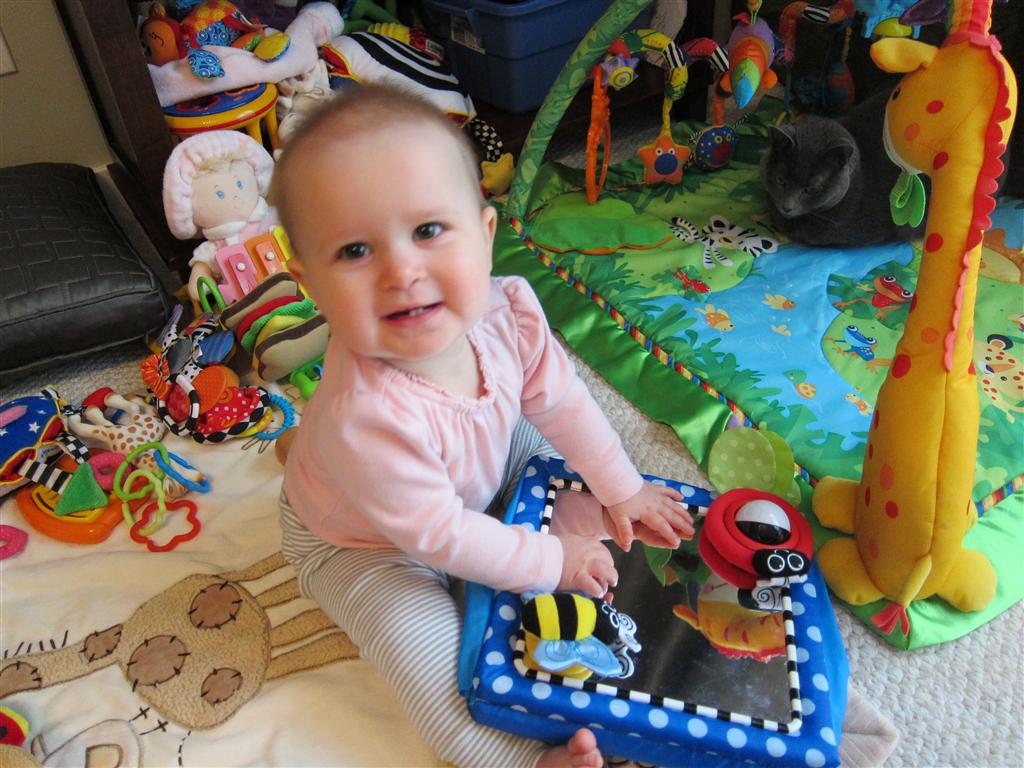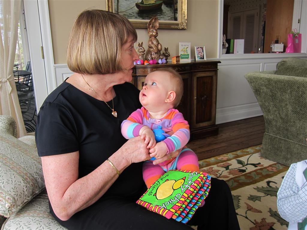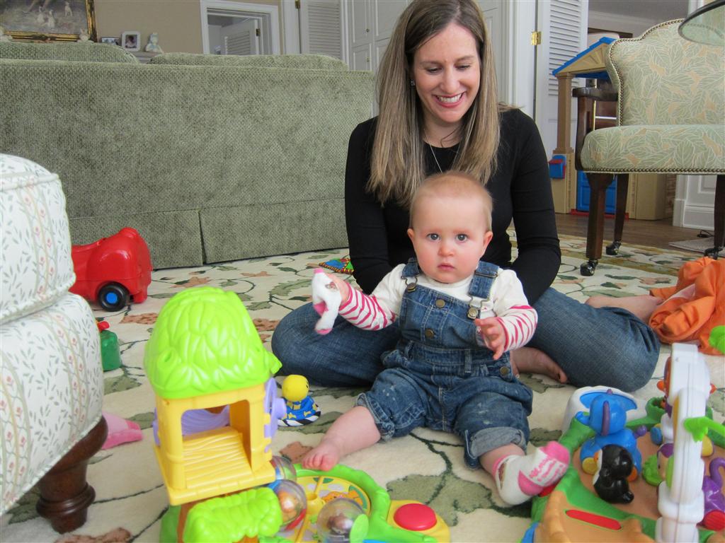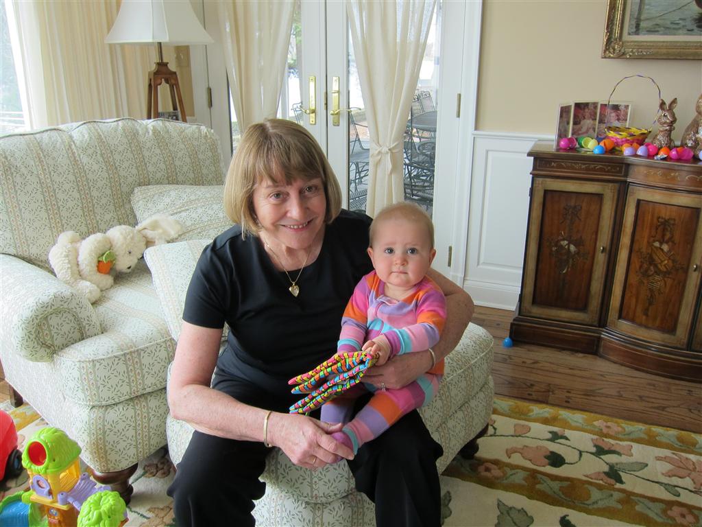 Eleanor spent her first Easter at Grandma and Grandpa’s house – and what a full house it was! Mackenzie, Jack, Ben, Mahlia and Brooke were all there too! She was super excited to meet Mahlia and Brooke for the first time – and Aunt Kristen and Uncle Michael too! Grandma and Grandpa had a standing table that was the perfect height for Eleanor – and she got lots of practice standing and even trying to pull herself up from sitting. She also got to try a ride-on toy for the first time, with mixed results. We need to work on the balance a bit more :) Eleanor did well with her first picture with the Easter Bunny – no crying but also no smiles. She also adjusted well to being one of six kids in the house – quite a change (and quite a lot more head rubbing) from the only child quiet of home. Oh yeah, and on Monday night Eleanor sat up all by herself in her crib! Time to lower the mattress again :)