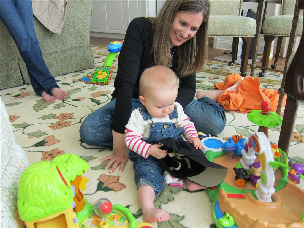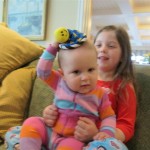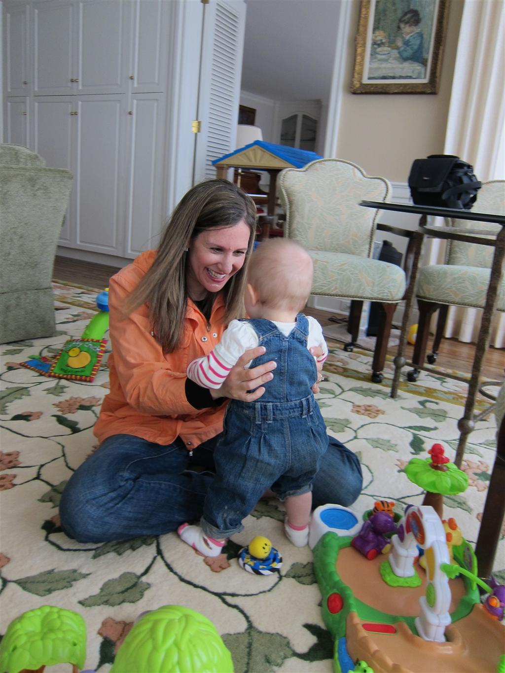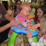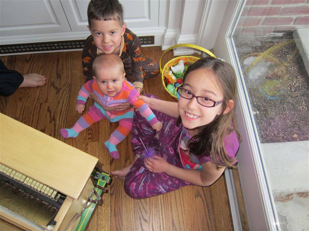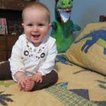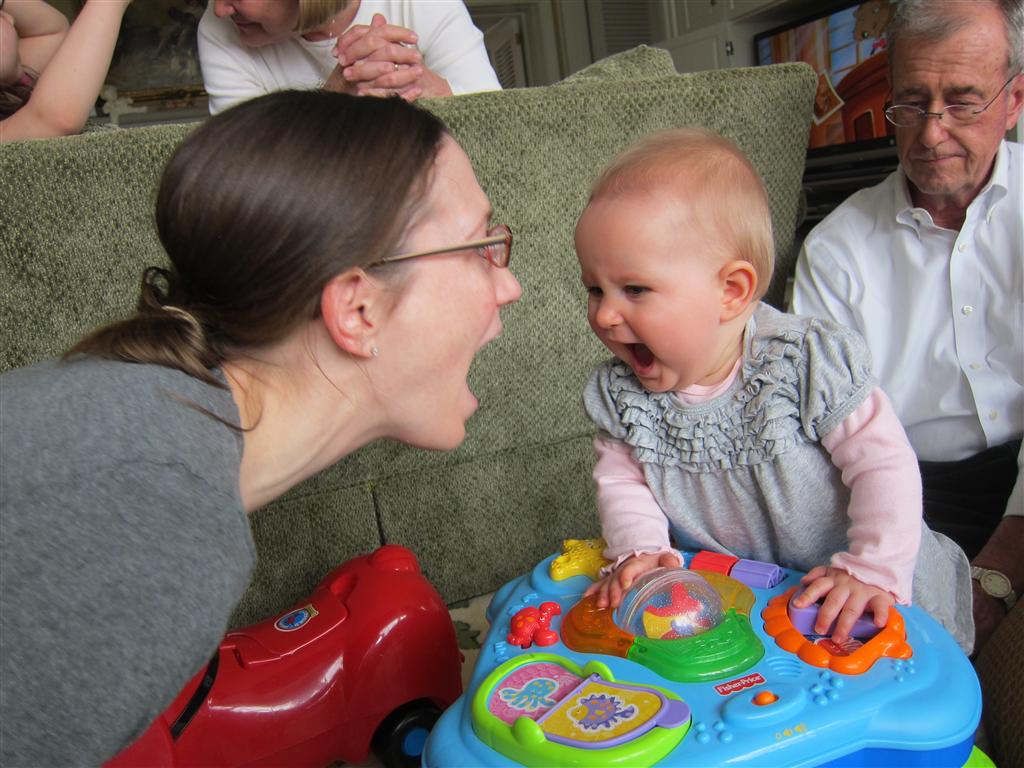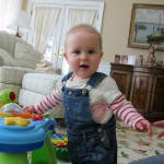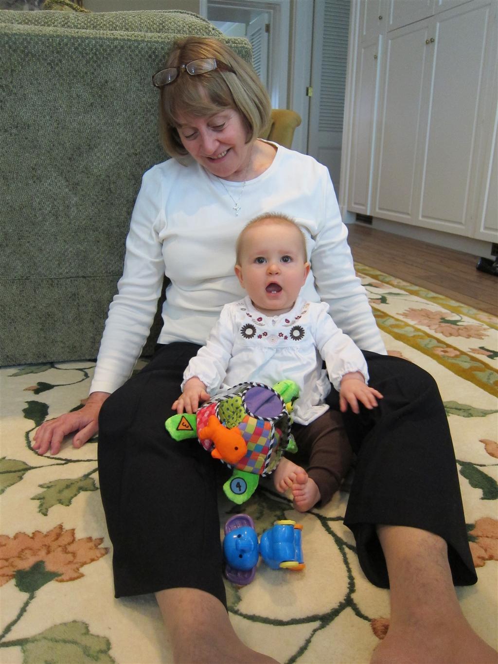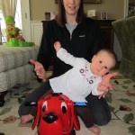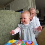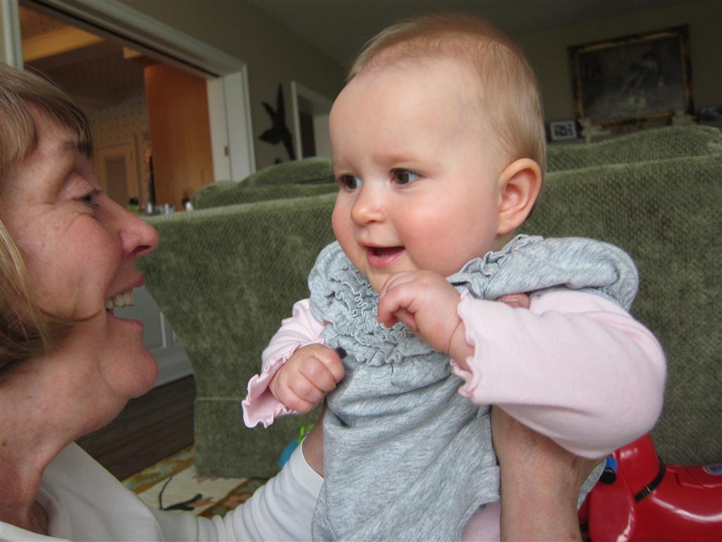 Eleanor spent her first Easter at Grandma and Grandpa’s house – and what a full house it was! Mackenzie, Jack, Ben, Mahlia and Brooke were all there too! She was super excited to meet Mahlia and Brooke for the first time – and Aunt Kristen and Uncle Michael too! Grandma and Grandpa had a standing table that was the perfect height for Eleanor – and she got lots of practice standing and even trying to pull herself up from sitting. She also got to try a ride-on toy for the first time, with mixed results. We need to work on the balance a bit more :) Eleanor did well with her first picture with the Easter Bunny – no crying but also no smiles. She also adjusted well to being one of six kids in the house – quite a change (and quite a lot more head rubbing) from the only child quiet of home. Oh yeah, and on Monday night Eleanor sat up all by herself in her crib! Time to lower the mattress again :)