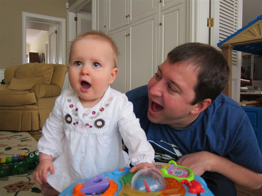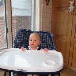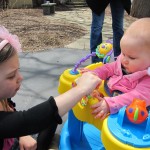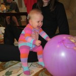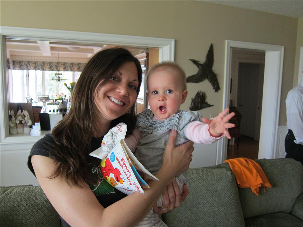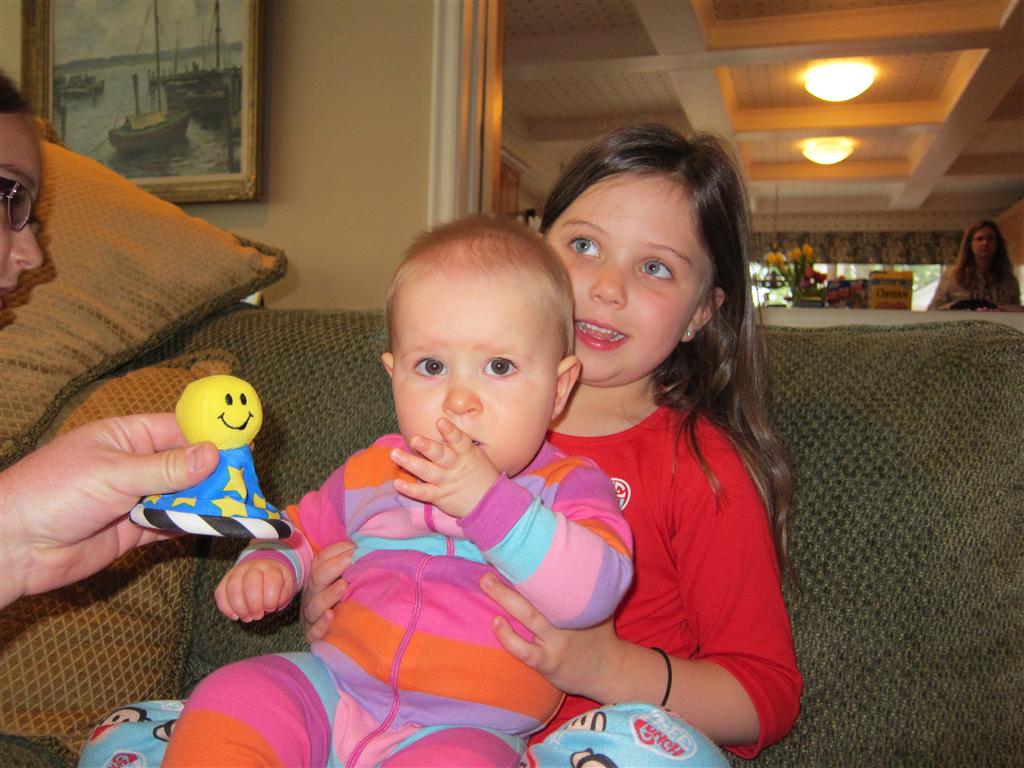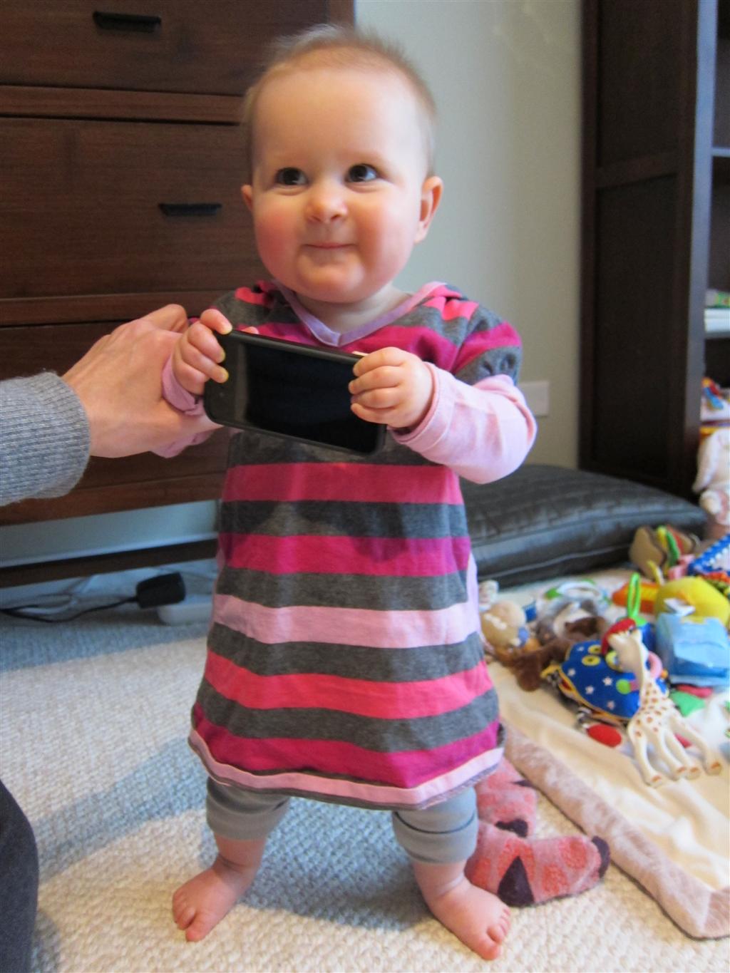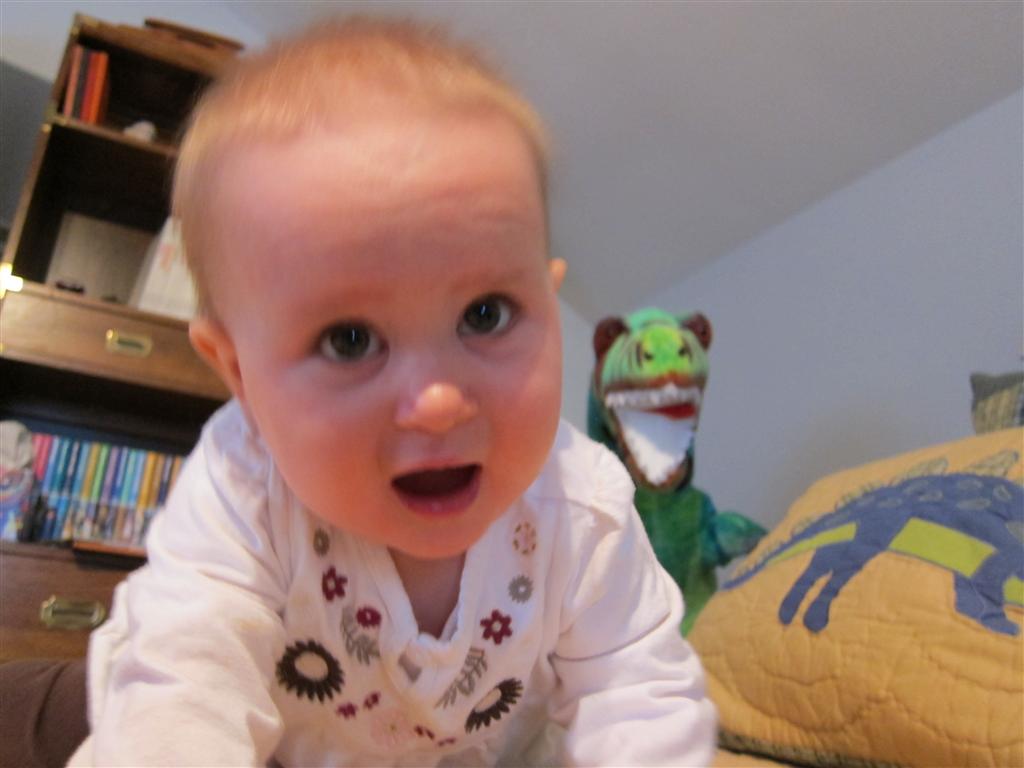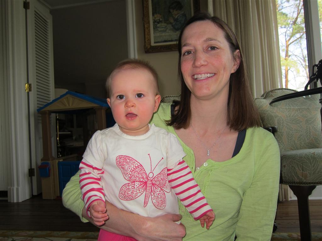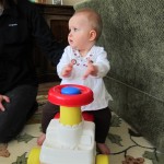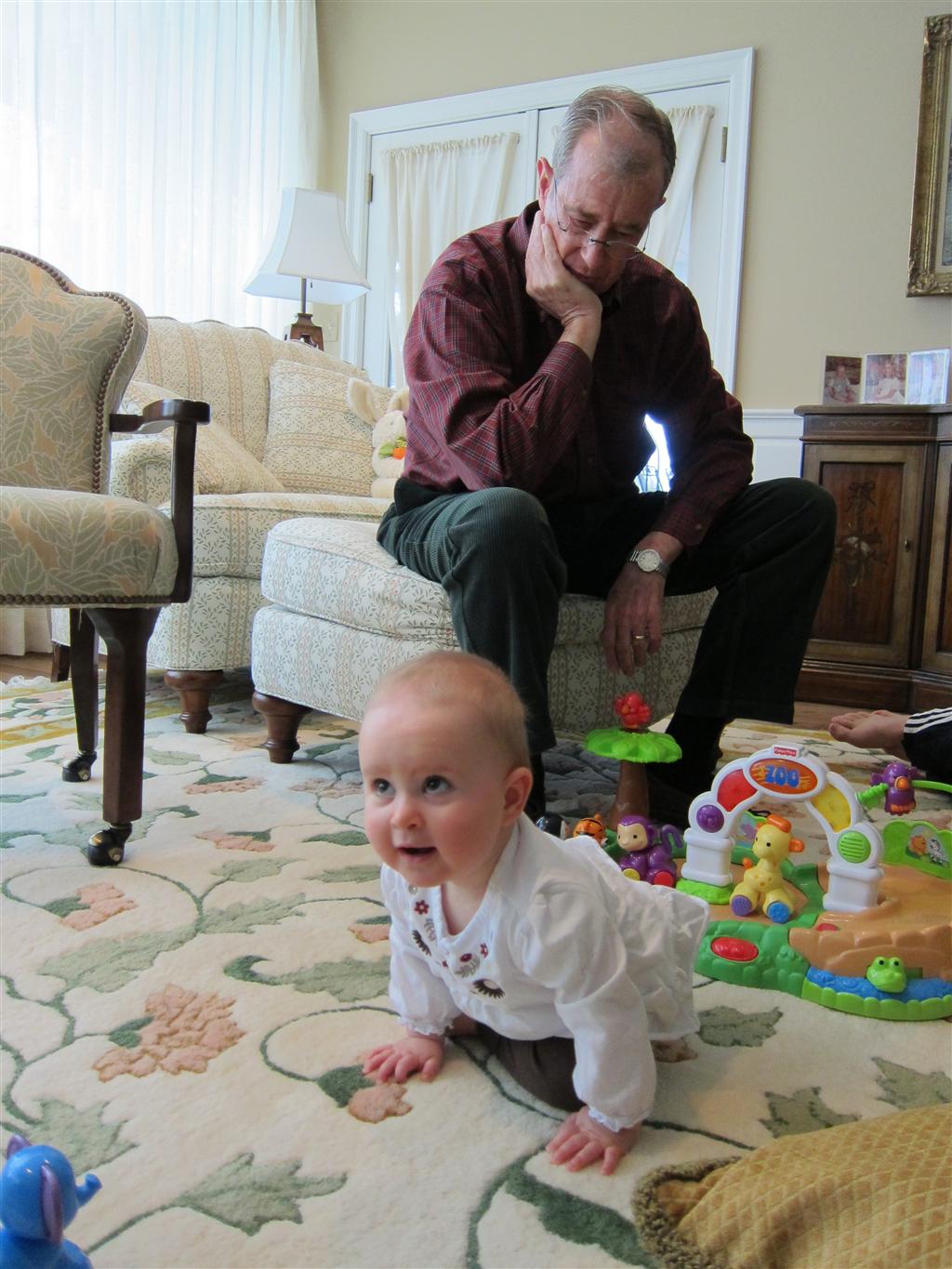 Eleanor spent her first Easter at Grandma and Grandpa’s house – and what a full house it was! Mackenzie, Jack, Ben, Mahlia and Brooke were all there too! She was super excited to meet Mahlia and Brooke for the first time – and Aunt Kristen and Uncle Michael too! Grandma and Grandpa had a standing table that was the perfect height for Eleanor – and she got lots of practice standing and even trying to pull herself up from sitting. She also got to try a ride-on toy for the first time, with mixed results. We need to work on the balance a bit more :) Eleanor did well with her first picture with the Easter Bunny – no crying but also no smiles. She also adjusted well to being one of six kids in the house – quite a change (and quite a lot more head rubbing) from the only child quiet of home. Oh yeah, and on Monday night Eleanor sat up all by herself in her crib! Time to lower the mattress again :)