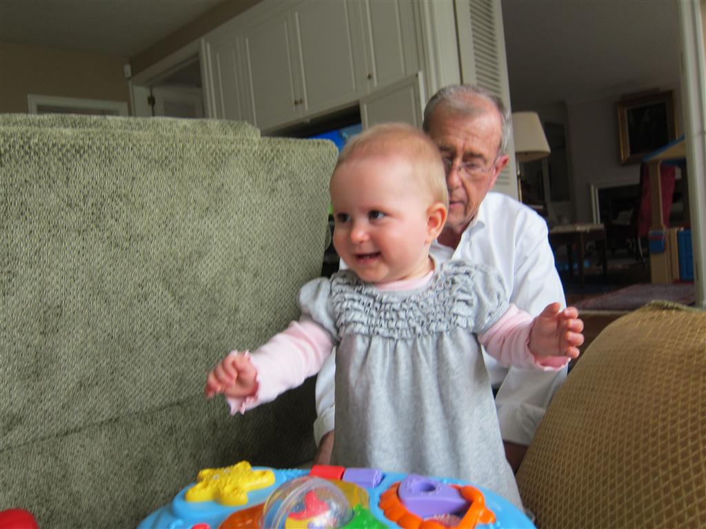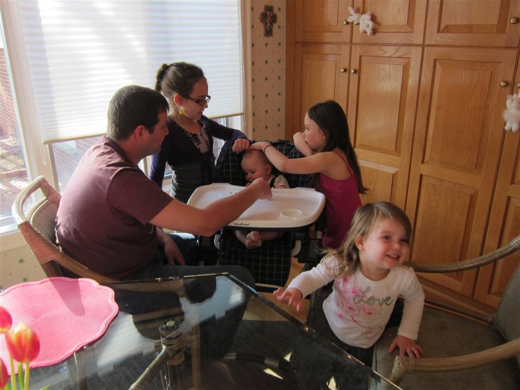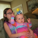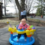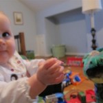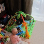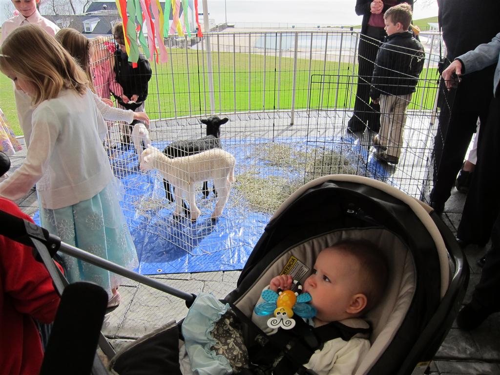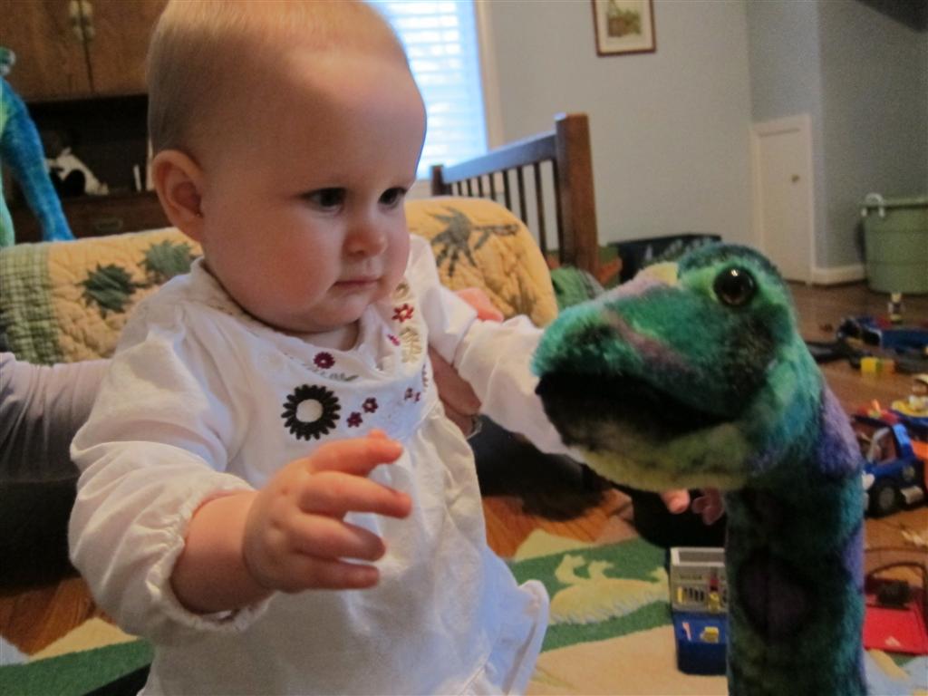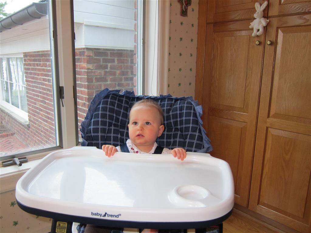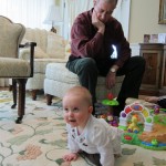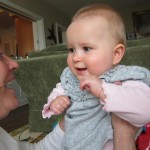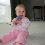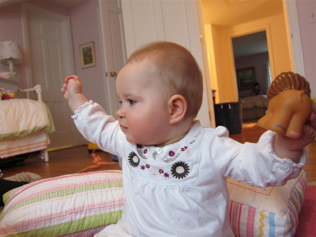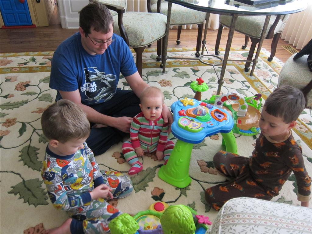 Eleanor spent her first Easter at Grandma and Grandpa’s house – and what a full house it was! Mackenzie, Jack, Ben, Mahlia and Brooke were all there too! She was super excited to meet Mahlia and Brooke for the first time – and Aunt Kristen and Uncle Michael too! Grandma and Grandpa had a standing table that was the perfect height for Eleanor – and she got lots of practice standing and even trying to pull herself up from sitting. She also got to try a ride-on toy for the first time, with mixed results. We need to work on the balance a bit more :) Eleanor did well with her first picture with the Easter Bunny – no crying but also no smiles. She also adjusted well to being one of six kids in the house – quite a change (and quite a lot more head rubbing) from the only child quiet of home. Oh yeah, and on Monday night Eleanor sat up all by herself in her crib! Time to lower the mattress again :)