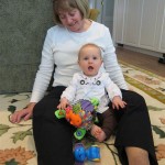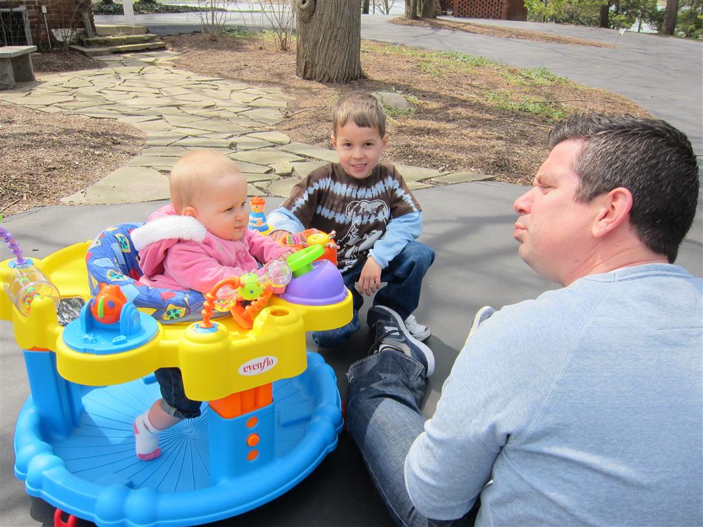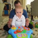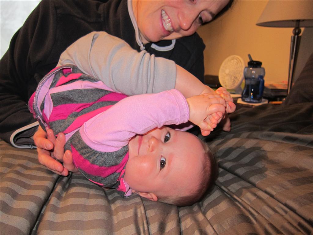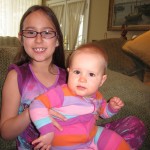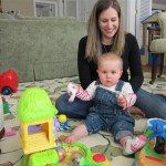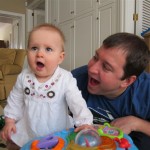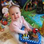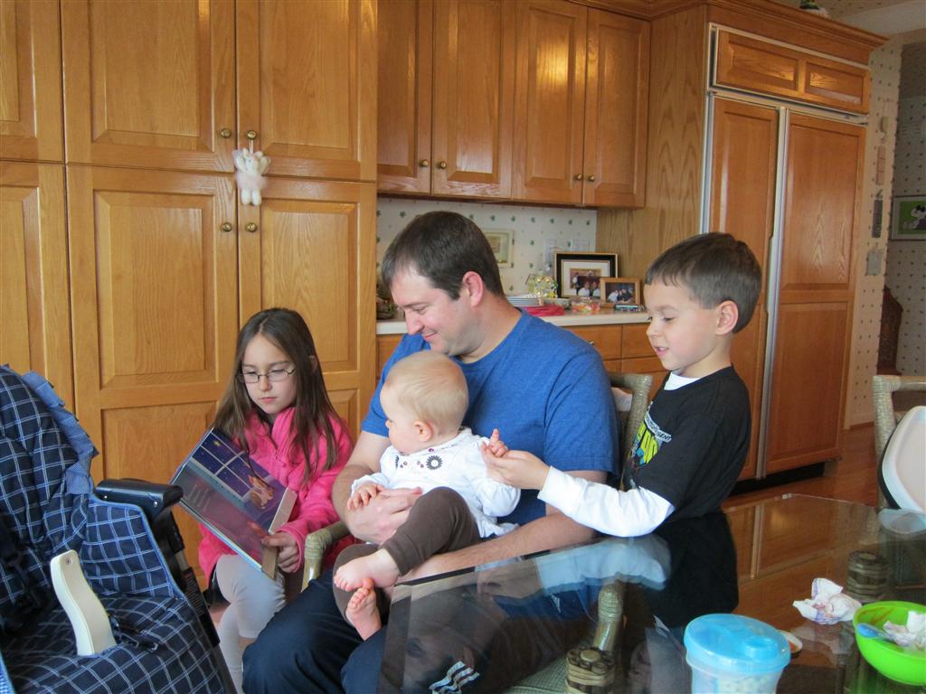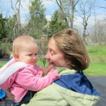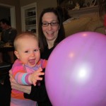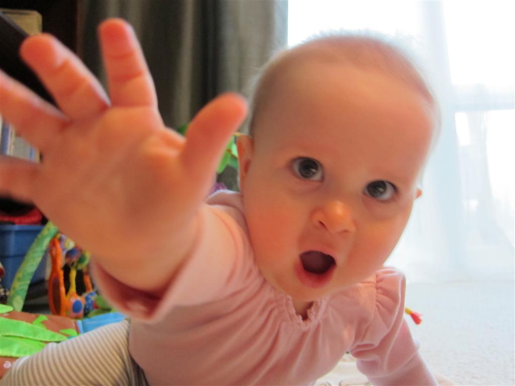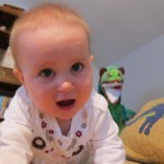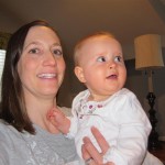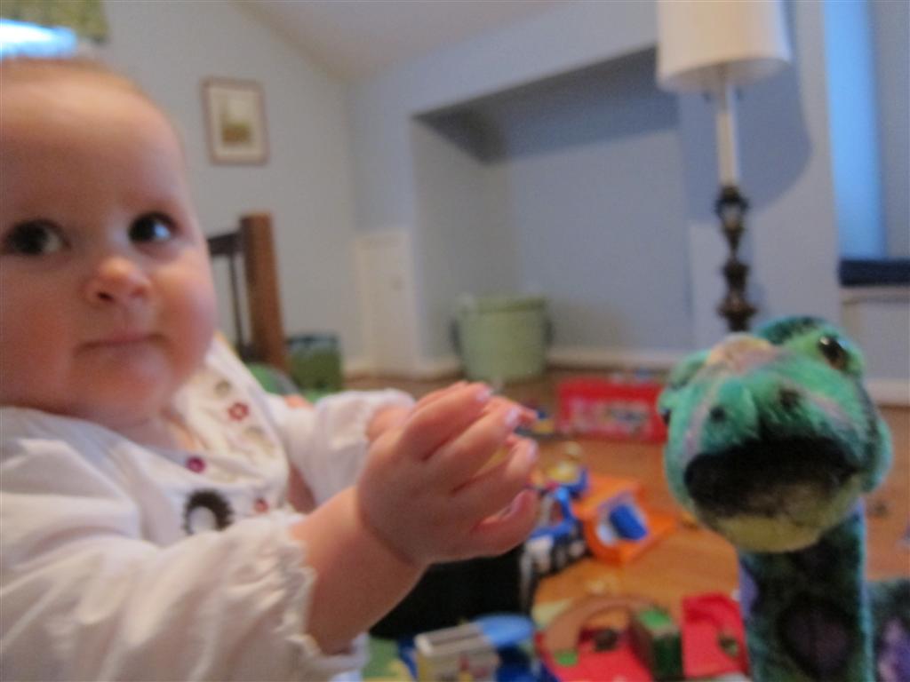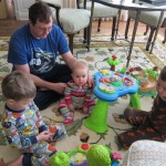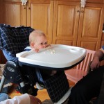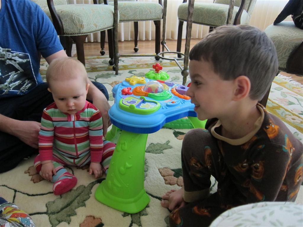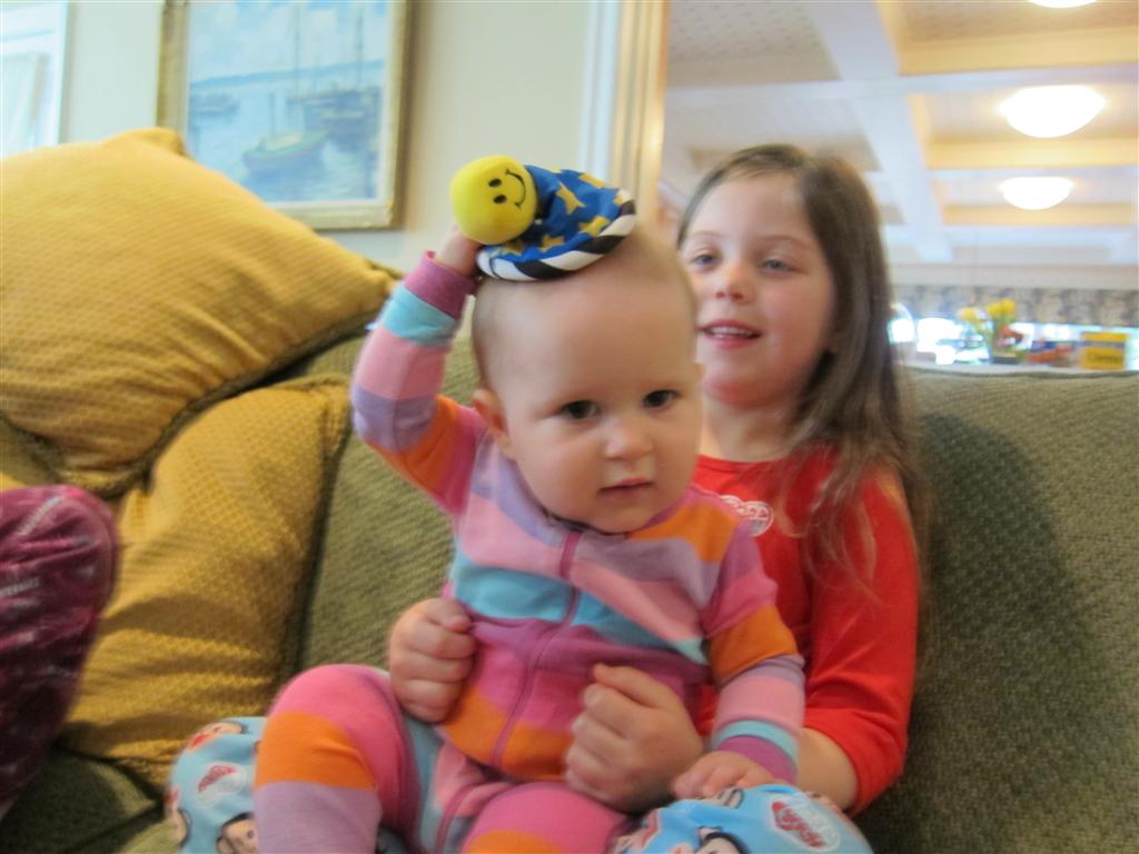 Eleanor spent her first Easter at Grandma and Grandpa’s house – and what a full house it was! Mackenzie, Jack, Ben, Mahlia and Brooke were all there too! She was super excited to meet Mahlia and Brooke for the first time – and Aunt Kristen and Uncle Michael too! Grandma and Grandpa had a standing table that was the perfect height for Eleanor – and she got lots of practice standing and even trying to pull herself up from sitting. She also got to try a ride-on toy for the first time, with mixed results. We need to work on the balance a bit more :) Eleanor did well with her first picture with the Easter Bunny – no crying but also no smiles. She also adjusted well to being one of six kids in the house – quite a change (and quite a lot more head rubbing) from the only child quiet of home. Oh yeah, and on Monday night Eleanor sat up all by herself in her crib! Time to lower the mattress again :)