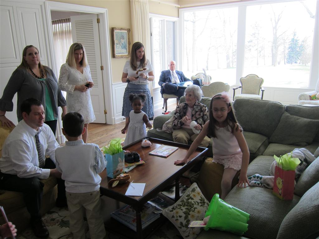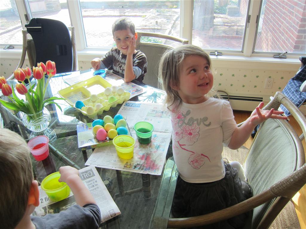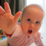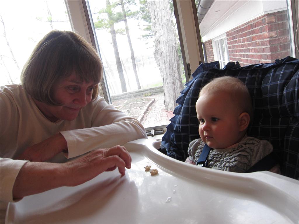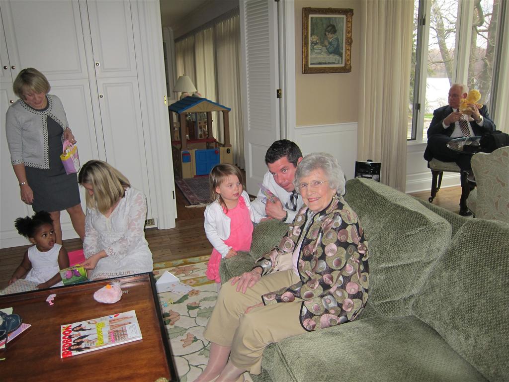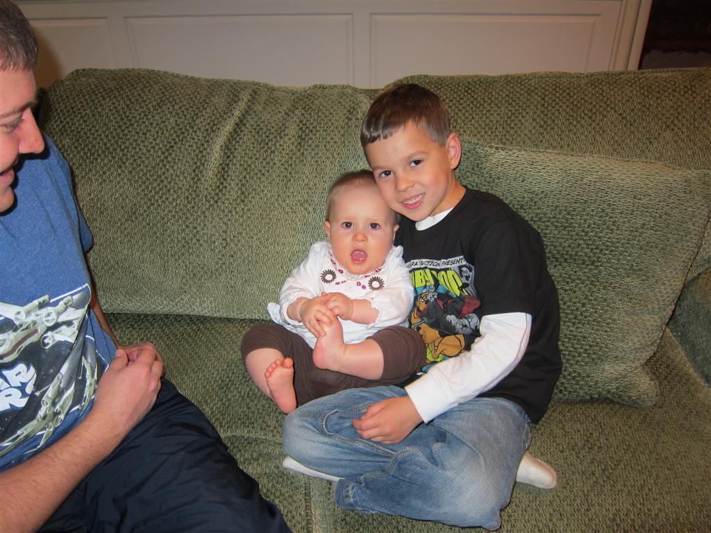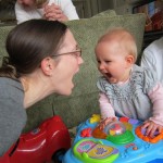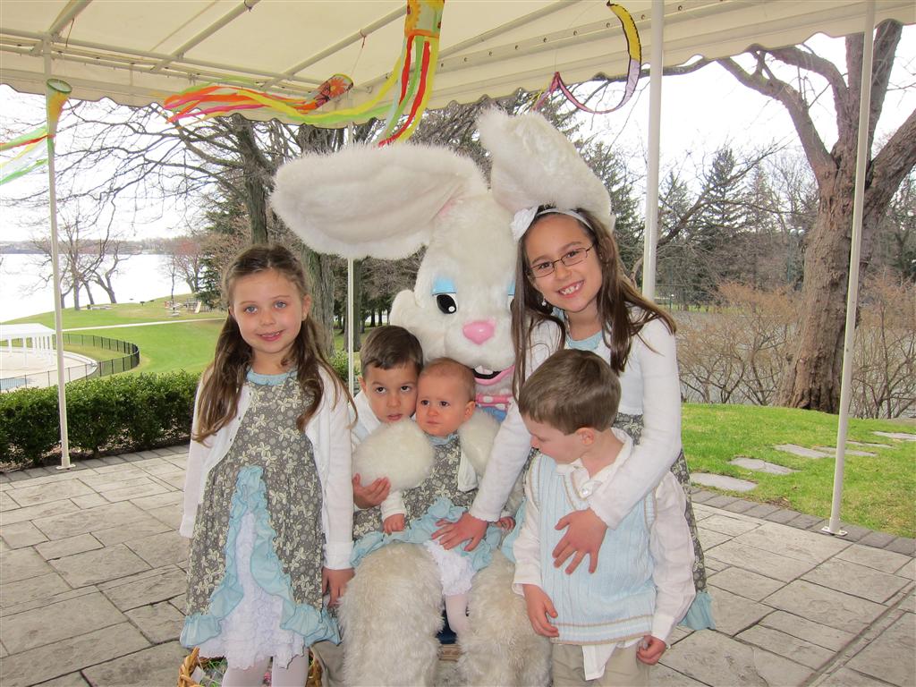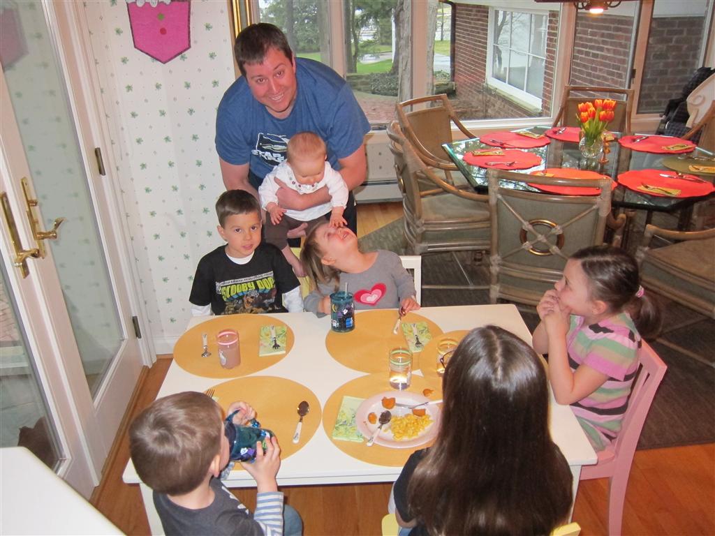 Eleanor spent her first Easter at Grandma and Grandpa’s house – and what a full house it was! Mackenzie, Jack, Ben, Mahlia and Brooke were all there too! She was super excited to meet Mahlia and Brooke for the first time – and Aunt Kristen and Uncle Michael too! Grandma and Grandpa had a standing table that was the perfect height for Eleanor – and she got lots of practice standing and even trying to pull herself up from sitting. She also got to try a ride-on toy for the first time, with mixed results. We need to work on the balance a bit more :) Eleanor did well with her first picture with the Easter Bunny – no crying but also no smiles. She also adjusted well to being one of six kids in the house – quite a change (and quite a lot more head rubbing) from the only child quiet of home. Oh yeah, and on Monday night Eleanor sat up all by herself in her crib! Time to lower the mattress again :)