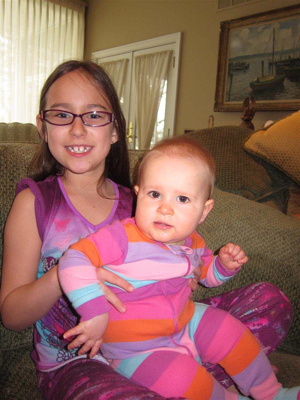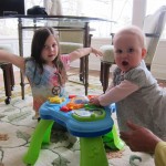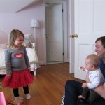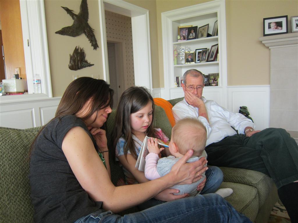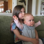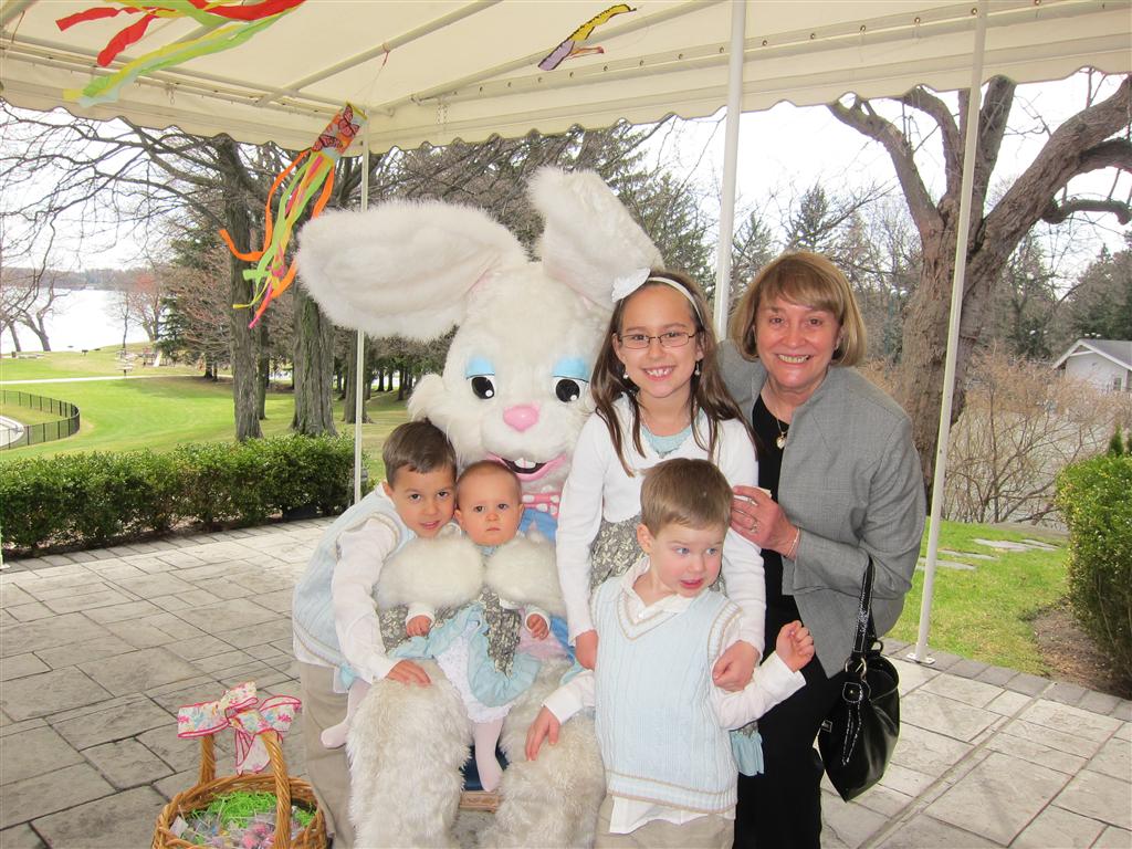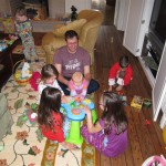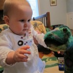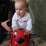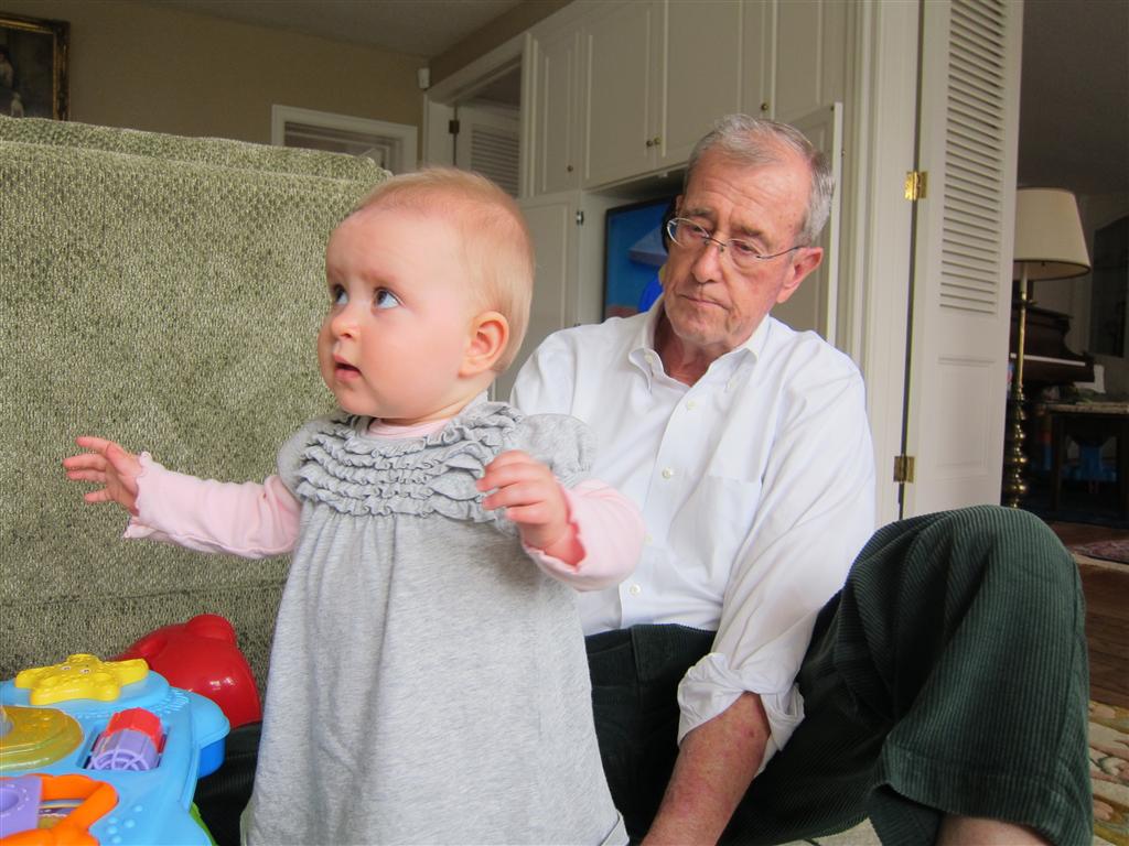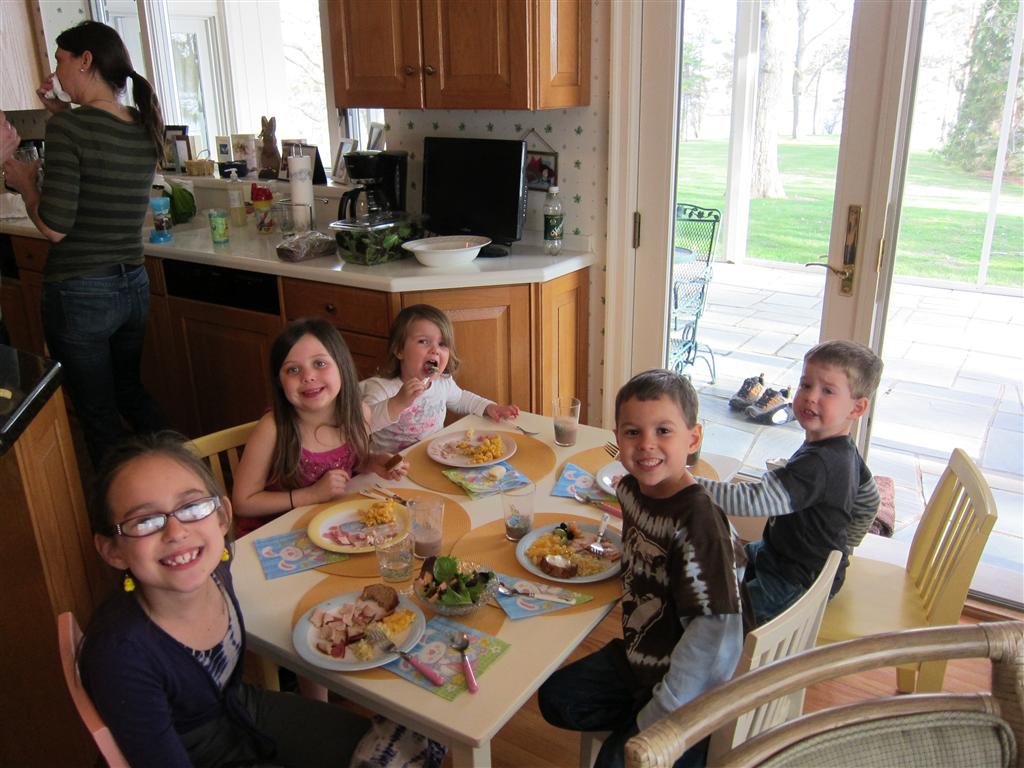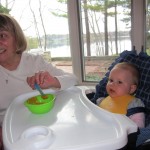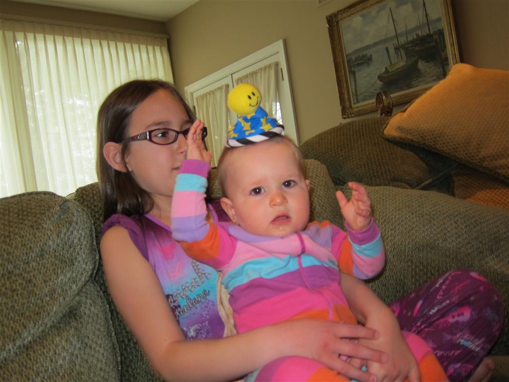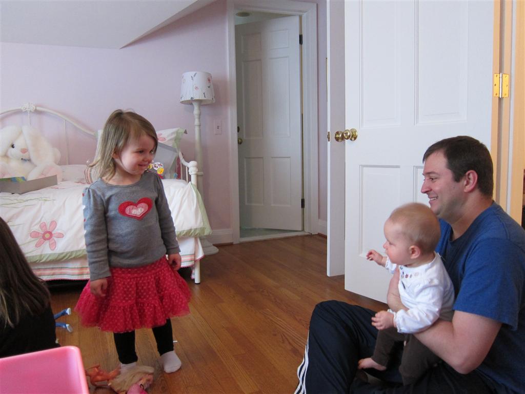 Eleanor spent her first Easter at Grandma and Grandpa’s house – and what a full house it was! Mackenzie, Jack, Ben, Mahlia and Brooke were all there too! She was super excited to meet Mahlia and Brooke for the first time – and Aunt Kristen and Uncle Michael too! Grandma and Grandpa had a standing table that was the perfect height for Eleanor – and she got lots of practice standing and even trying to pull herself up from sitting. She also got to try a ride-on toy for the first time, with mixed results. We need to work on the balance a bit more :) Eleanor did well with her first picture with the Easter Bunny – no crying but also no smiles. She also adjusted well to being one of six kids in the house – quite a change (and quite a lot more head rubbing) from the only child quiet of home. Oh yeah, and on Monday night Eleanor sat up all by herself in her crib! Time to lower the mattress again :)