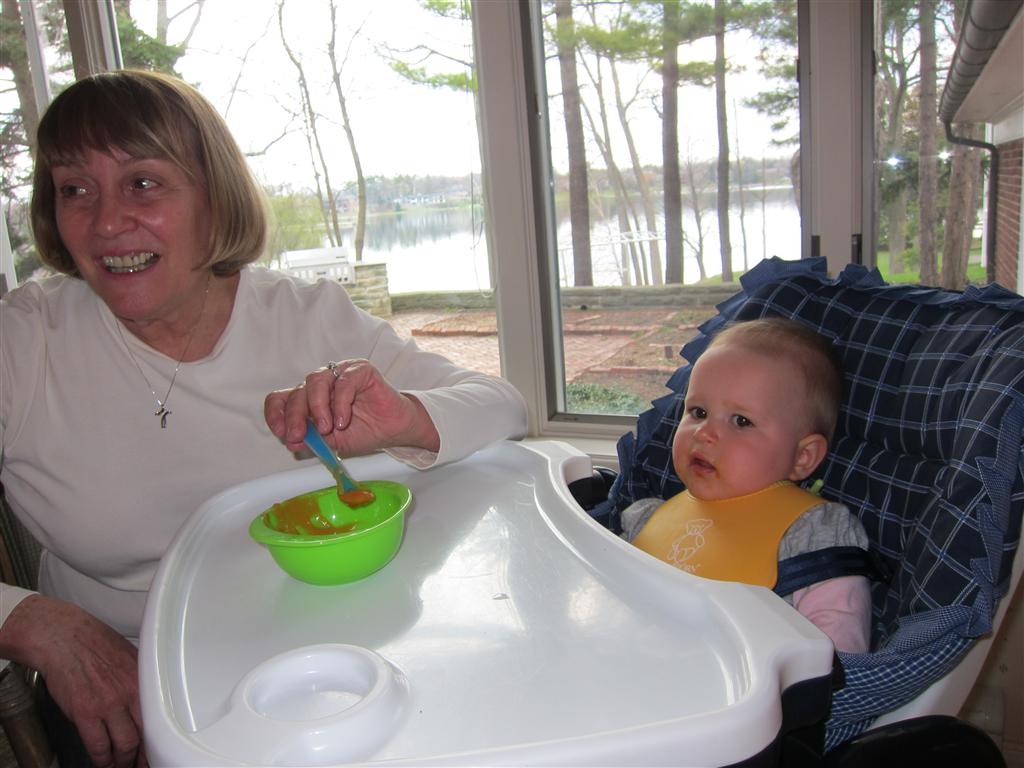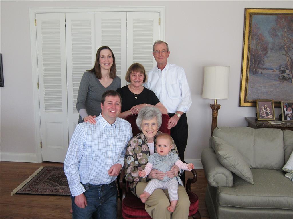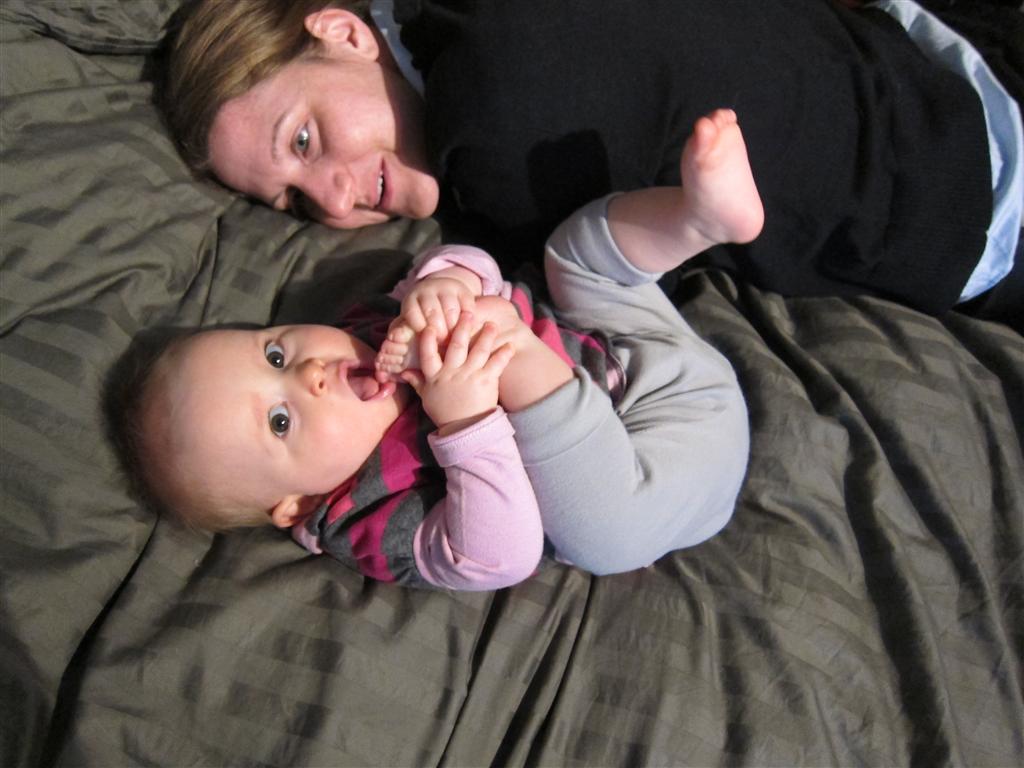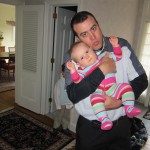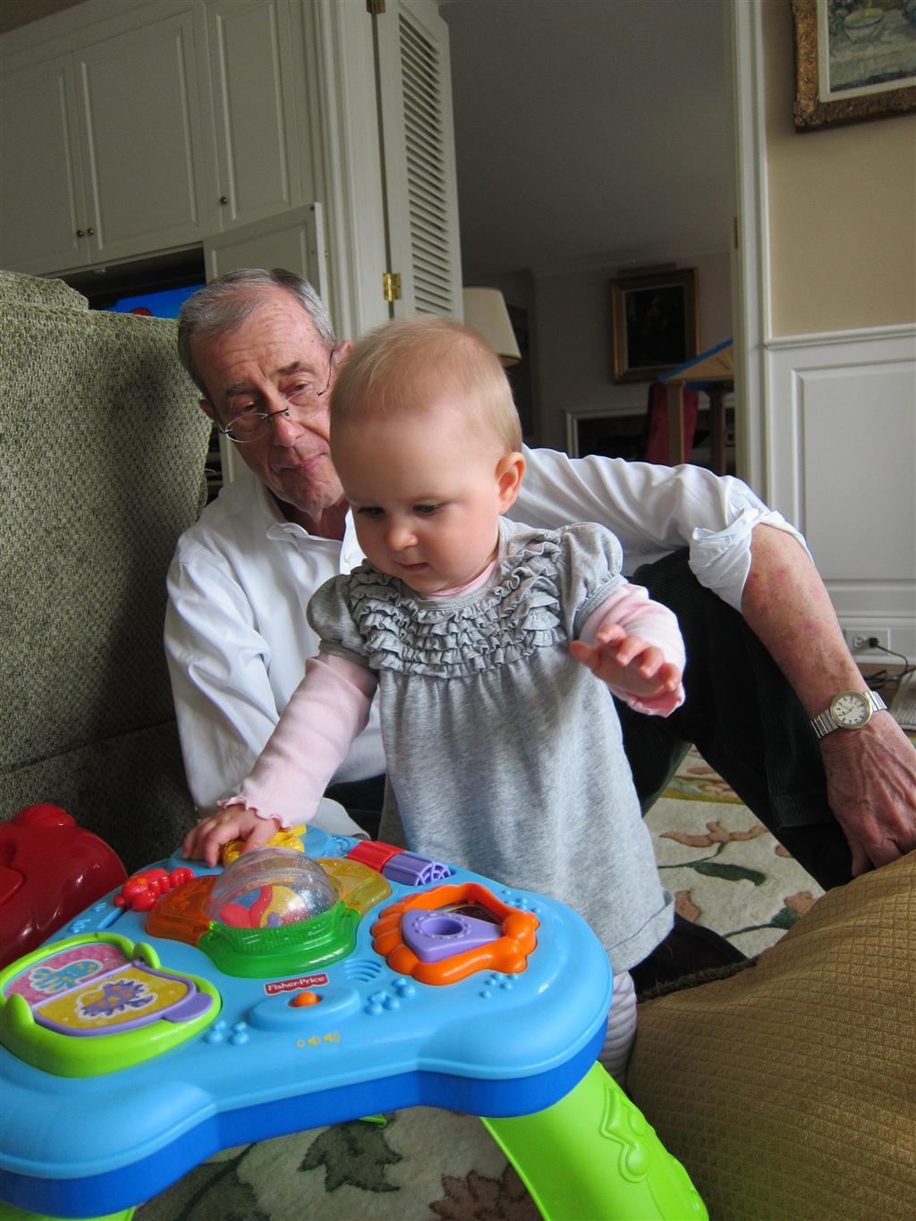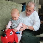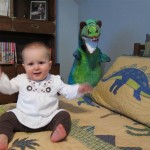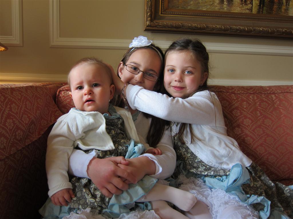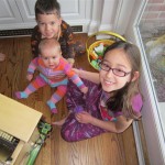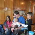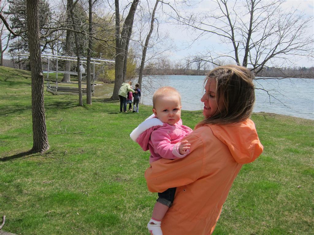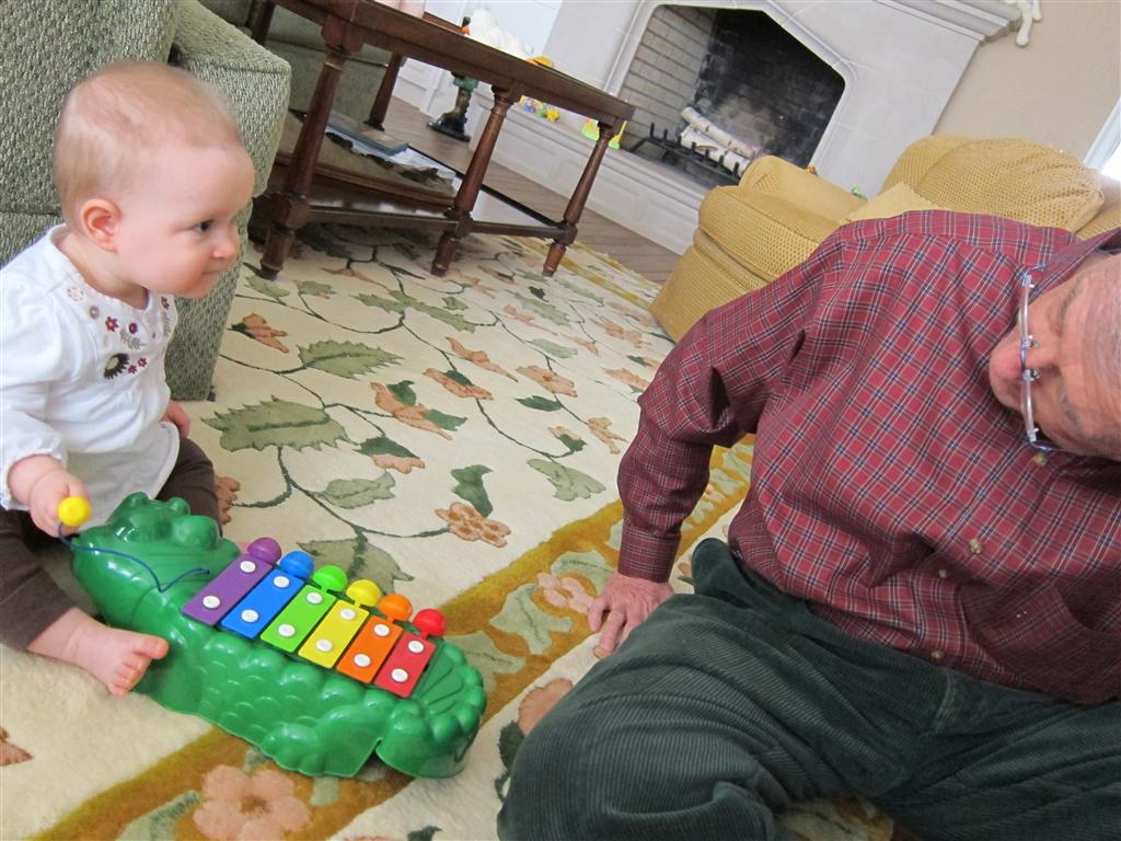 Eleanor spent her first Easter at Grandma and Grandpa’s house – and what a full house it was! Mackenzie, Jack, Ben, Mahlia and Brooke were all there too! She was super excited to meet Mahlia and Brooke for the first time – and Aunt Kristen and Uncle Michael too! Grandma and Grandpa had a standing table that was the perfect height for Eleanor – and she got lots of practice standing and even trying to pull herself up from sitting. She also got to try a ride-on toy for the first time, with mixed results. We need to work on the balance a bit more :) Eleanor did well with her first picture with the Easter Bunny – no crying but also no smiles. She also adjusted well to being one of six kids in the house – quite a change (and quite a lot more head rubbing) from the only child quiet of home. Oh yeah, and on Monday night Eleanor sat up all by herself in her crib! Time to lower the mattress again :)