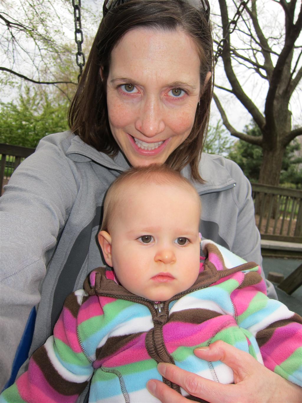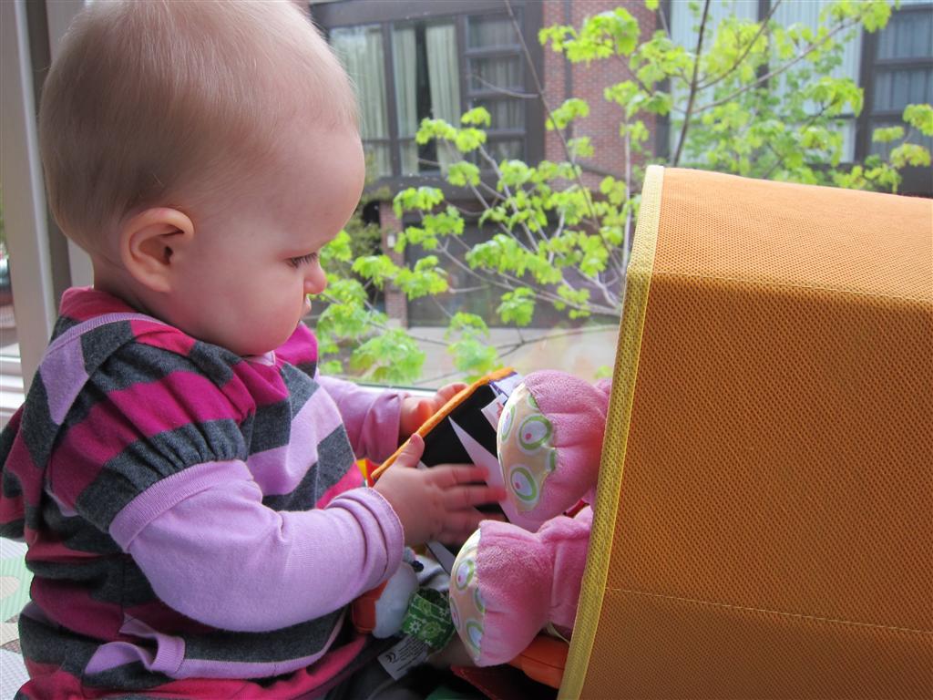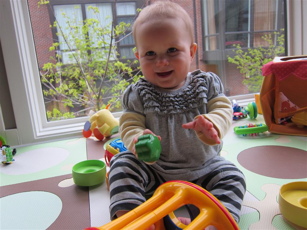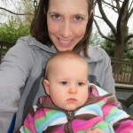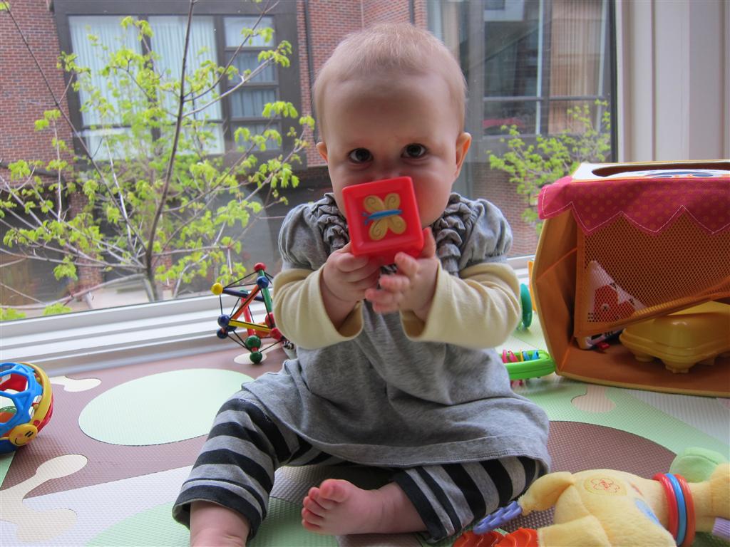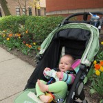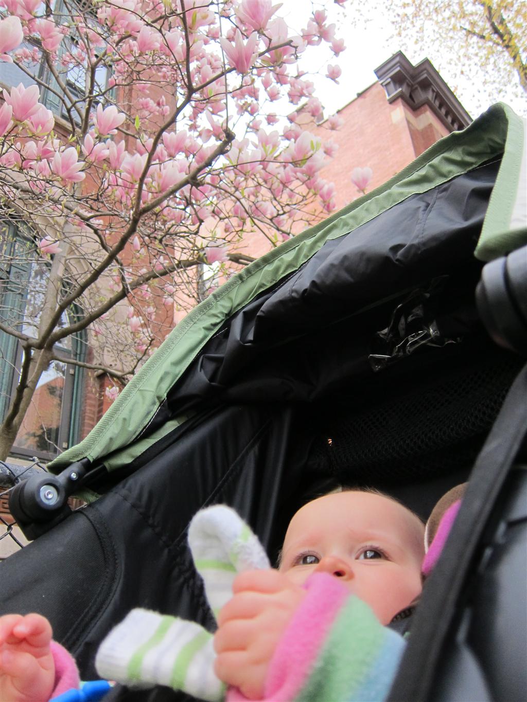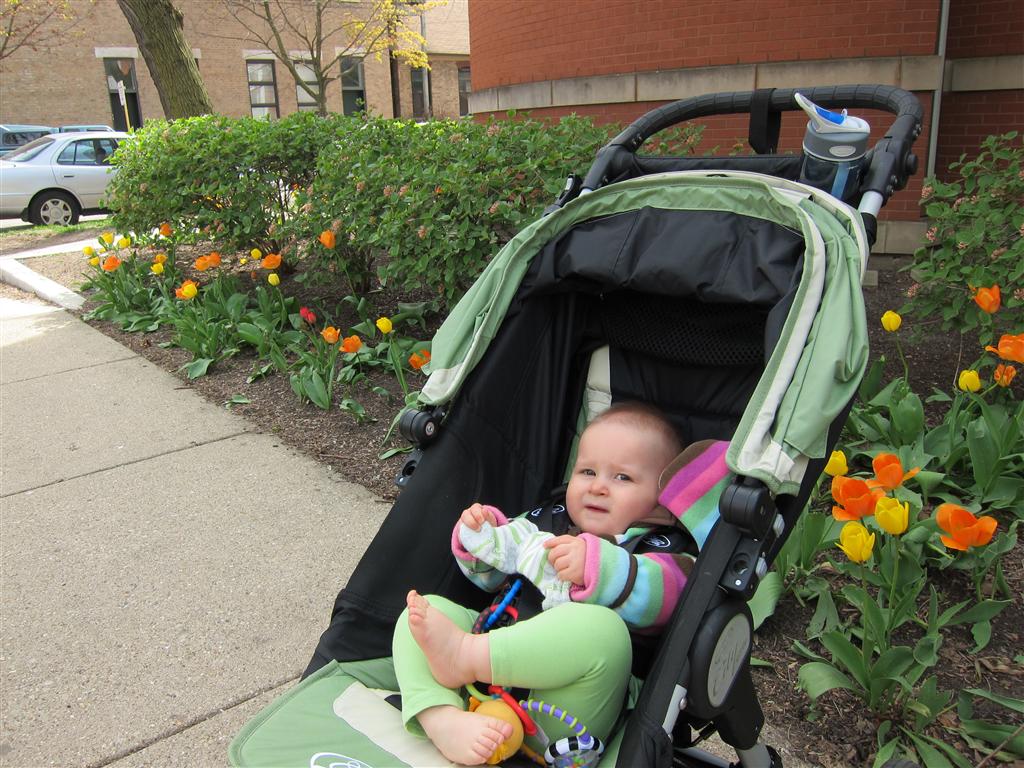 Eleanor turned 9 months this week – and got her first tastes of spring. With the weather finally turning warm, she was out on the town, visiting some local parks, trying out the swings, and taking in the neighborhood flowers. She discovered grass for the first time – and it received only a passing interest. Eleanor also celebrated her first Cinco de Mayo with lunch at a local Mexican restaurant (unfortunately they didn’t have pureed spinach, pears and peas in taco form on the menu). Eleanor’s main focus during the week was working on perfecting her standing up – along with developing a surprising loud raspberry bubble that I’m pretty sure Aunt Lary taught her. On saturday she was tormented by a tasty looking carrot cupcake just out of reach, and on Sunday she celebrated Mother’s Day with some flowers and quality mommy time.