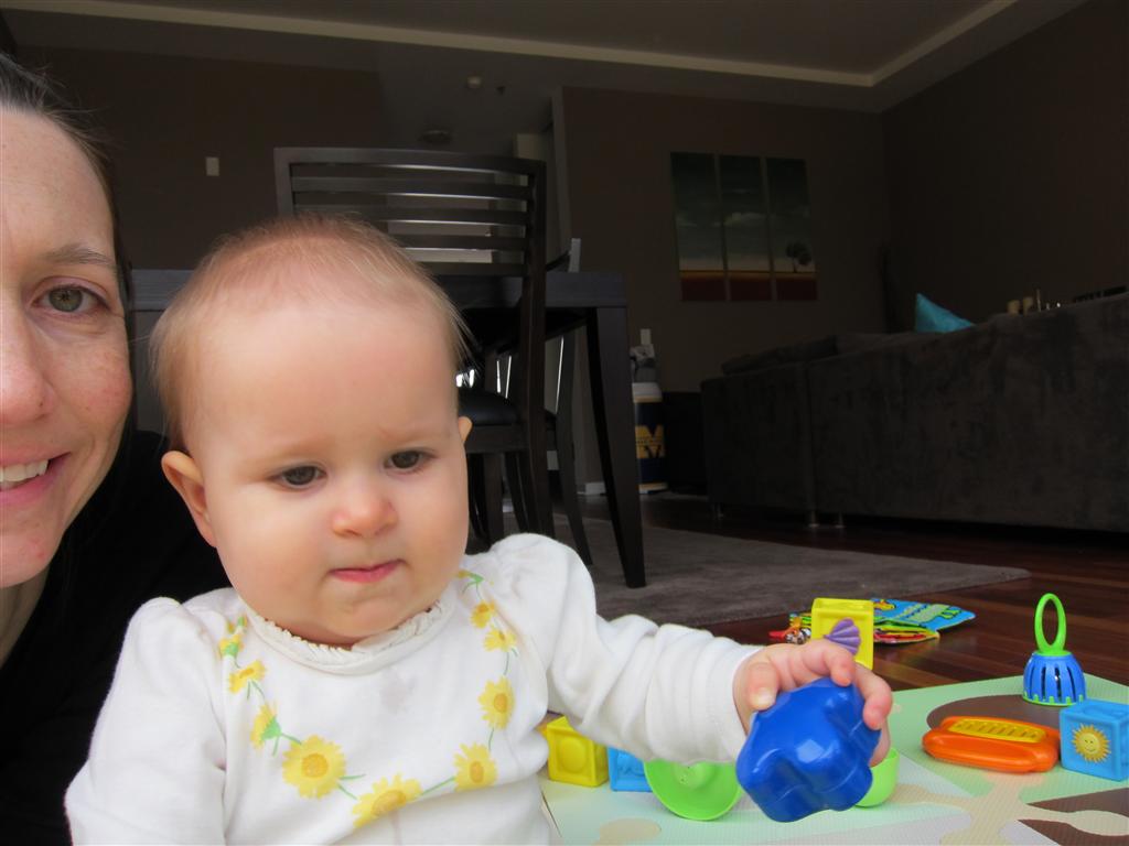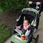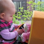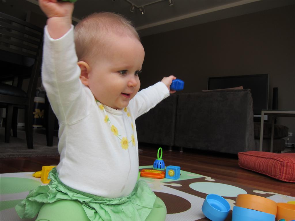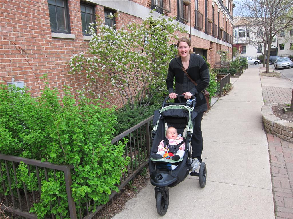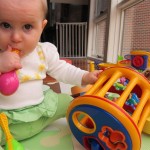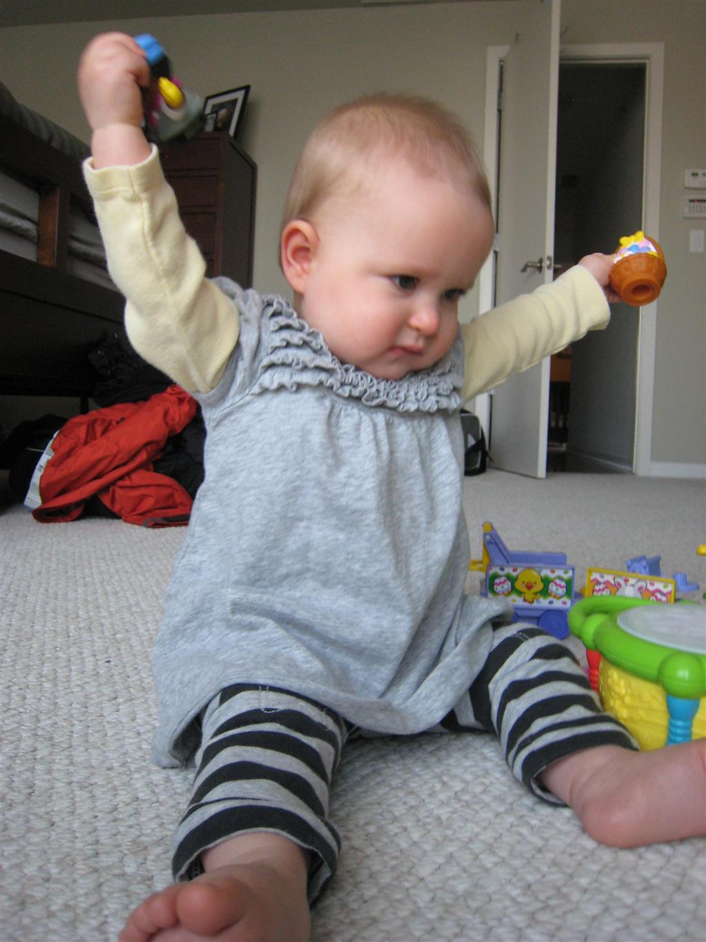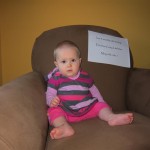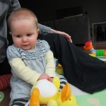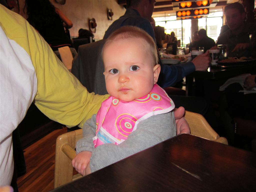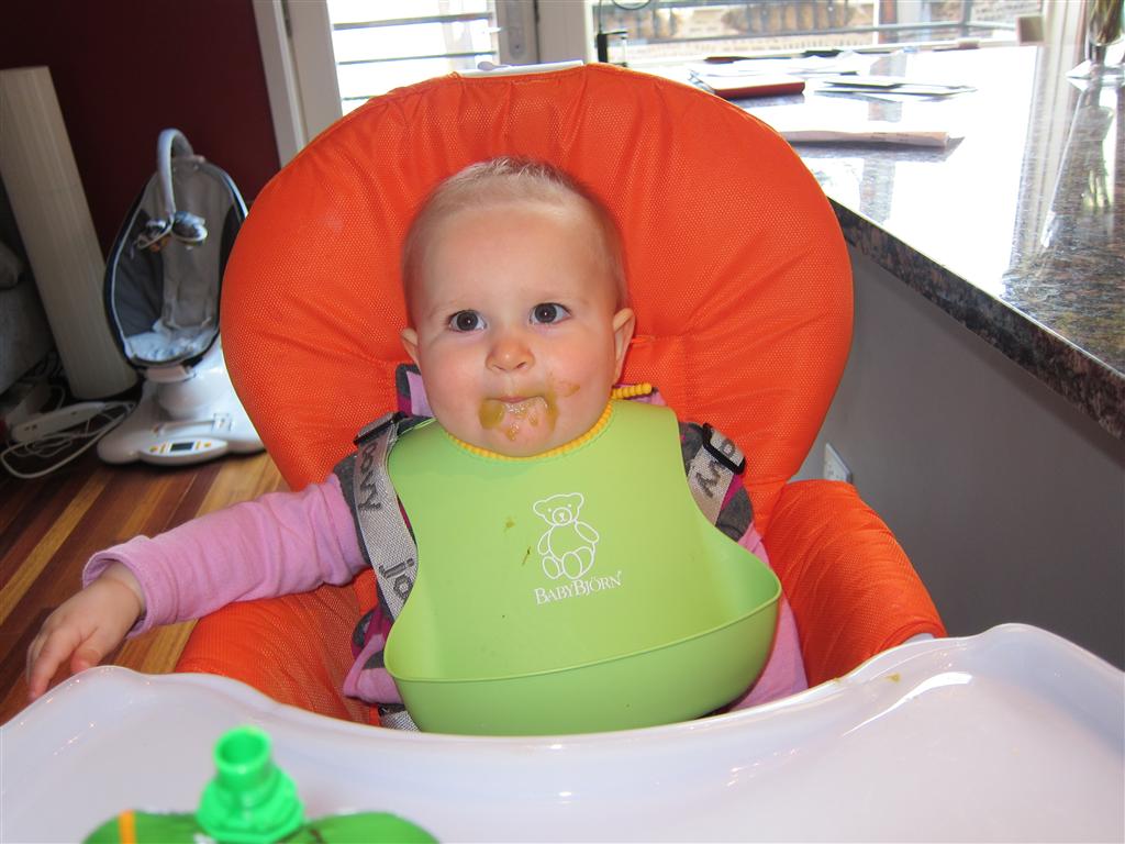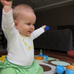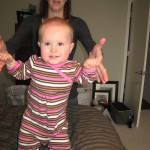 Eleanor turned 9 months this week – and got her first tastes of spring. With the weather finally turning warm, she was out on the town, visiting some local parks, trying out the swings, and taking in the neighborhood flowers. She discovered grass for the first time – and it received only a passing interest. Eleanor also celebrated her first Cinco de Mayo with lunch at a local Mexican restaurant (unfortunately they didn’t have pureed spinach, pears and peas in taco form on the menu). Eleanor’s main focus during the week was working on perfecting her standing up – along with developing a surprising loud raspberry bubble that I’m pretty sure Aunt Lary taught her. On saturday she was tormented by a tasty looking carrot cupcake just out of reach, and on Sunday she celebrated Mother’s Day with some flowers and quality mommy time.