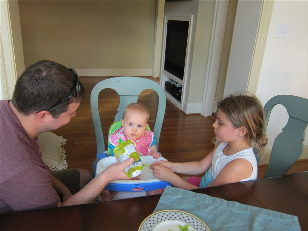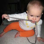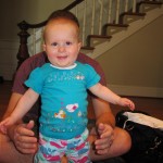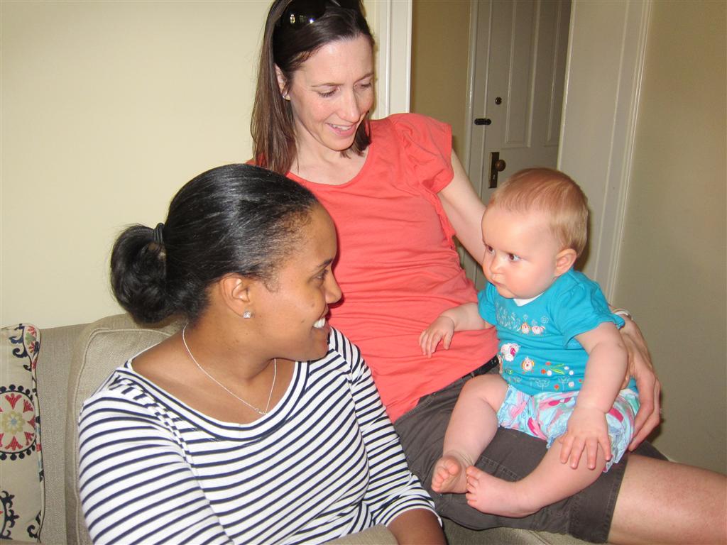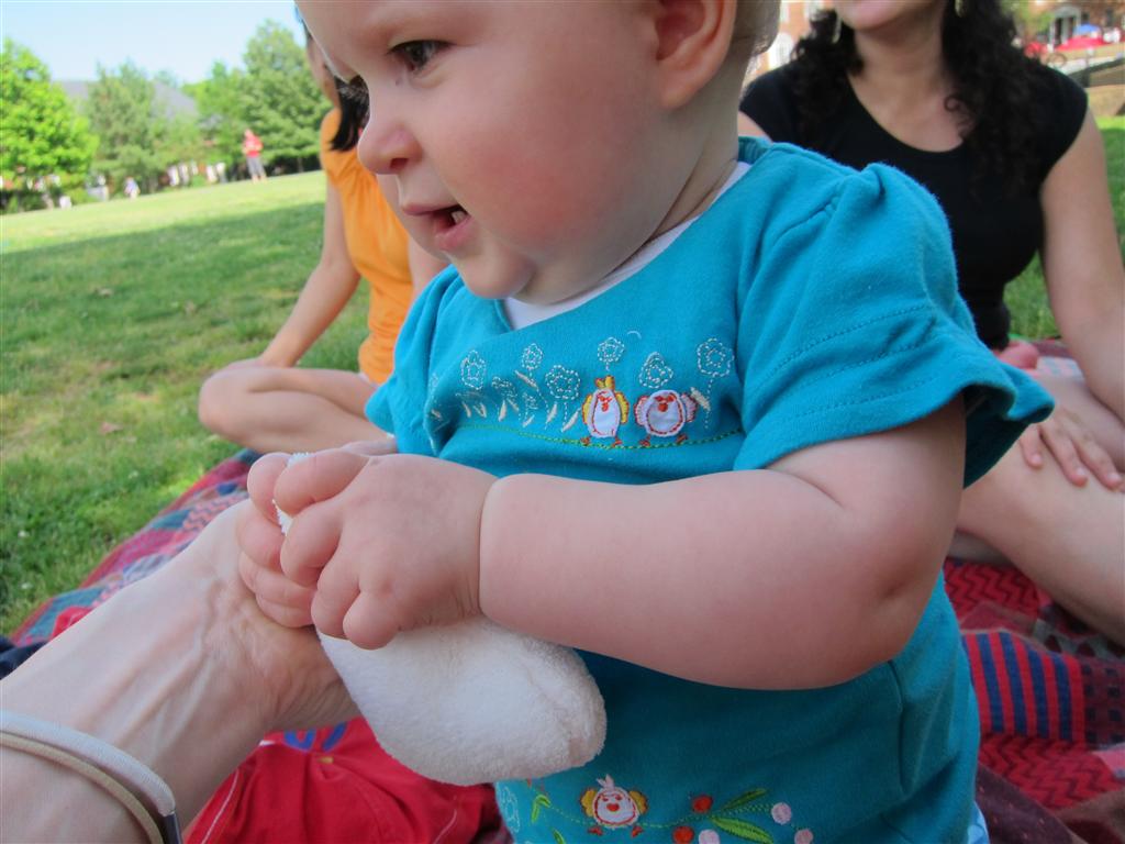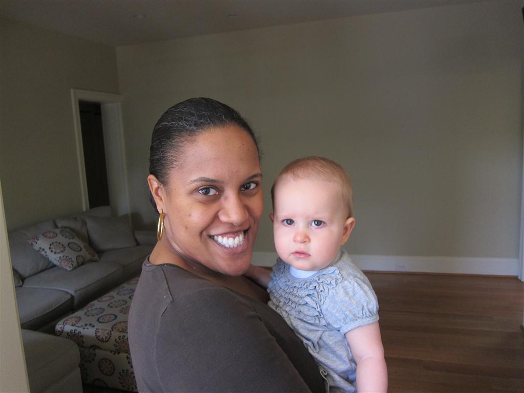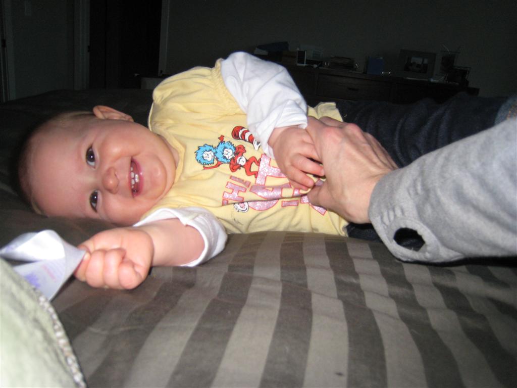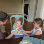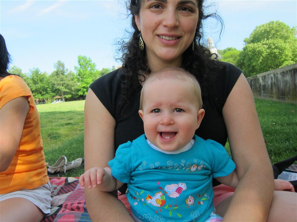 Eleanor took a trip to D.C. this weekend to visit some old friends (well, Amy’s old friends, anyway. Ellie isn’t really old enough to have old friends yet). She did great on the airplane both ways – and it was her first time travelling with her new (larger) car seat. It leaves less room for Dad in the seat next to her, but it keeps her snug and comfy. She even zoomed through the airport with the attachable wheels (unfortunately not pictured). Along with meeting her D.C. “cousins”, Eleanor had a number of firsts this week: