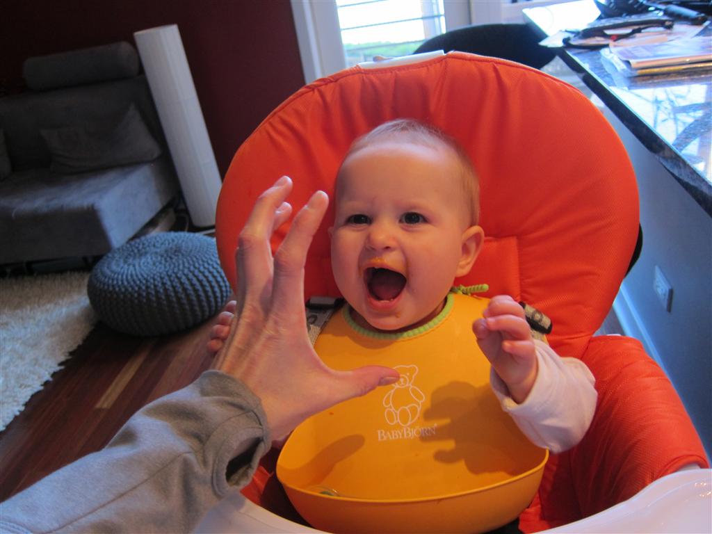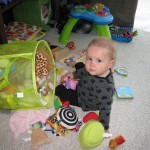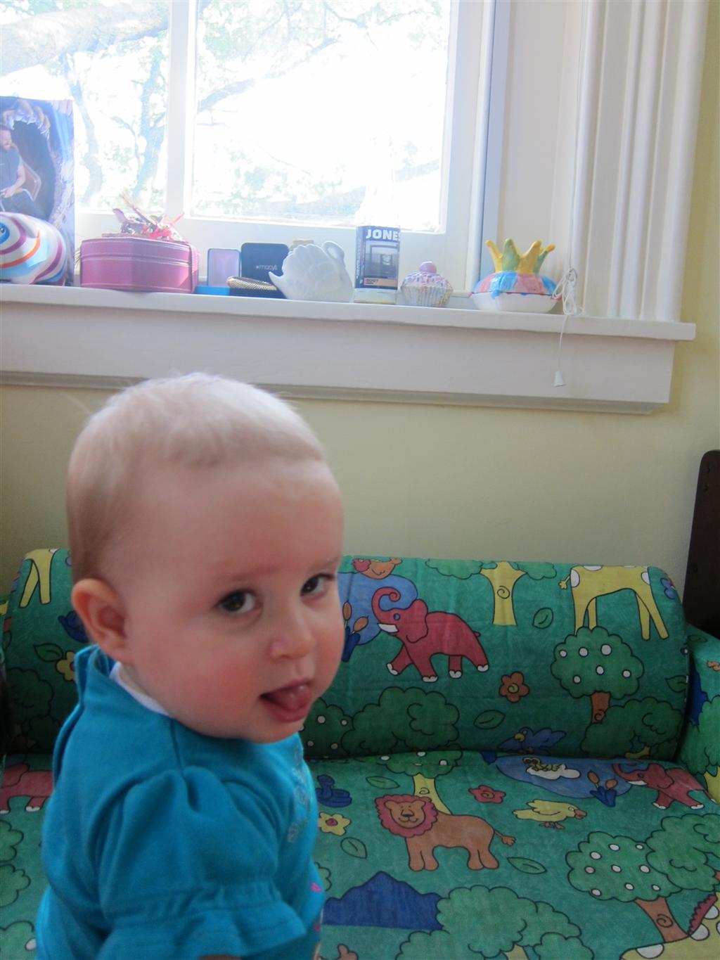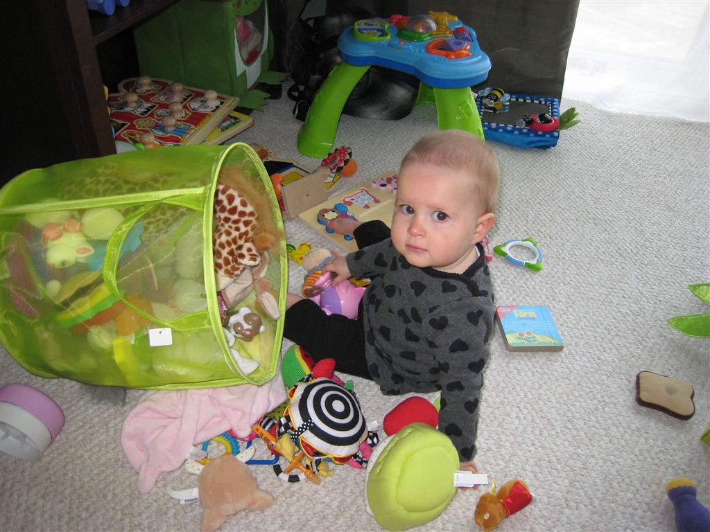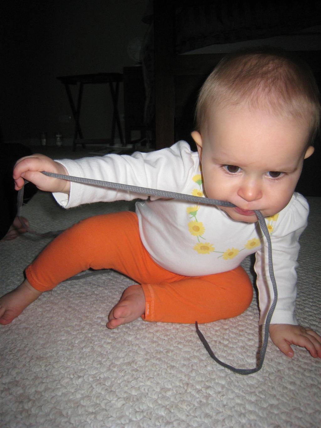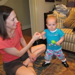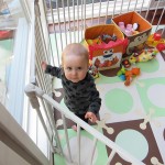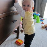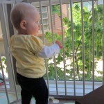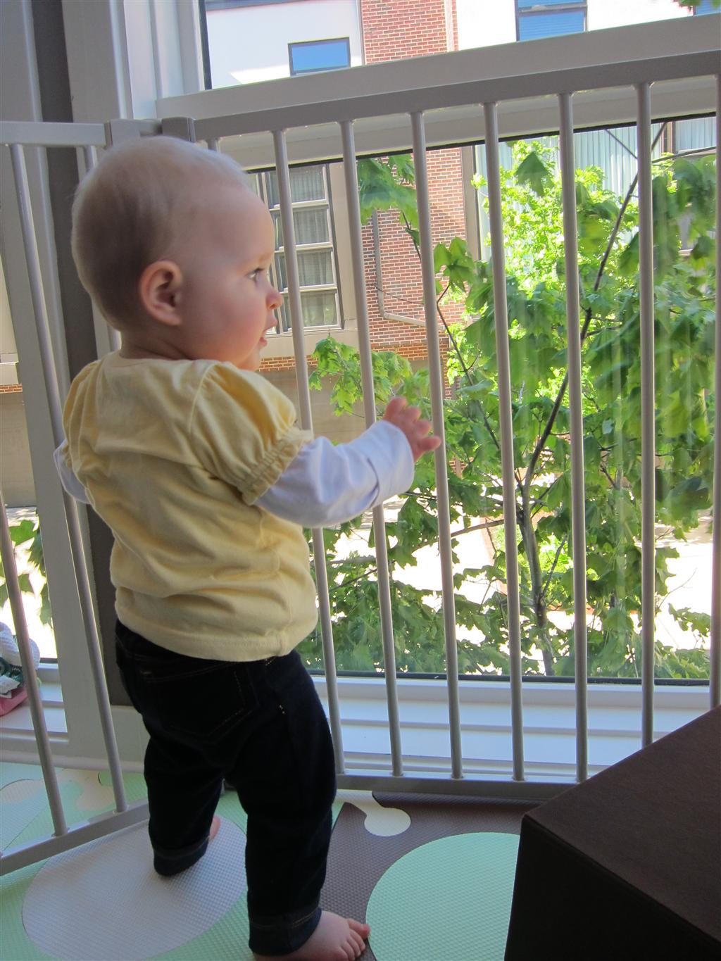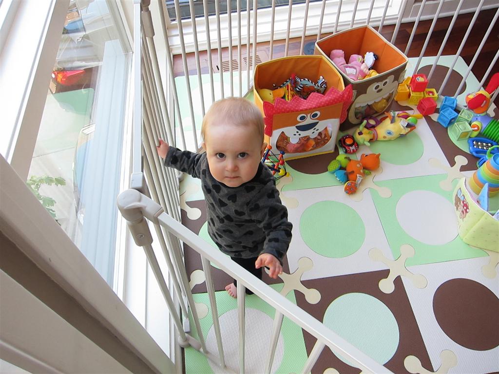 Eleanor’s crawling and standing continues to improve – so much so that we had to set up some gates in the front window to keep her contained. While it may look like a mini jail, she is perfectly happy inside, and in fact really appreciates the additional hand holds for standing. Strangely enough, the cat also enjoys being inside the gates….
