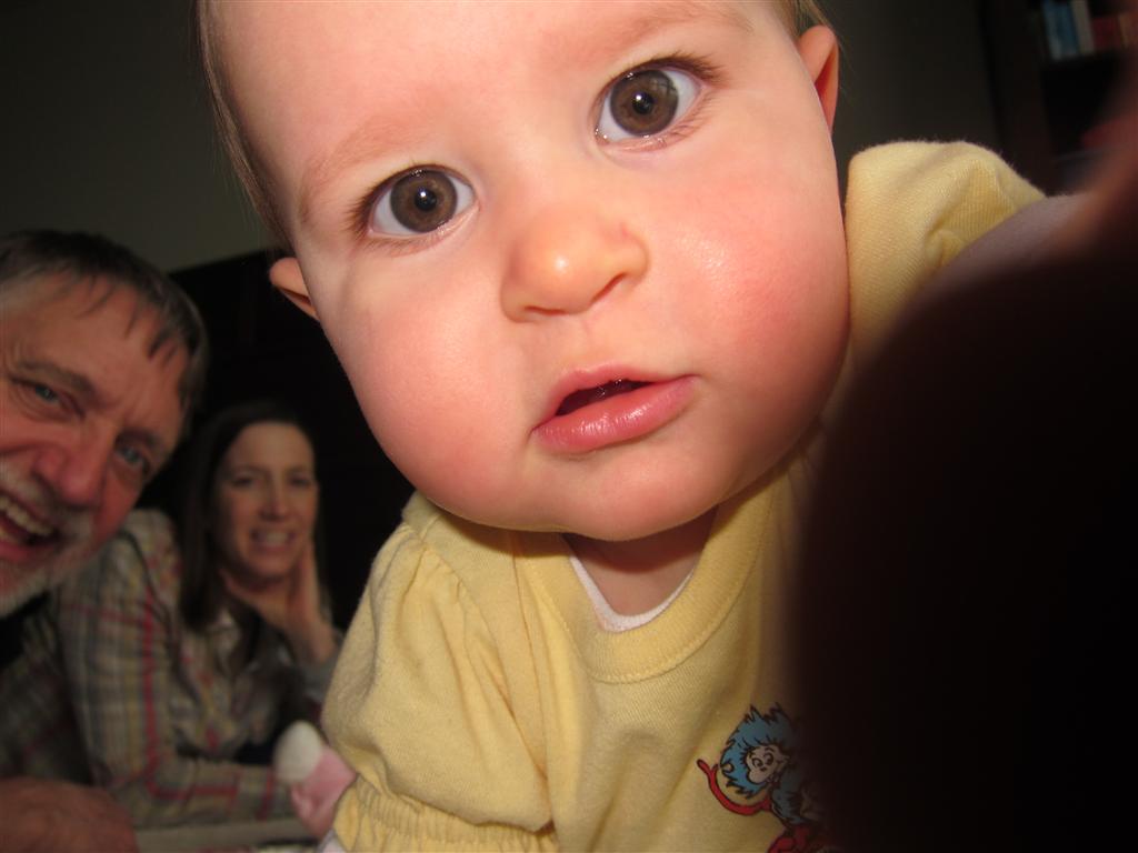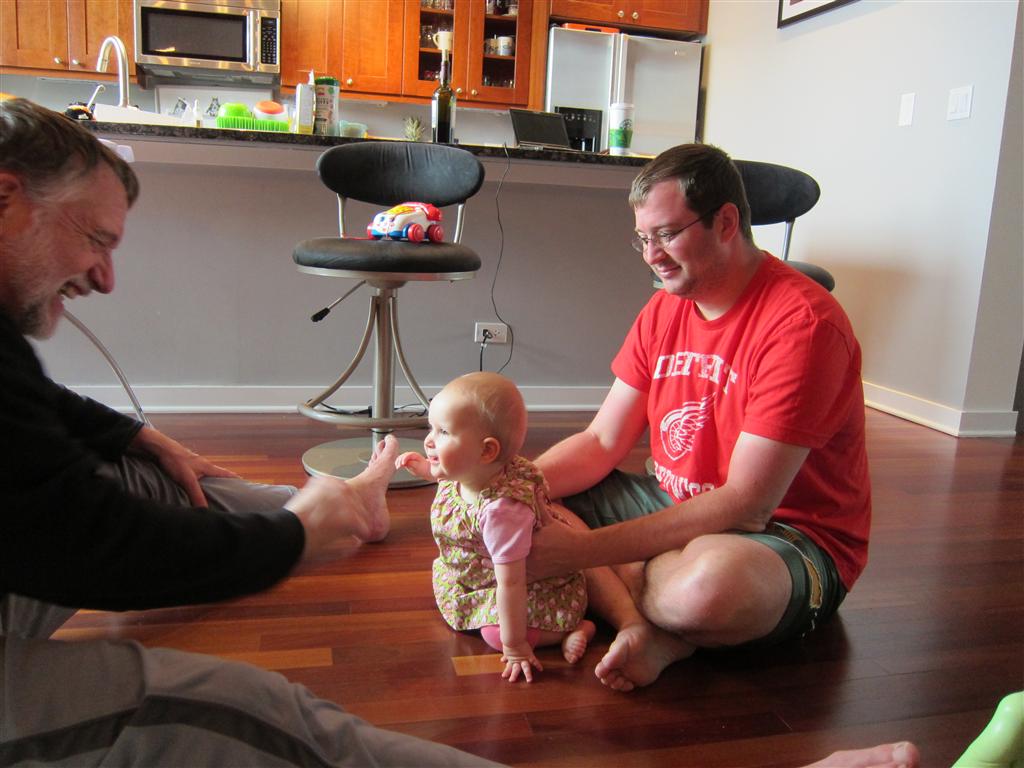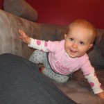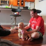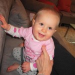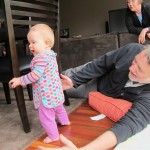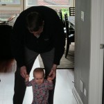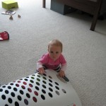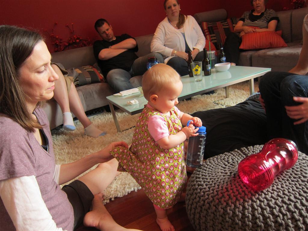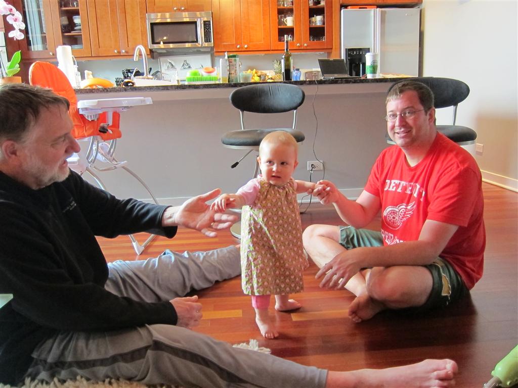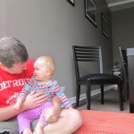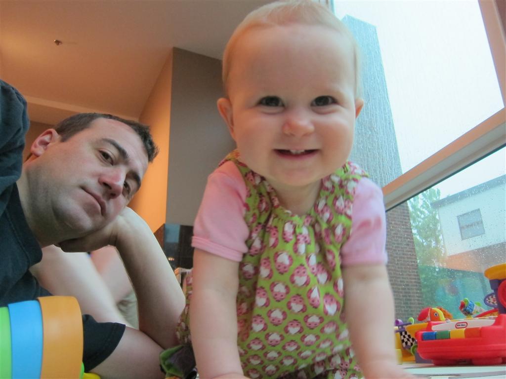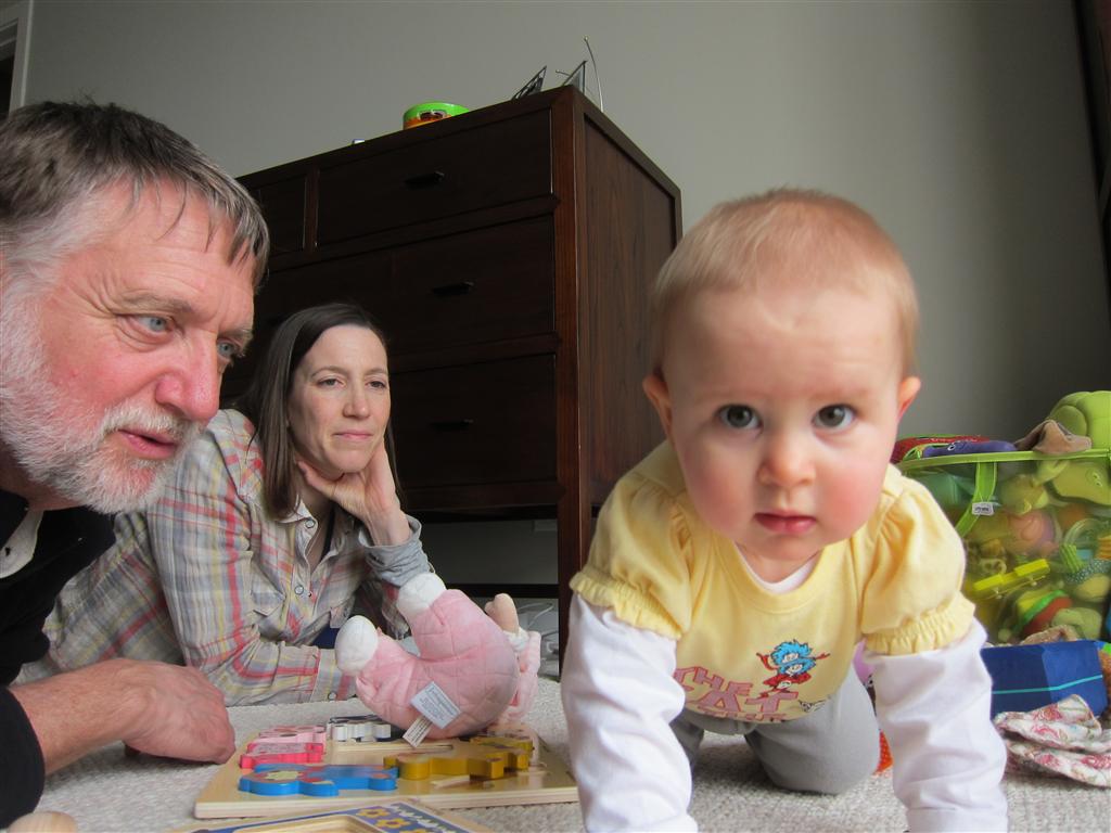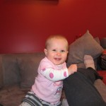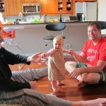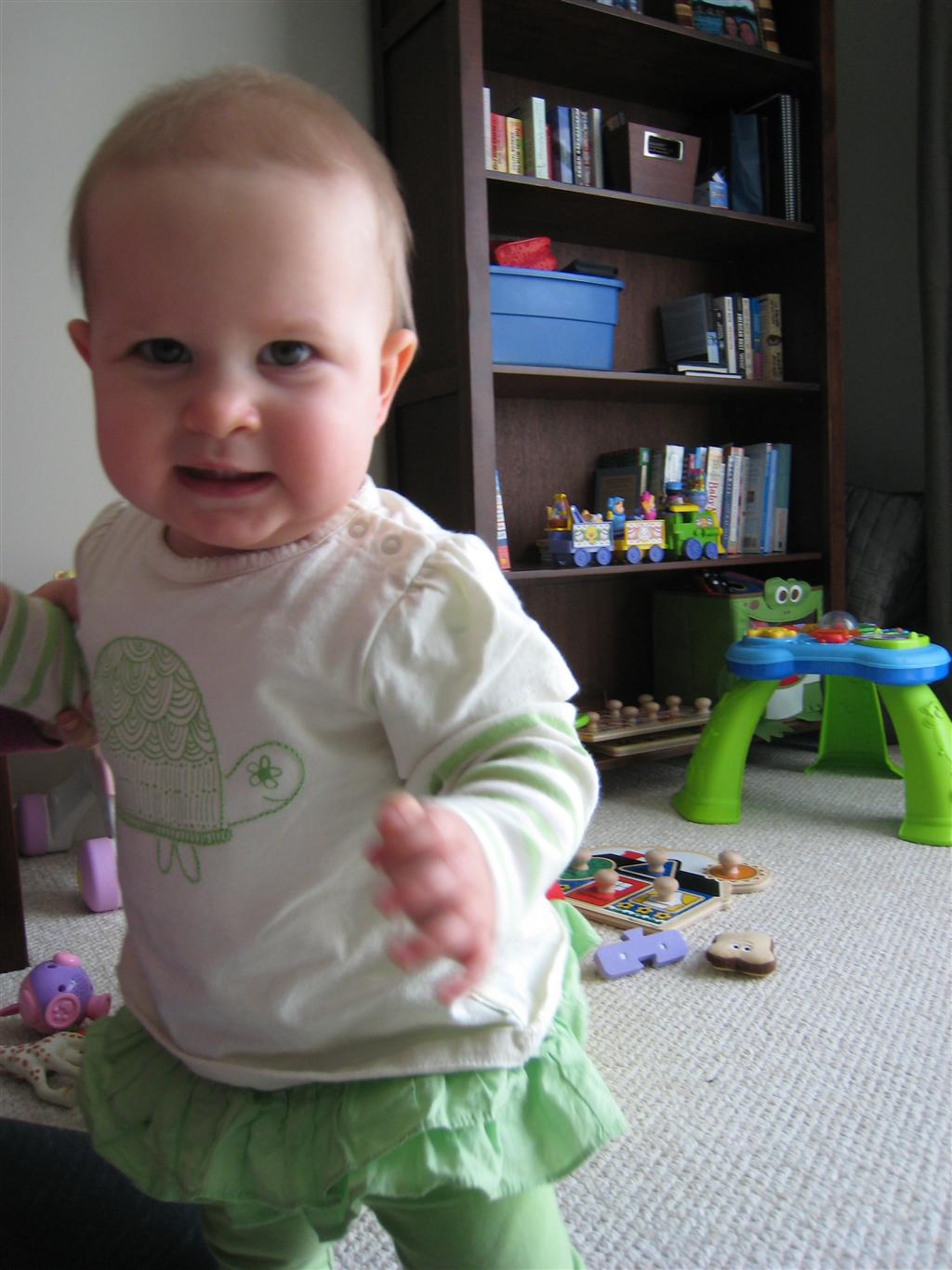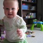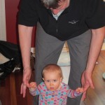 It was a fun packed week with lots of visitors at Eleanor’s house.  Early in the week, we were practicing our standing and crawling.  Zapa has to be increasingly on her toes to as Eleanor’s reach and quickness both increase.  Papa and Mimi arrived on thursday night, and Eleanor had lots of fun playing with them all weekend.  There were lots of smiles, lots of meals, and lots of standing.   Unfortunately, the weather didn’t cooperate, so we didn’t get outside much.  In fact, Dad had to cook the burgers and shish kabobs under cover of an umbrella on Sunday, when Uncle B, Breanne, Tia and Jay came over.   As if all that excitement wasn’t enough, a new tooth also popped through this week, a bottom tooth on the left side, tooth number seven in all.  On the sad side, Eleanor had her first painful diaper rash this week as well – which put a little damper on Saturday’s fun – poor thing.