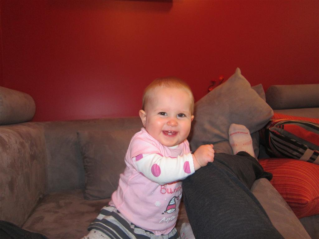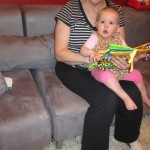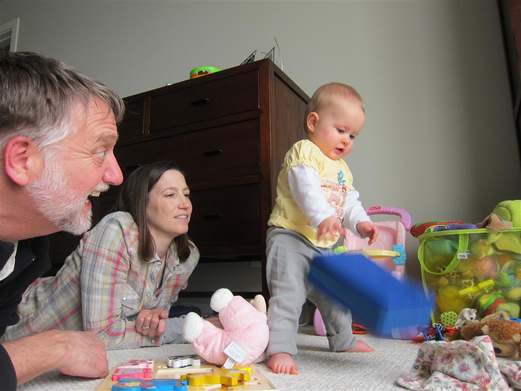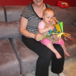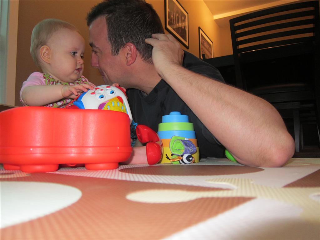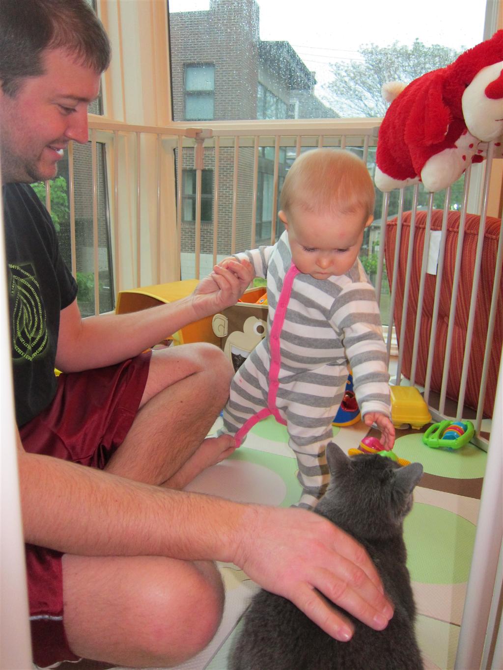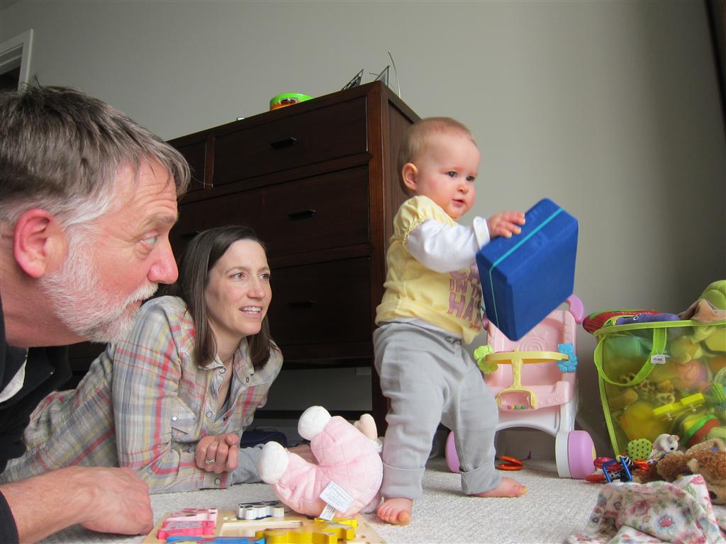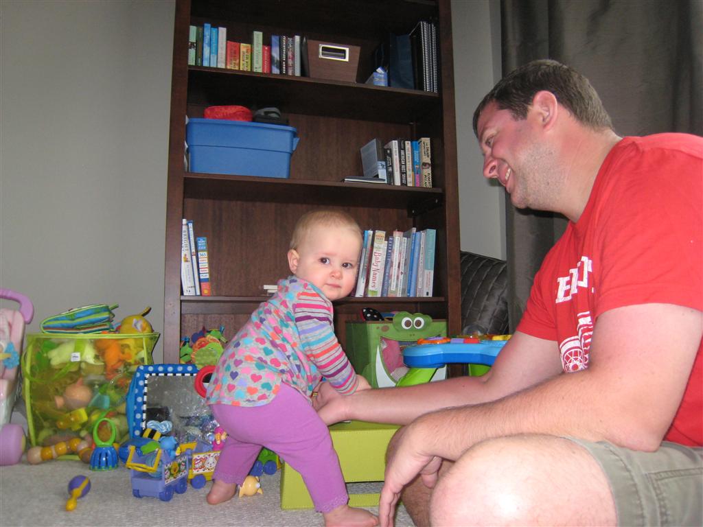 It was a fun packed week with lots of visitors at Eleanor’s house.  Early in the week, we were practicing our standing and crawling.  Zapa has to be increasingly on her toes to as Eleanor’s reach and quickness both increase.  Papa and Mimi arrived on thursday night, and Eleanor had lots of fun playing with them all weekend.  There were lots of smiles, lots of meals, and lots of standing.   Unfortunately, the weather didn’t cooperate, so we didn’t get outside much.  In fact, Dad had to cook the burgers and shish kabobs under cover of an umbrella on Sunday, when Uncle B, Breanne, Tia and Jay came over.   As if all that excitement wasn’t enough, a new tooth also popped through this week, a bottom tooth on the left side, tooth number seven in all.  On the sad side, Eleanor had her first painful diaper rash this week as well – which put a little damper on Saturday’s fun – poor thing.