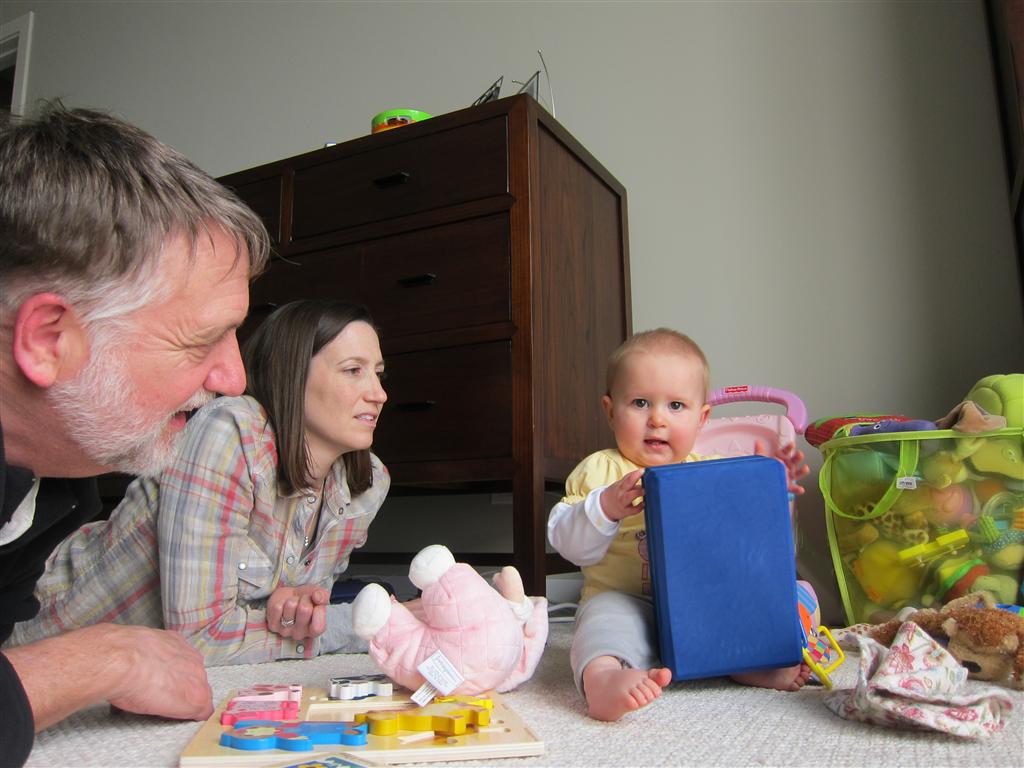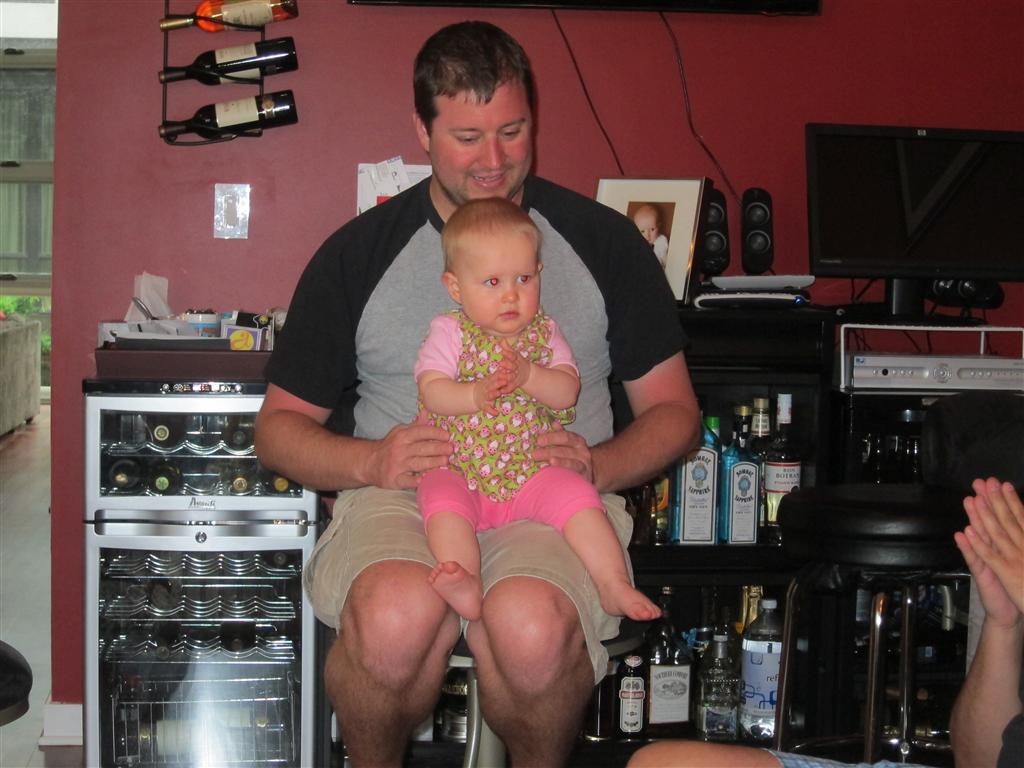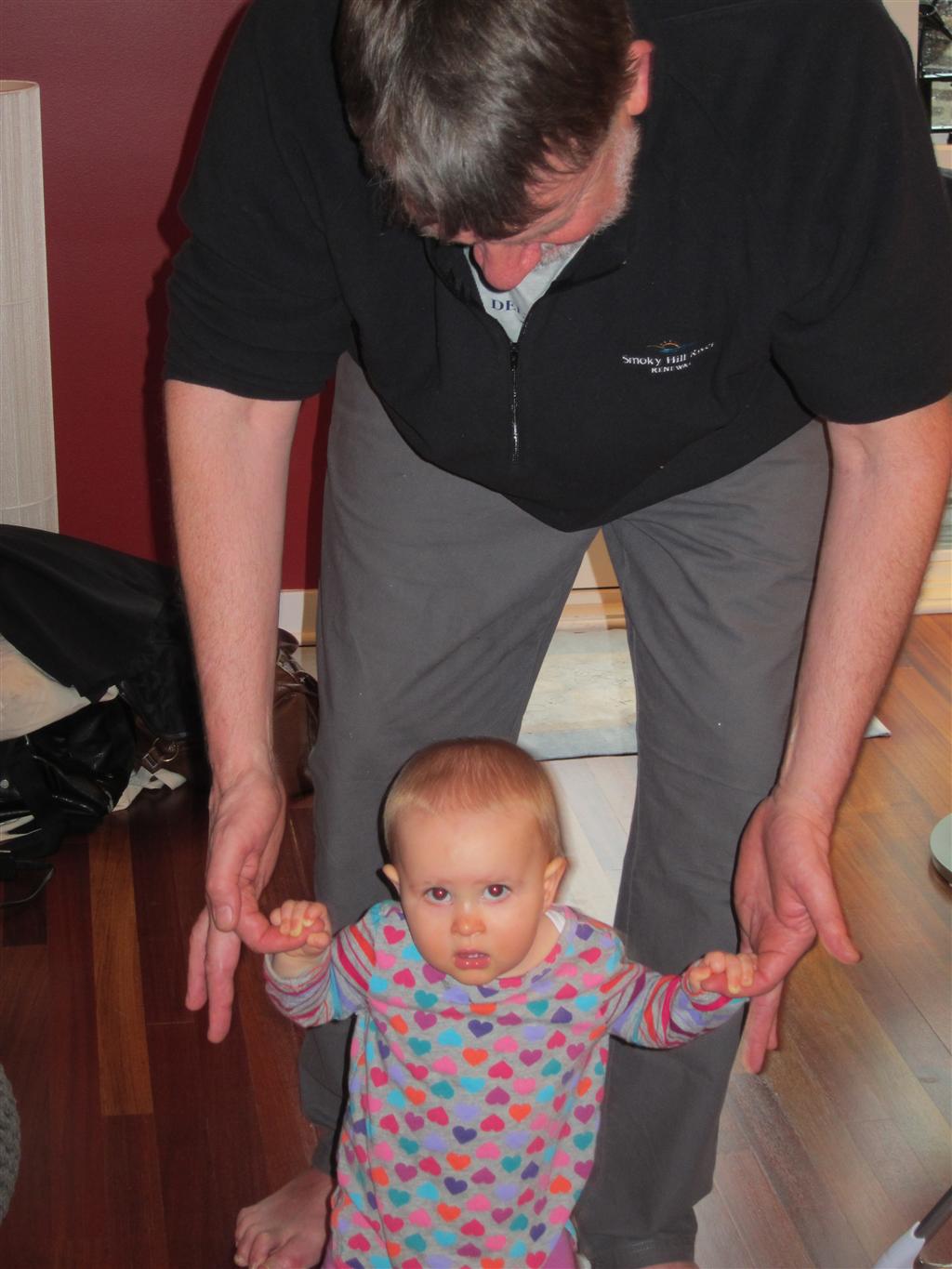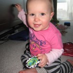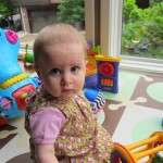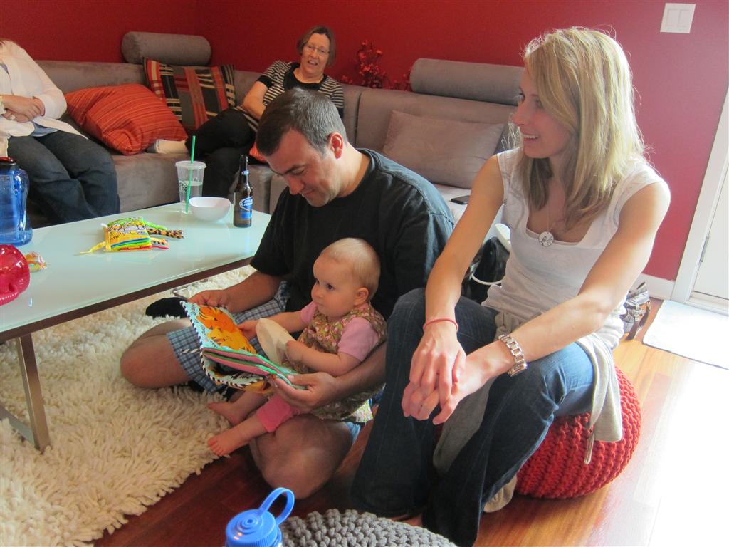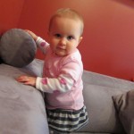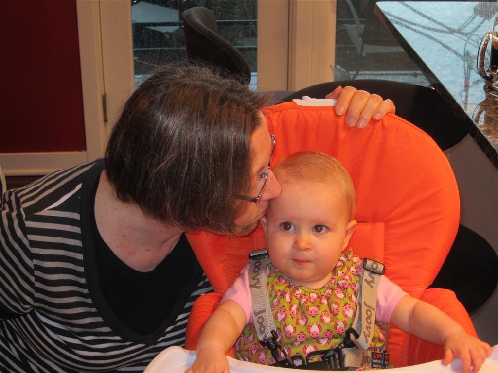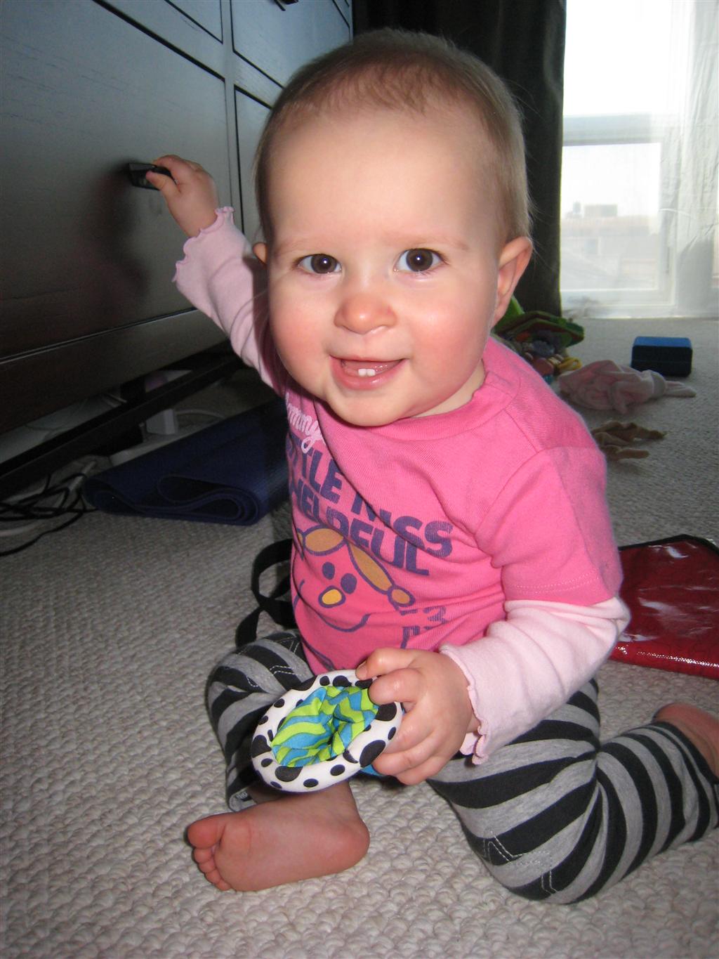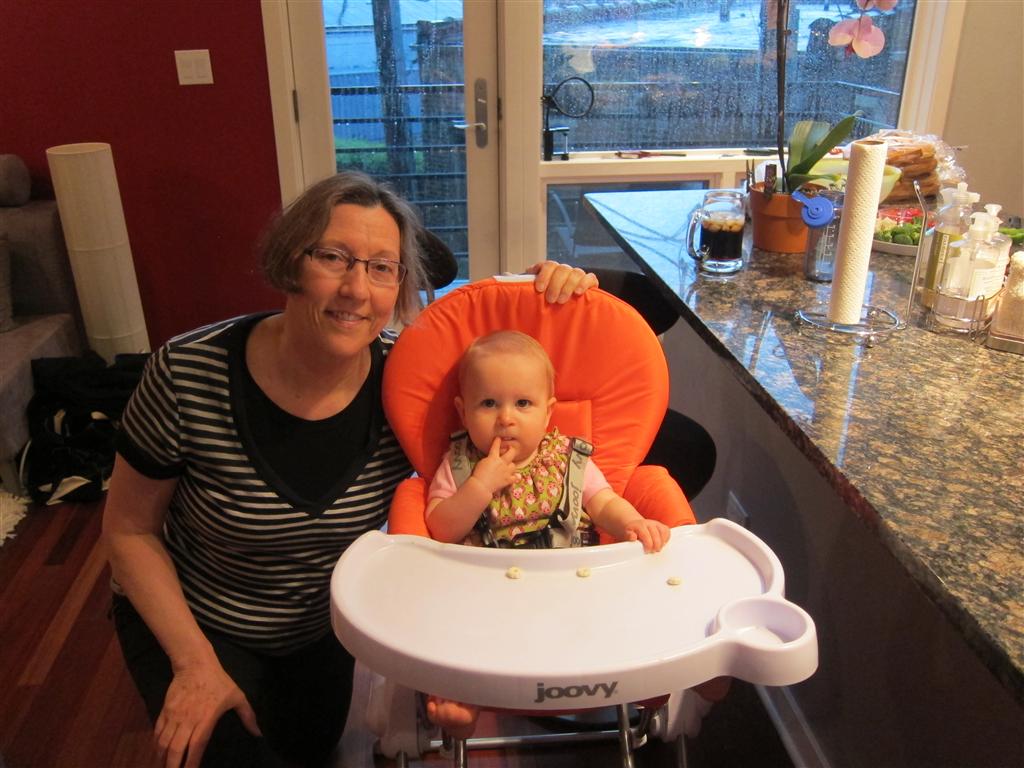 It was a fun packed week with lots of visitors at Eleanor’s house.  Early in the week, we were practicing our standing and crawling.  Zapa has to be increasingly on her toes to as Eleanor’s reach and quickness both increase.  Papa and Mimi arrived on thursday night, and Eleanor had lots of fun playing with them all weekend.  There were lots of smiles, lots of meals, and lots of standing.   Unfortunately, the weather didn’t cooperate, so we didn’t get outside much.  In fact, Dad had to cook the burgers and shish kabobs under cover of an umbrella on Sunday, when Uncle B, Breanne, Tia and Jay came over.   As if all that excitement wasn’t enough, a new tooth also popped through this week, a bottom tooth on the left side, tooth number seven in all.  On the sad side, Eleanor had her first painful diaper rash this week as well – which put a little damper on Saturday’s fun – poor thing.