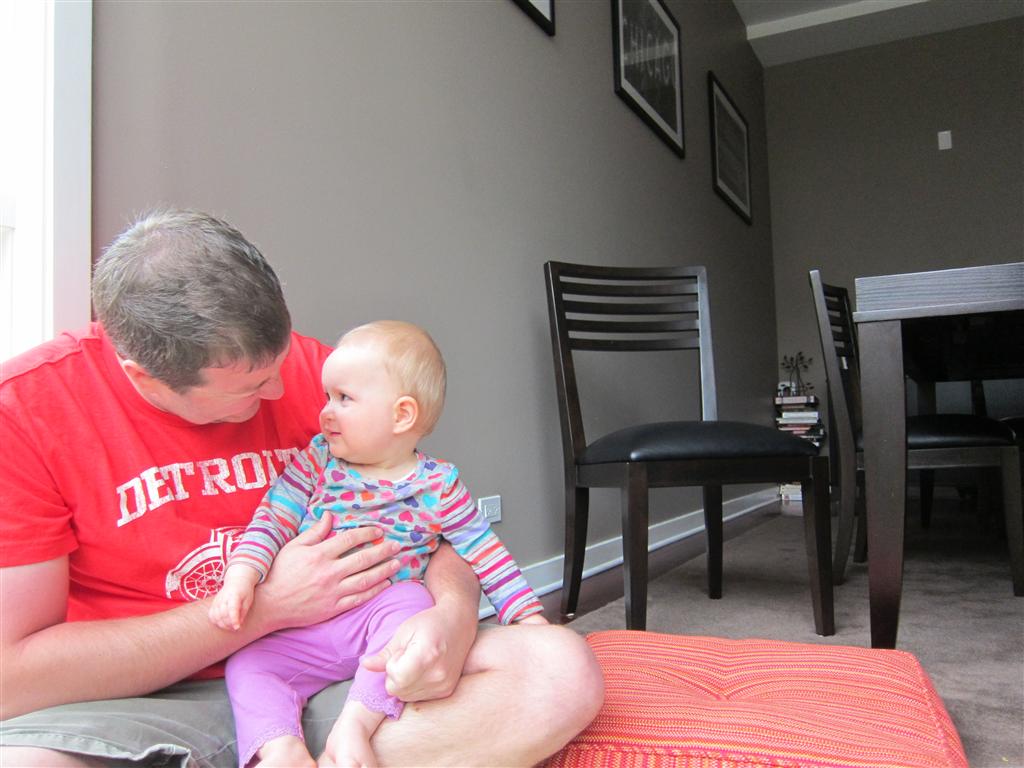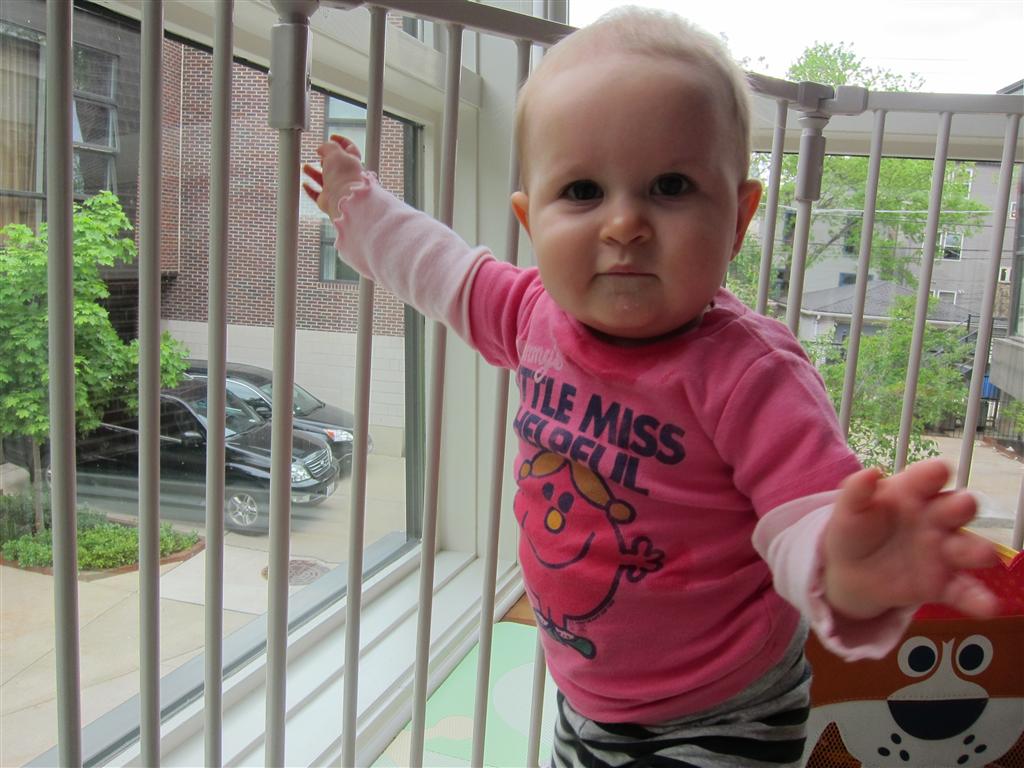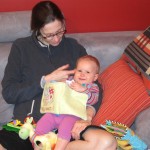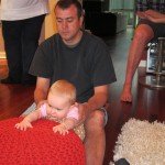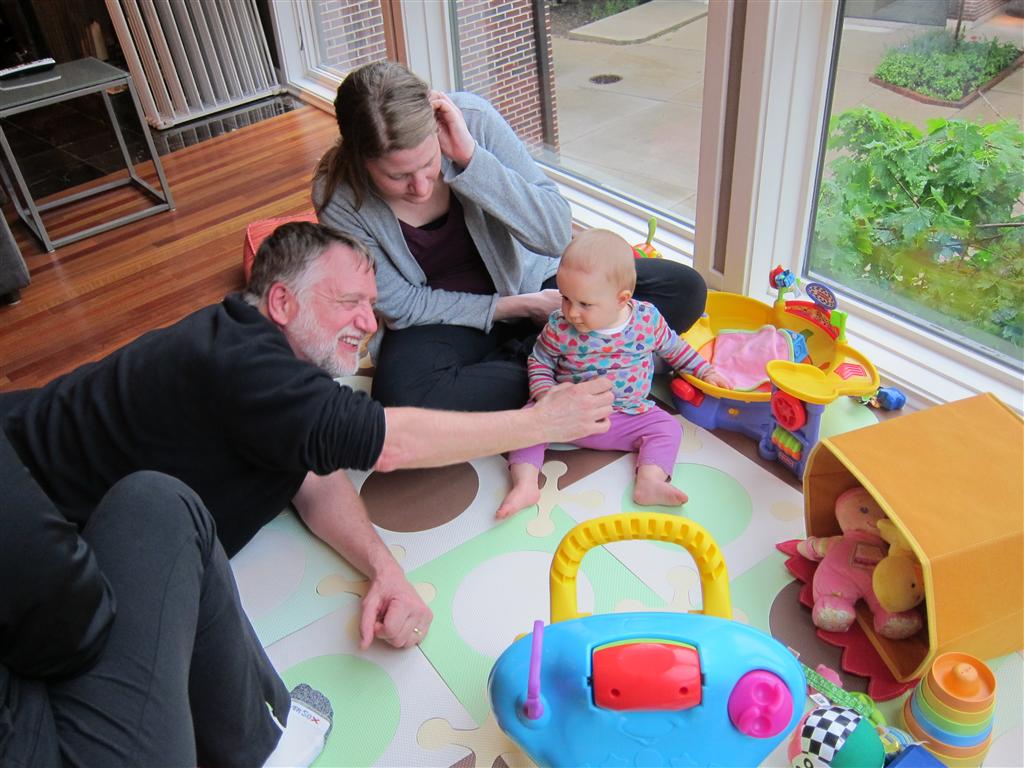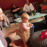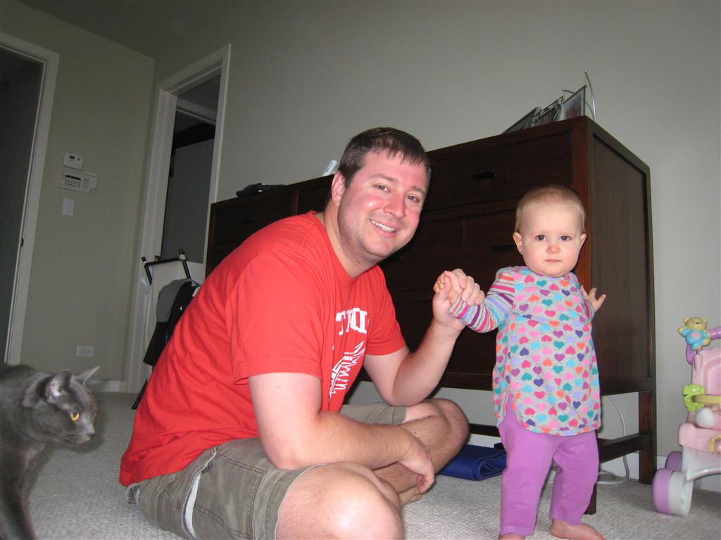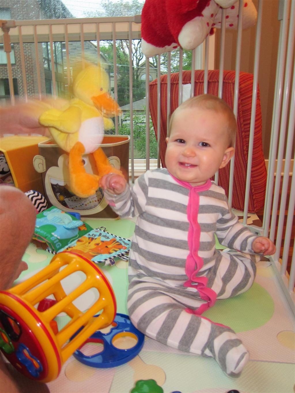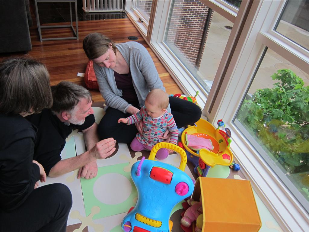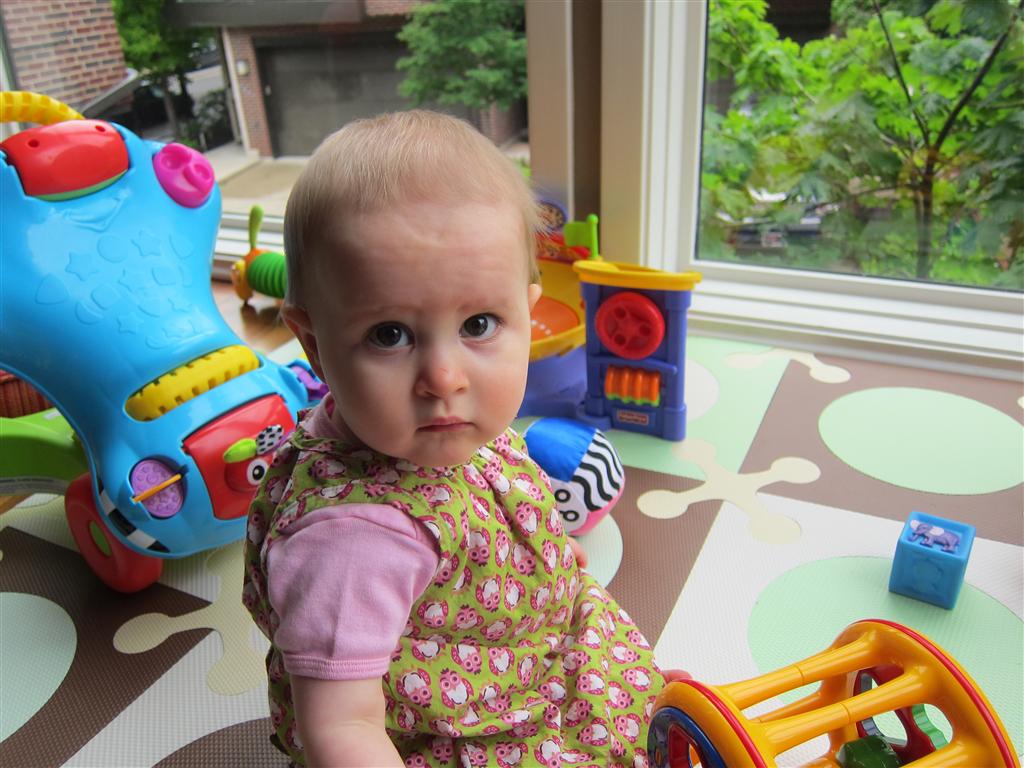 It was a fun packed week with lots of visitors at Eleanor’s house.  Early in the week, we were practicing our standing and crawling.  Zapa has to be increasingly on her toes to as Eleanor’s reach and quickness both increase.  Papa and Mimi arrived on thursday night, and Eleanor had lots of fun playing with them all weekend.  There were lots of smiles, lots of meals, and lots of standing.   Unfortunately, the weather didn’t cooperate, so we didn’t get outside much.  In fact, Dad had to cook the burgers and shish kabobs under cover of an umbrella on Sunday, when Uncle B, Breanne, Tia and Jay came over.   As if all that excitement wasn’t enough, a new tooth also popped through this week, a bottom tooth on the left side, tooth number seven in all.  On the sad side, Eleanor had her first painful diaper rash this week as well – which put a little damper on Saturday’s fun – poor thing.