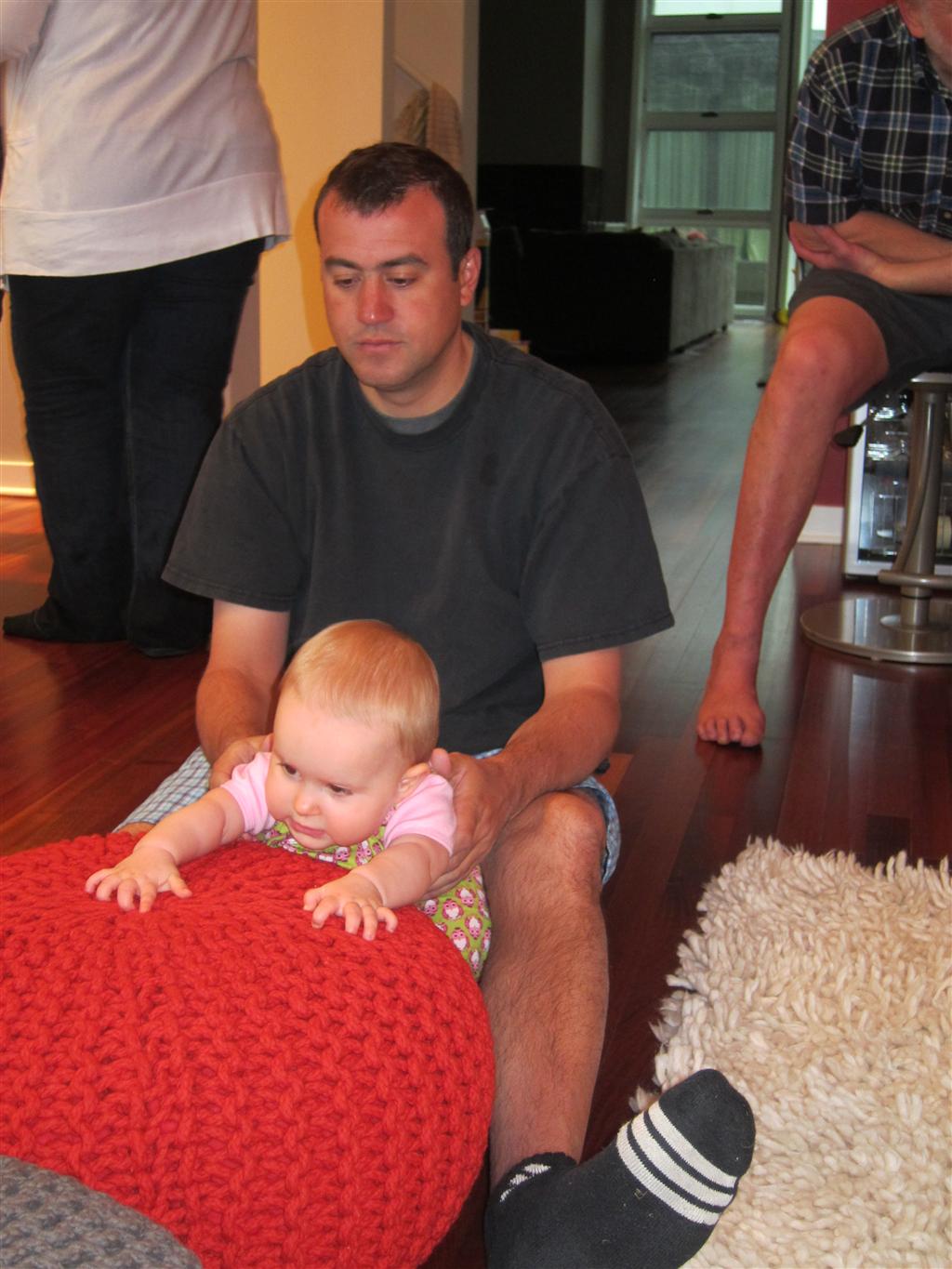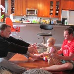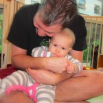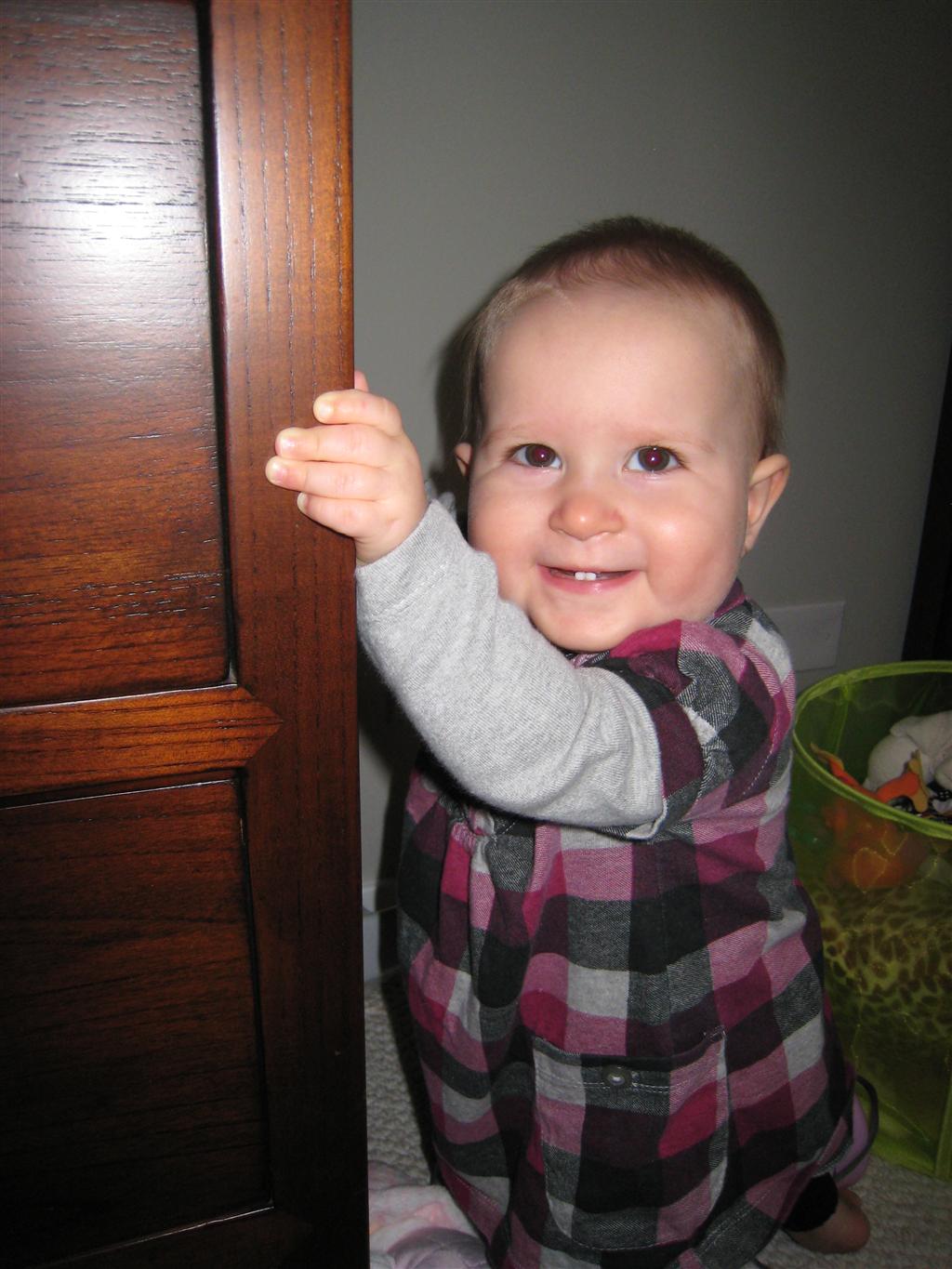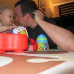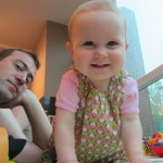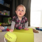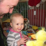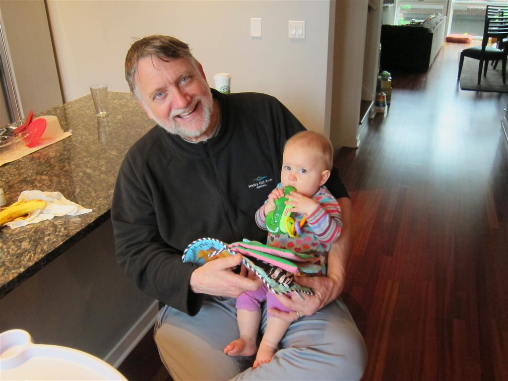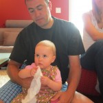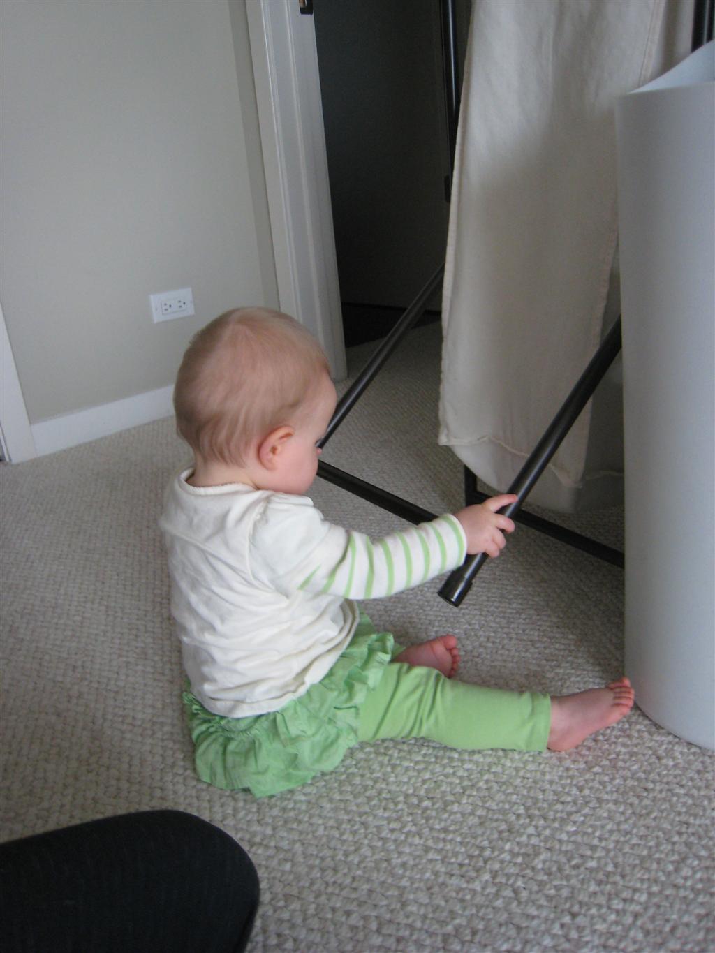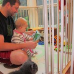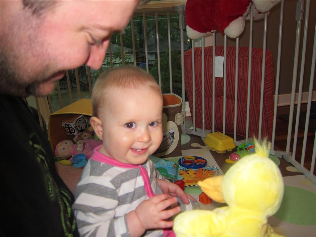 It was a fun packed week with lots of visitors at Eleanor’s house.  Early in the week, we were practicing our standing and crawling.  Zapa has to be increasingly on her toes to as Eleanor’s reach and quickness both increase.  Papa and Mimi arrived on thursday night, and Eleanor had lots of fun playing with them all weekend.  There were lots of smiles, lots of meals, and lots of standing.   Unfortunately, the weather didn’t cooperate, so we didn’t get outside much.  In fact, Dad had to cook the burgers and shish kabobs under cover of an umbrella on Sunday, when Uncle B, Breanne, Tia and Jay came over.   As if all that excitement wasn’t enough, a new tooth also popped through this week, a bottom tooth on the left side, tooth number seven in all.  On the sad side, Eleanor had her first painful diaper rash this week as well – which put a little damper on Saturday’s fun – poor thing.